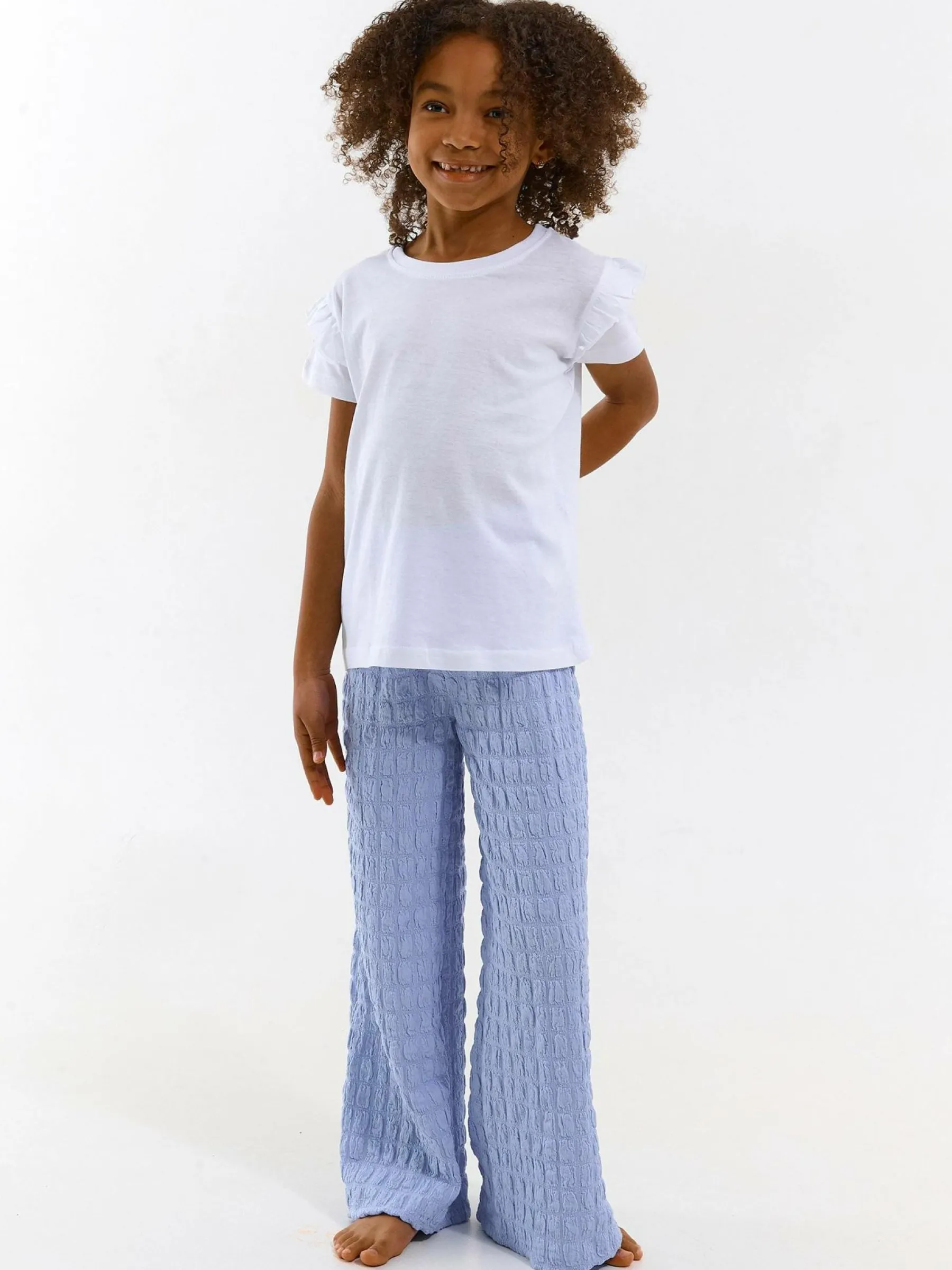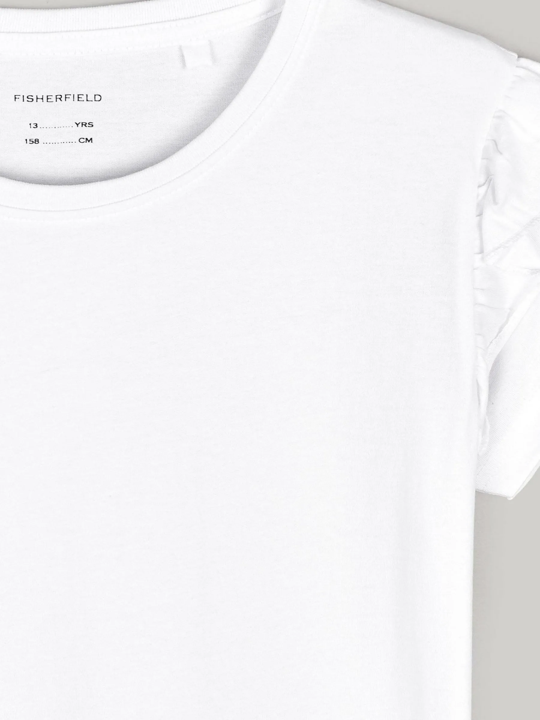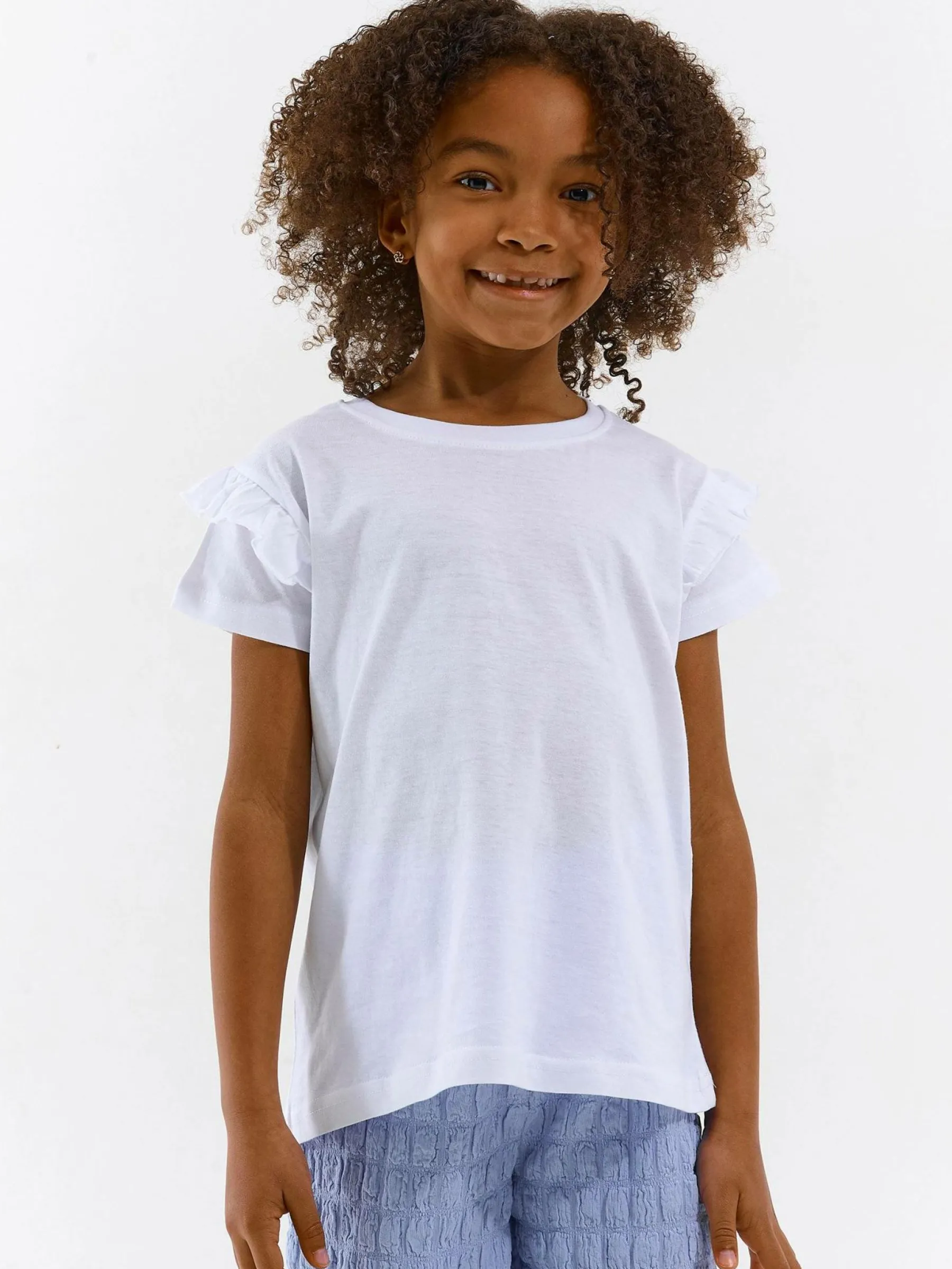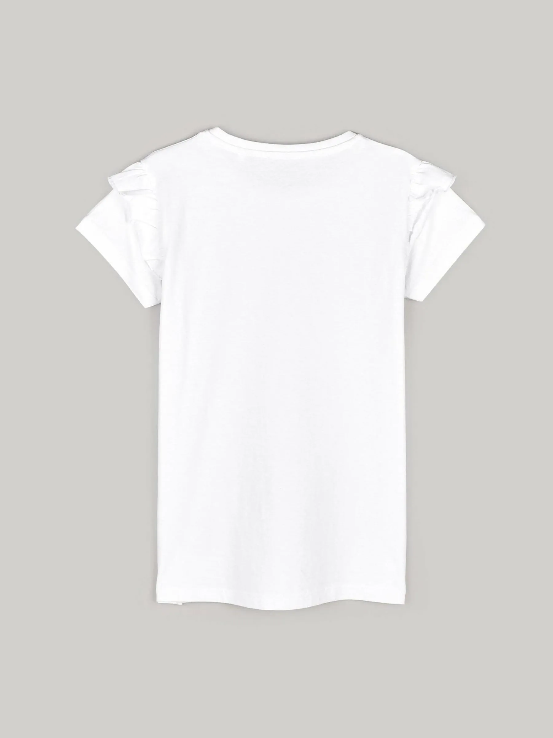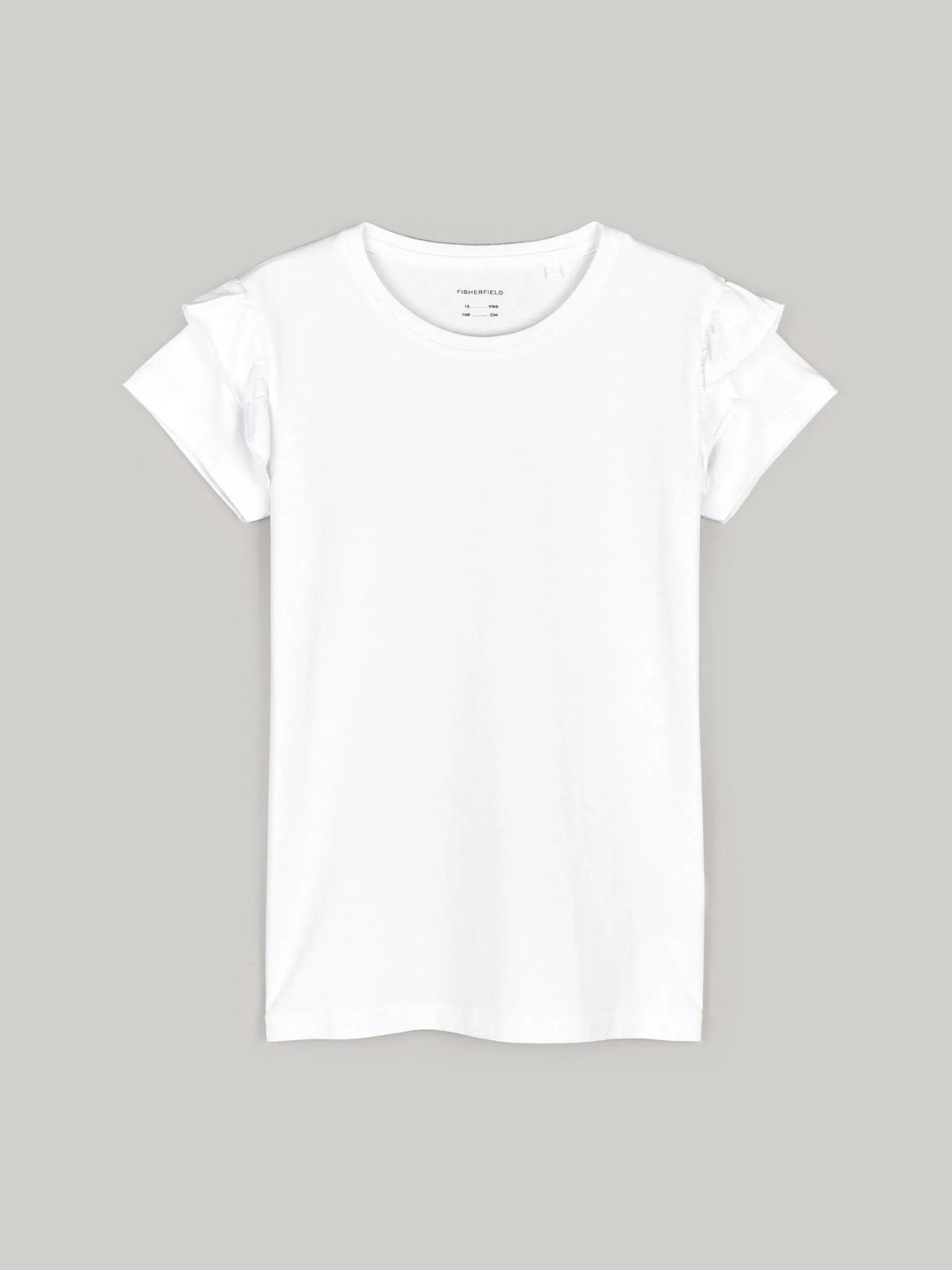 Kolor: białyKrój: z falbanąTyp: koszulkaRekaw: krótki rękawDługość: krótkiPattern style: pojedynczy kolorDetal:…