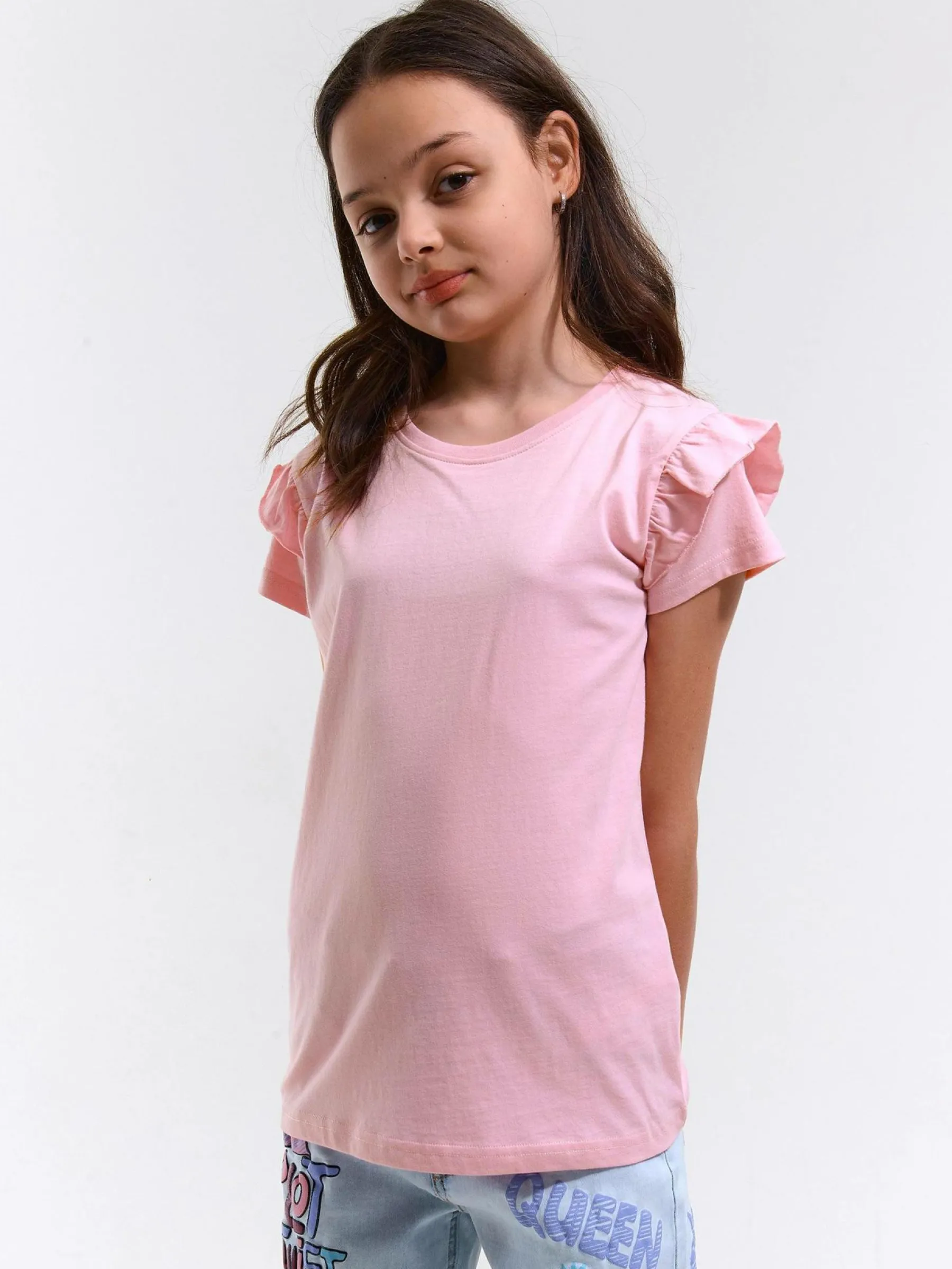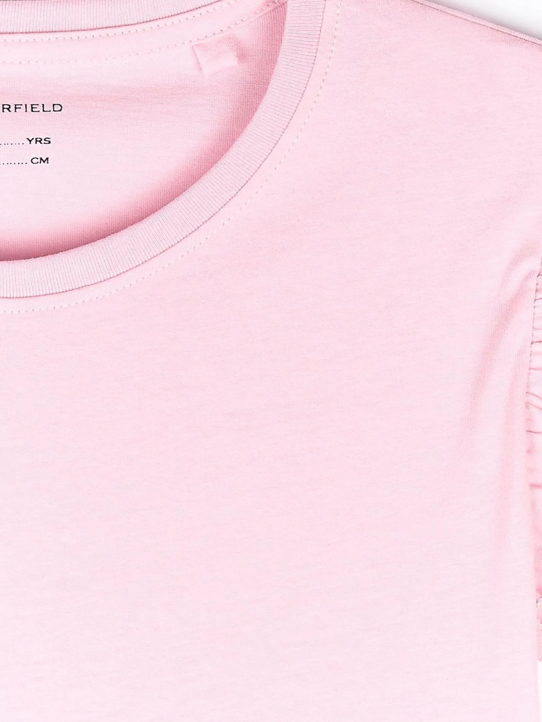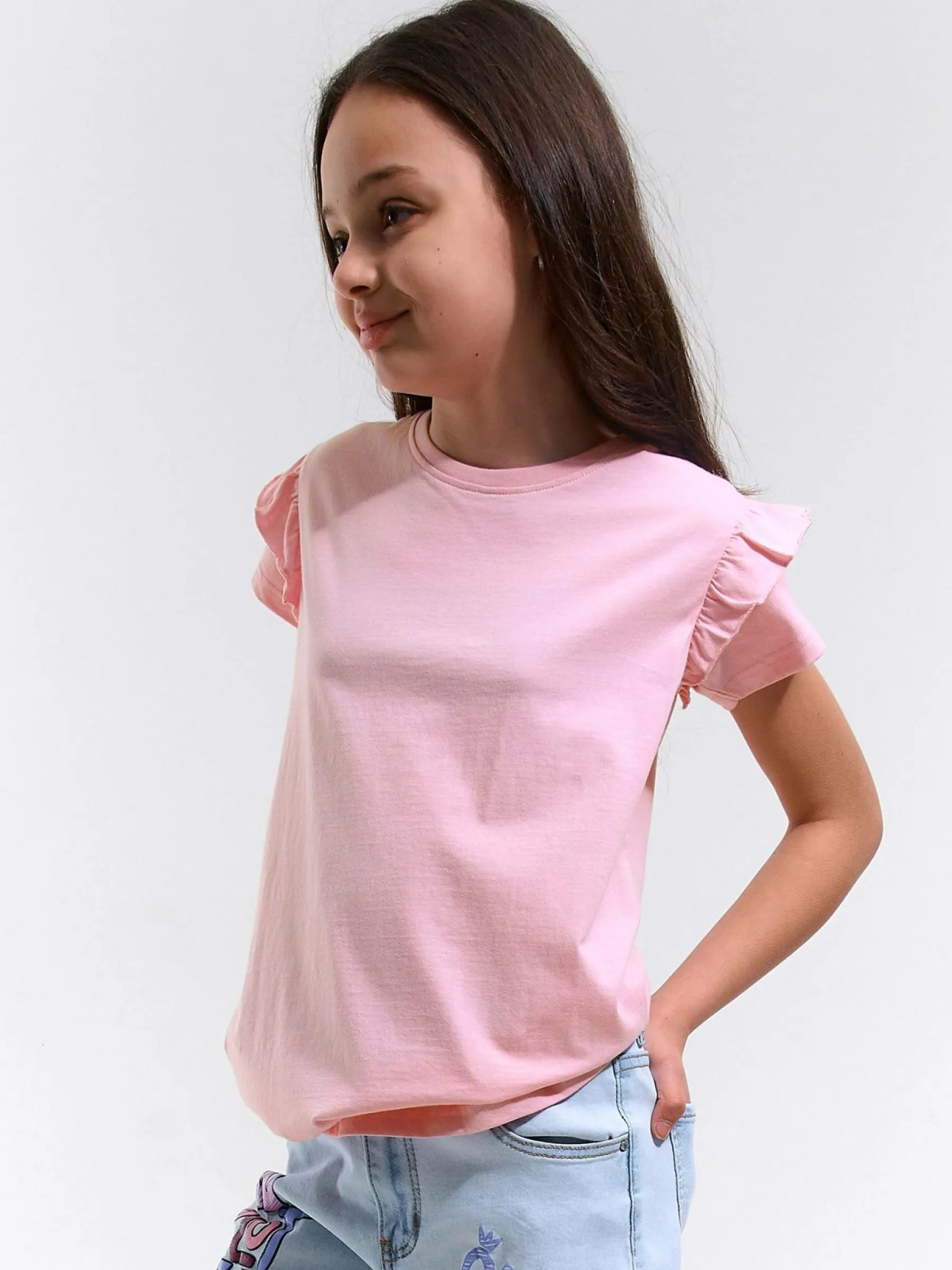 Kolor: różowyKrój: z falbanąTyp: koszulkaRekaw: krótki rękawDługość: krótkiPattern style: pojedynczy kolorDeta…