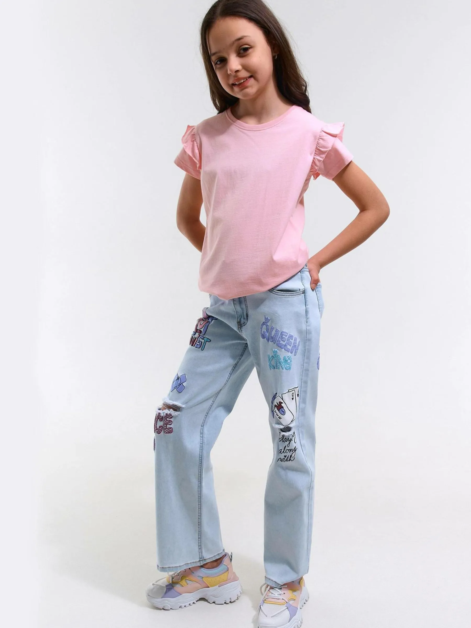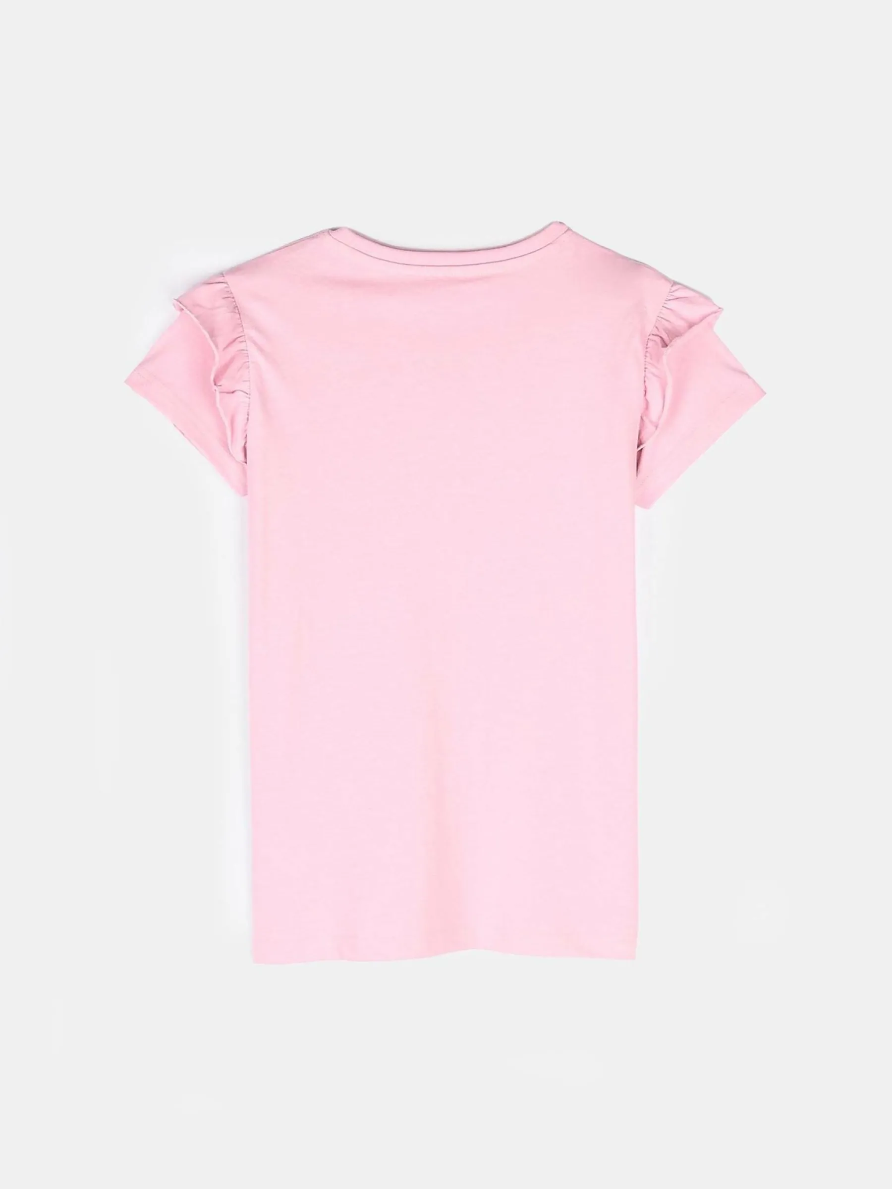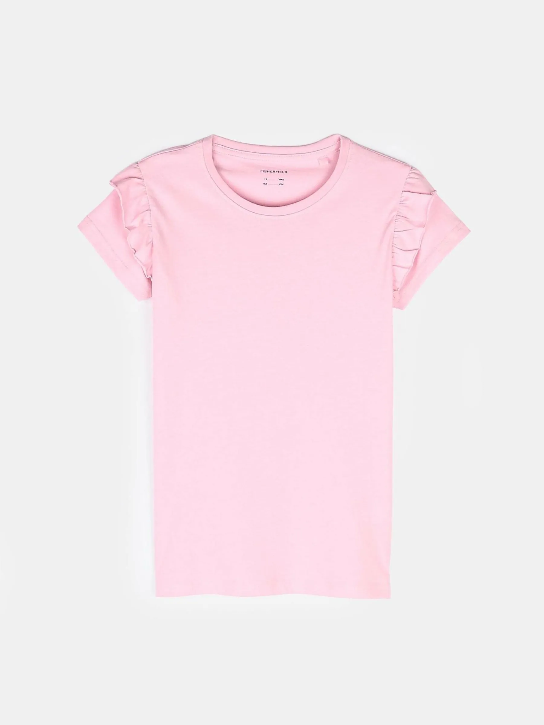 Kolor: różowyKrój: z falbanąTyp: koszulkaRekaw: krótki rękawDługość: krótkiPattern style: pojedynczy kolorDeta…