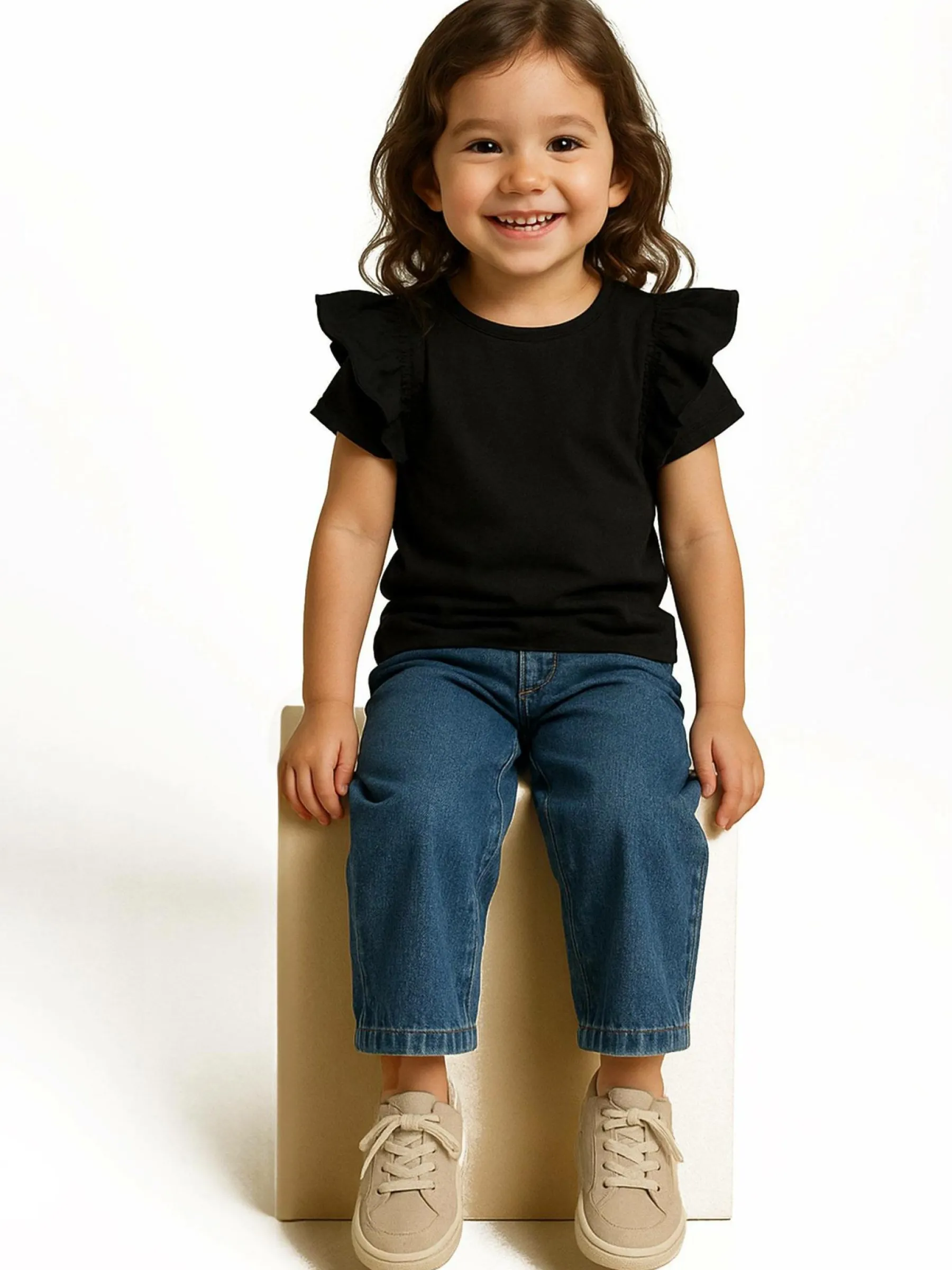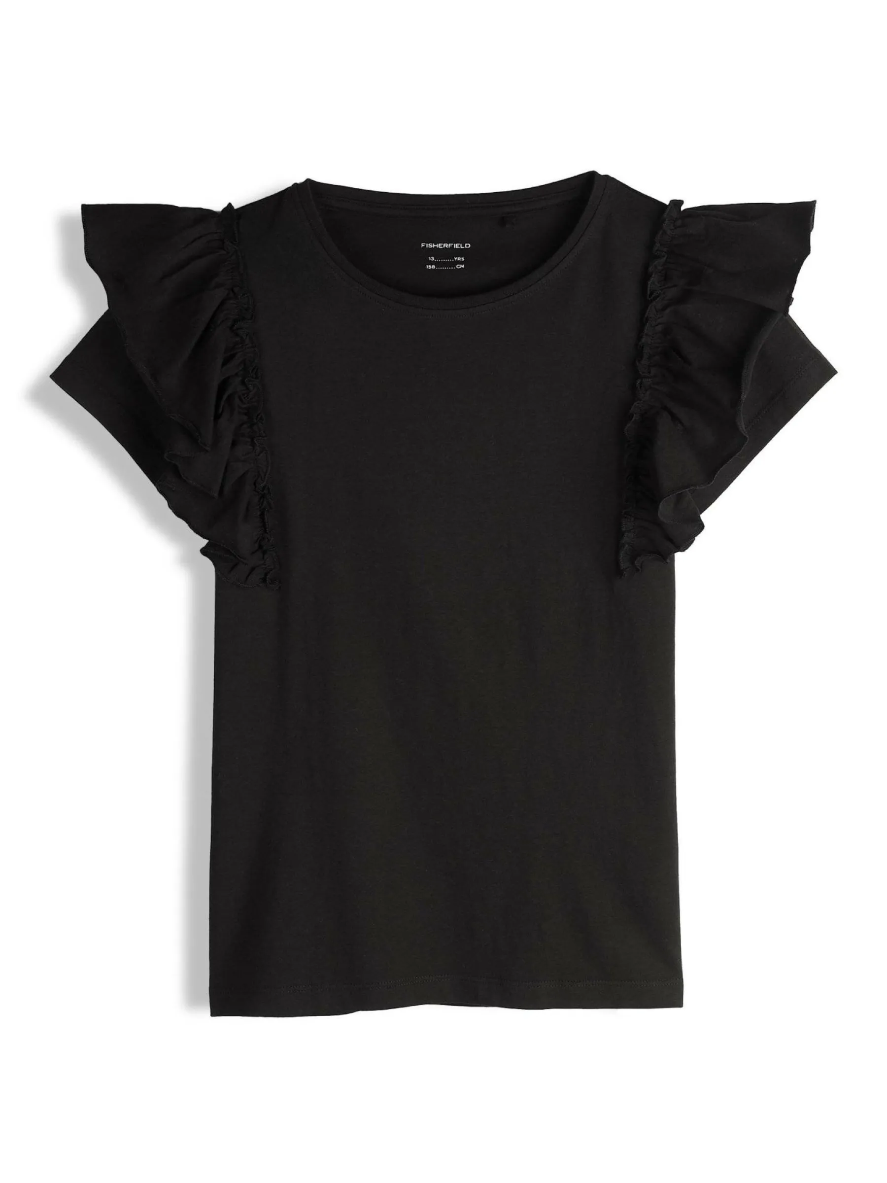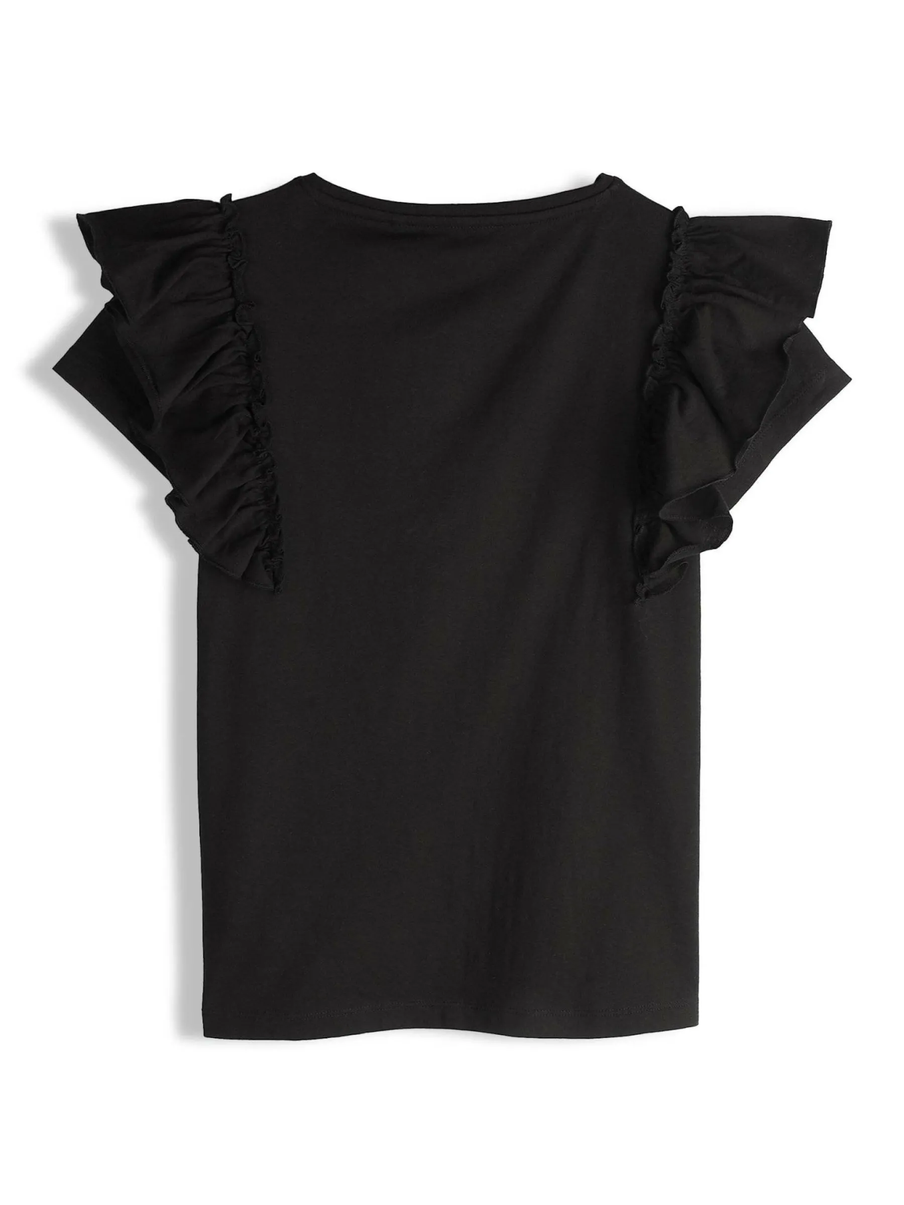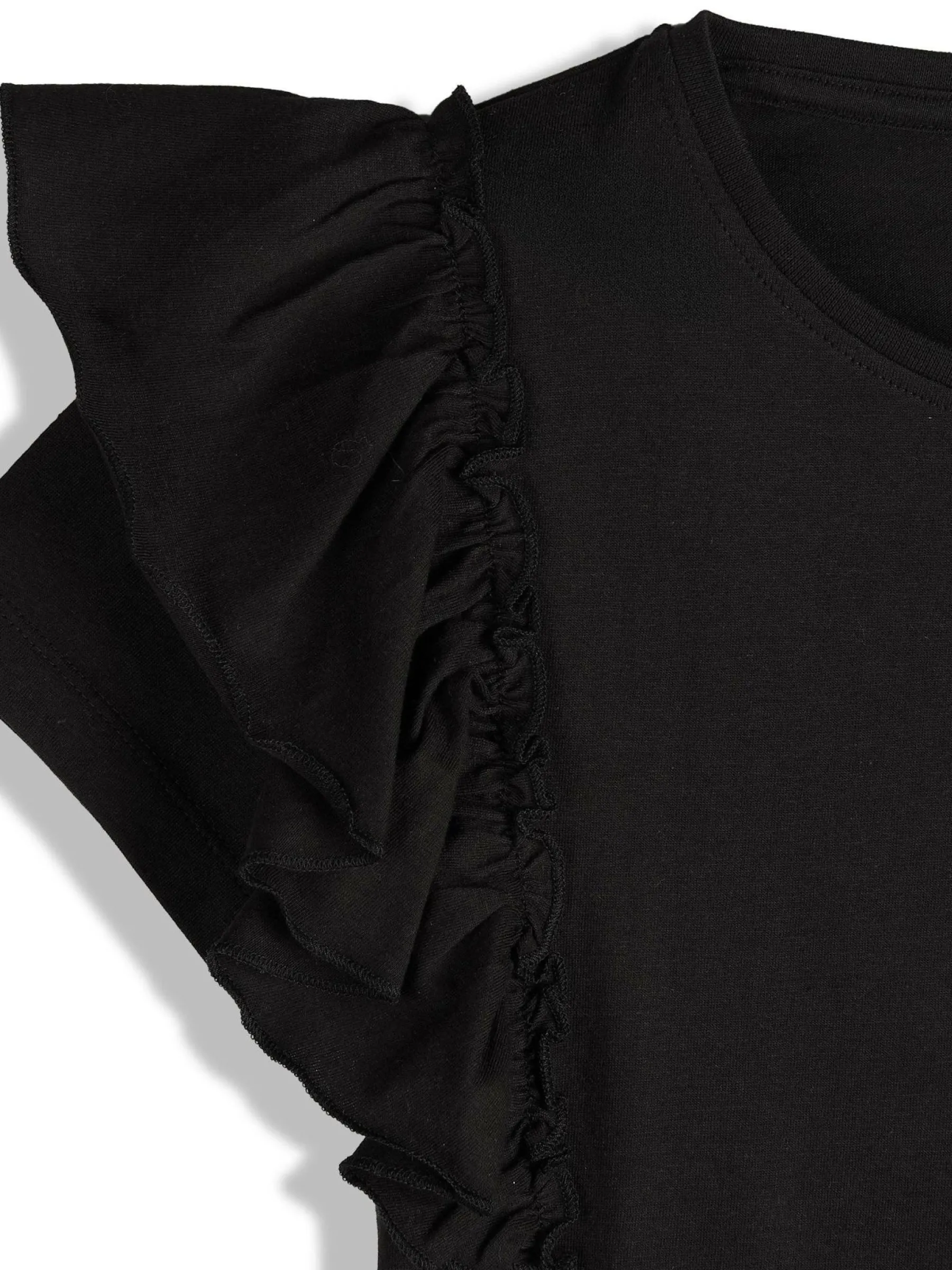 Kolor: czarnyKrój: z falbanąTyp: koszulkaRekaw: krótki rękawDługość: krótkiPattern style: pojedynczy kolorDetal:…