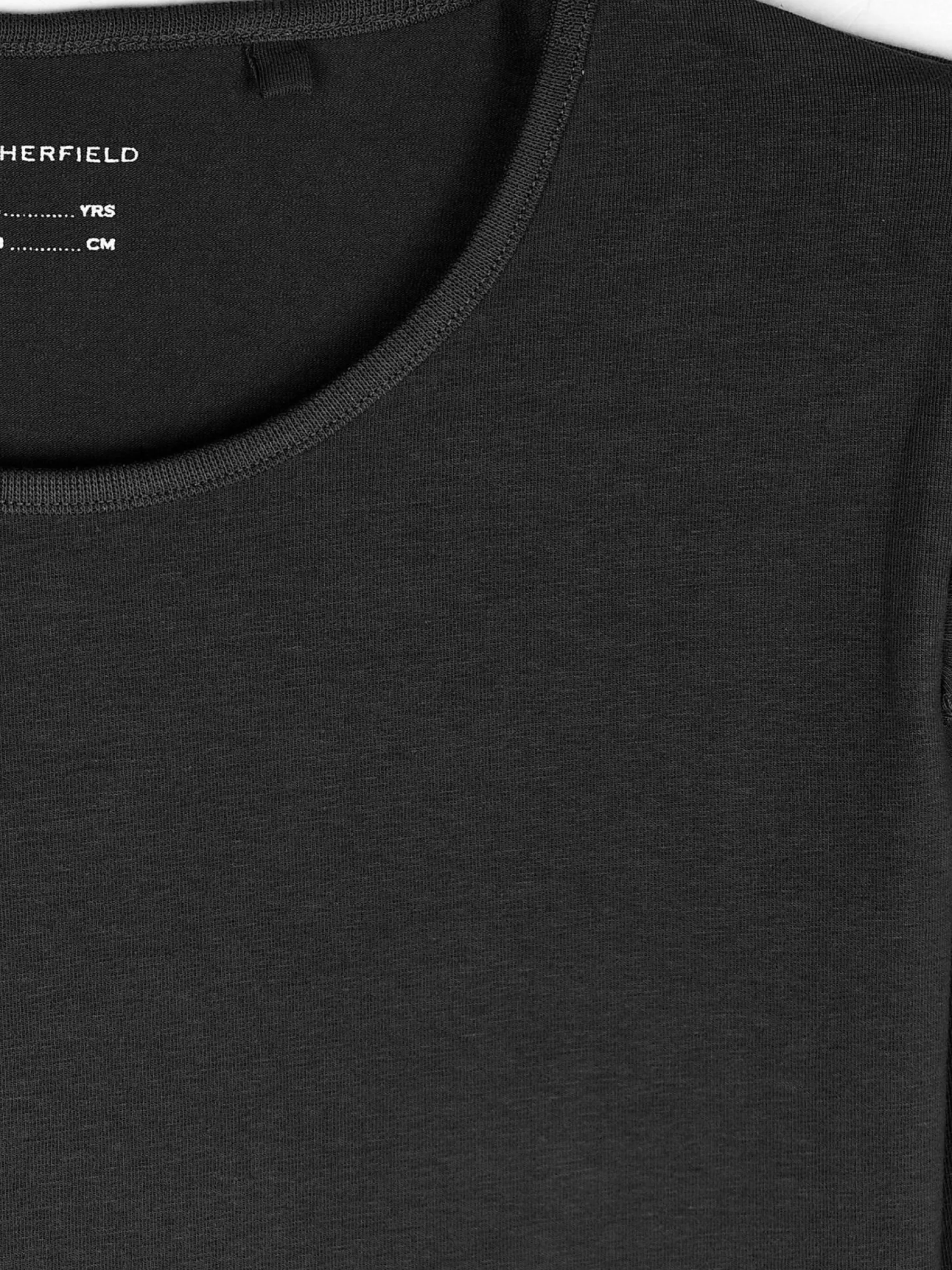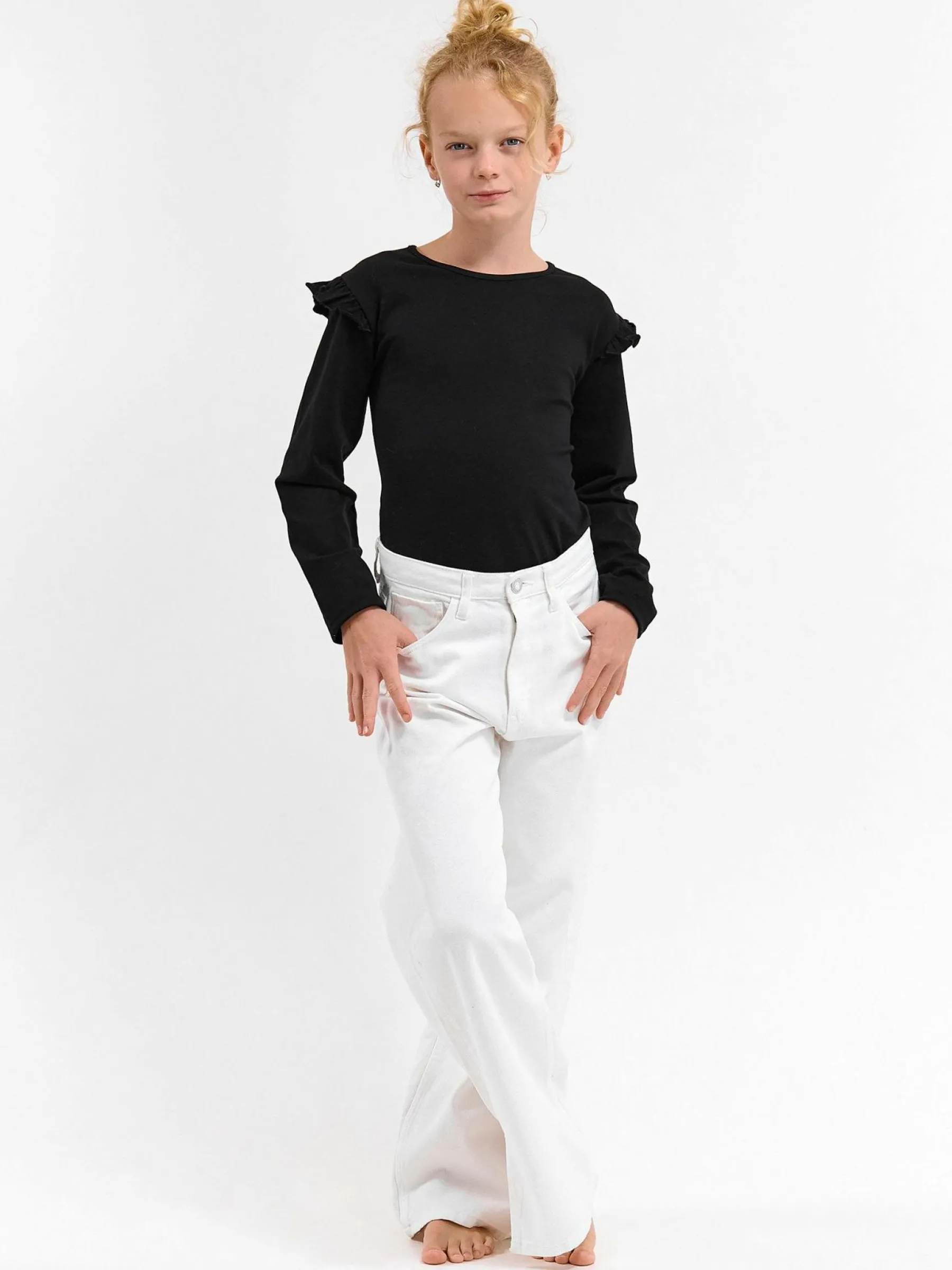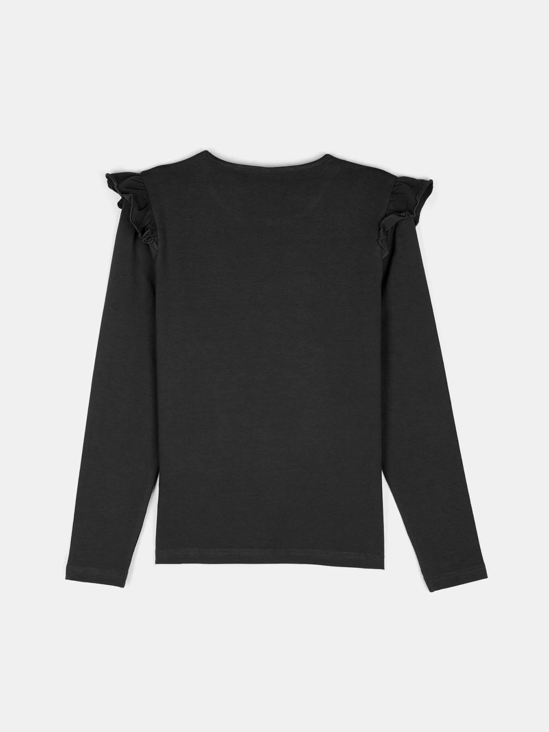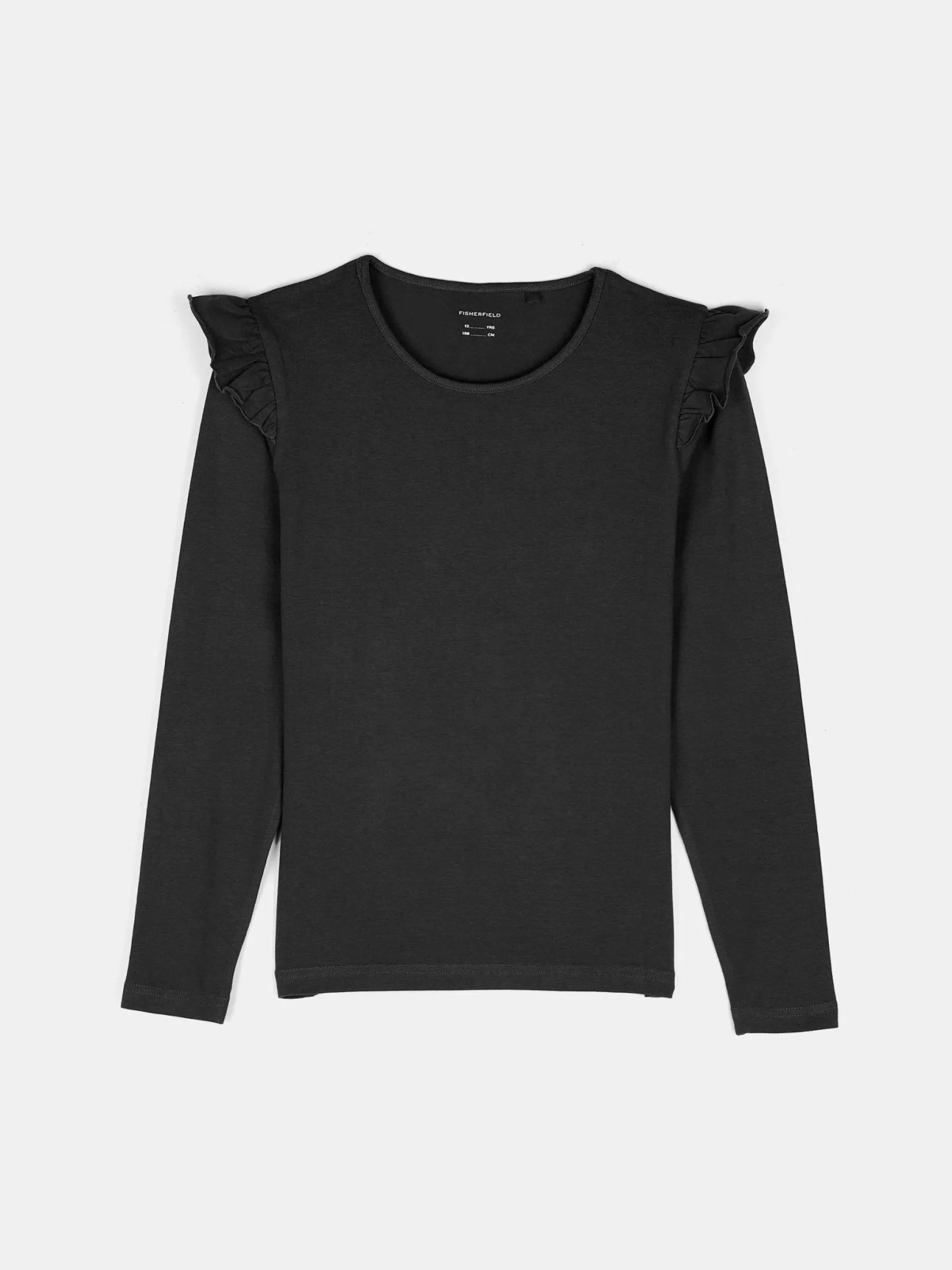 Kolor: czarnyKrój: z falbanąTyp: koszulkaRekaw: długi rękawDługość: krótkiPattern style: pojedynczy kolorDetal: …