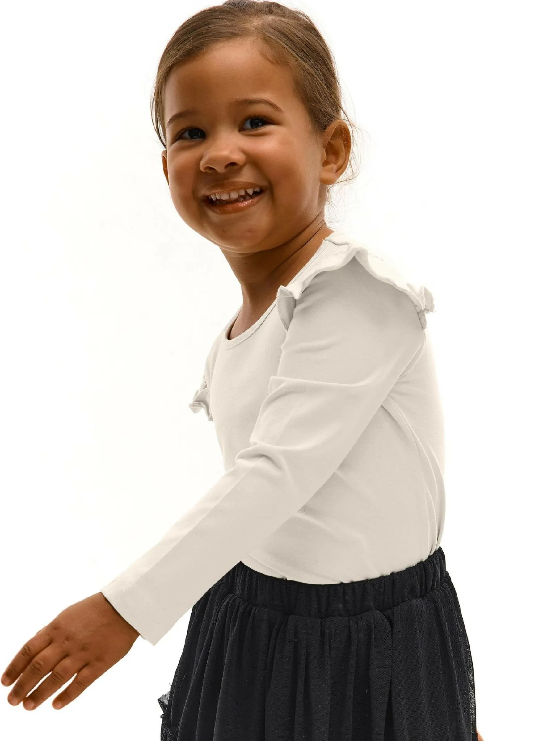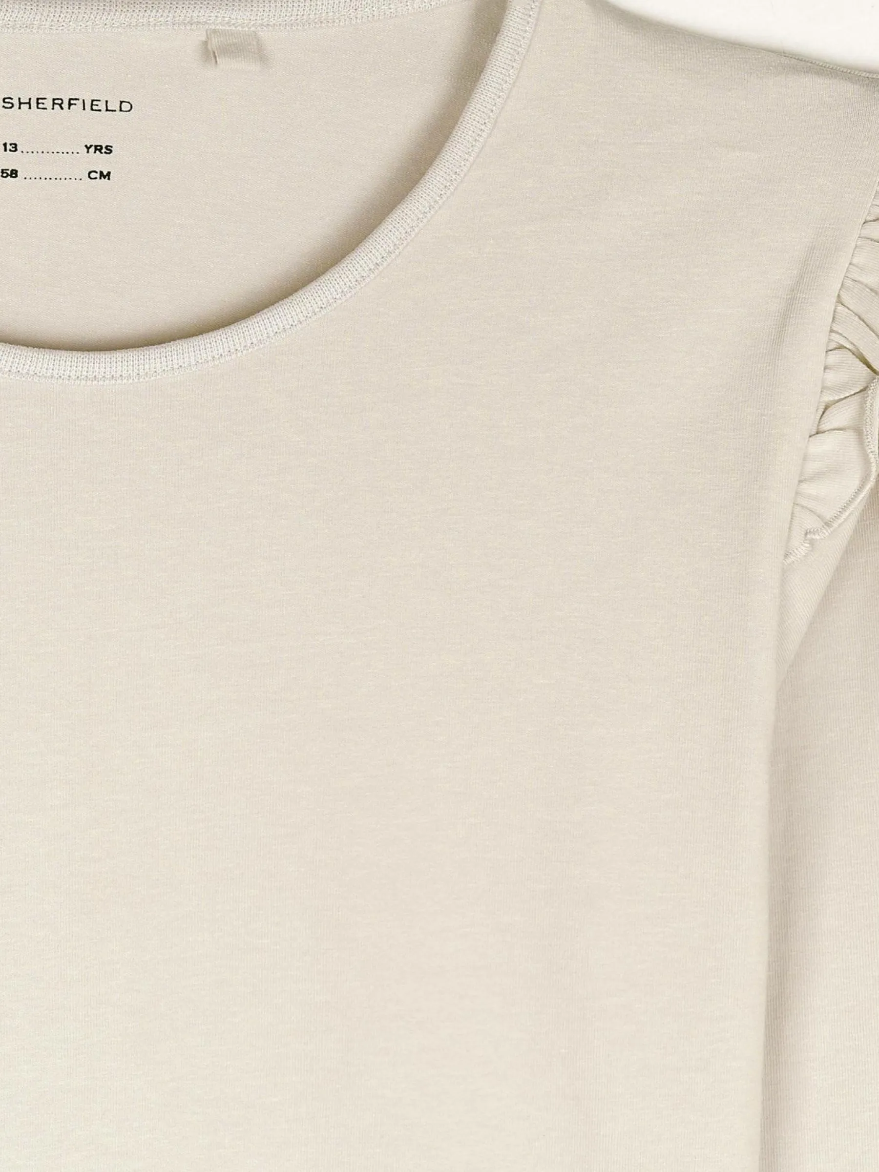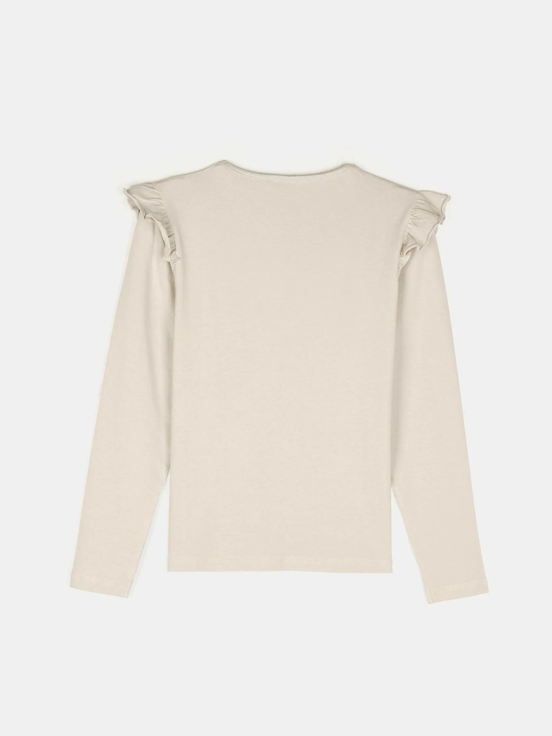 Kolor: beżowyKrój: z falbanąTyp: koszulkaRekaw: długi rękawDługość: krótkiPattern style: pojedynczy kolorDetal:…