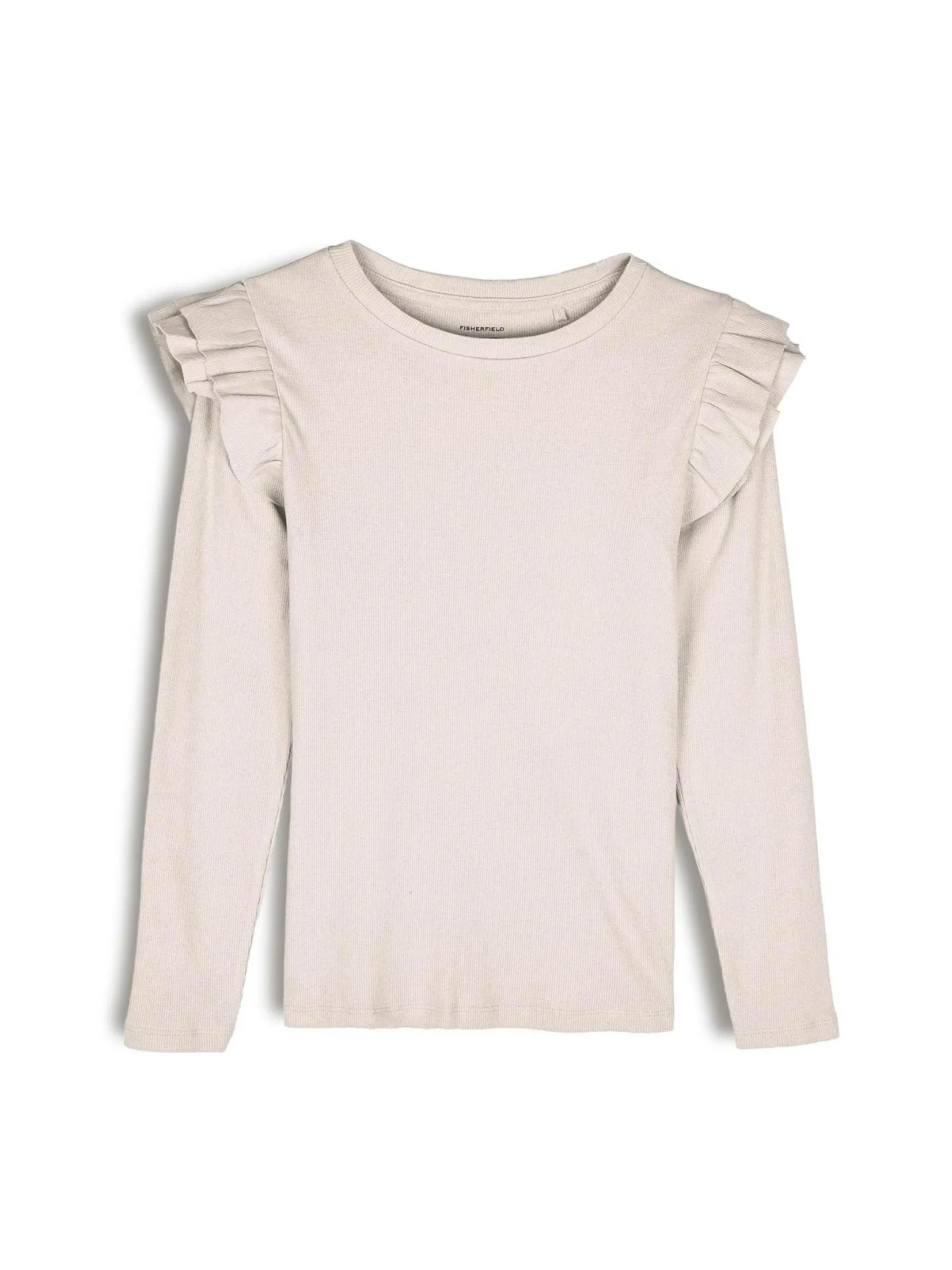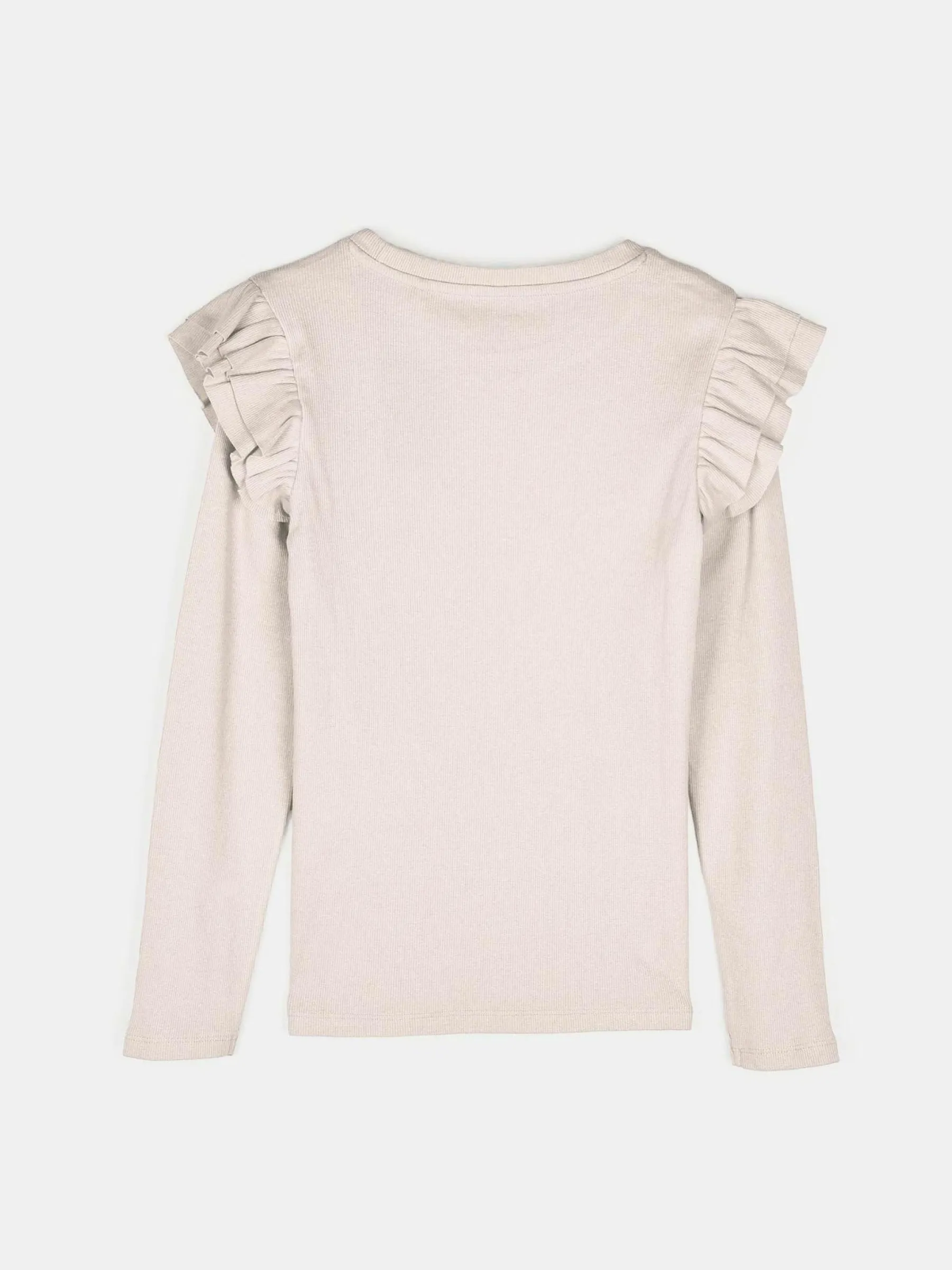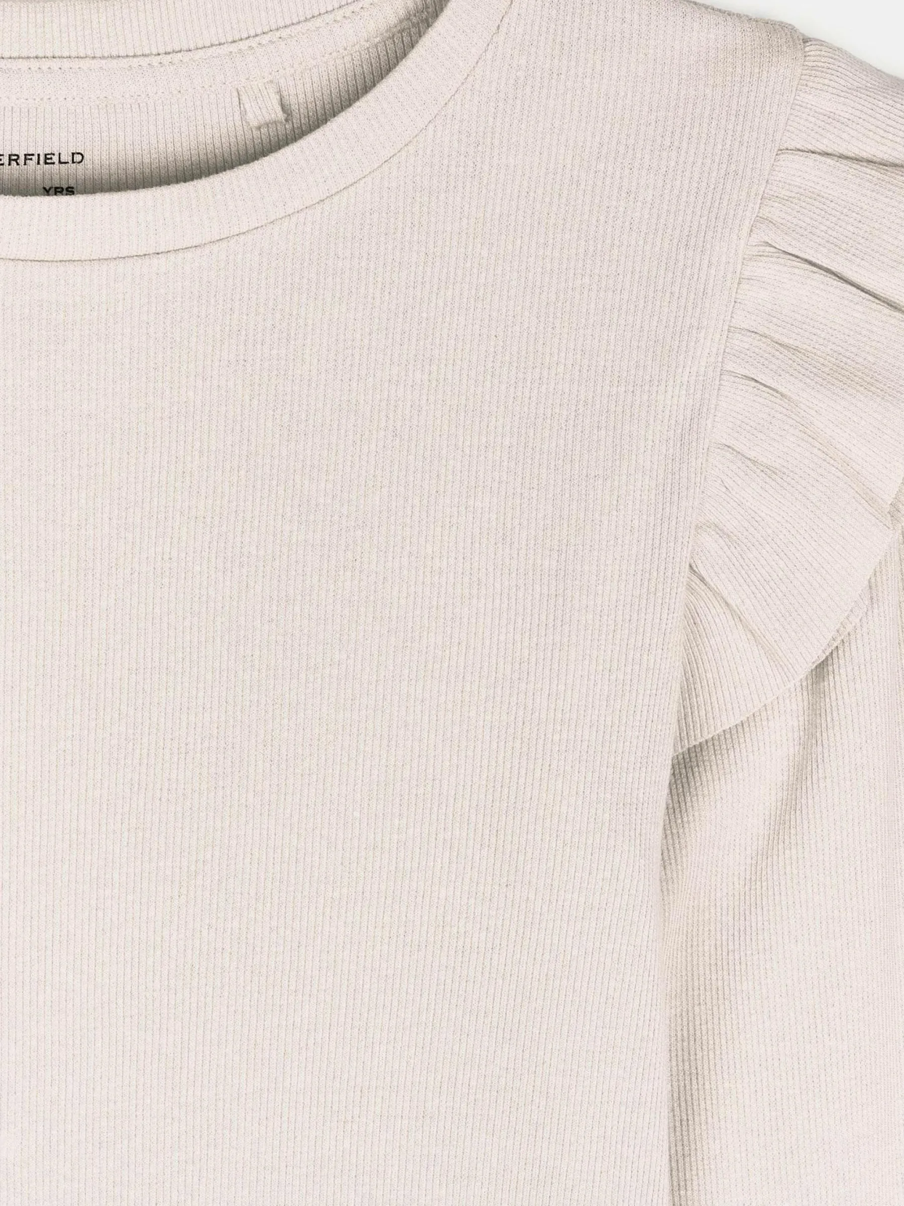 Kolor: beżowyKrój: z falbanąTyp: koszulkaRekaw: długi rękawDługość: krótkiPattern style: pojedynczy kolor, żeb…
