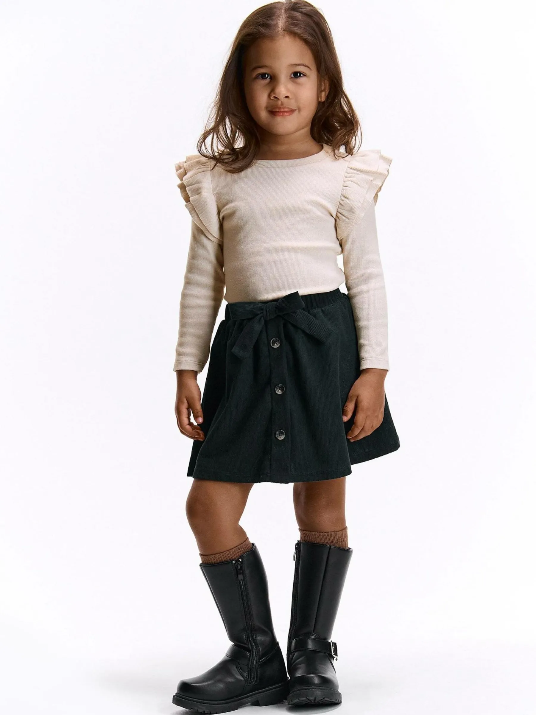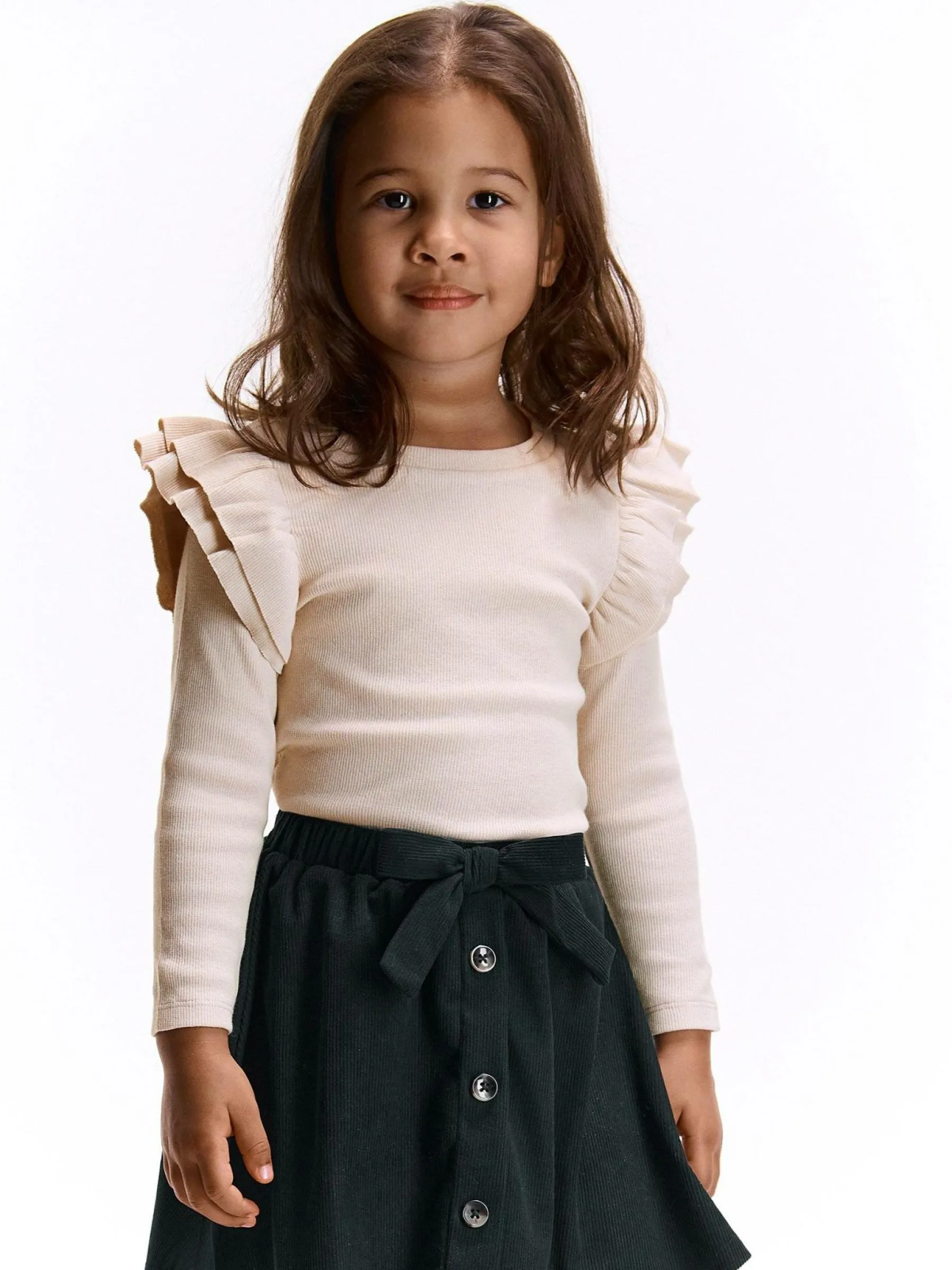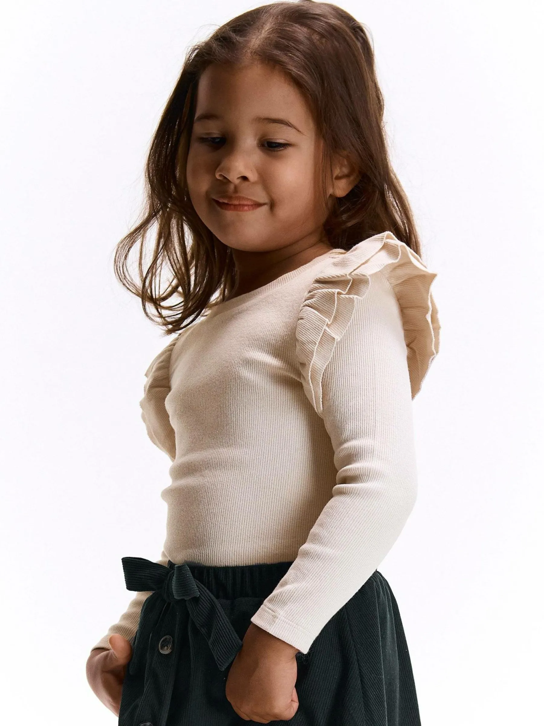 Kolor: beżowyKrój: z falbanąTyp: koszulkaRekaw: długi rękawDługość: krótkiPattern style: pojedynczy kolor, żeb…