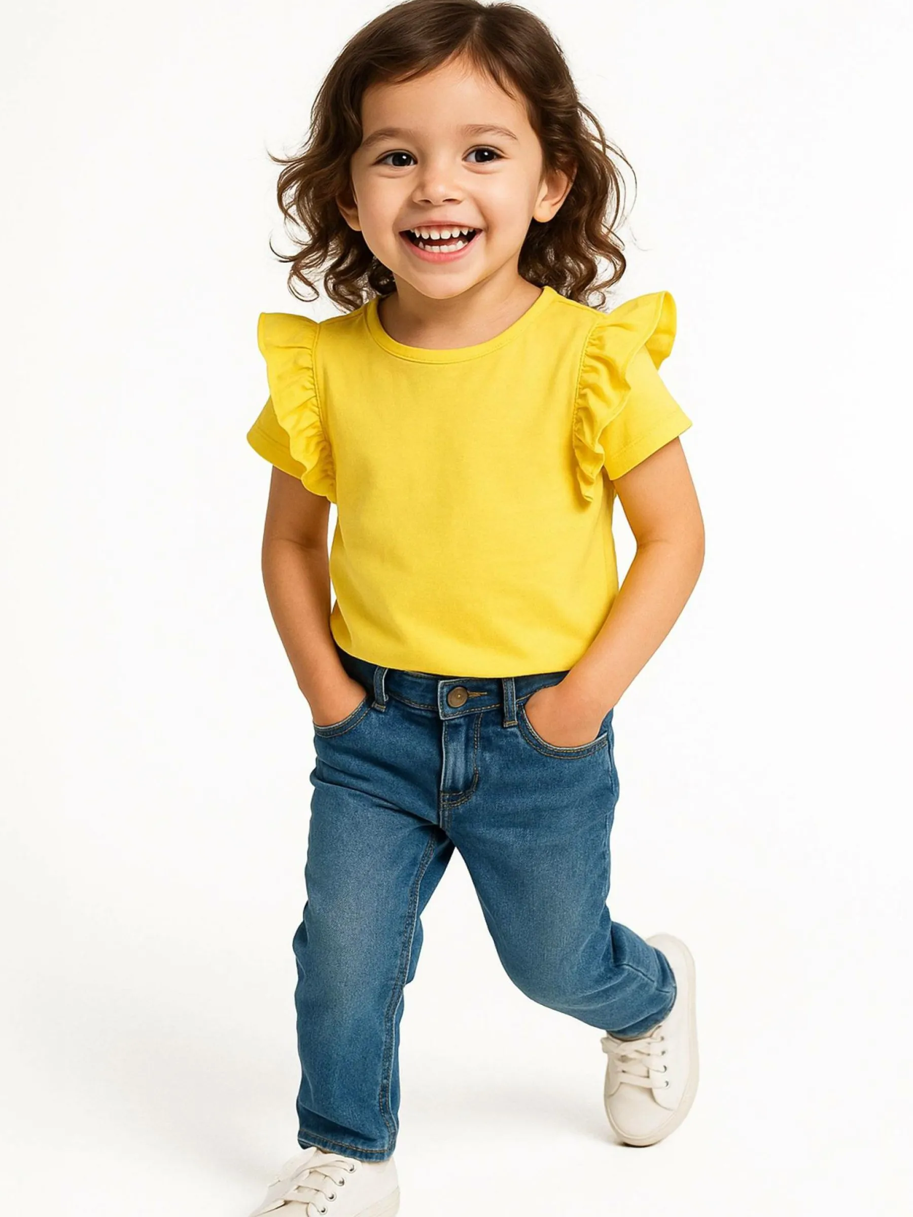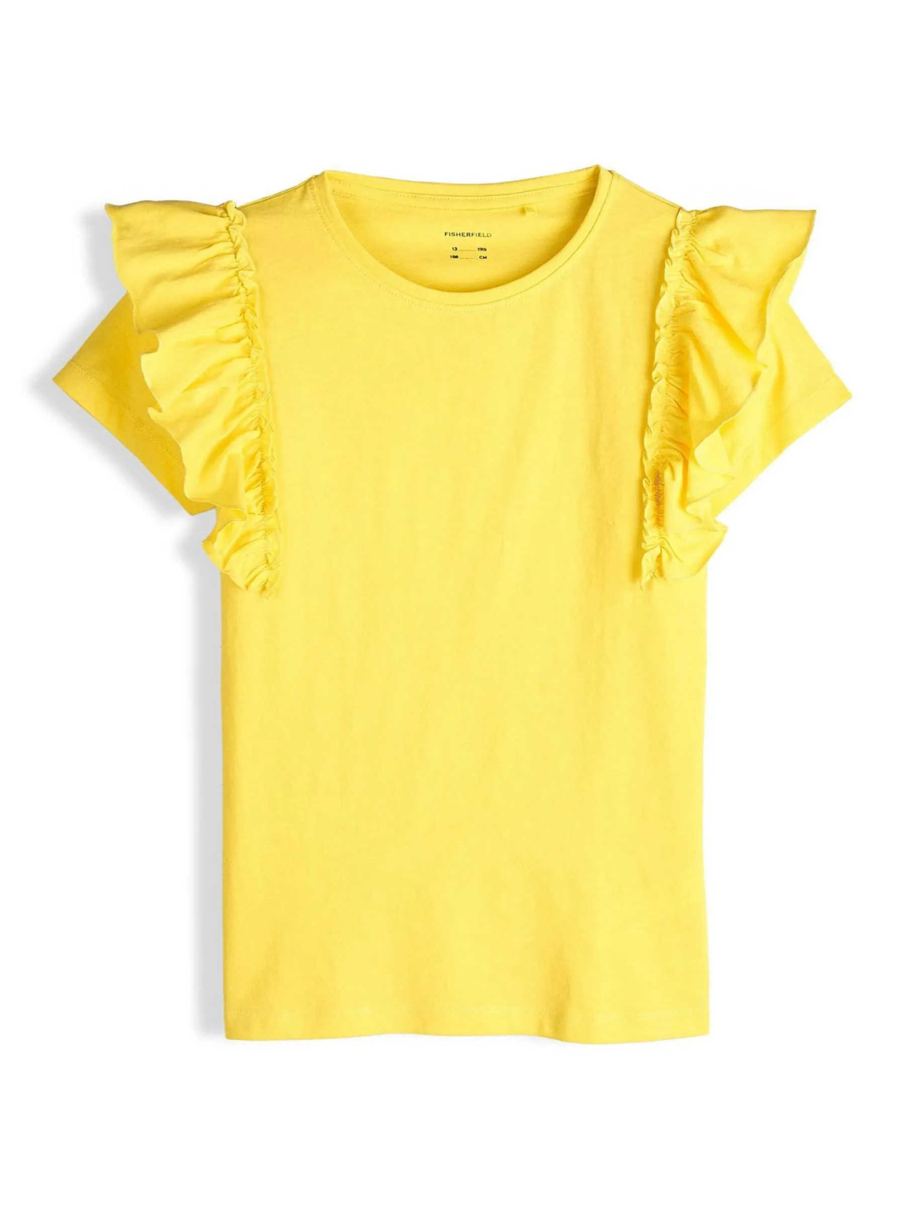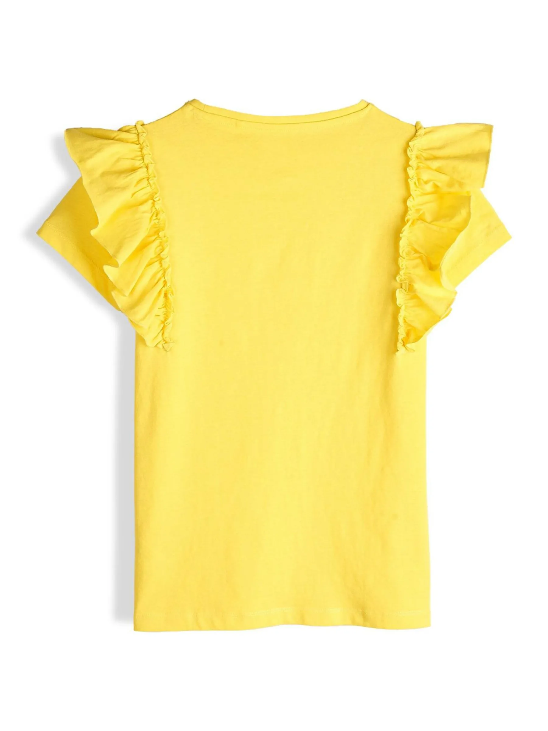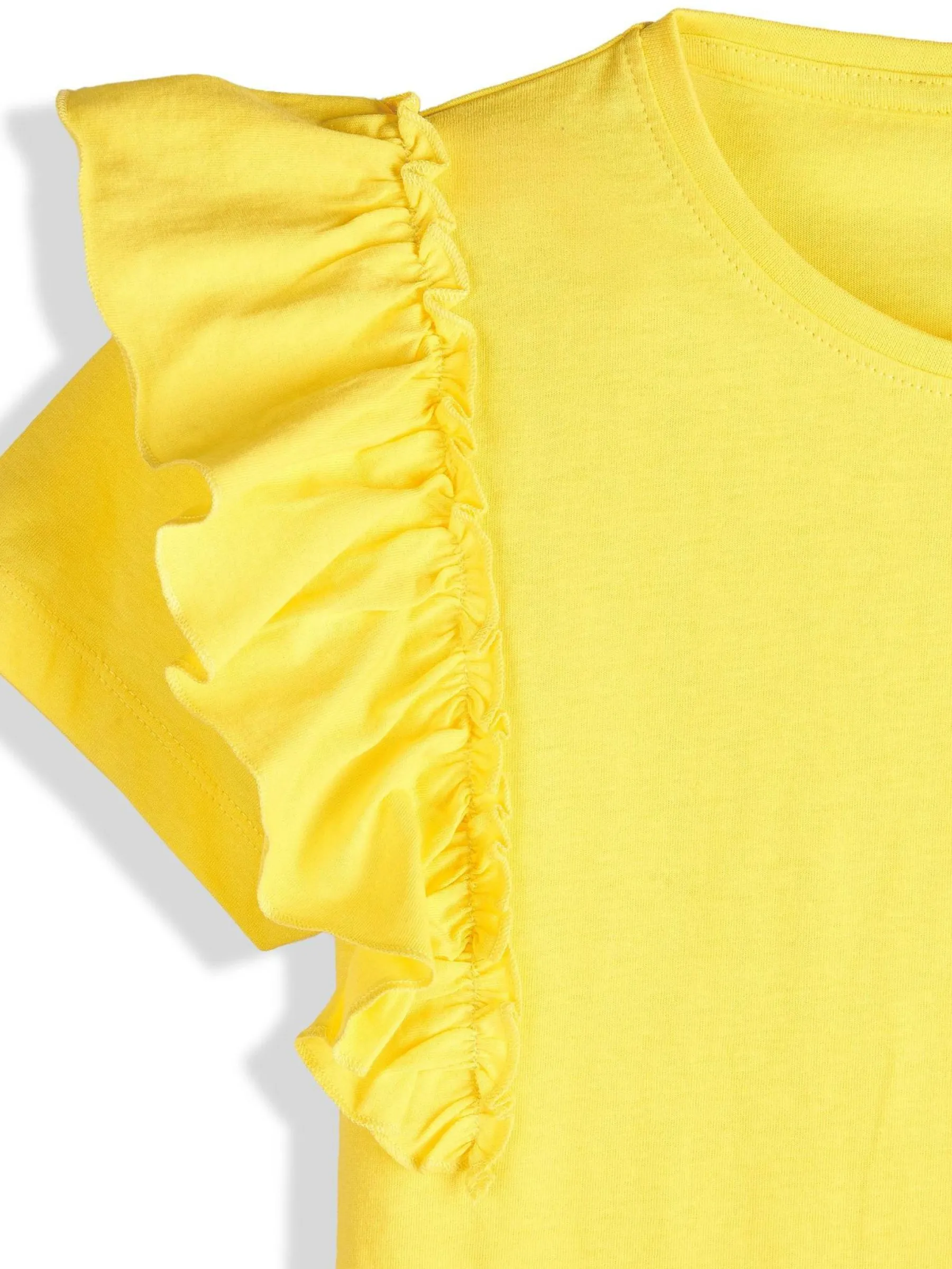 Kolor: żółtyKrój: z falbanąTyp: koszulkaRekaw: krótki rękawDługość: krótkiPattern style: pojedynczy kolorDeta…