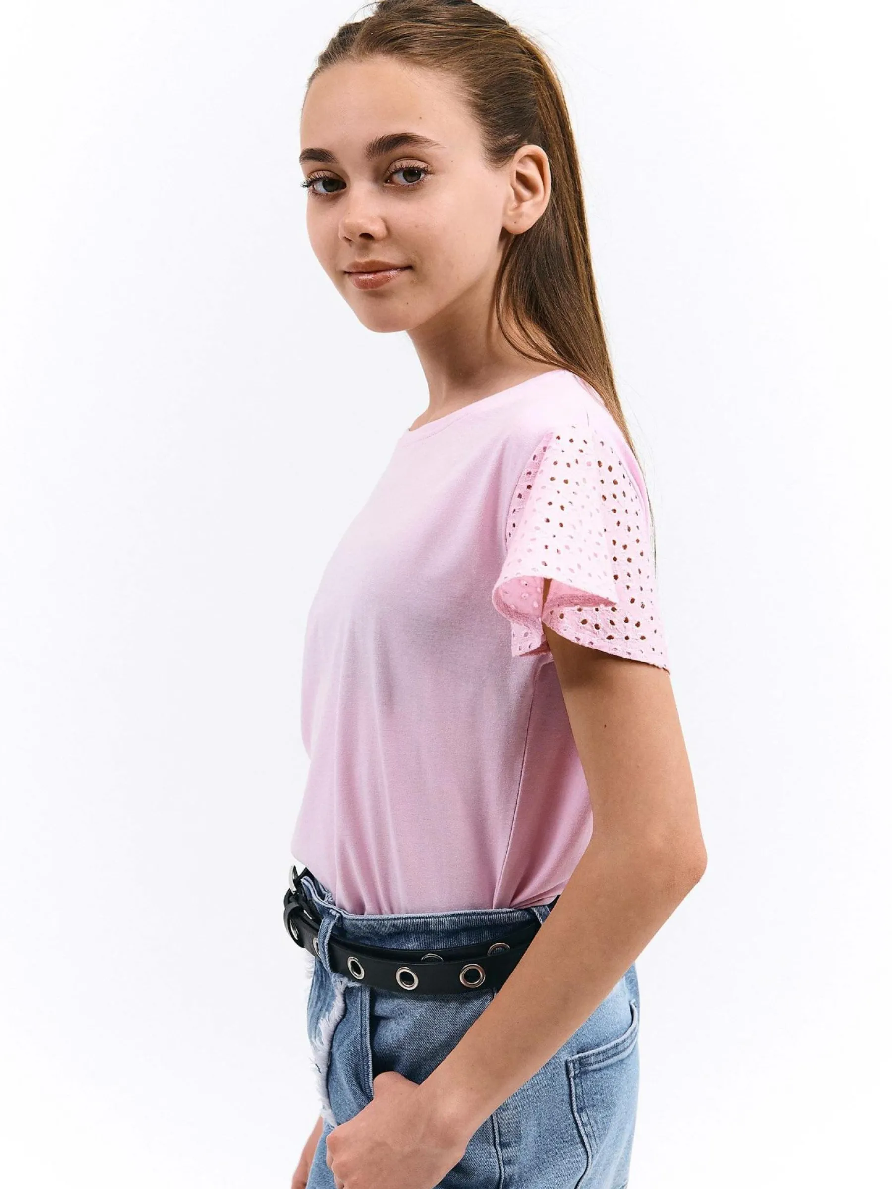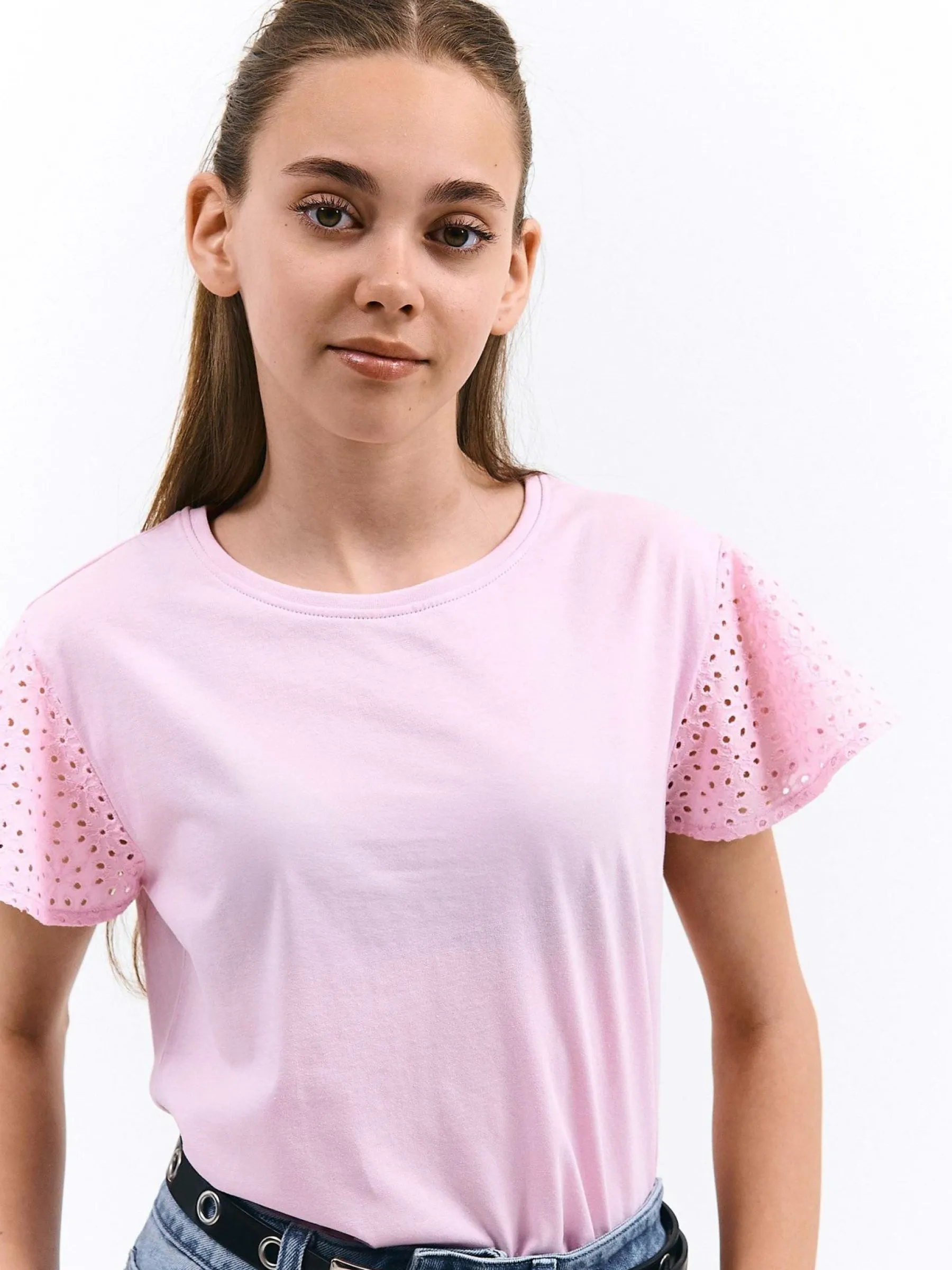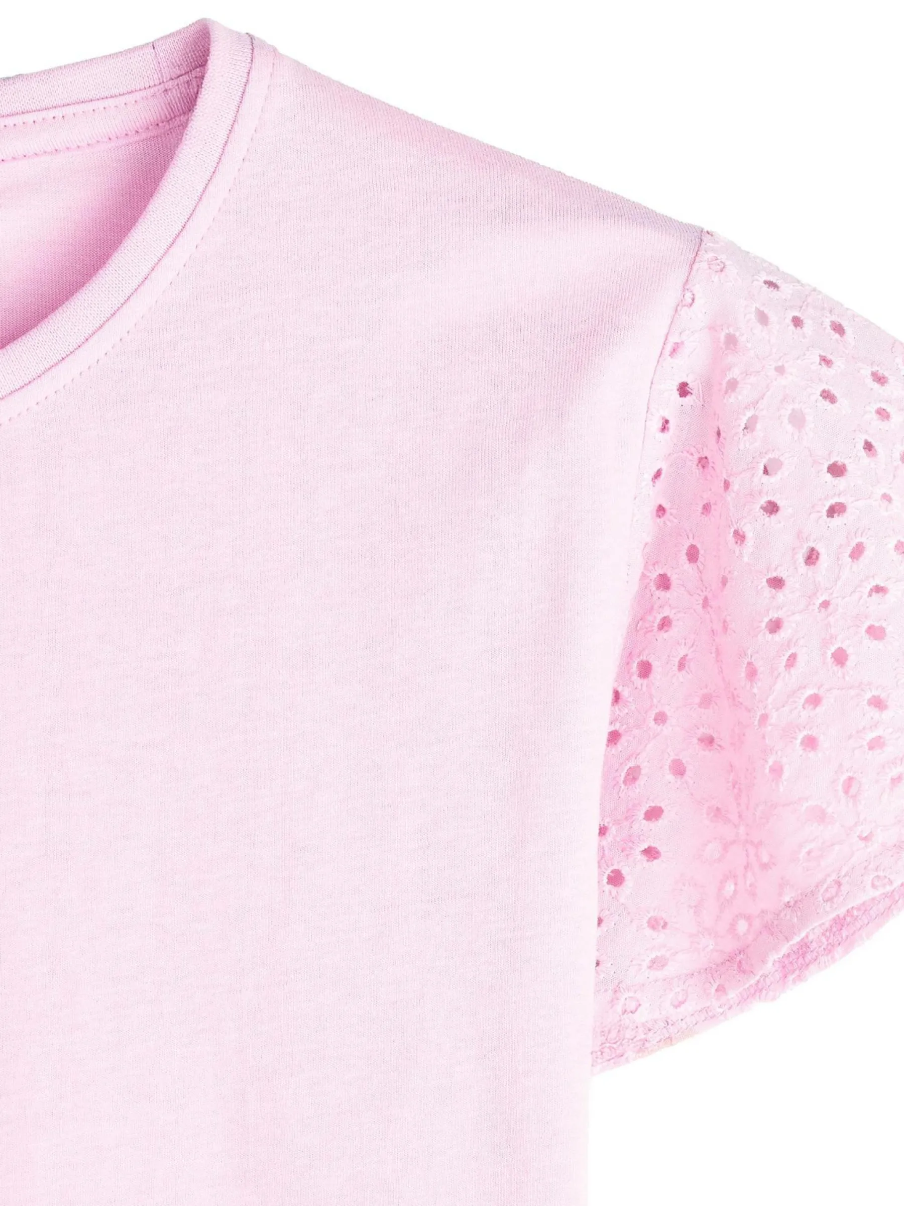 Kolor: różowyKrój: z falbanąTyp: koszulkaRekaw: krótki rękawDługość: krótkiPattern style: pojedynczy kolorDeta…