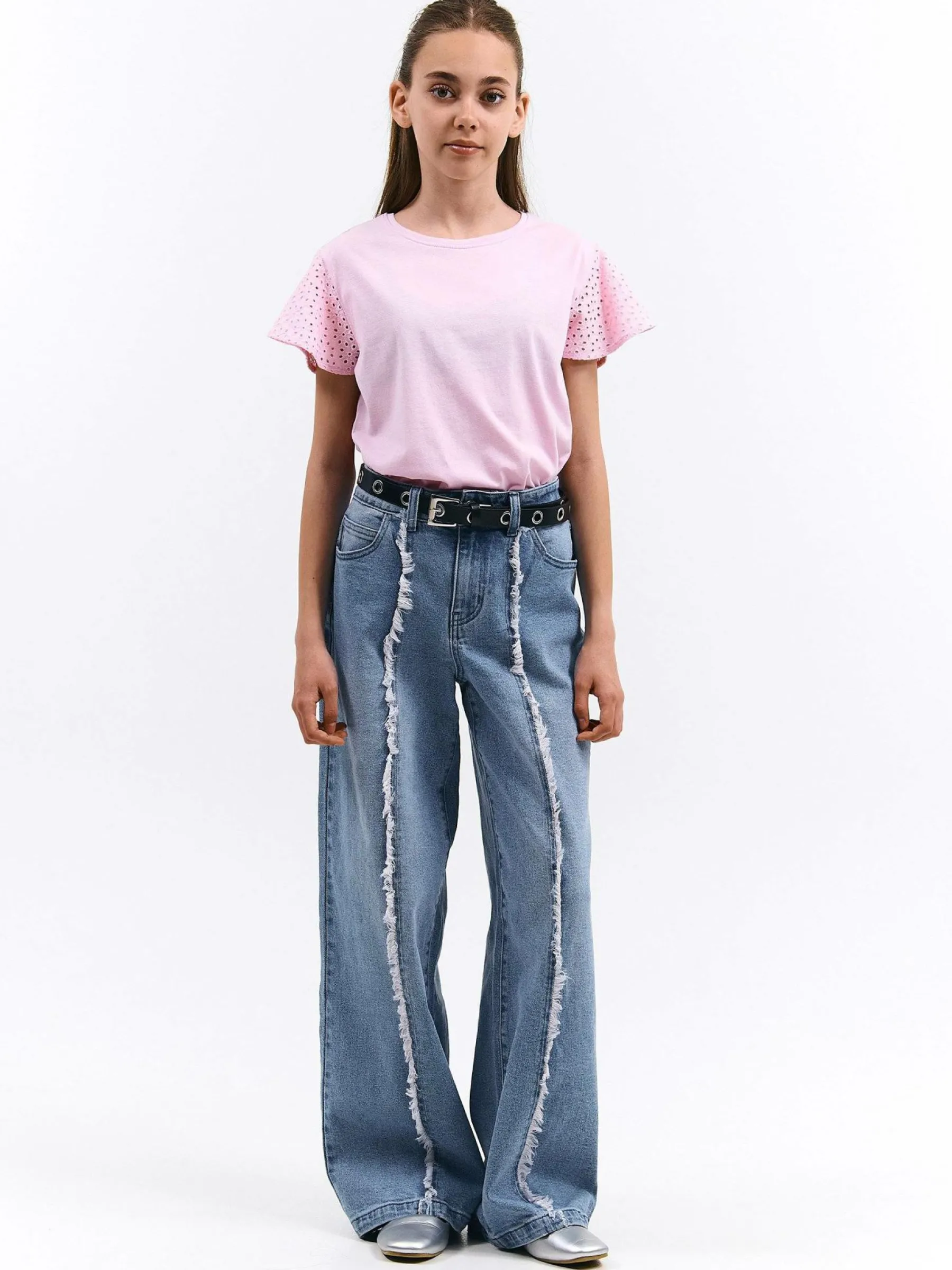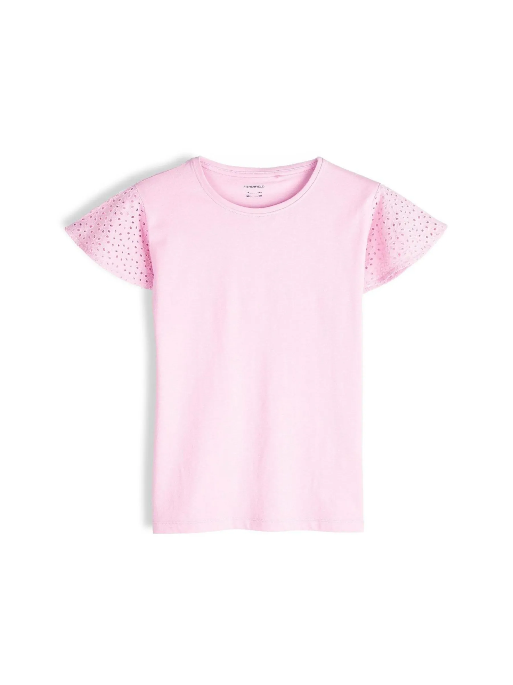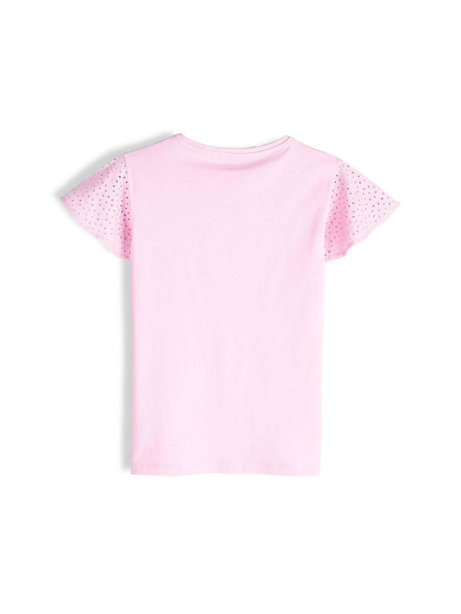 Kolor: różowyKrój: z falbanąTyp: koszulkaRekaw: krótki rękawDługość: krótkiPattern style: pojedynczy kolorDeta…