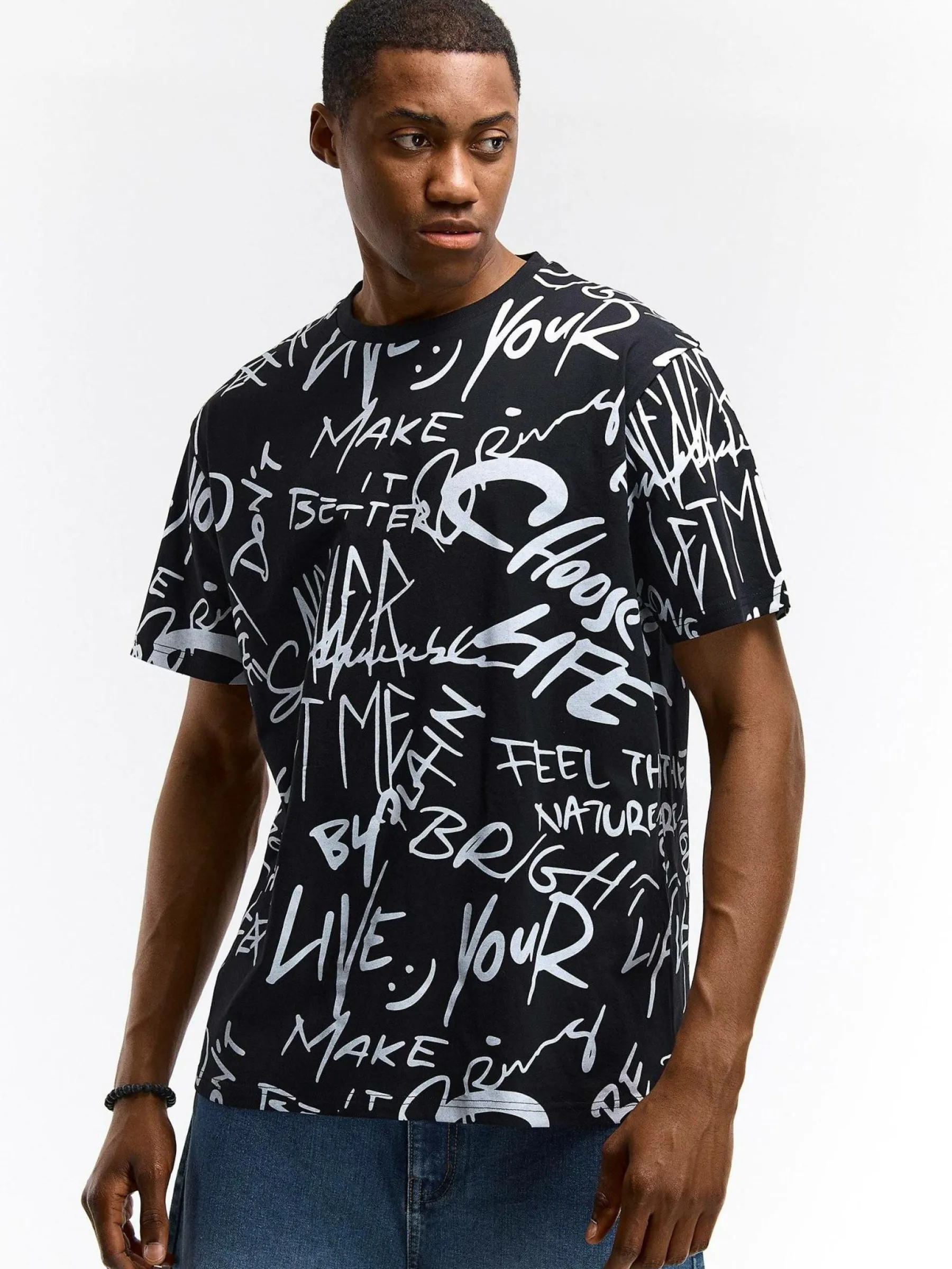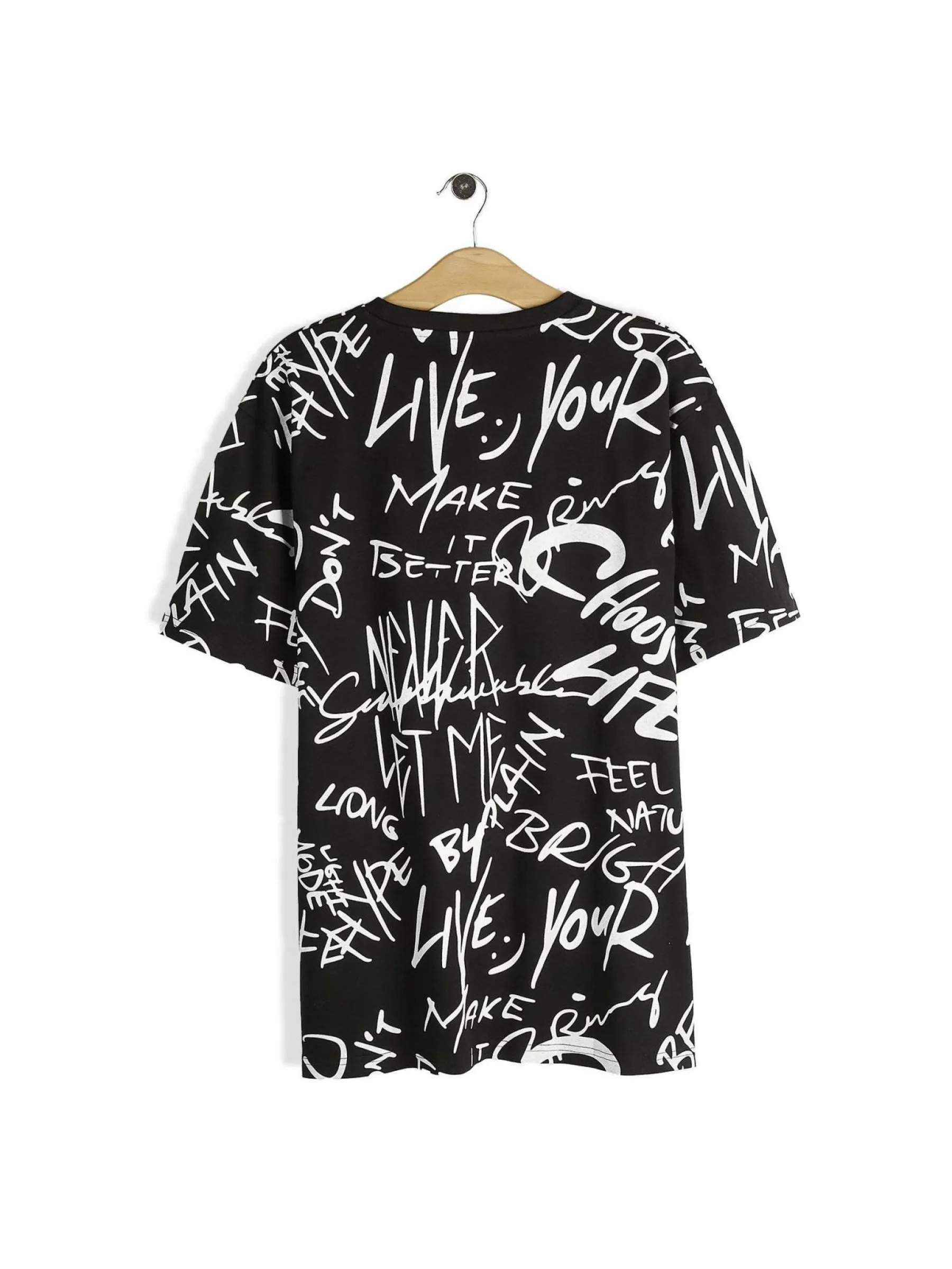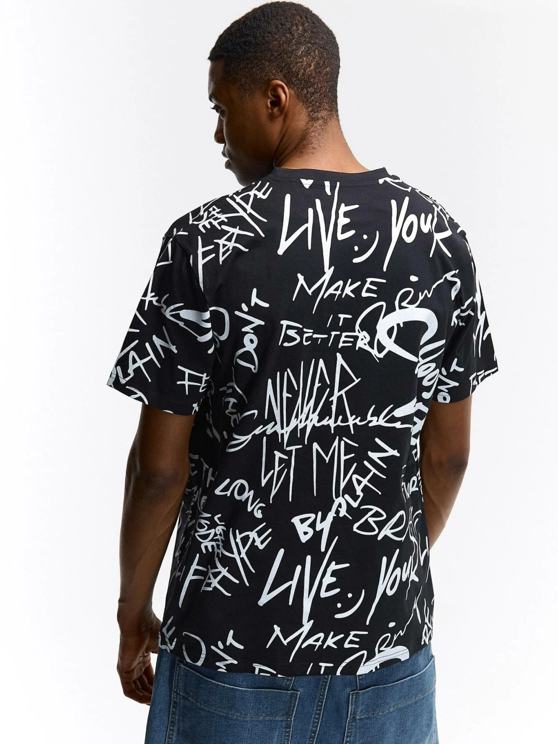 Kolor: czarnyKrój: regularTyp: koszulkaRekaw: krótki rękawPattern style: wzorzysteDetal: nad głowąMateriał: baweł…