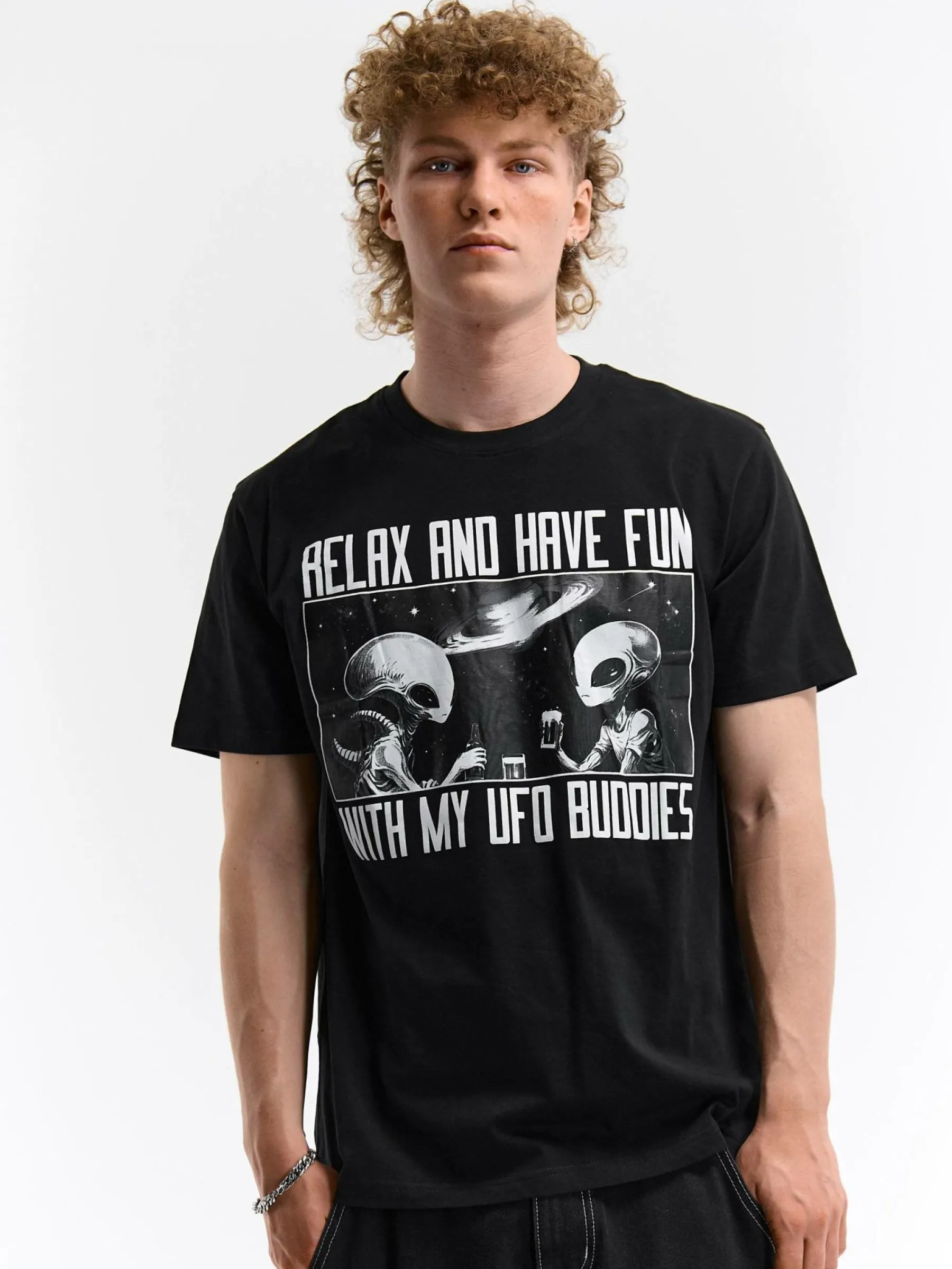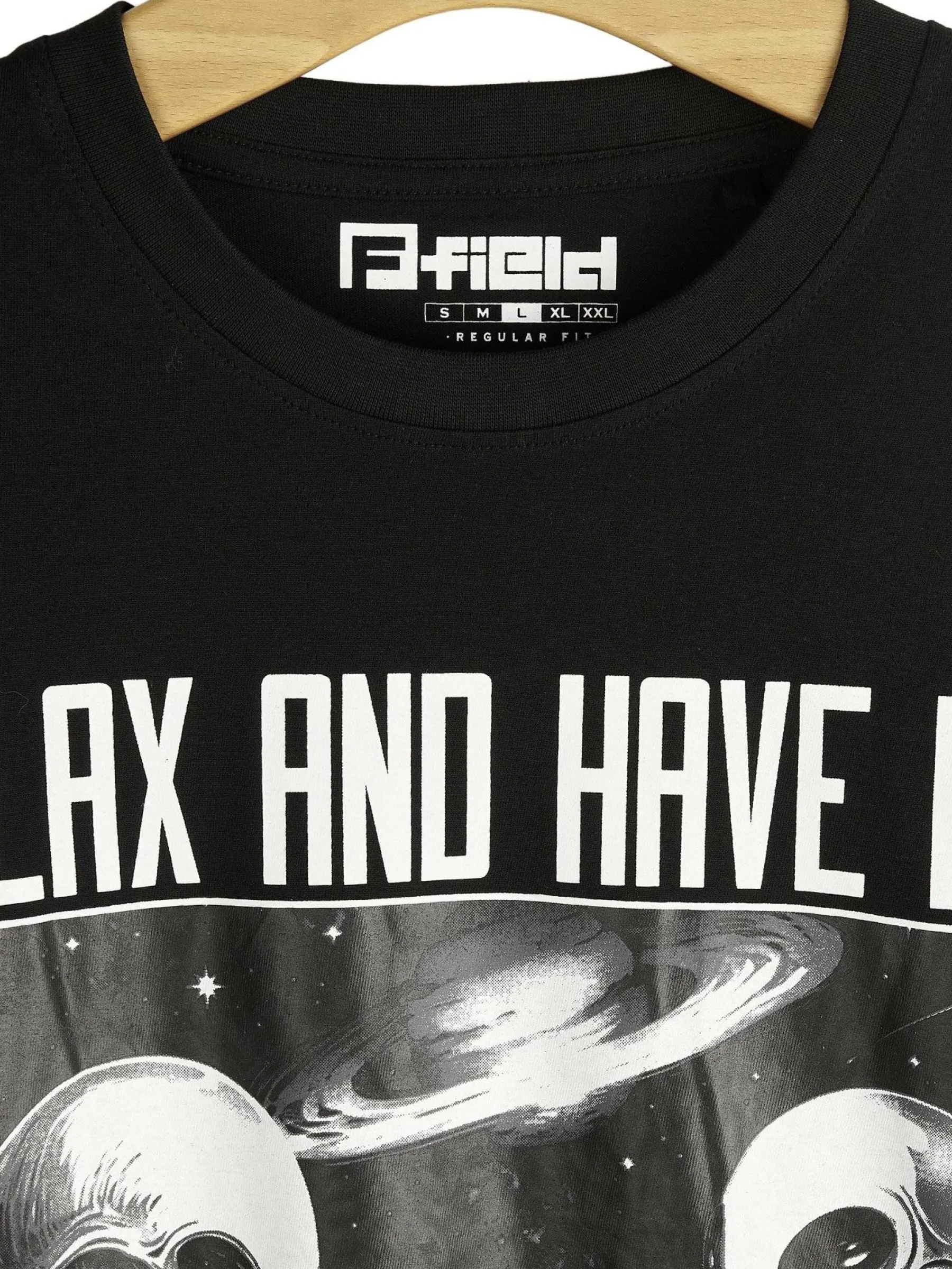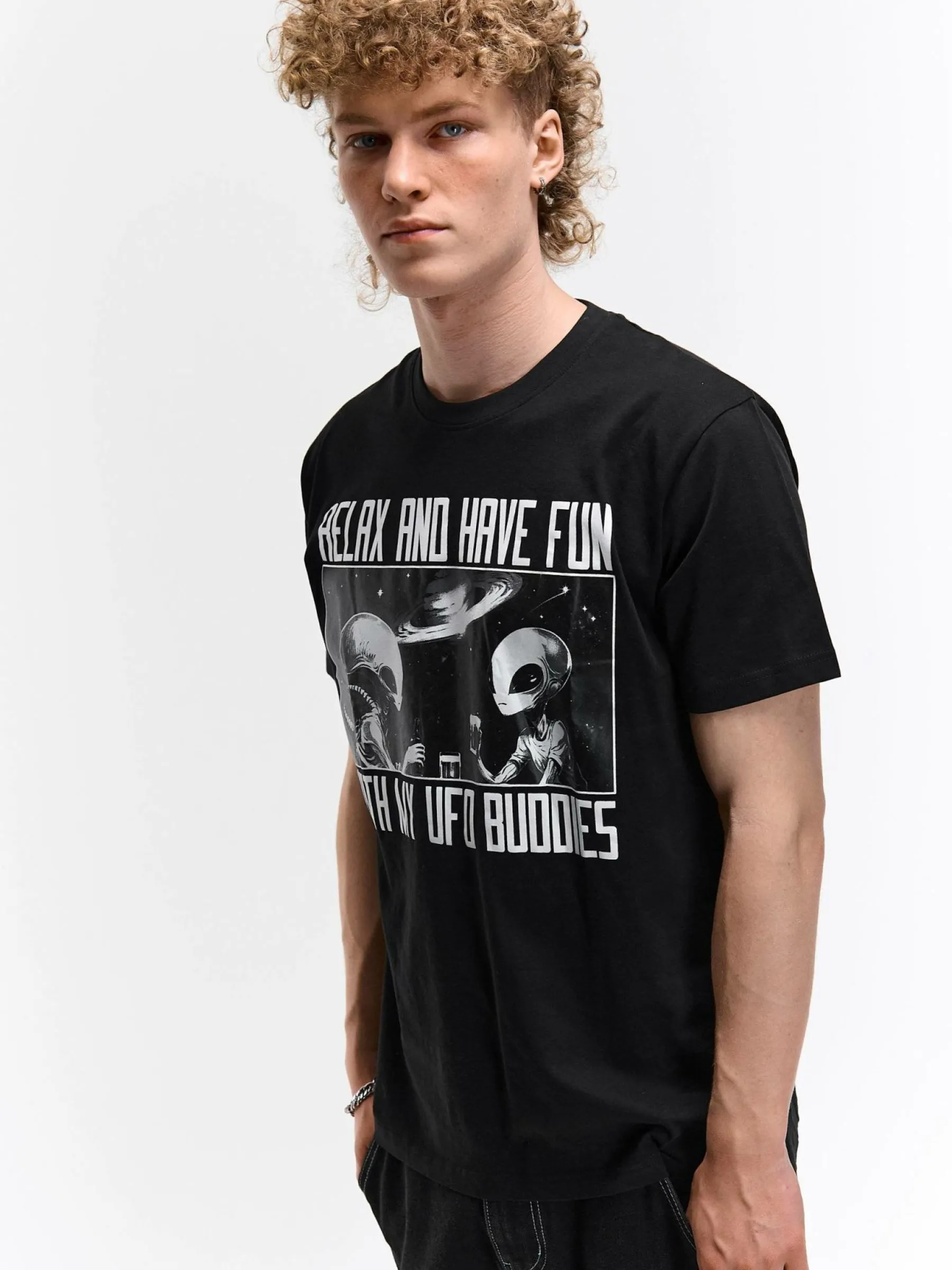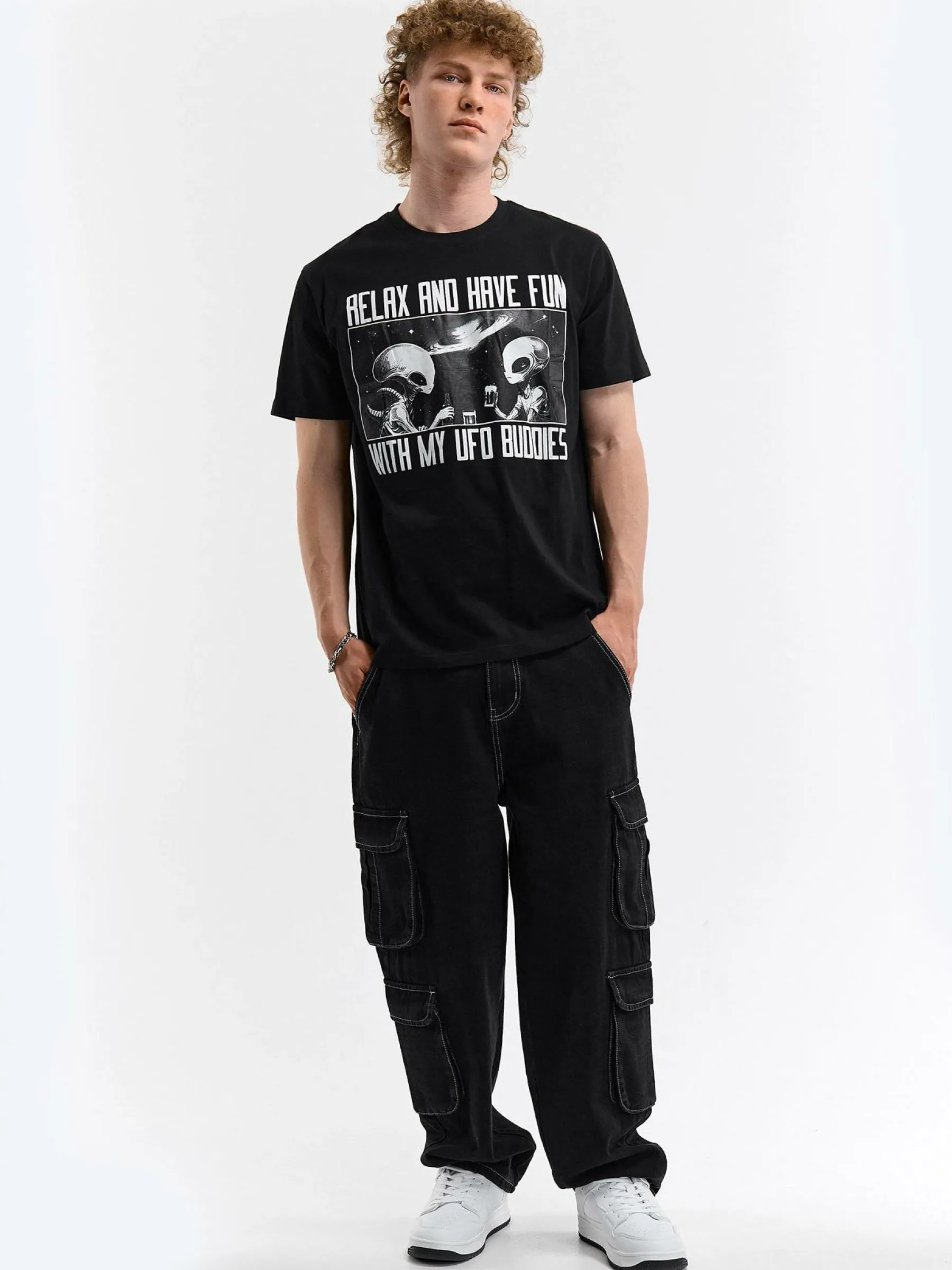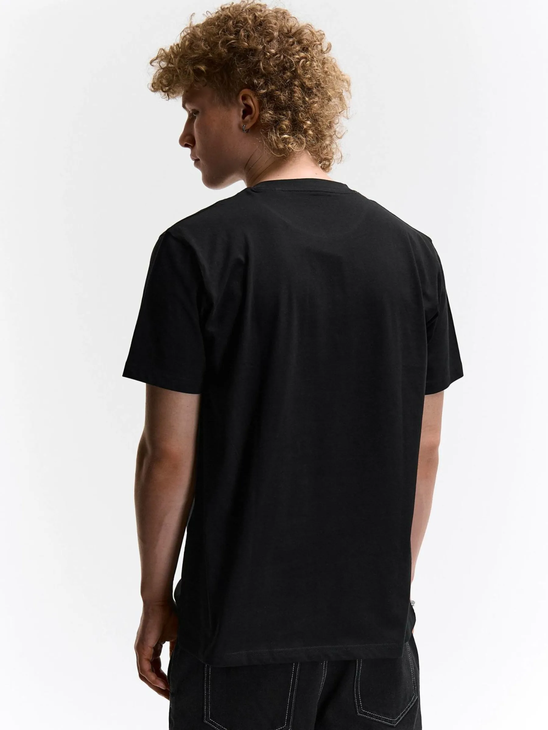 Kolor: czarnyKrój: regularTyp: koszulkaRekaw: krótki rękawPattern style: z nadrukiemDetal: nad głowąMateriał: bawe…