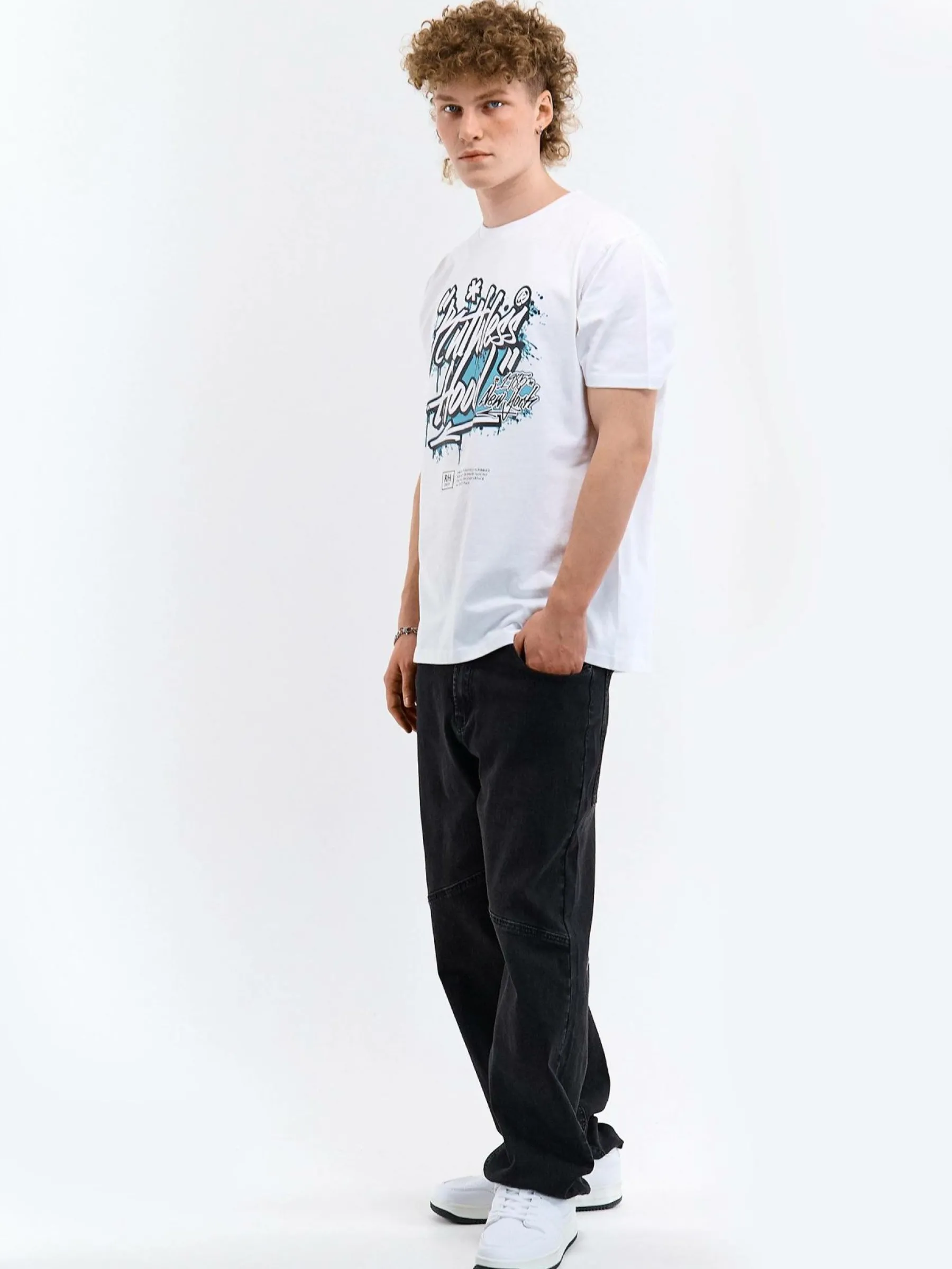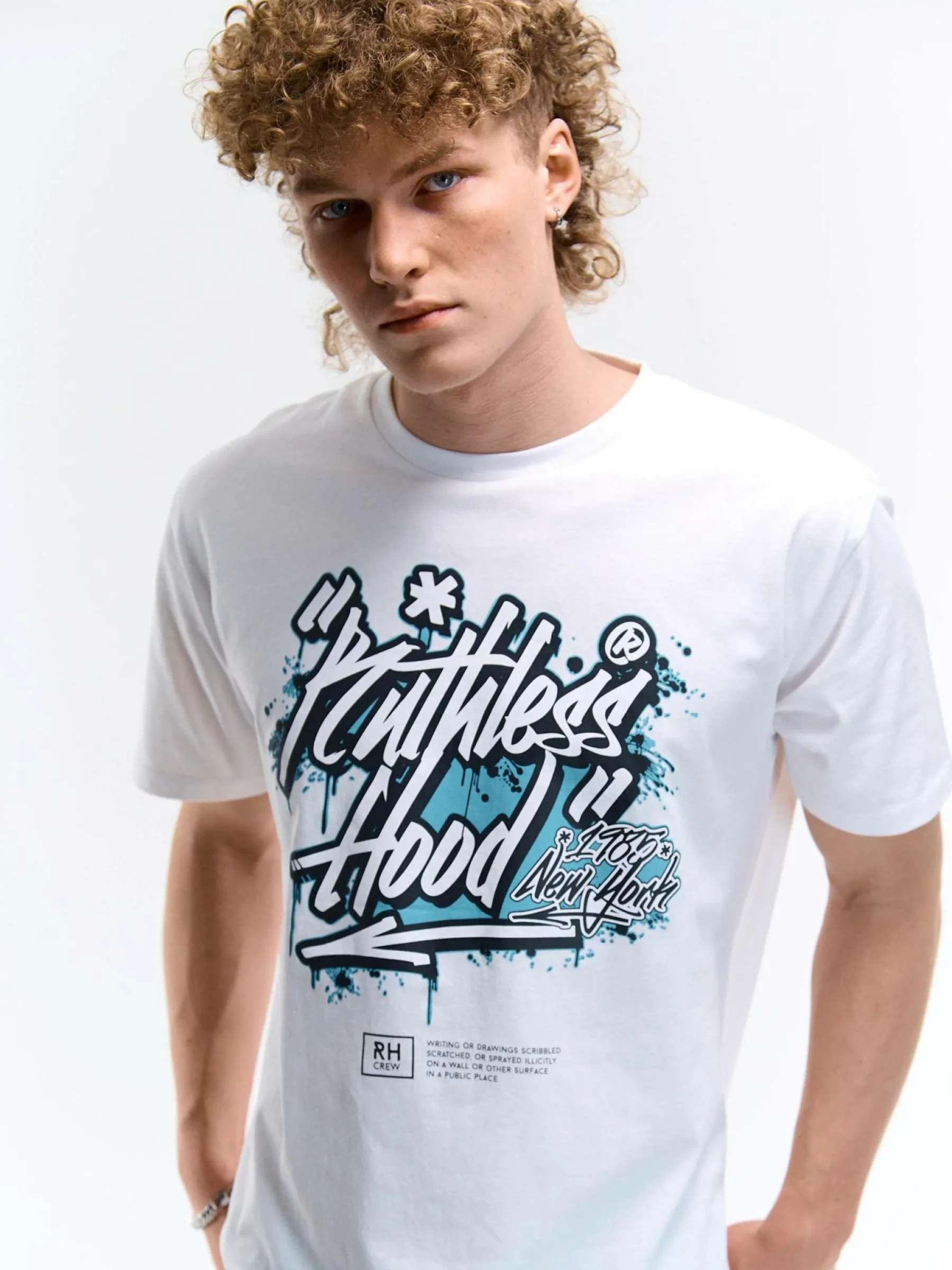 Kolor: białyKrój: regularTyp: koszulkaRekaw: krótki rękawPattern style: z nadrukiemDetal: nad głowąMateriał: bawe…