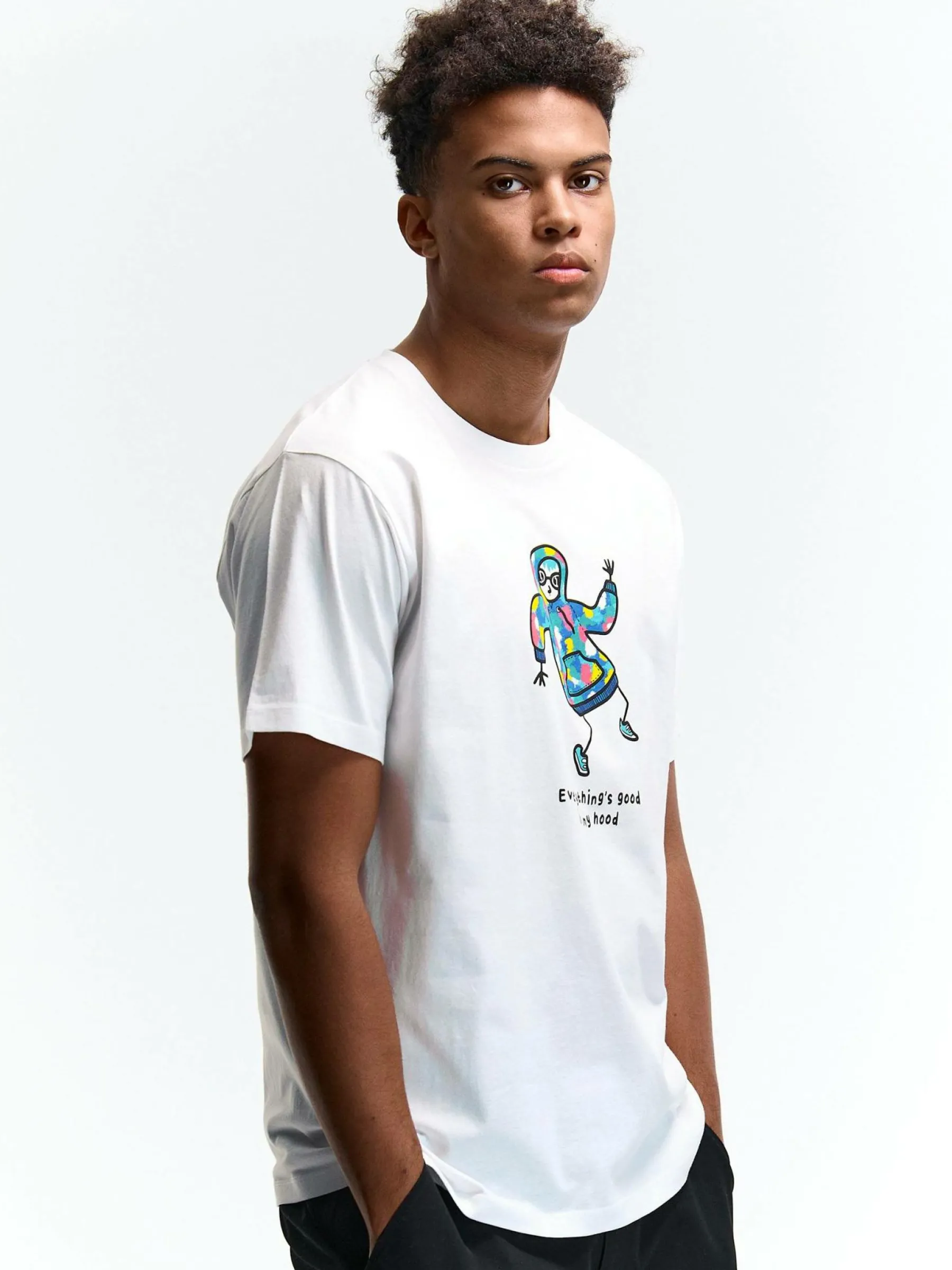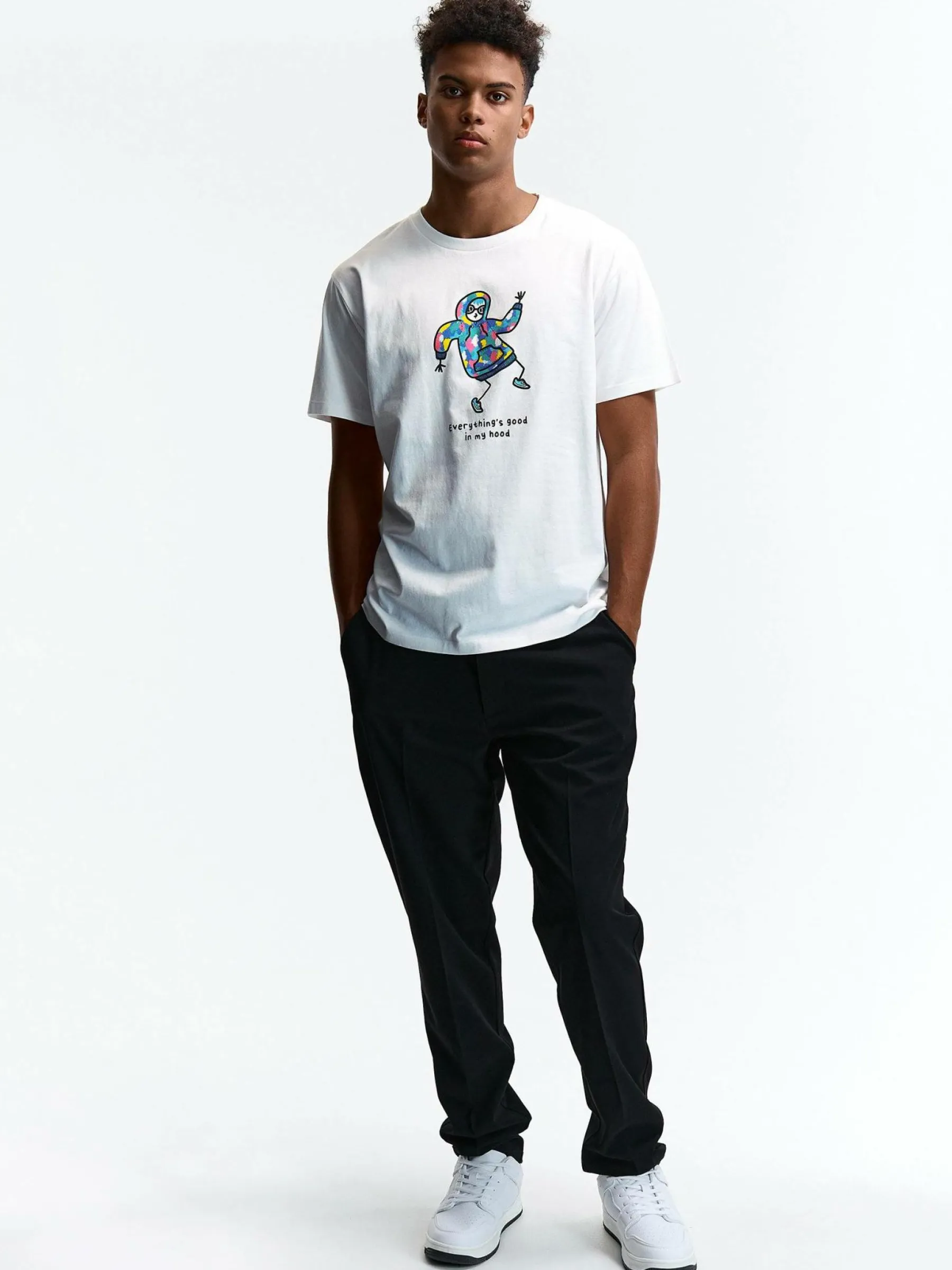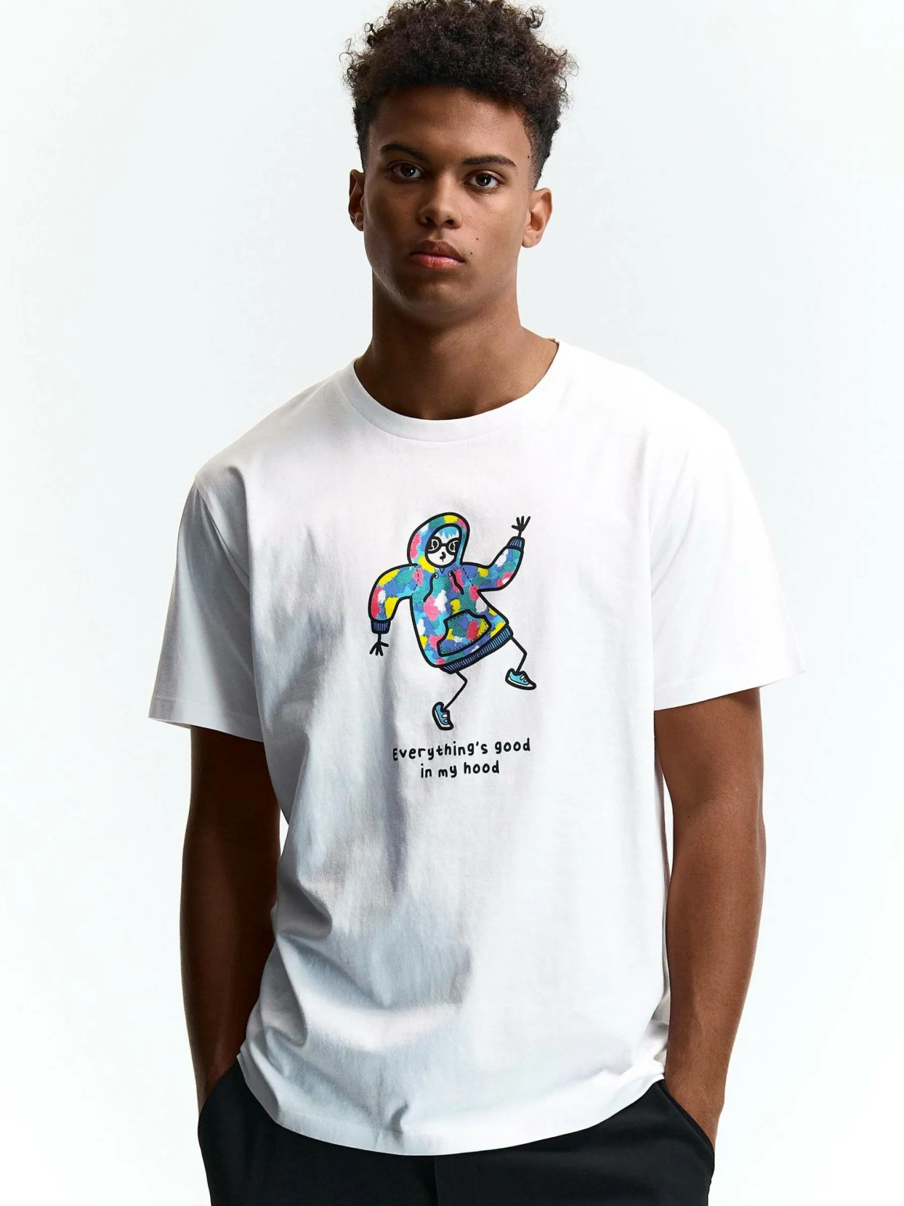 Kolor: białyKrój: regularTyp: koszulkaRekaw: krótki rękawPattern style: z nadrukiemDetal: nad głowąMateriał: bawe…
