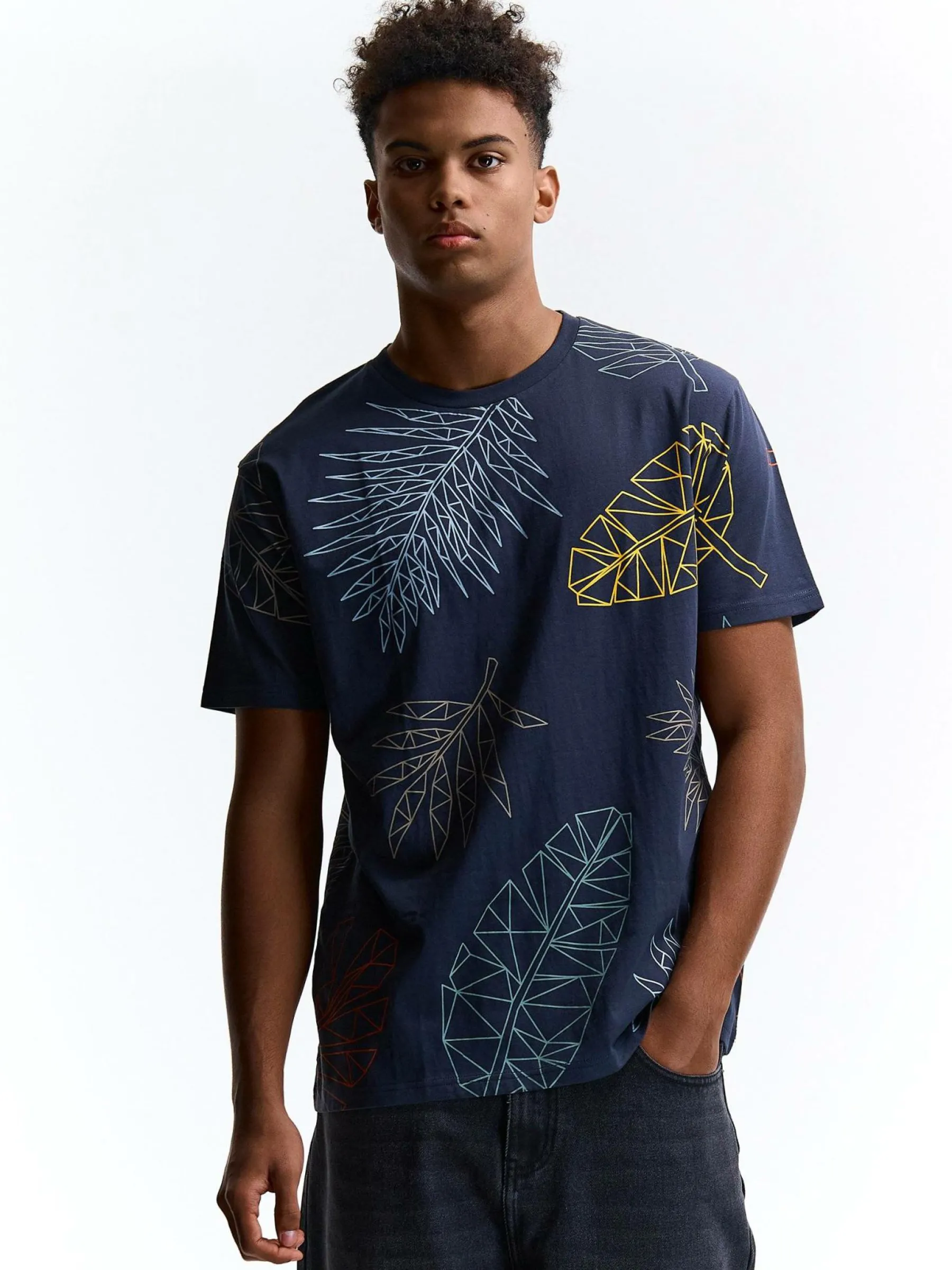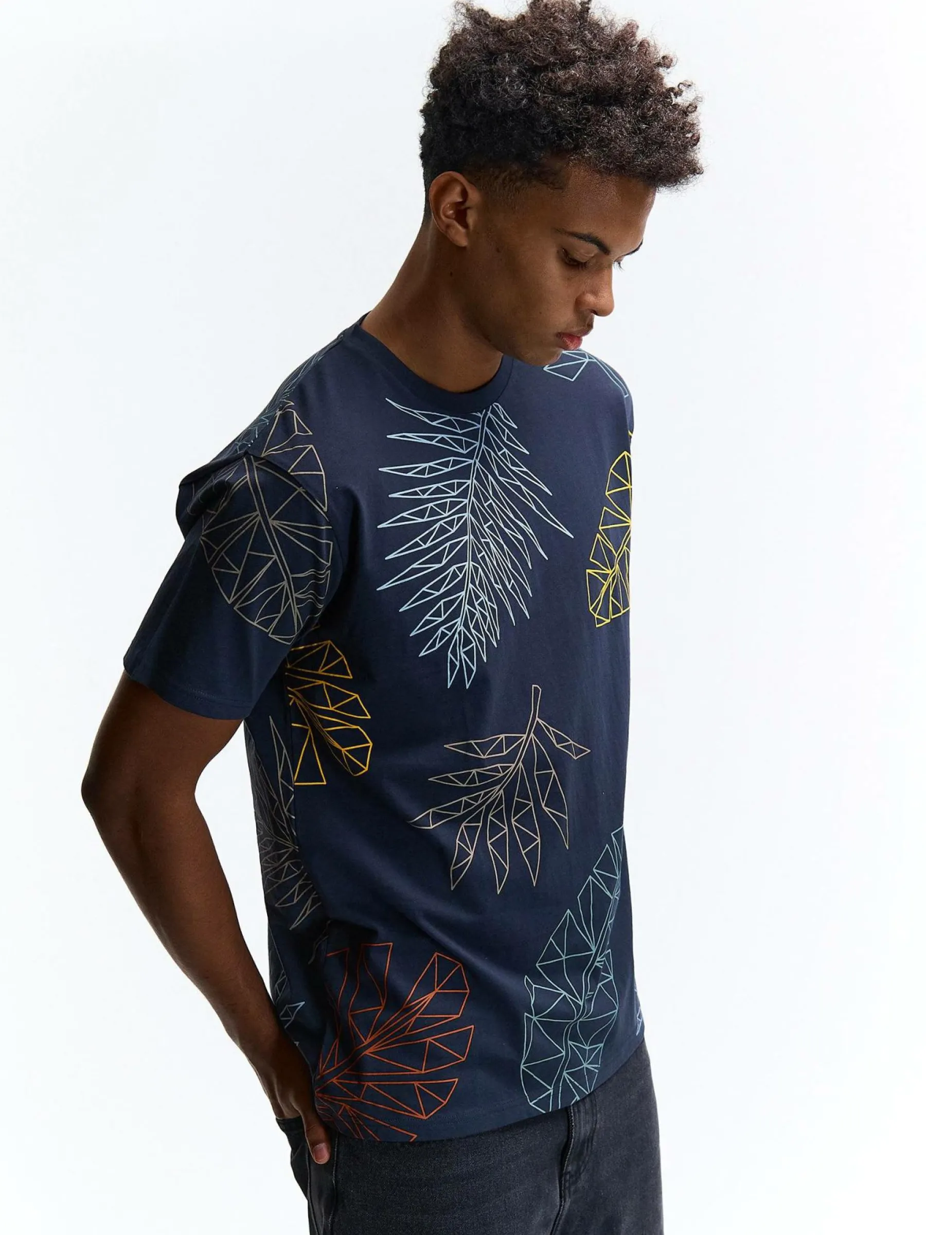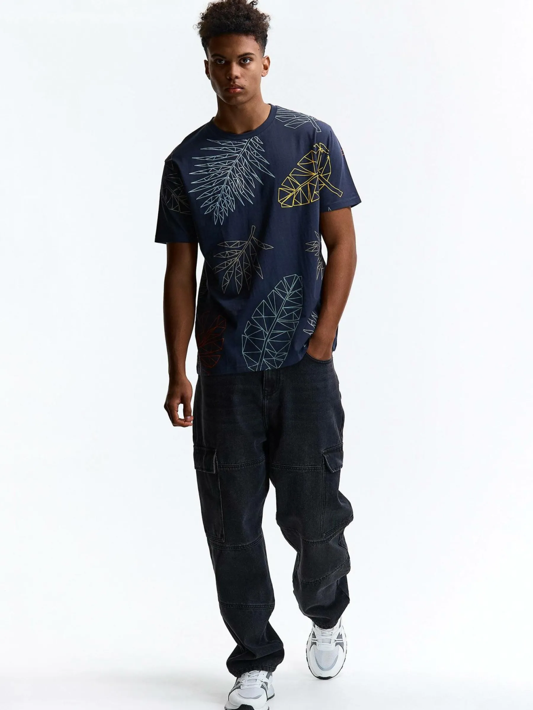 Kolor: granatowyKrój: regularTyp: koszulkaRekaw: krótki rękawPattern style: z nadrukiemDetal: nad głowąMateriał: b…