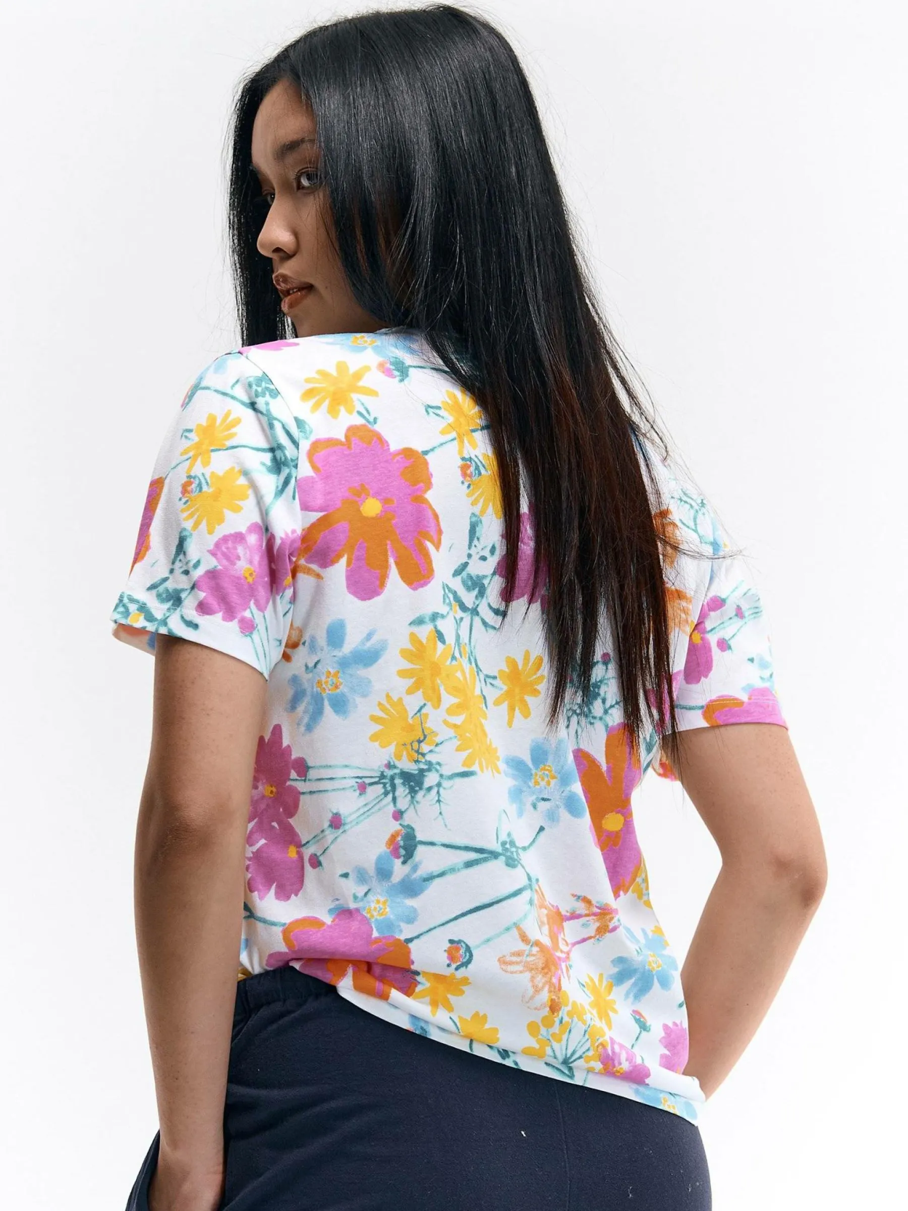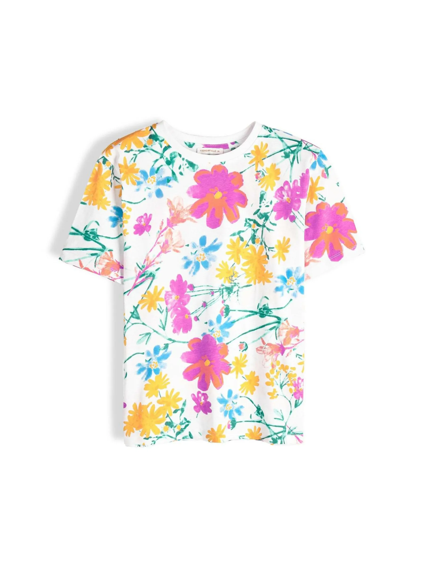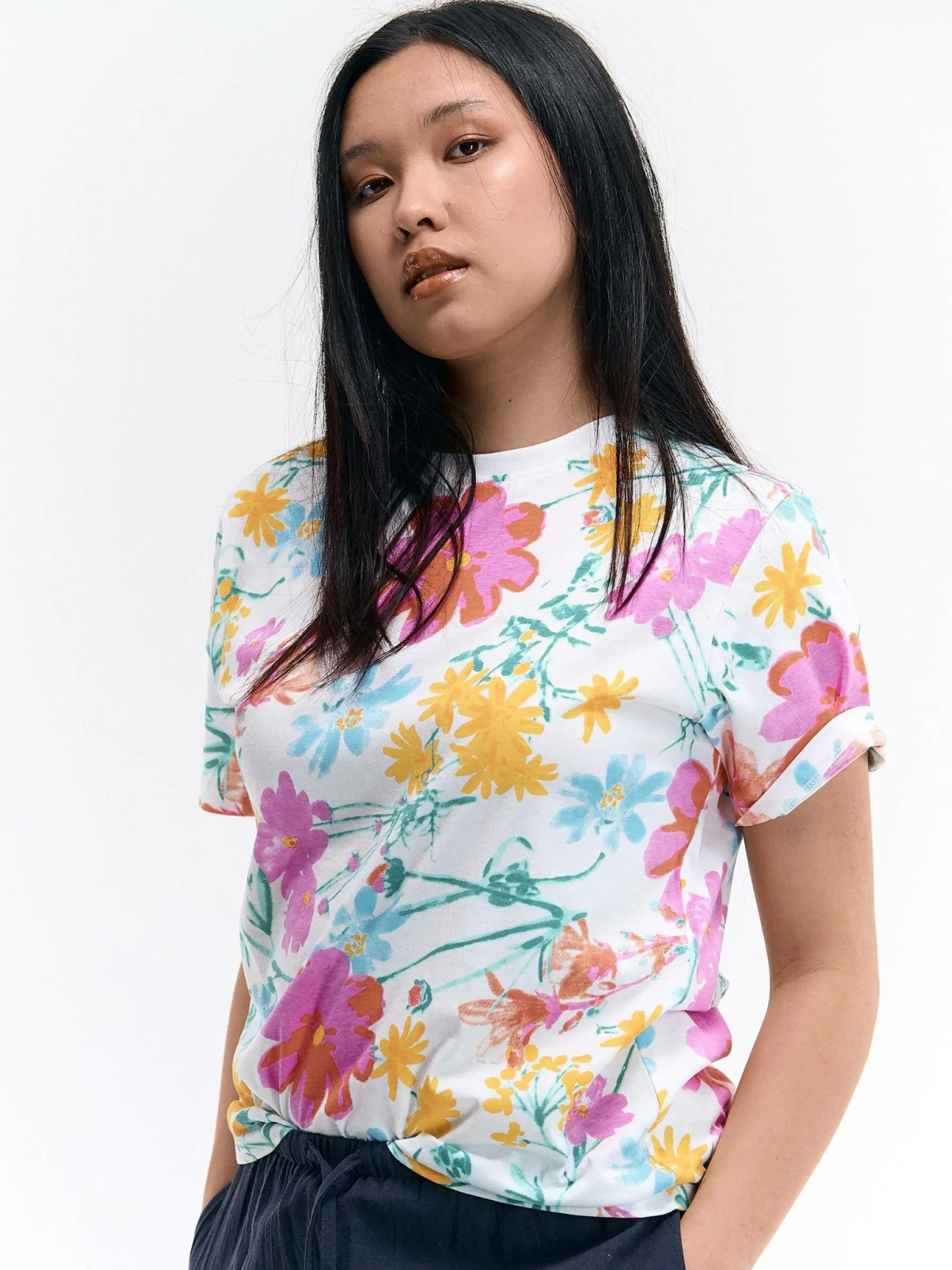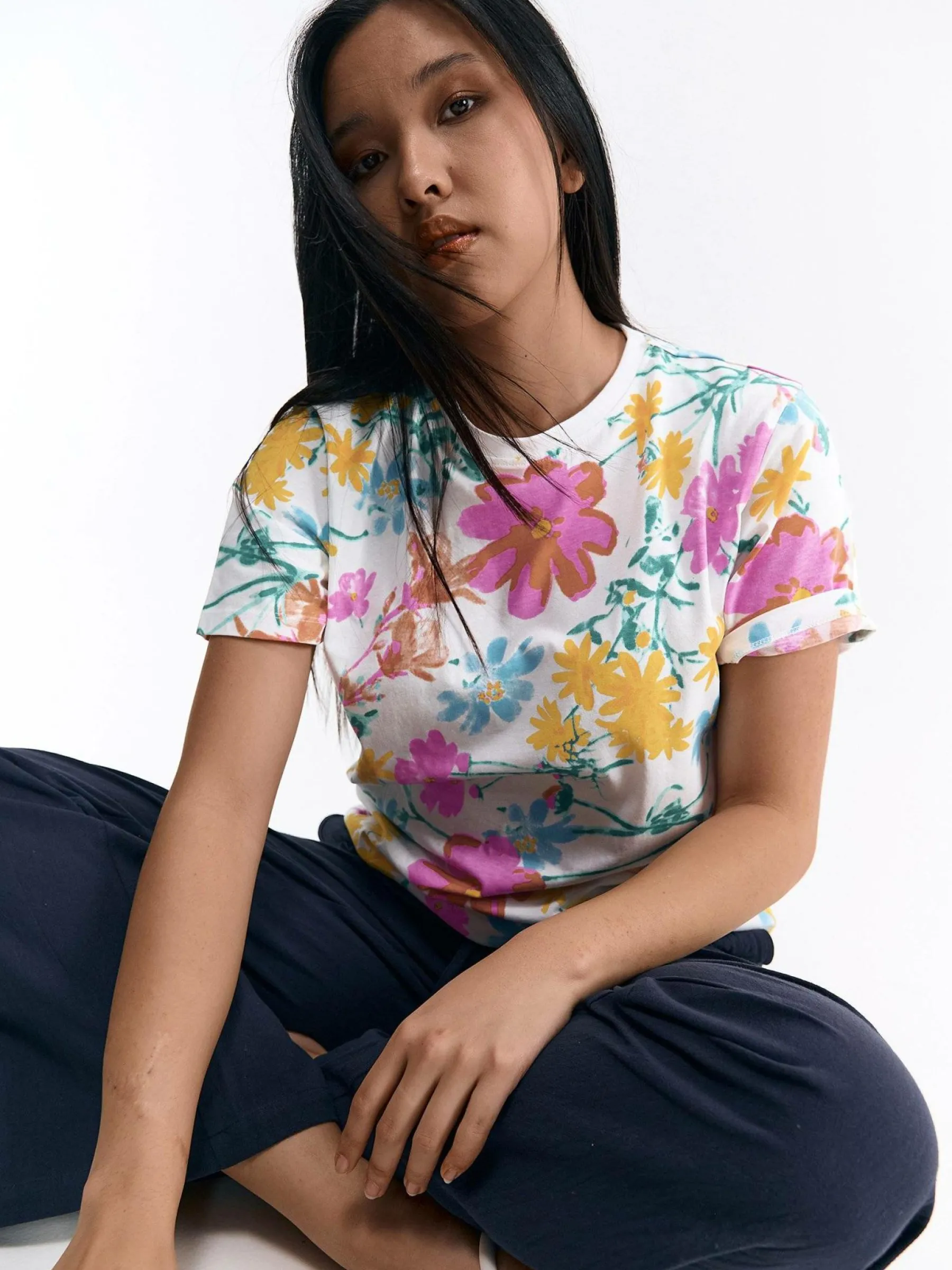 Kolor: białyKrój: podstawowyTyp: koszulkaRekaw: krótki rękawDługość: krótkiPattern style: kwiatoweDetal: nad gł…