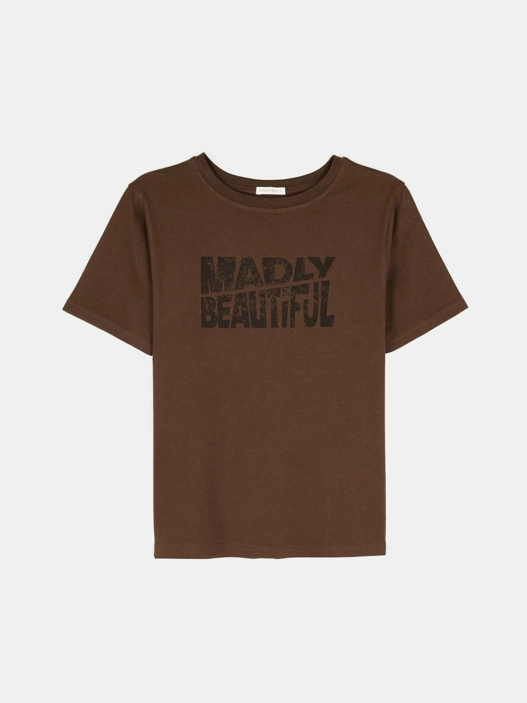 Kolor: brązowyKrój: regularTyp: koszulkaRekaw: krótki rękawDługość: krótkiPattern style: z nadrukiemDetal: nad g…