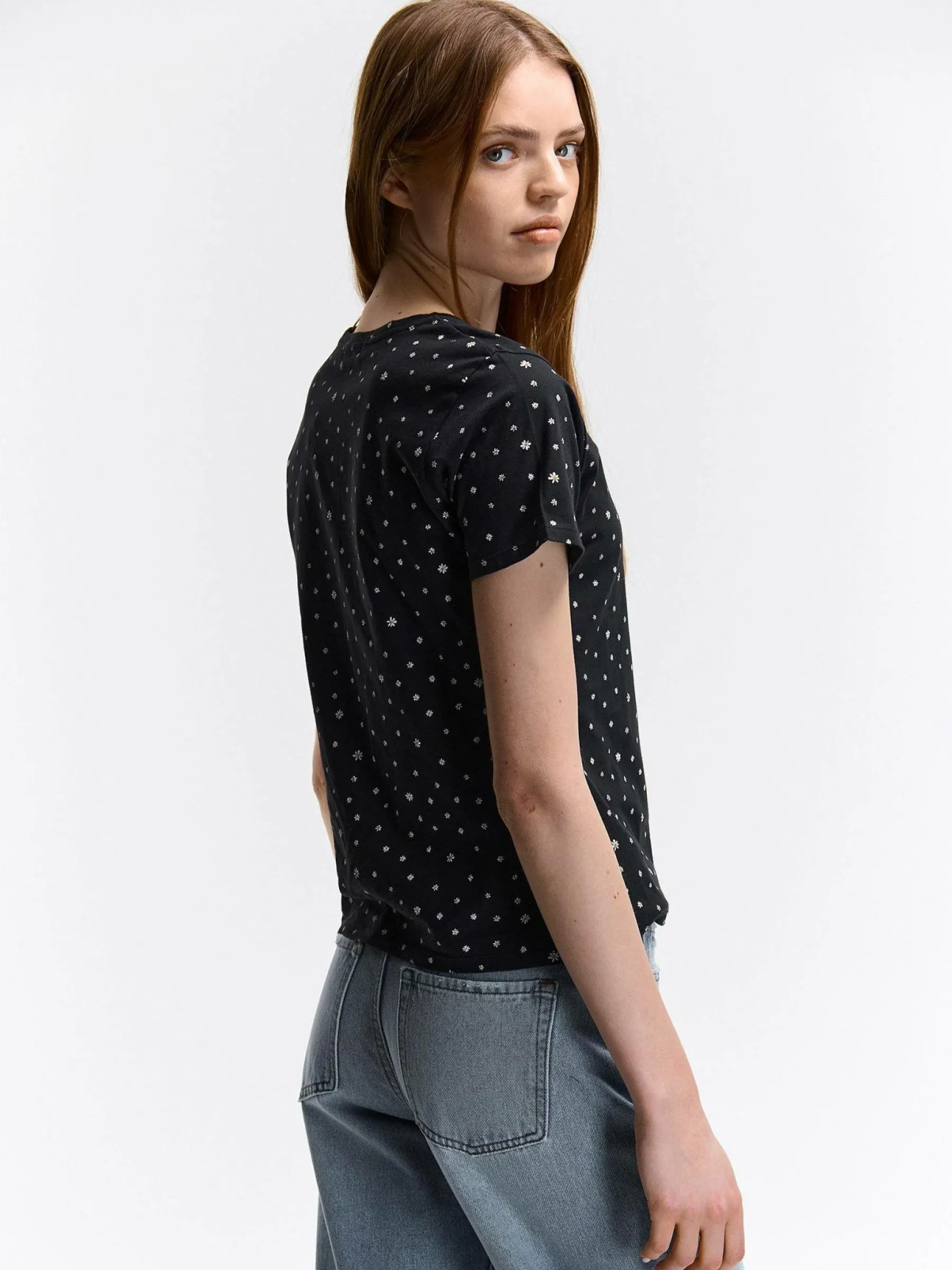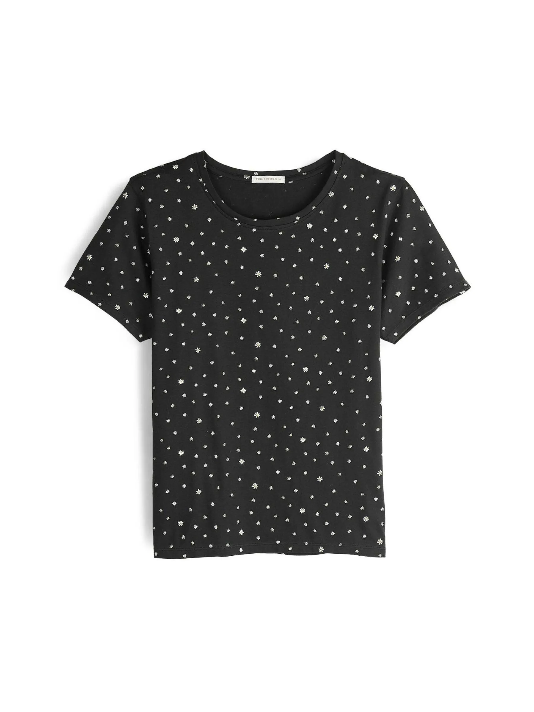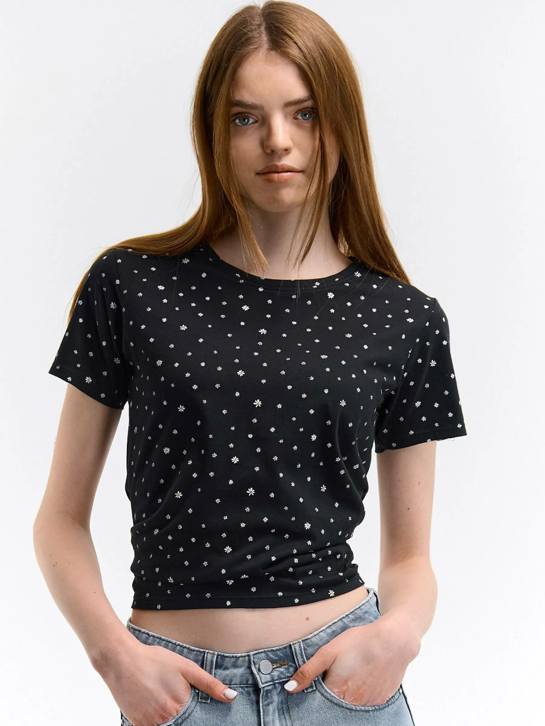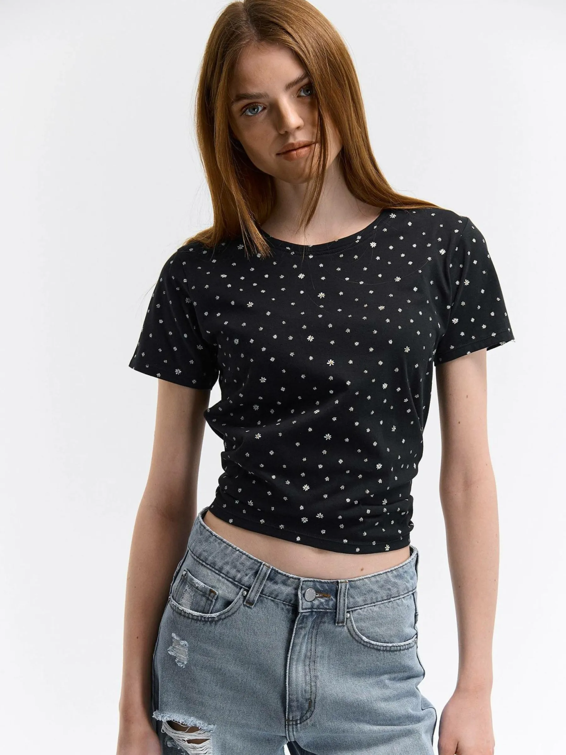 Kolor: czarnyKrój: podstawowyTyp: koszulkaRekaw: krótki rękawDługość: krótkiPattern style: z nadrukiem, kwiatoweD…