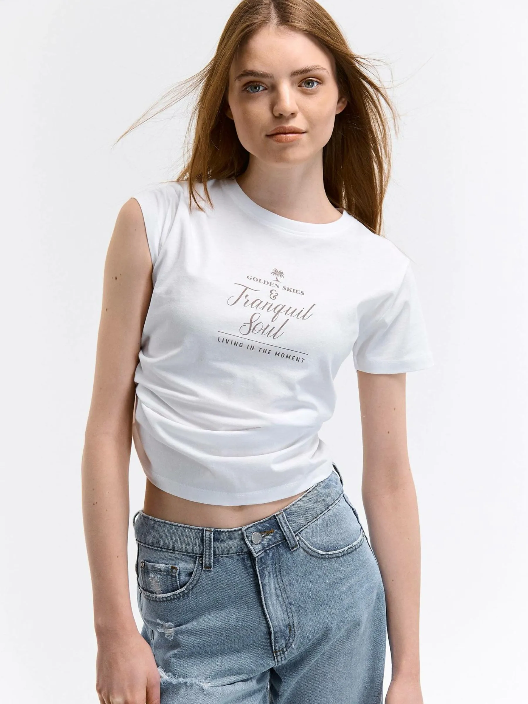 Kolor: białyKrój: regularTyp: koszulkaRekaw: krótki rękawDługość: krótkiPattern style: z nadrukiemDetal: nad gł…