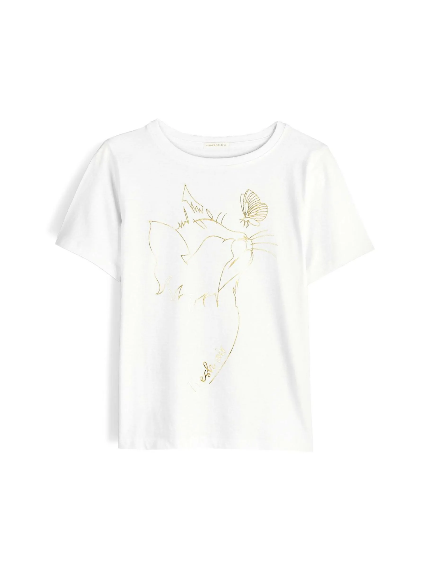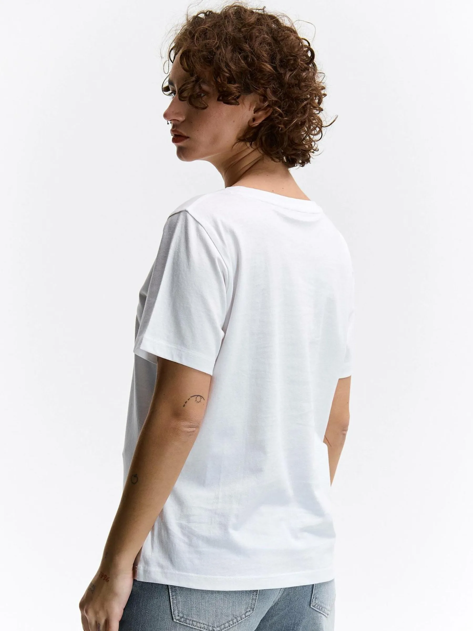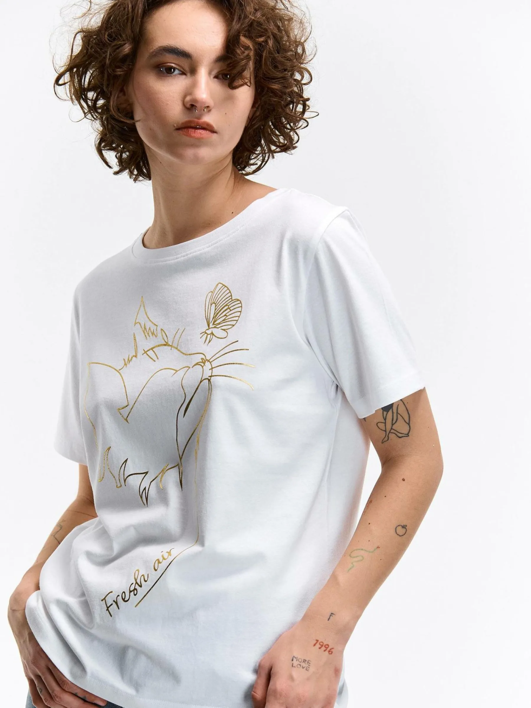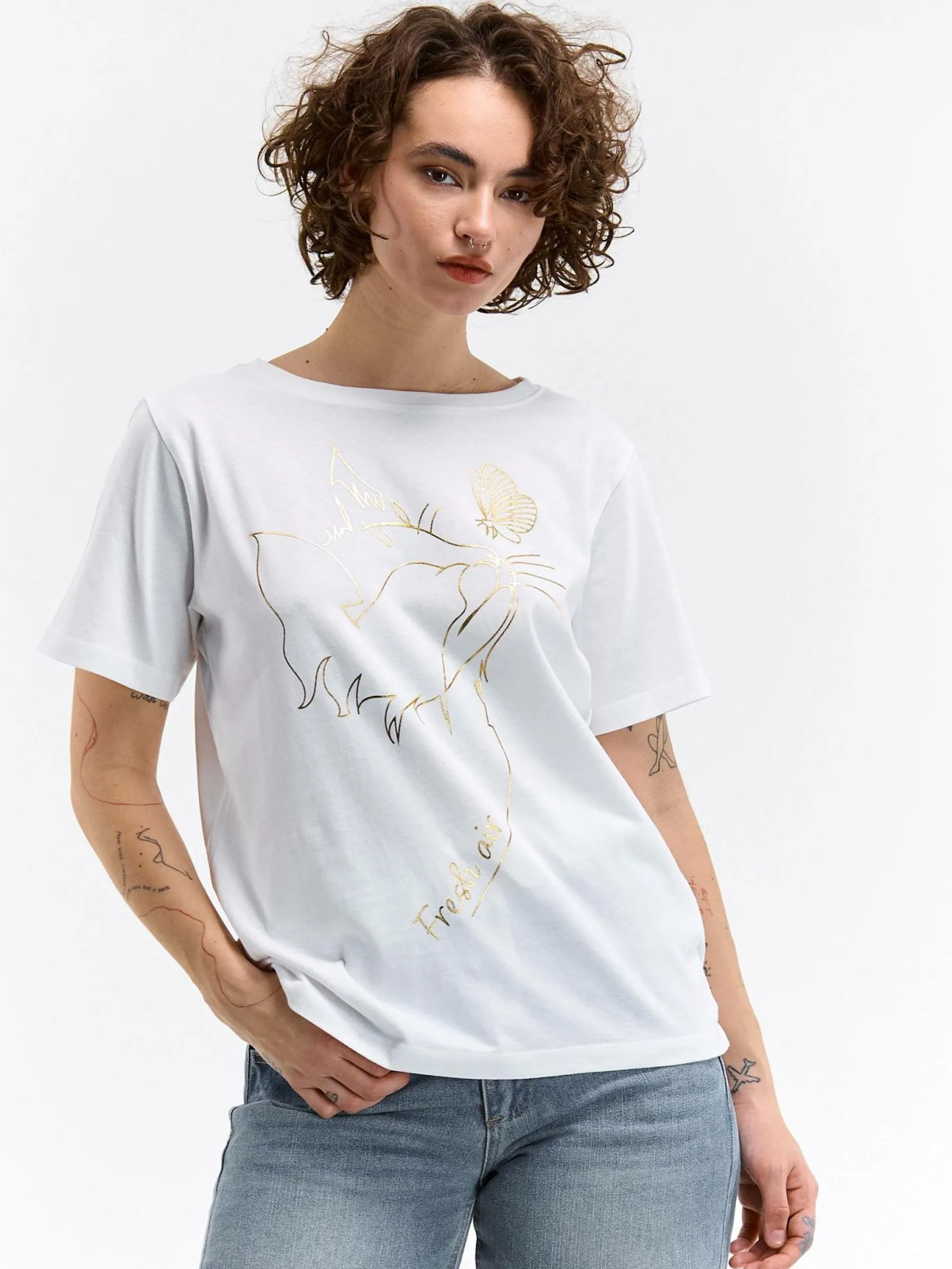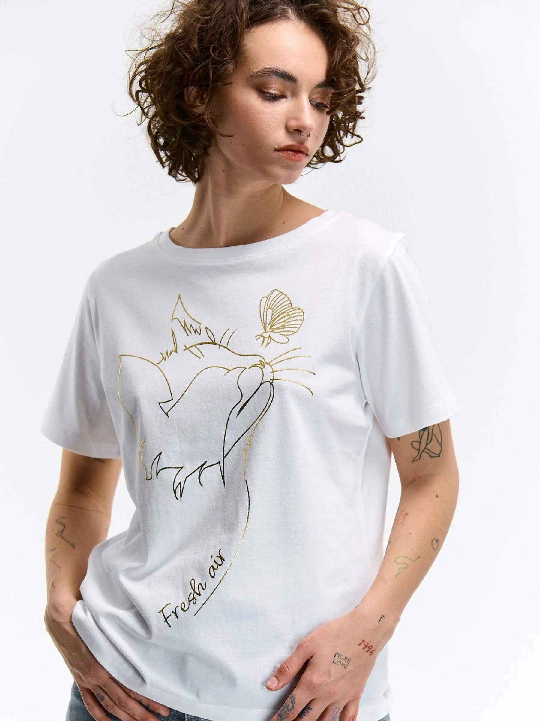 Kolor: białyKrój: regularTyp: koszulkaRekaw: krótki rękawDługość: krótkiPattern style: z nadrukiemDetal: nad gł…