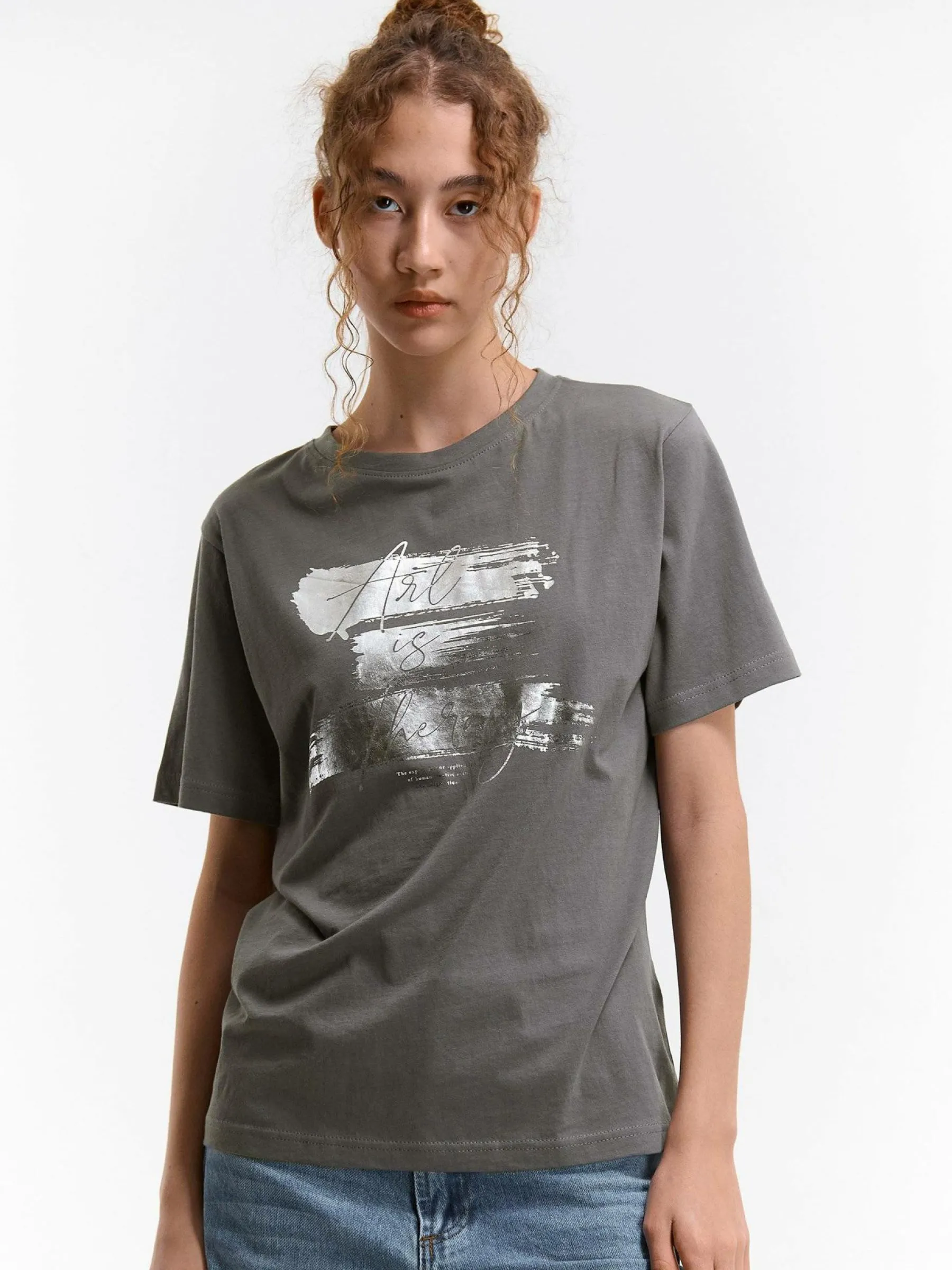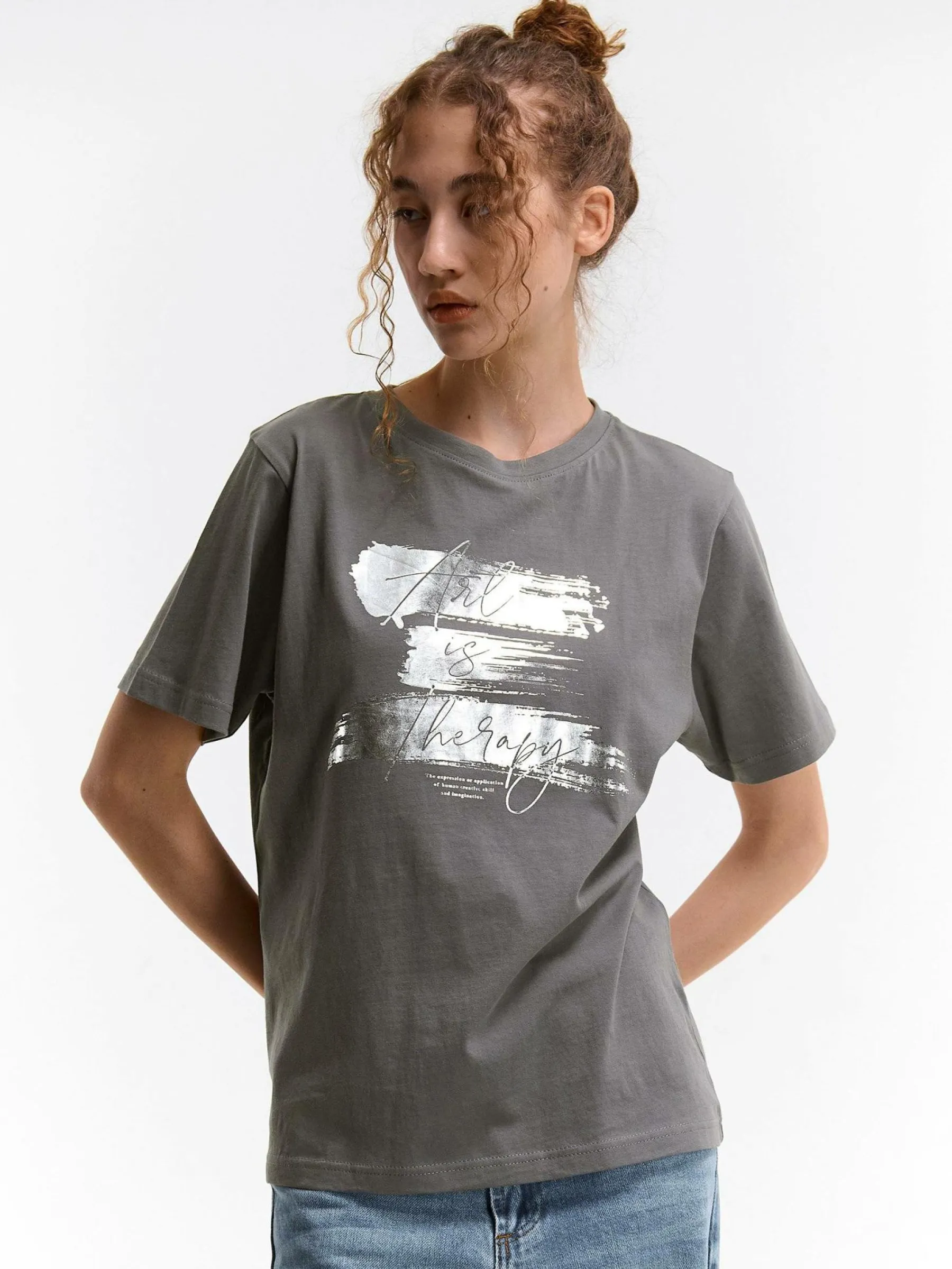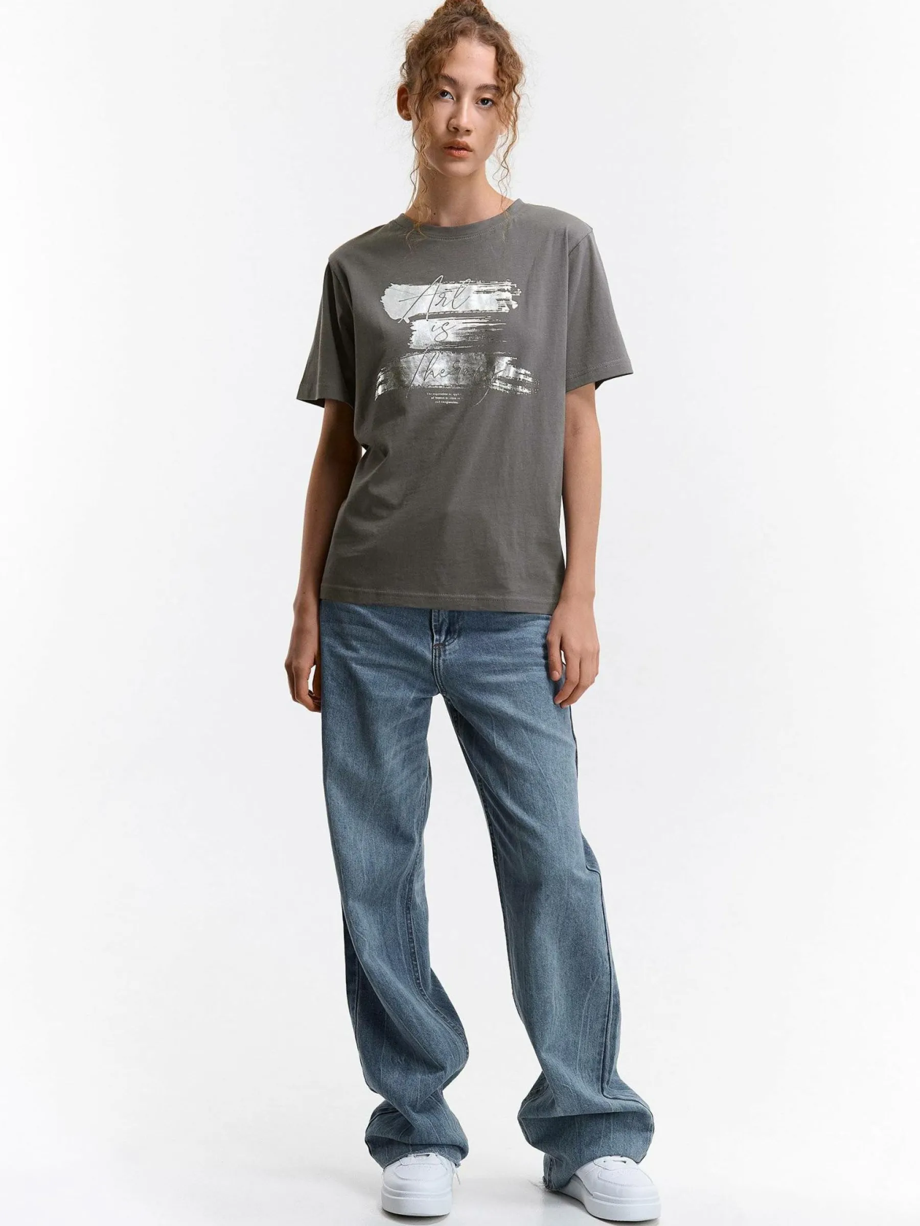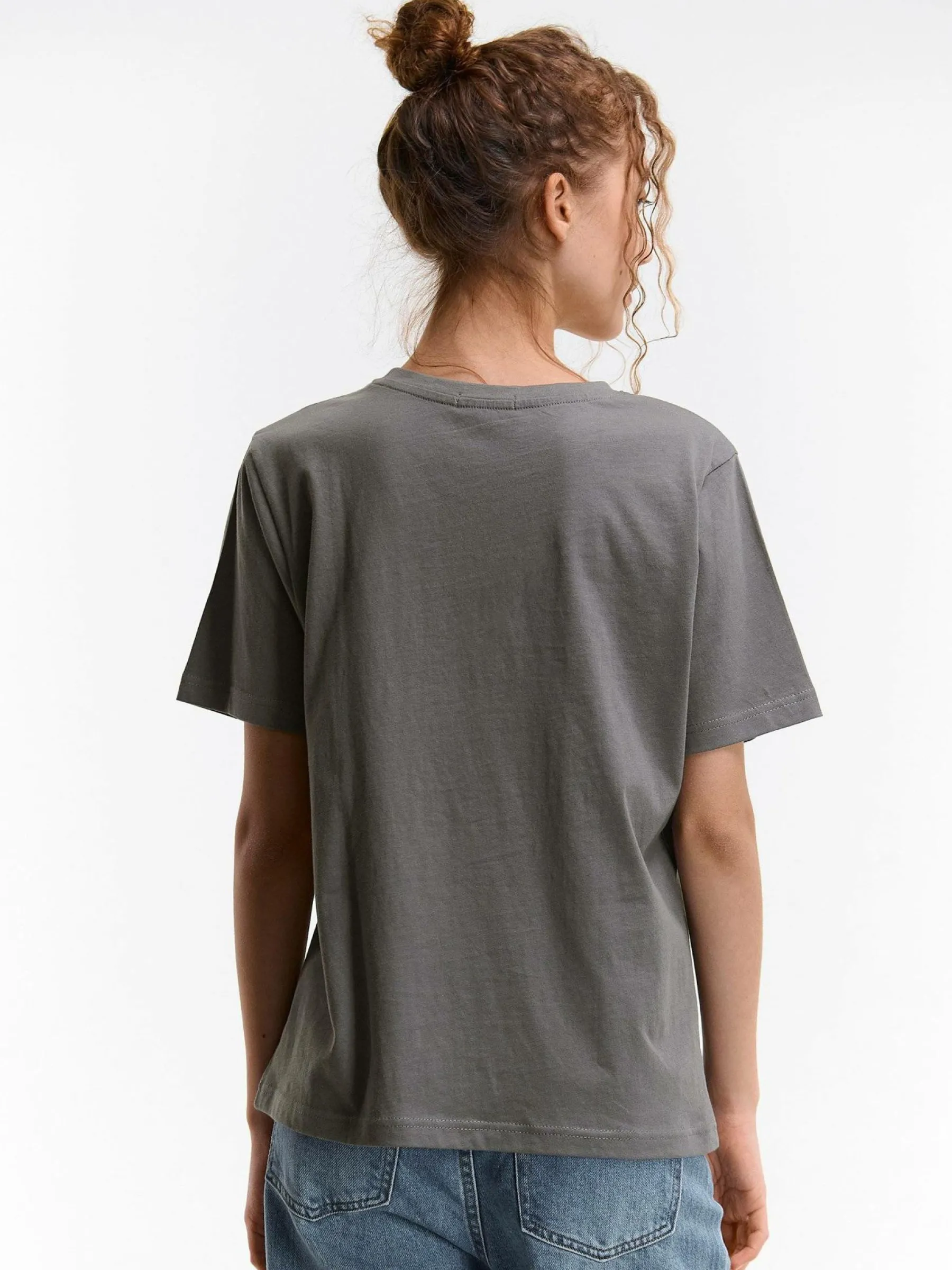 Kolor: szaryKrój: podstawowyTyp: koszulkaRekaw: krótki rękawDługość: krótkiPattern style: z nadrukiemDetal: nad g…