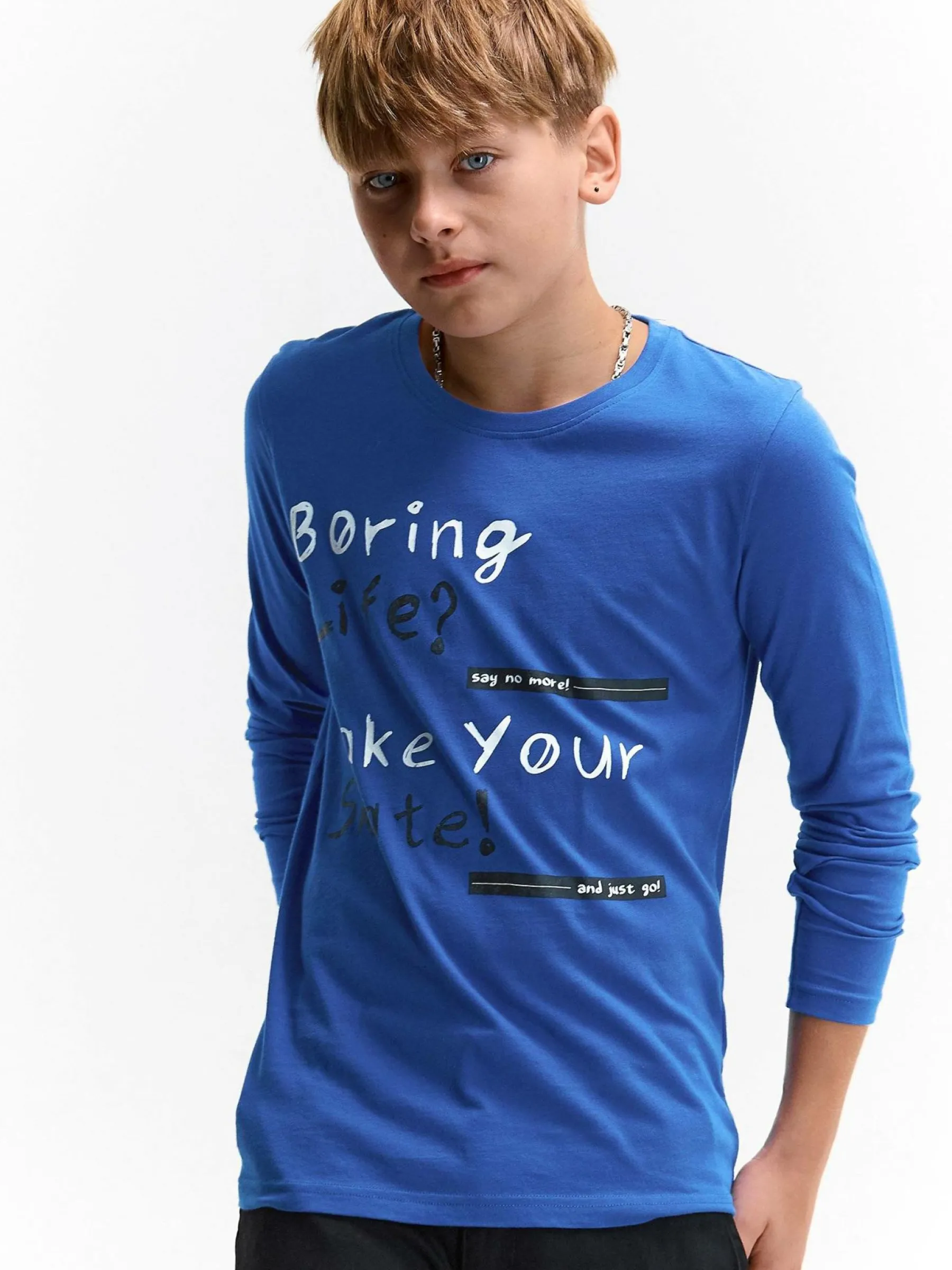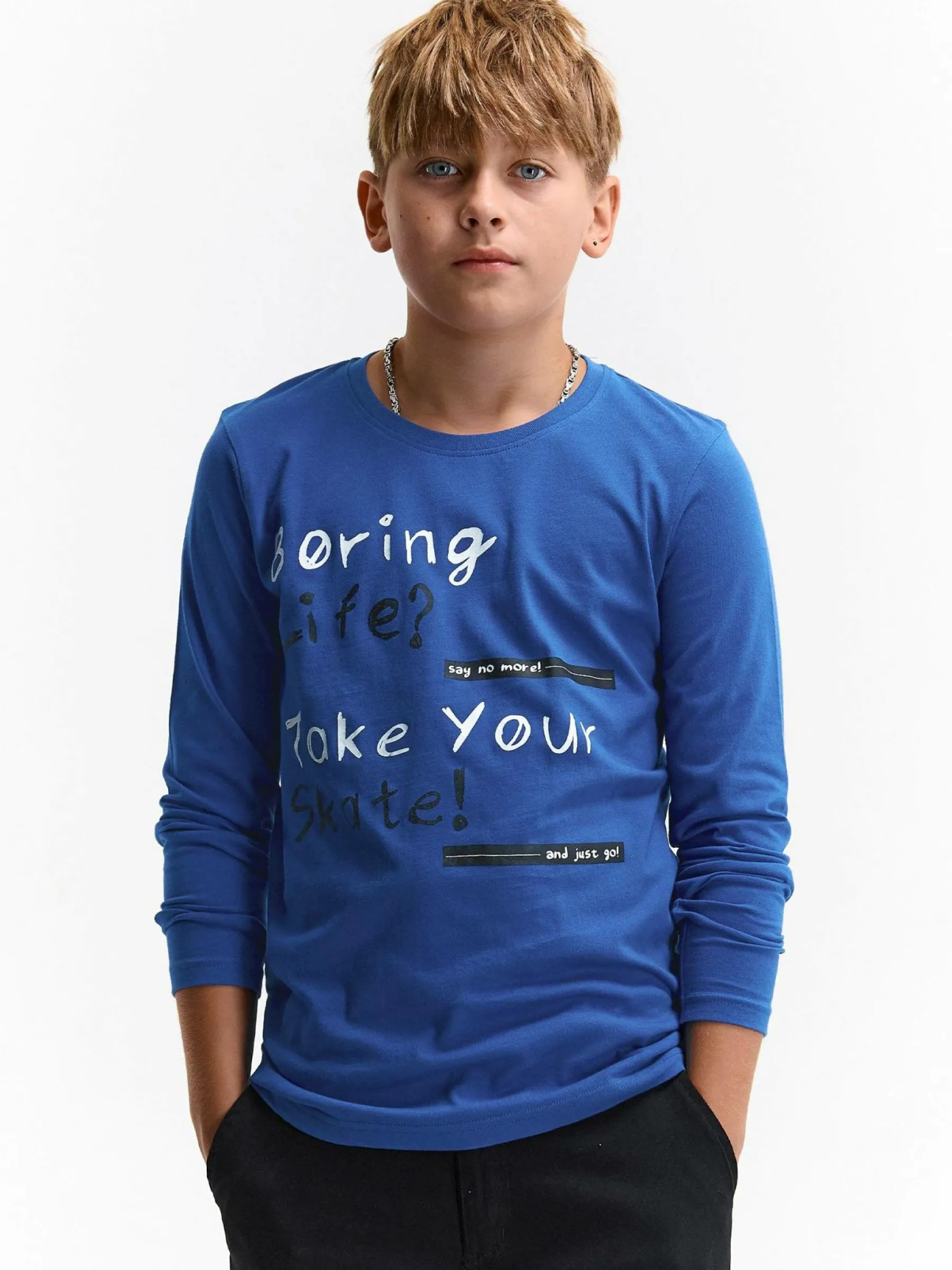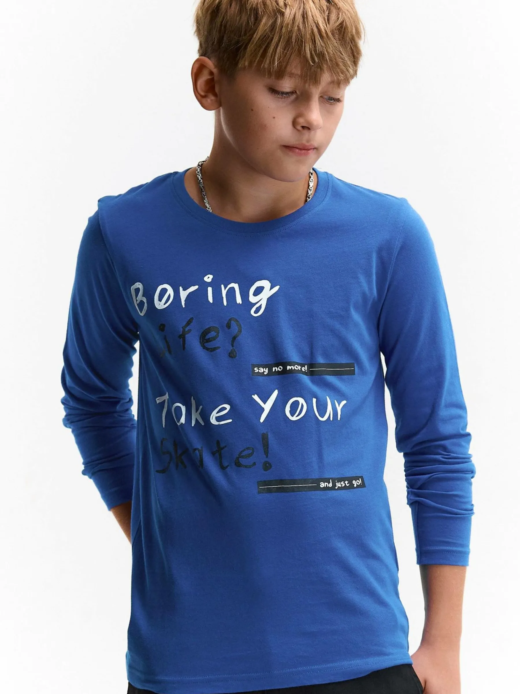 Kolor: niebieskiKrój: podstawowyTyp: koszulkaRekaw: długi rękawDługość: krótkiPattern style: z nadrukiemDetal: na…