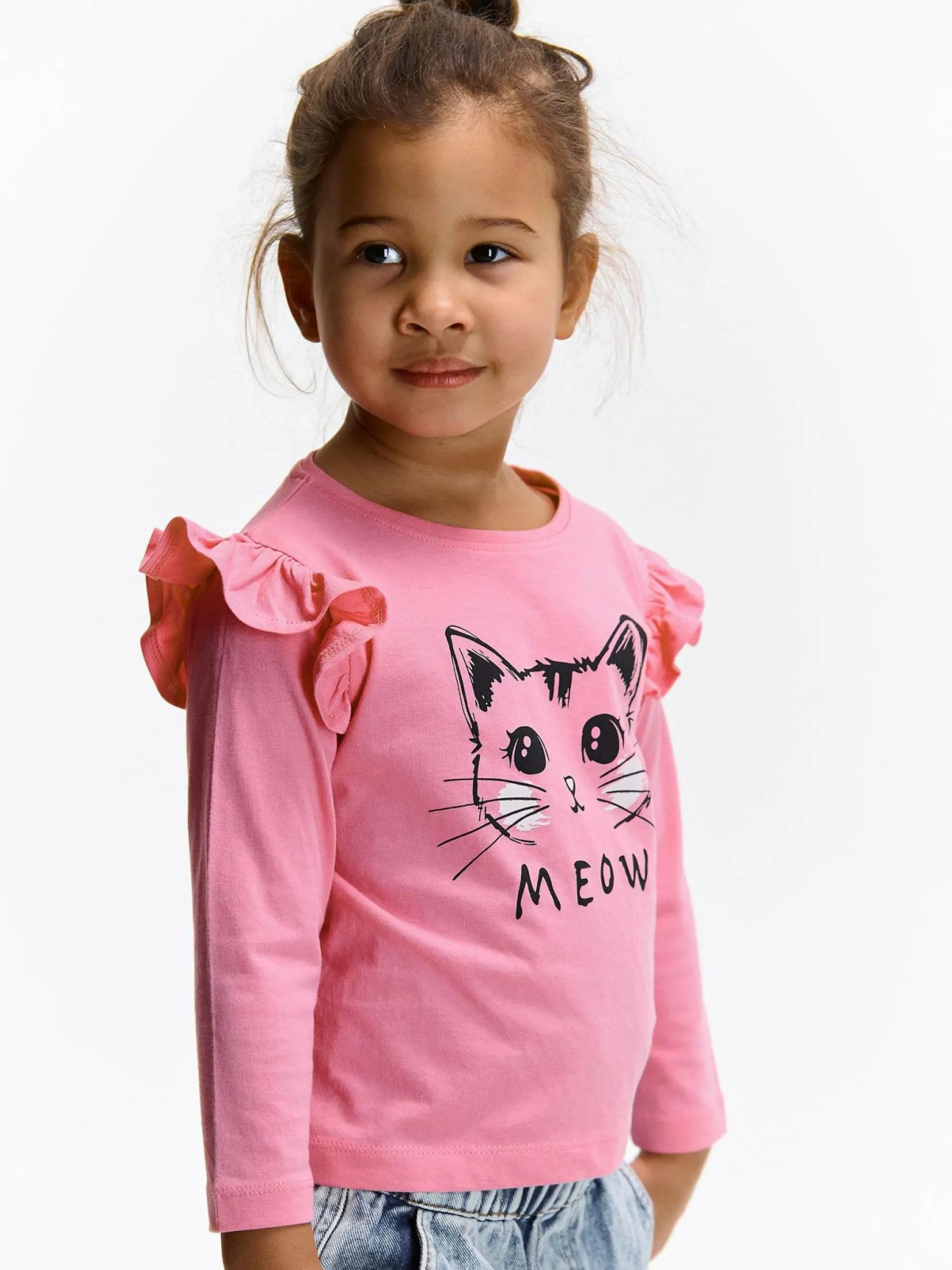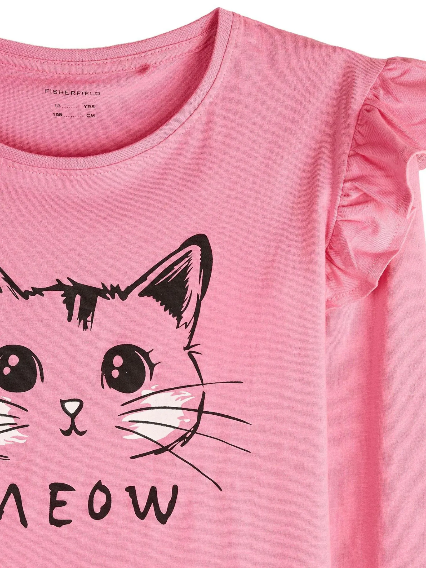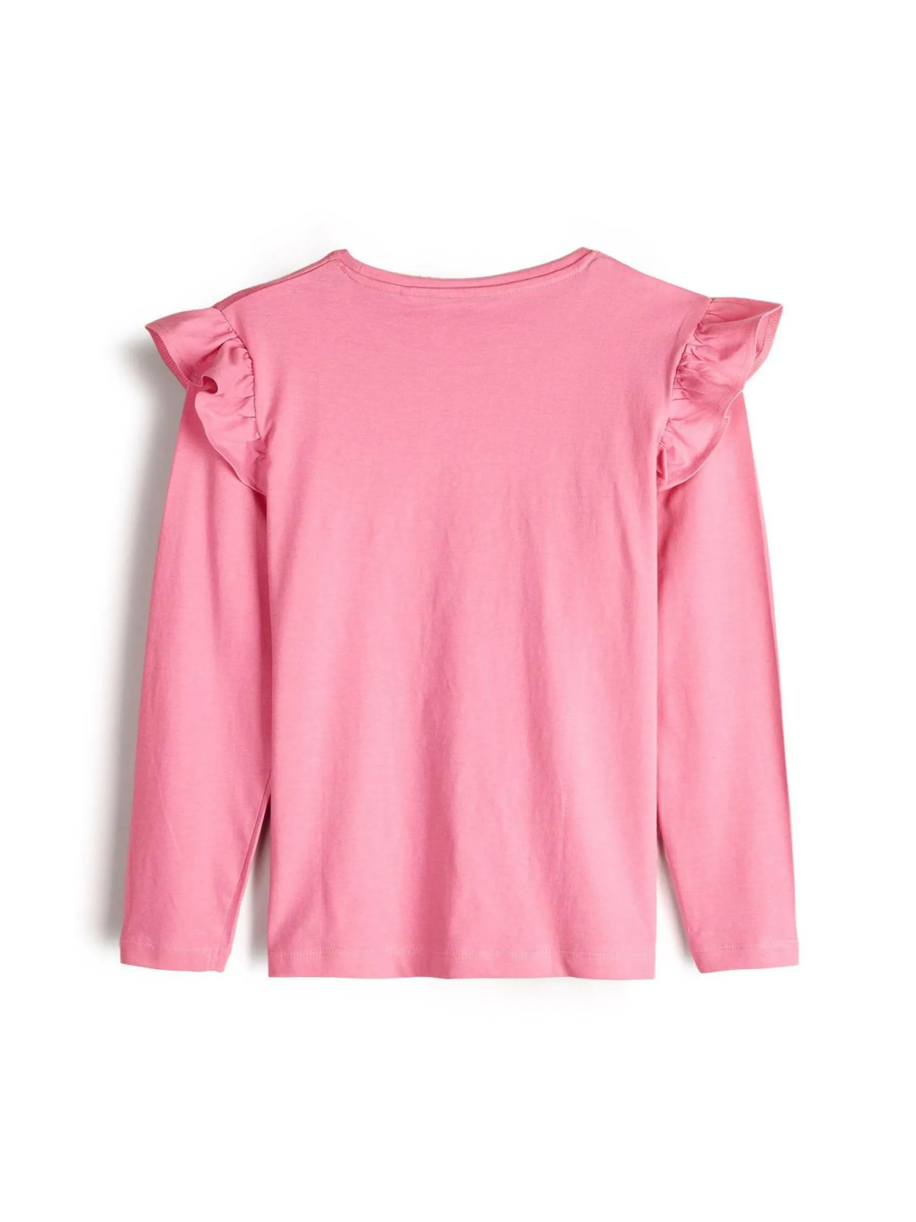 Kolor: różowyKrój: z falbanąTyp: koszulkaRekaw: długi rękawDługość: krótkiPattern style: z nadrukiemDetal: nad…