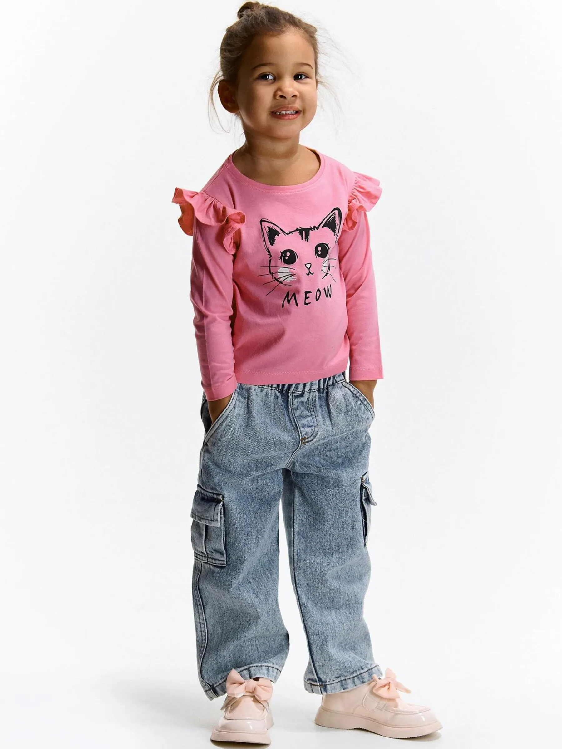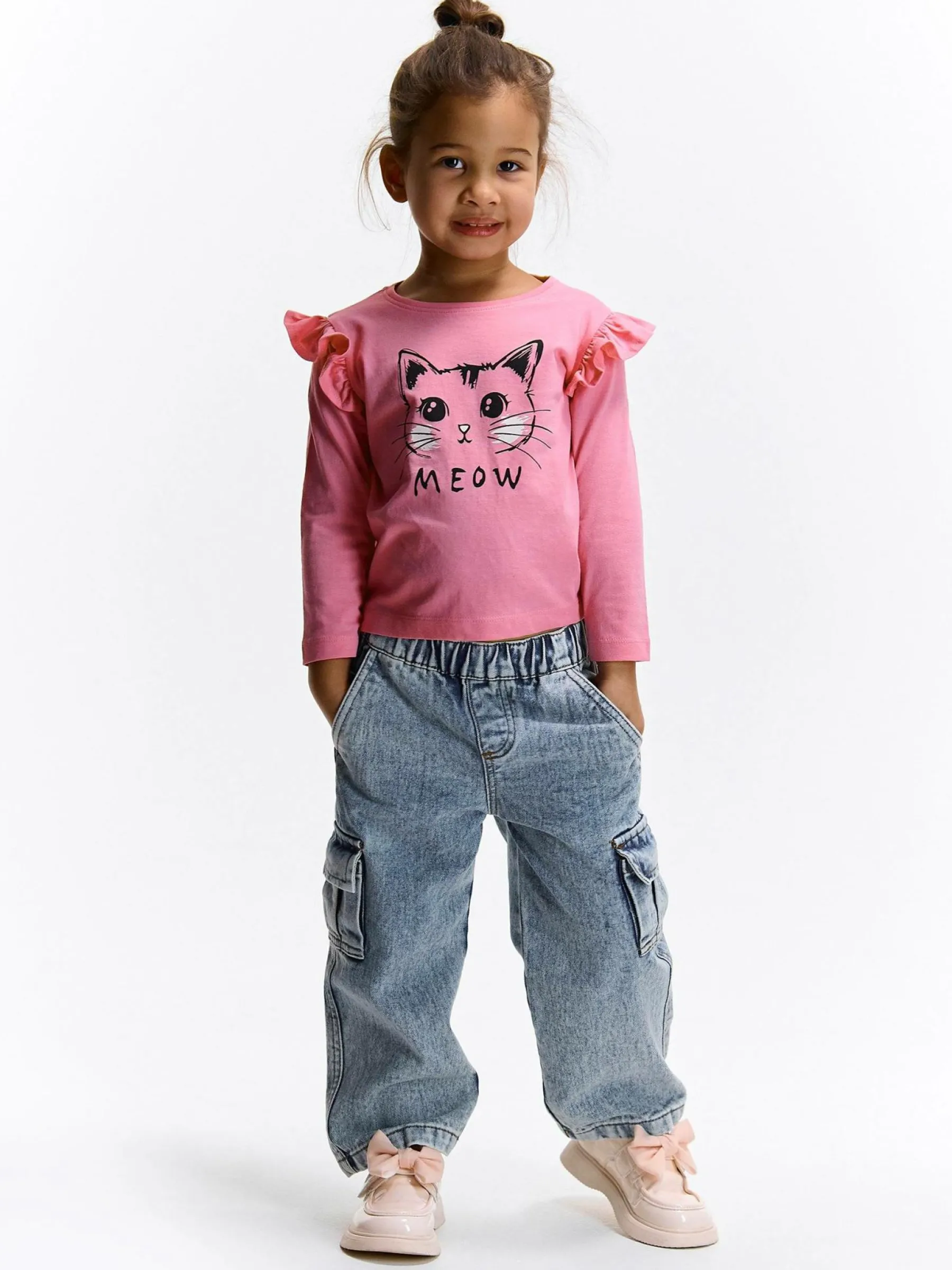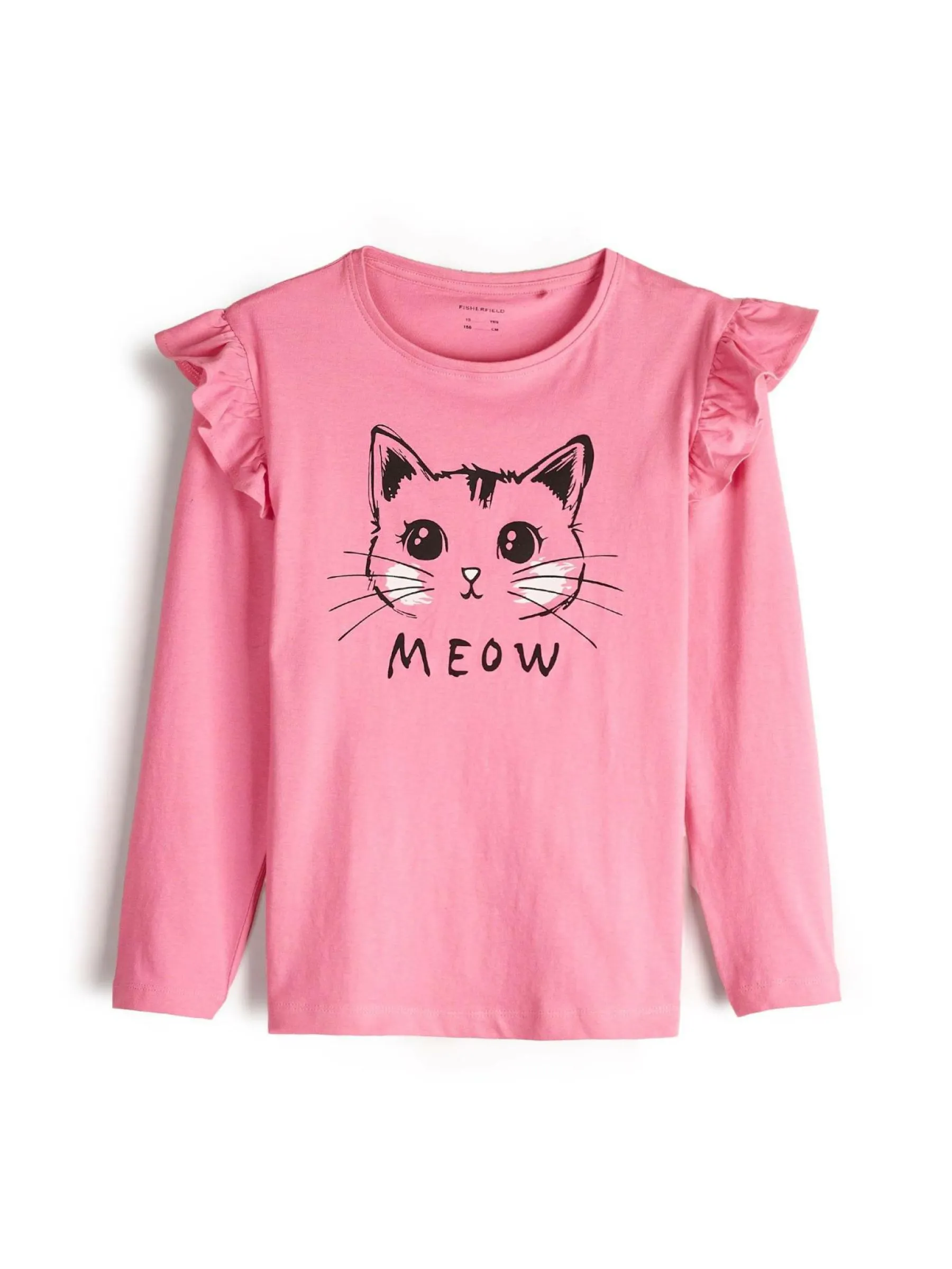 Kolor: różowyKrój: z falbanąTyp: koszulkaRekaw: długi rękawDługość: krótkiPattern style: z nadrukiemDetal: nad…