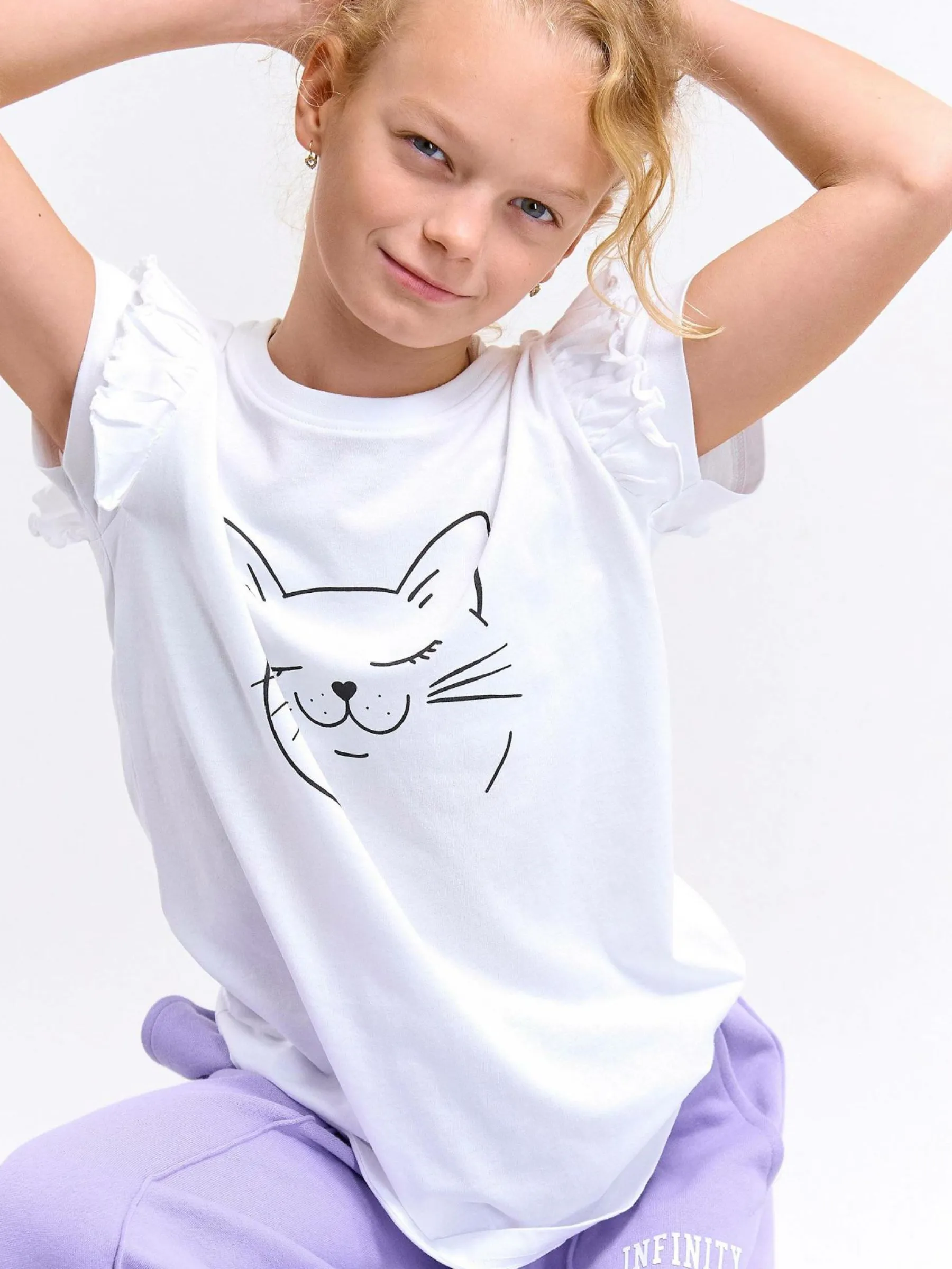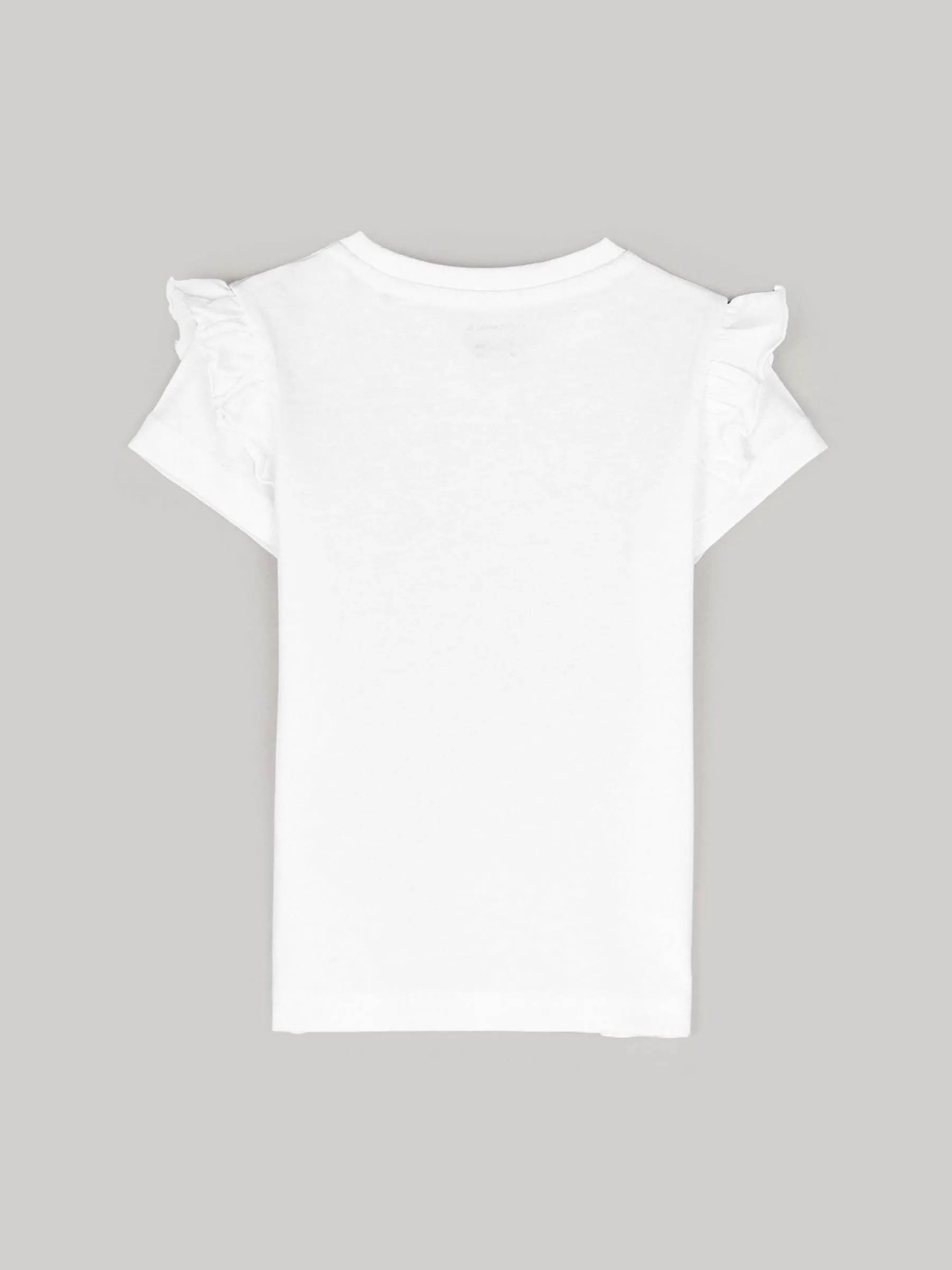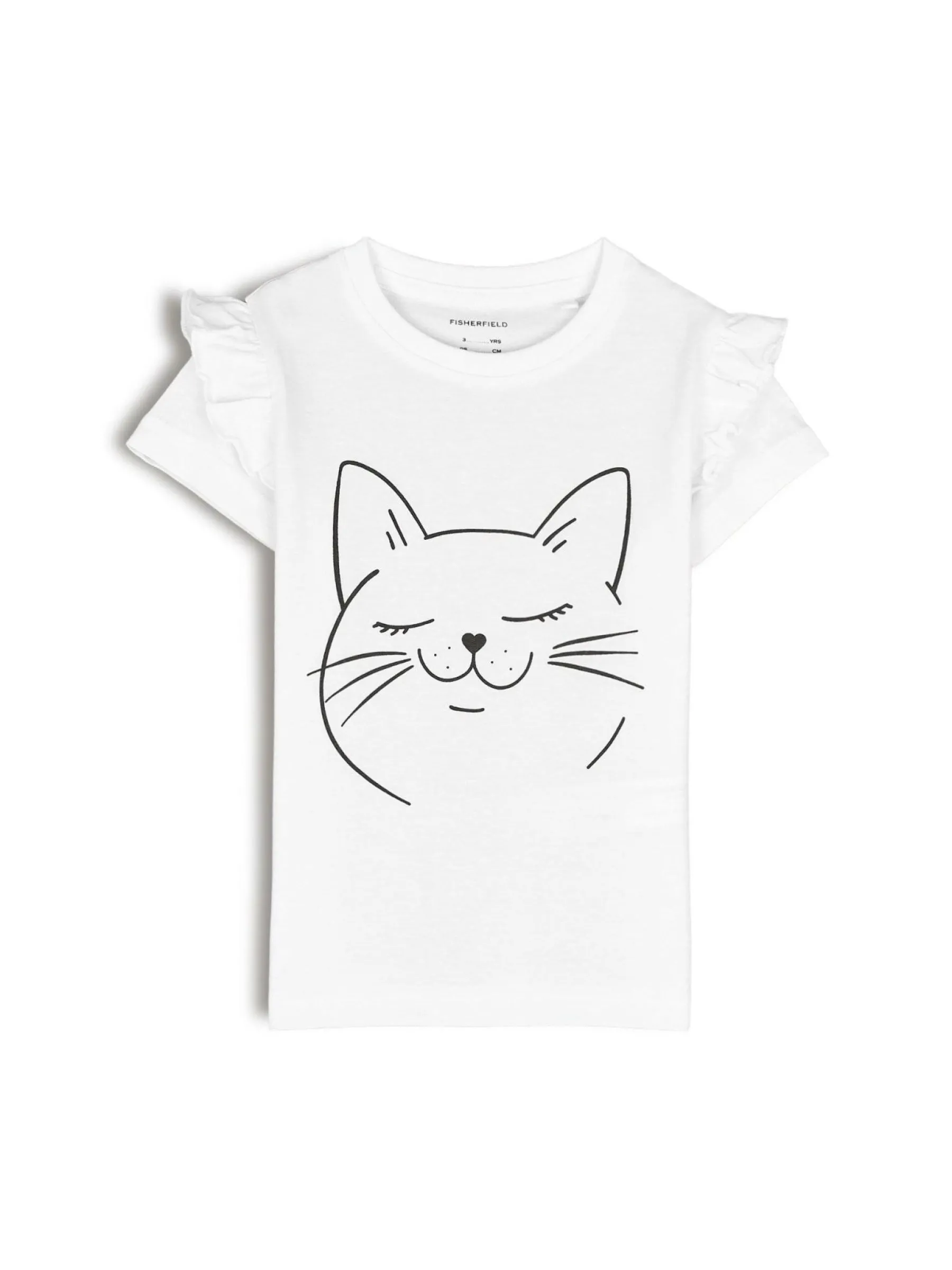 Kolor: białyKrój: z falbanąTyp: koszulkaRekaw: krótki rękawDługość: krótkiPattern style: z nadrukiemDetal: nad …