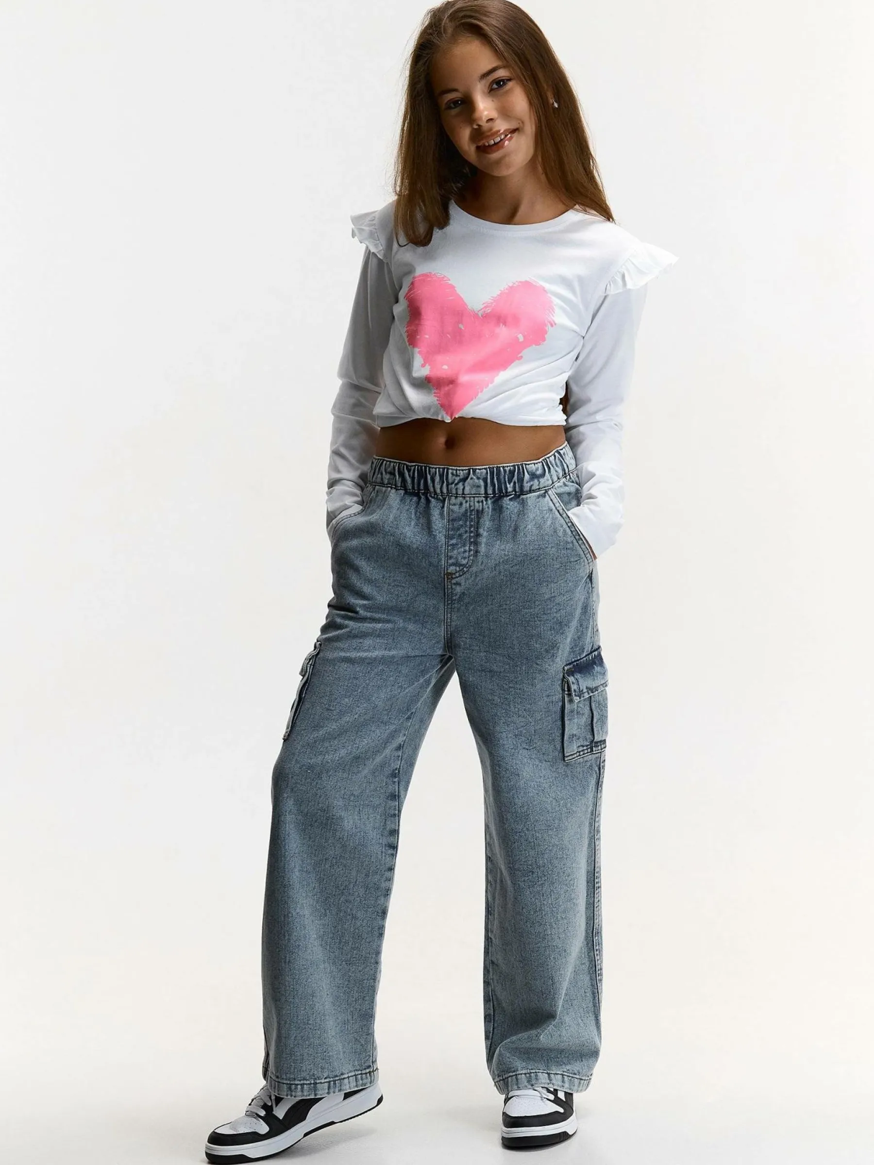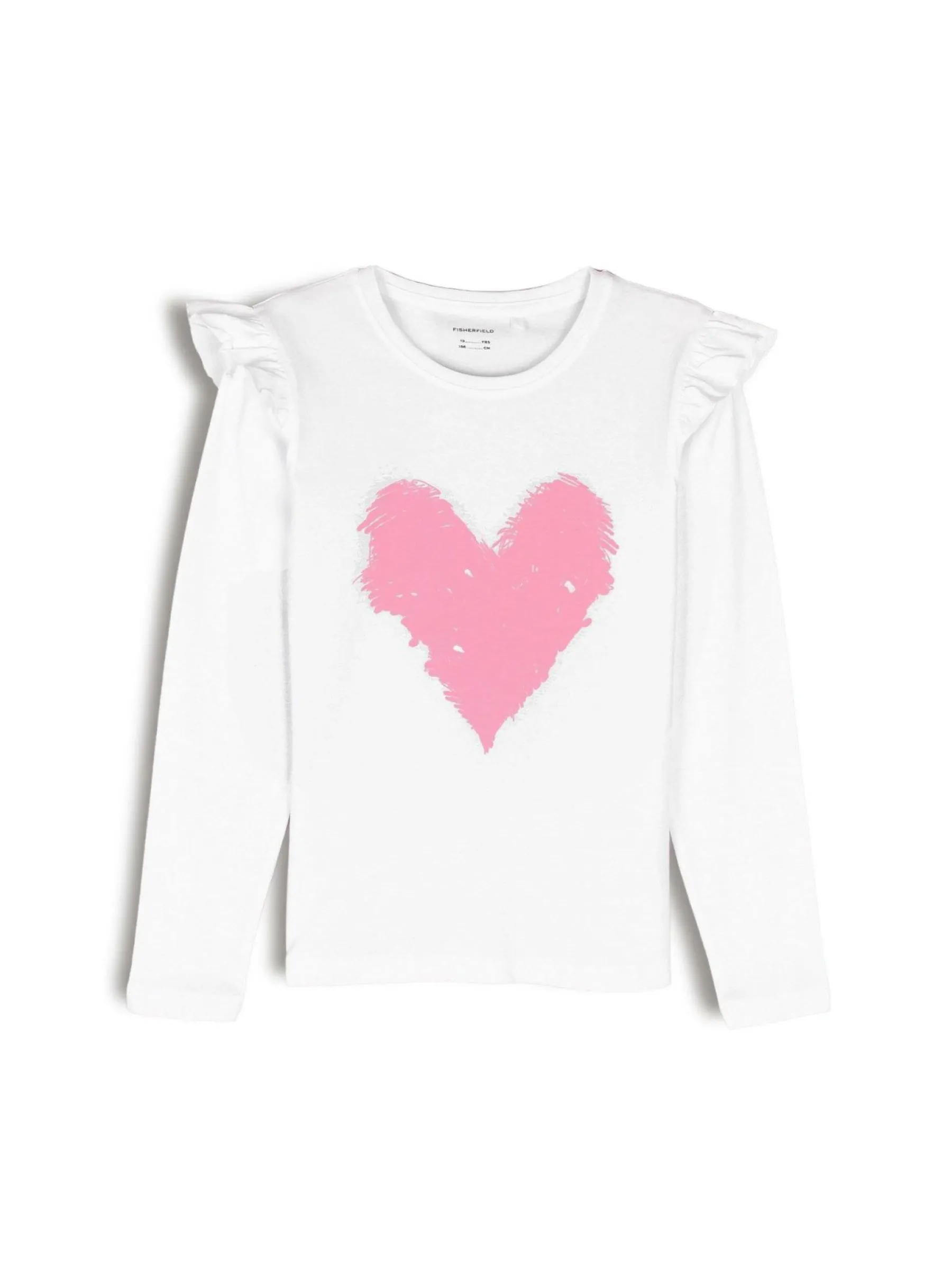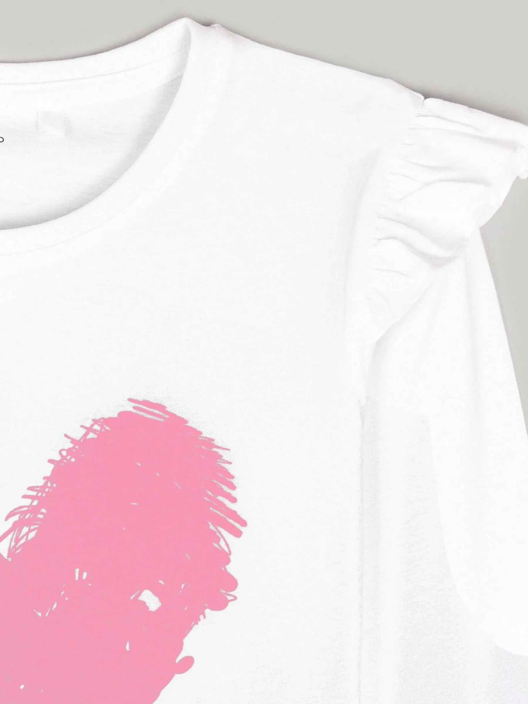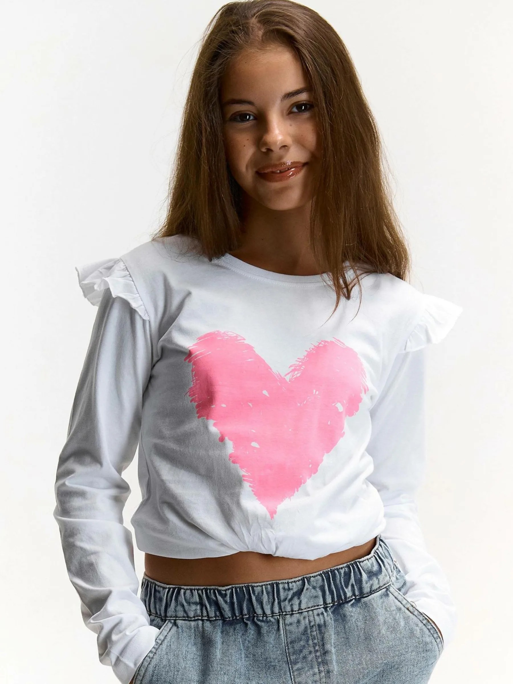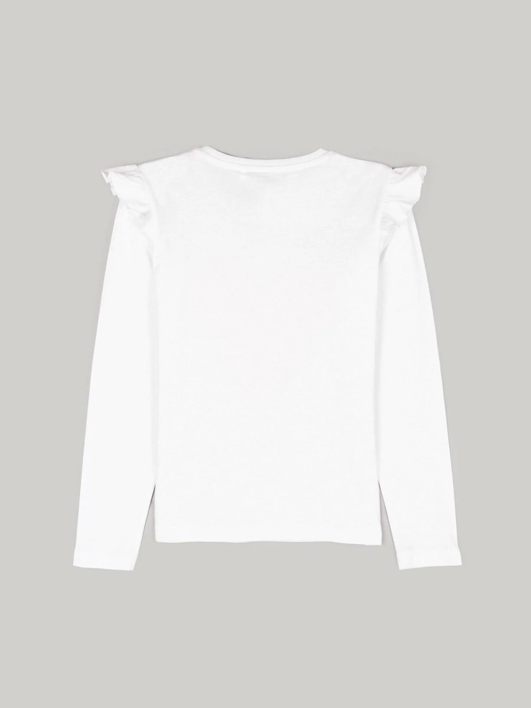 Kolor: białyKrój: z falbanąTyp: koszulkaRekaw: długi rękawDługość: krótkiPattern style: z nadrukiemDetal: nad g…