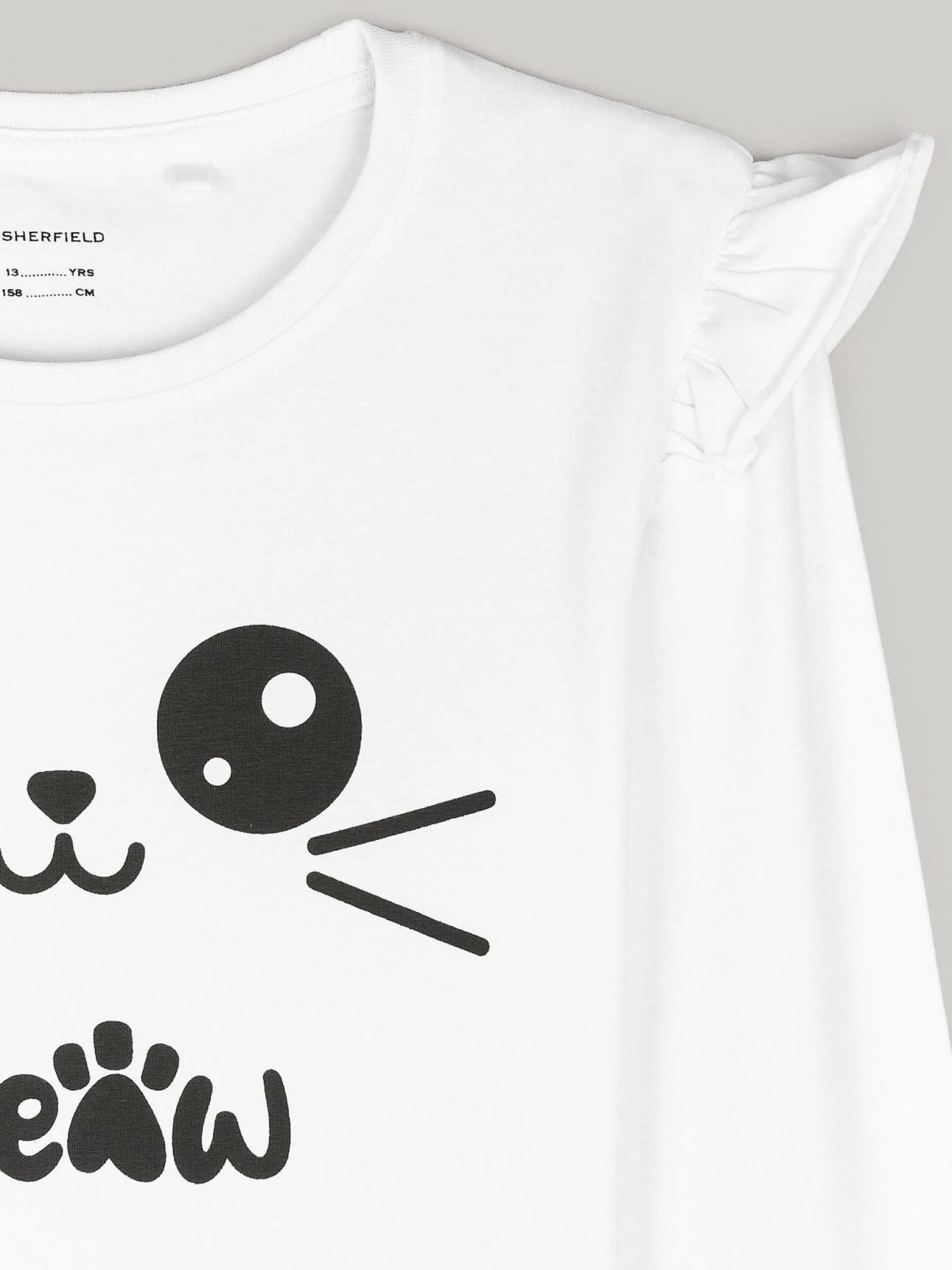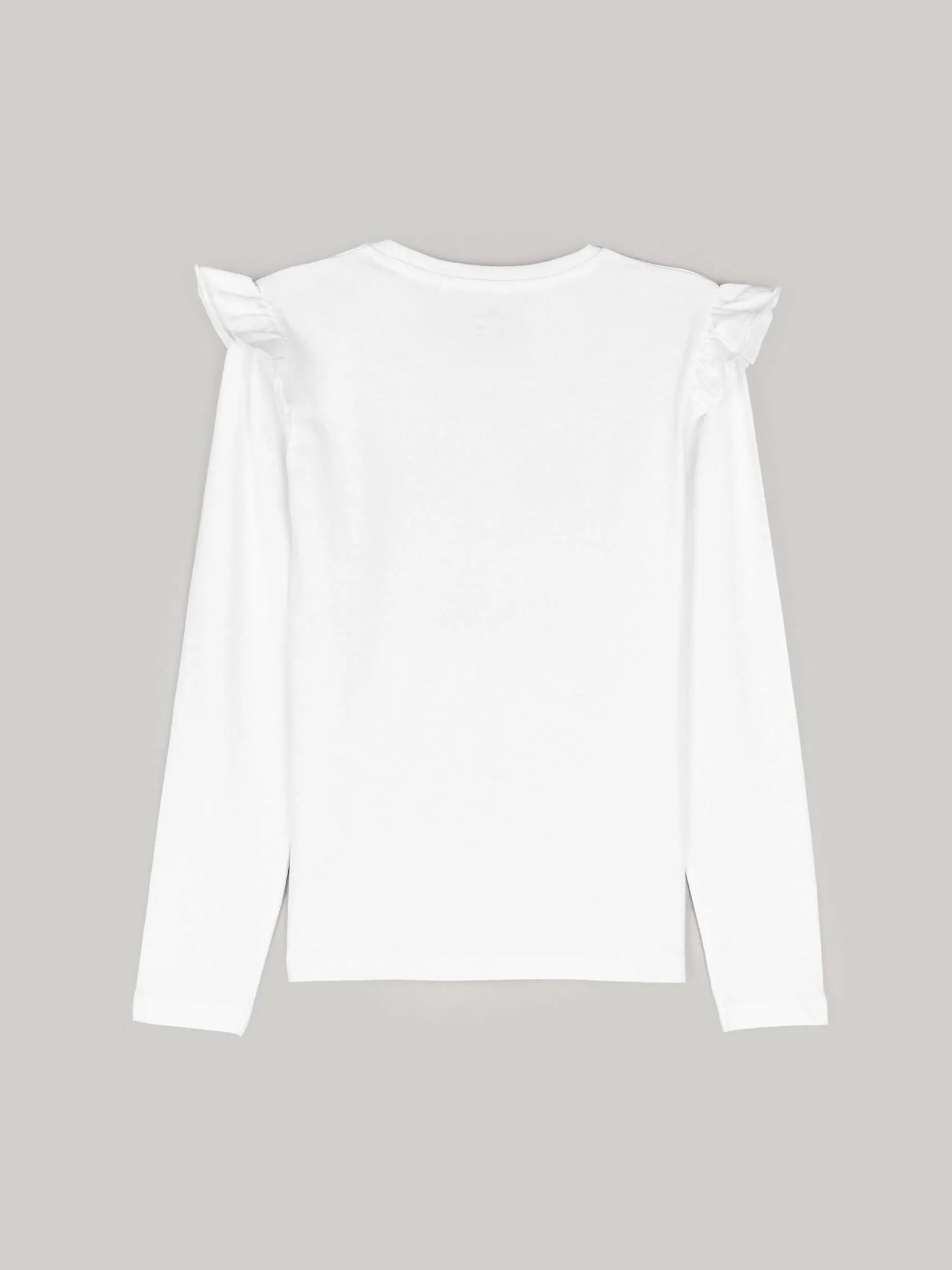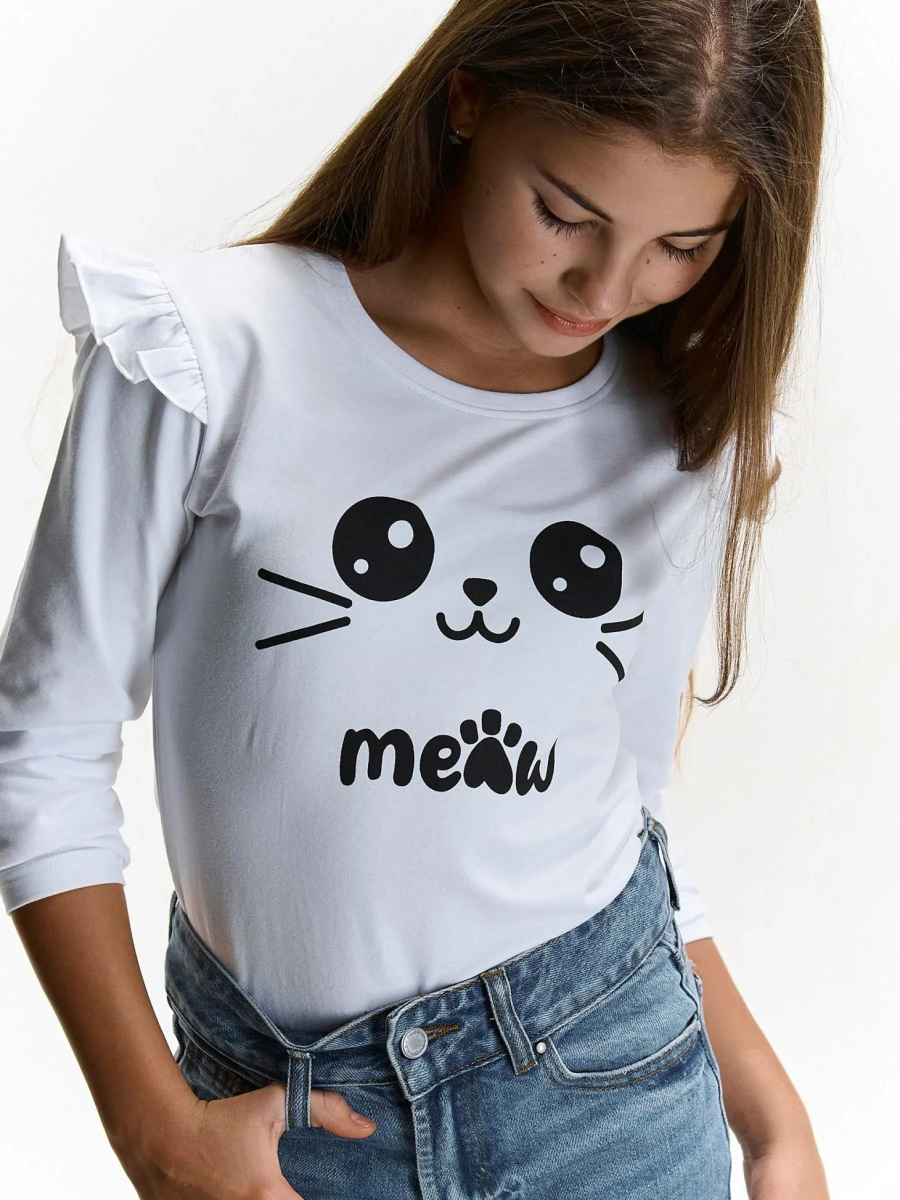 Kolor: białyKrój: z falbanąTyp: koszulkaRekaw: długi rękawDługość: krótkiPattern style: z nadrukiemDetal: nad g…