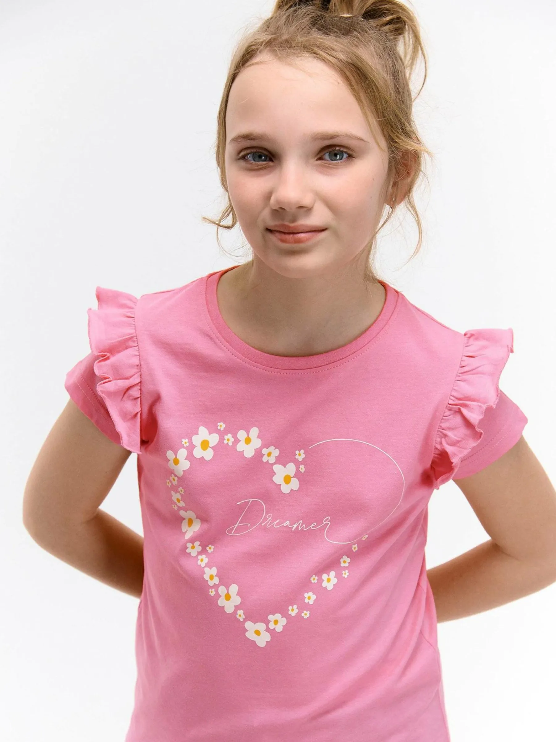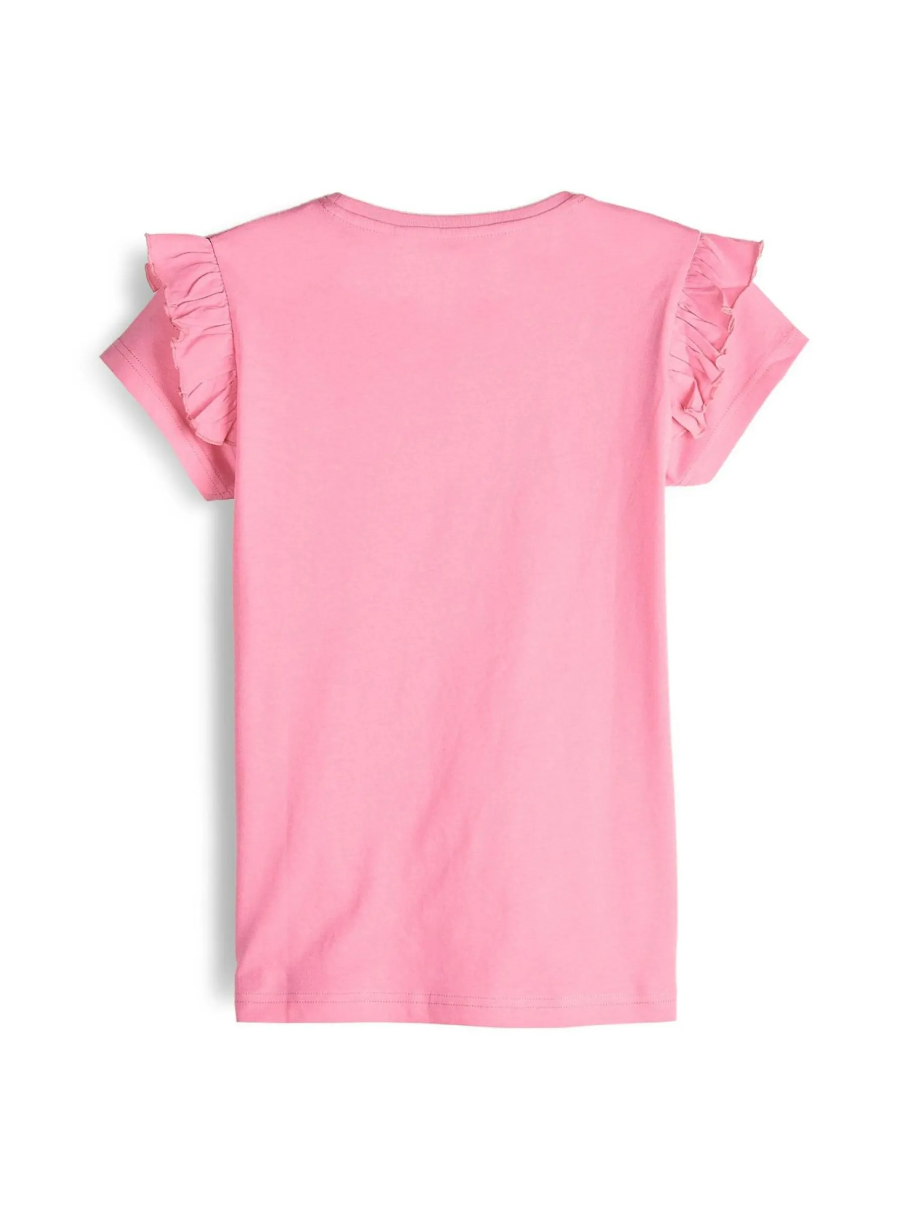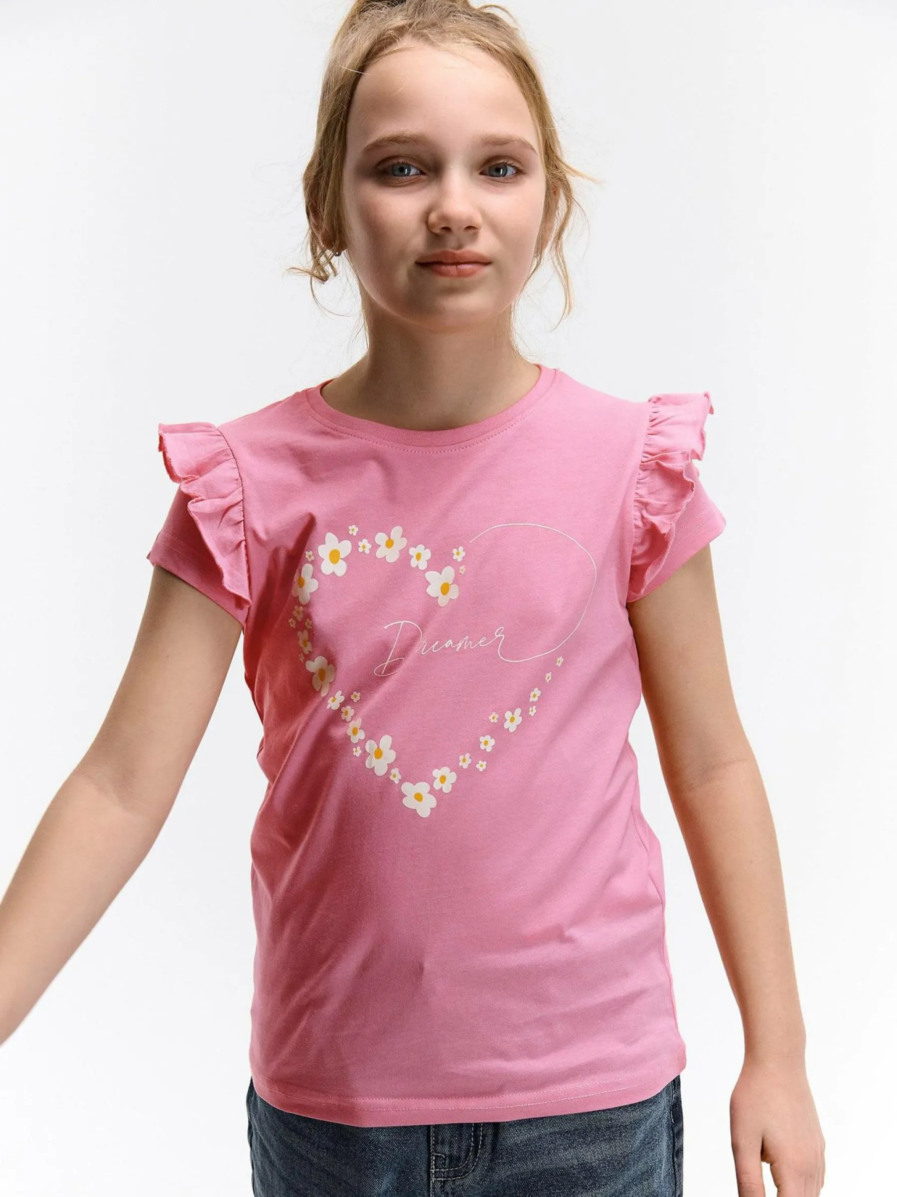 Kolor: różowyKrój: z falbanąTyp: koszulkaRekaw: krótki rękawDługość: krótkiPattern style: z nadrukiemDetal: z …