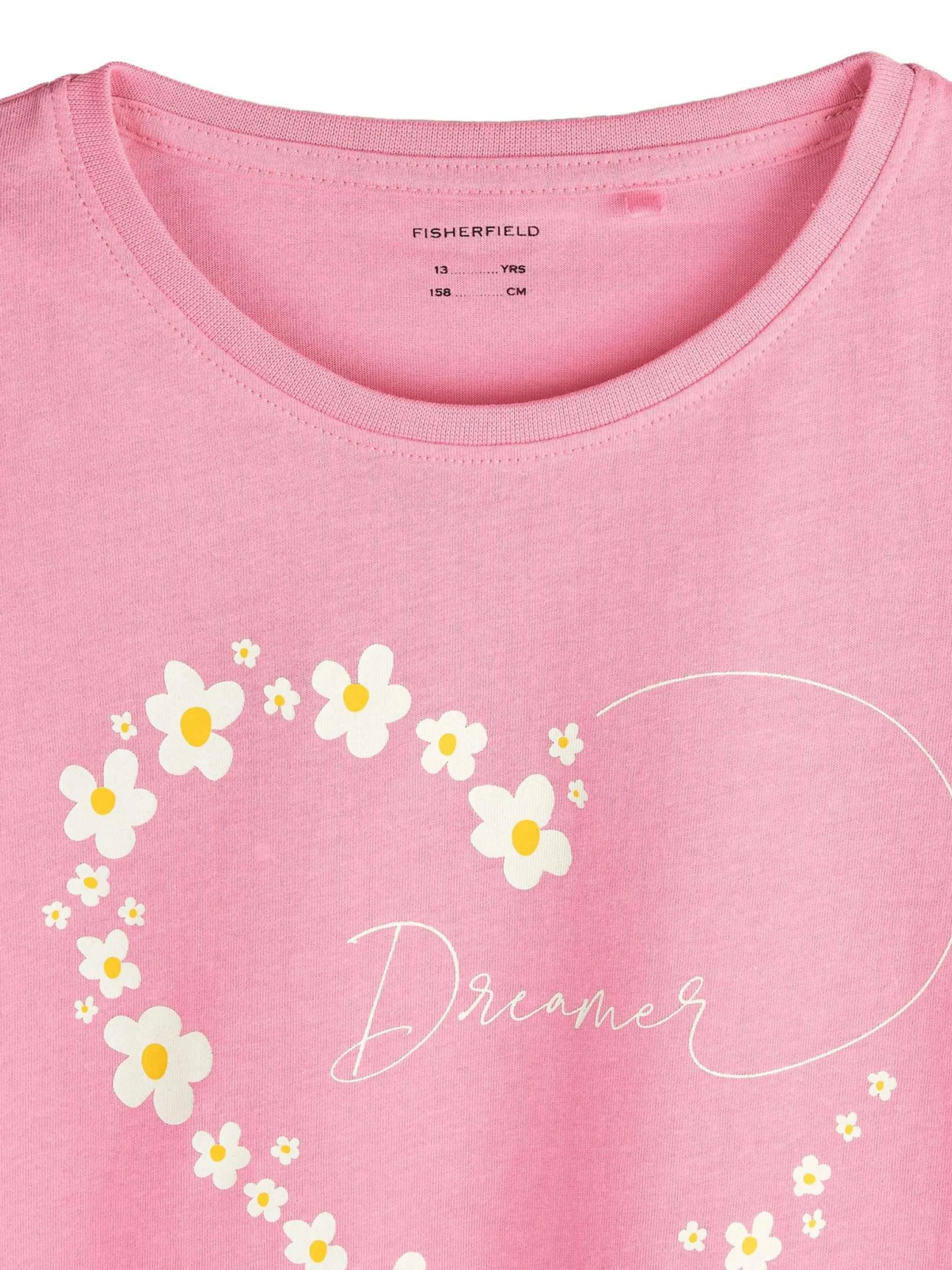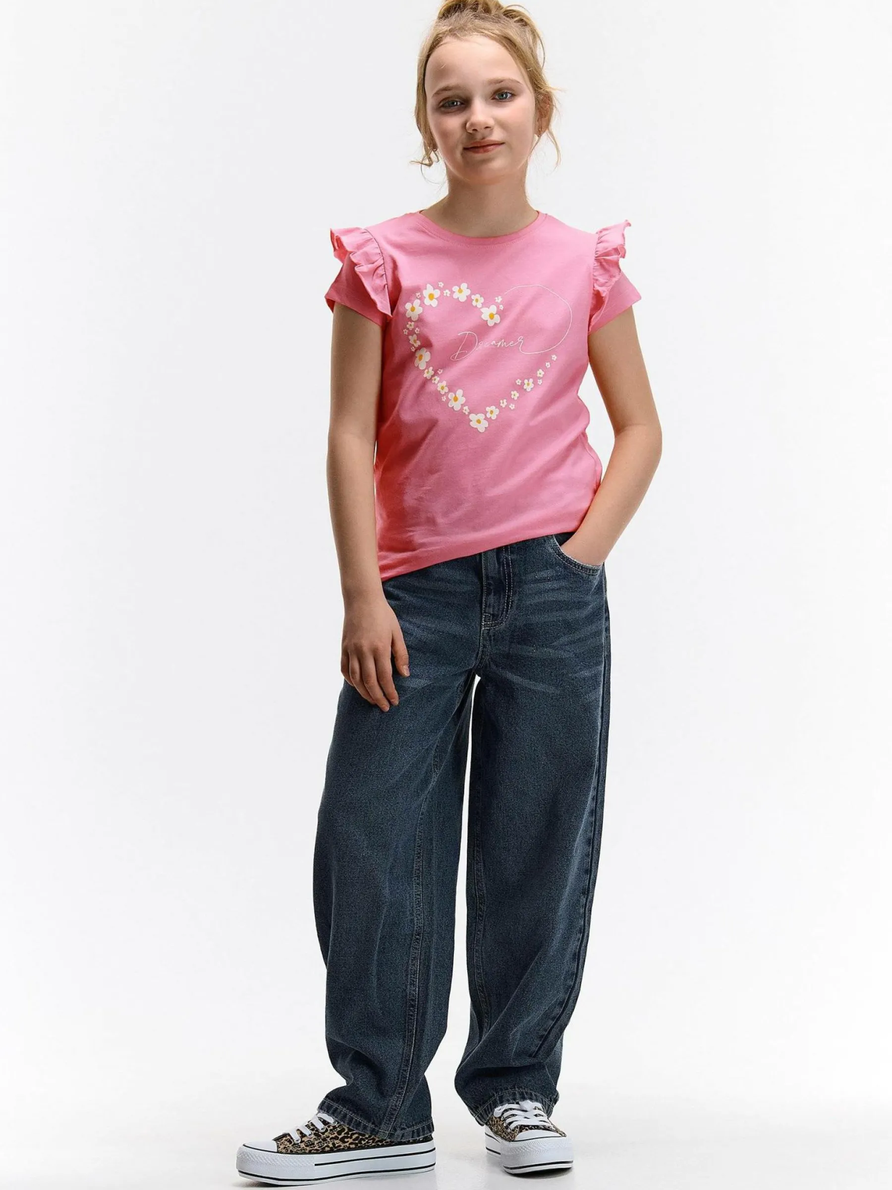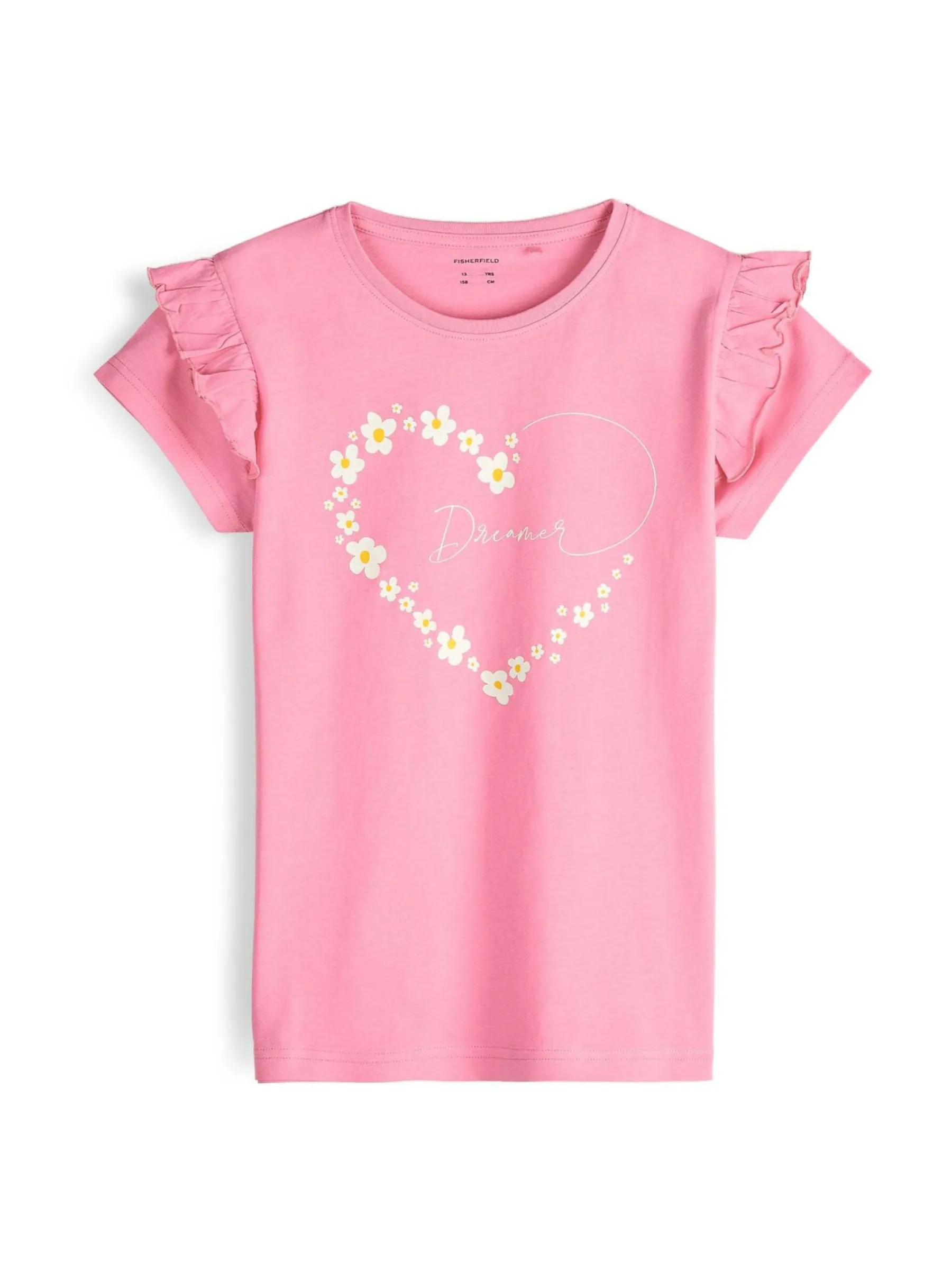 Kolor: różowyKrój: z falbanąTyp: koszulkaRekaw: krótki rękawDługość: krótkiPattern style: z nadrukiemDetal: z …