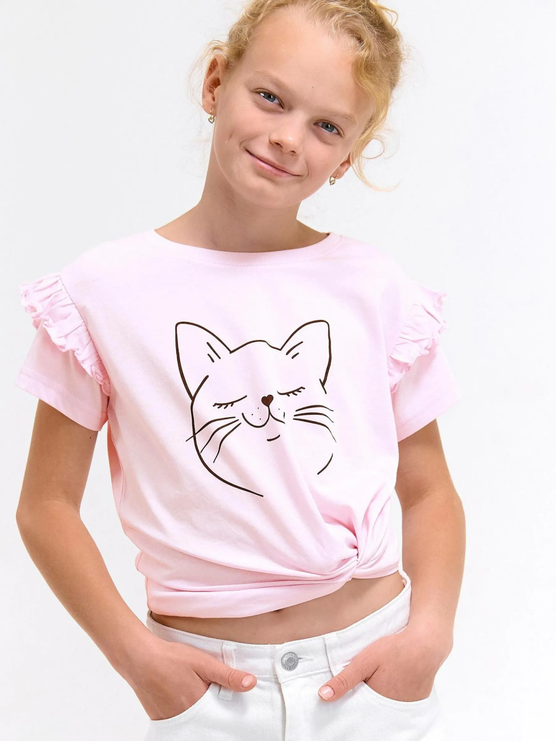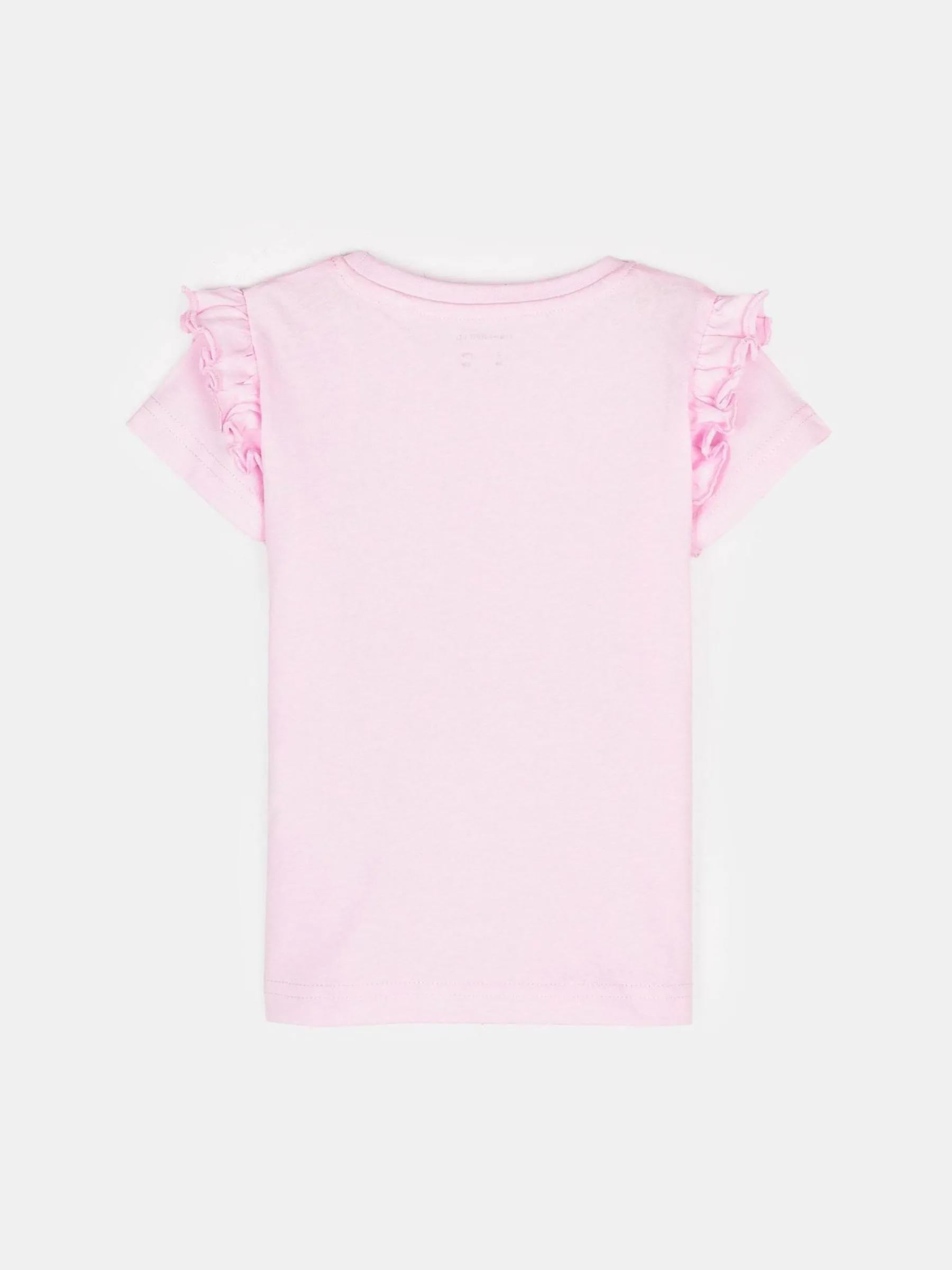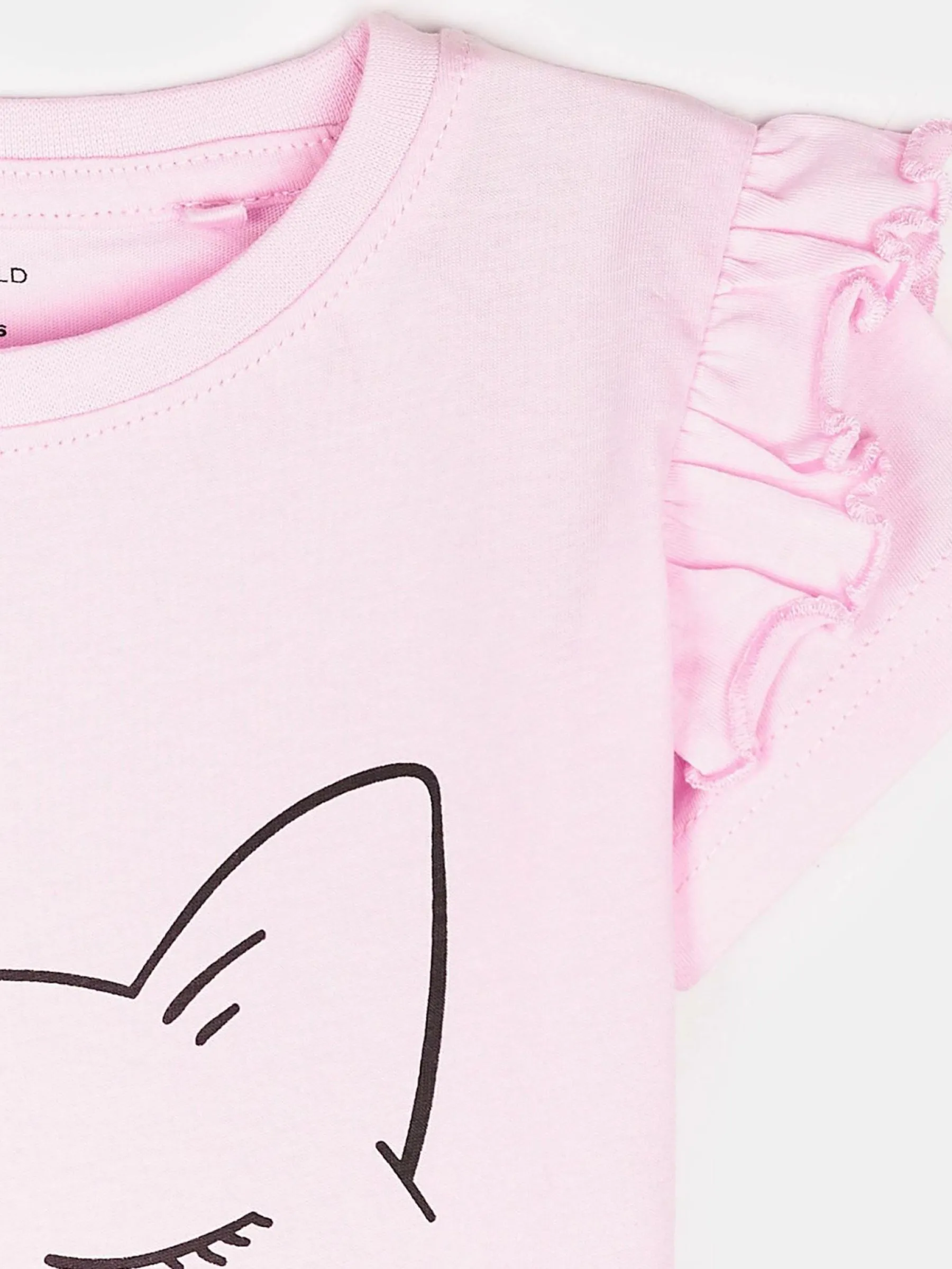 Kolor: różowyKrój: z falbanąTyp: koszulkaRekaw: krótki rękawDługość: krótkiPattern style: z nadrukiemDetal: na…