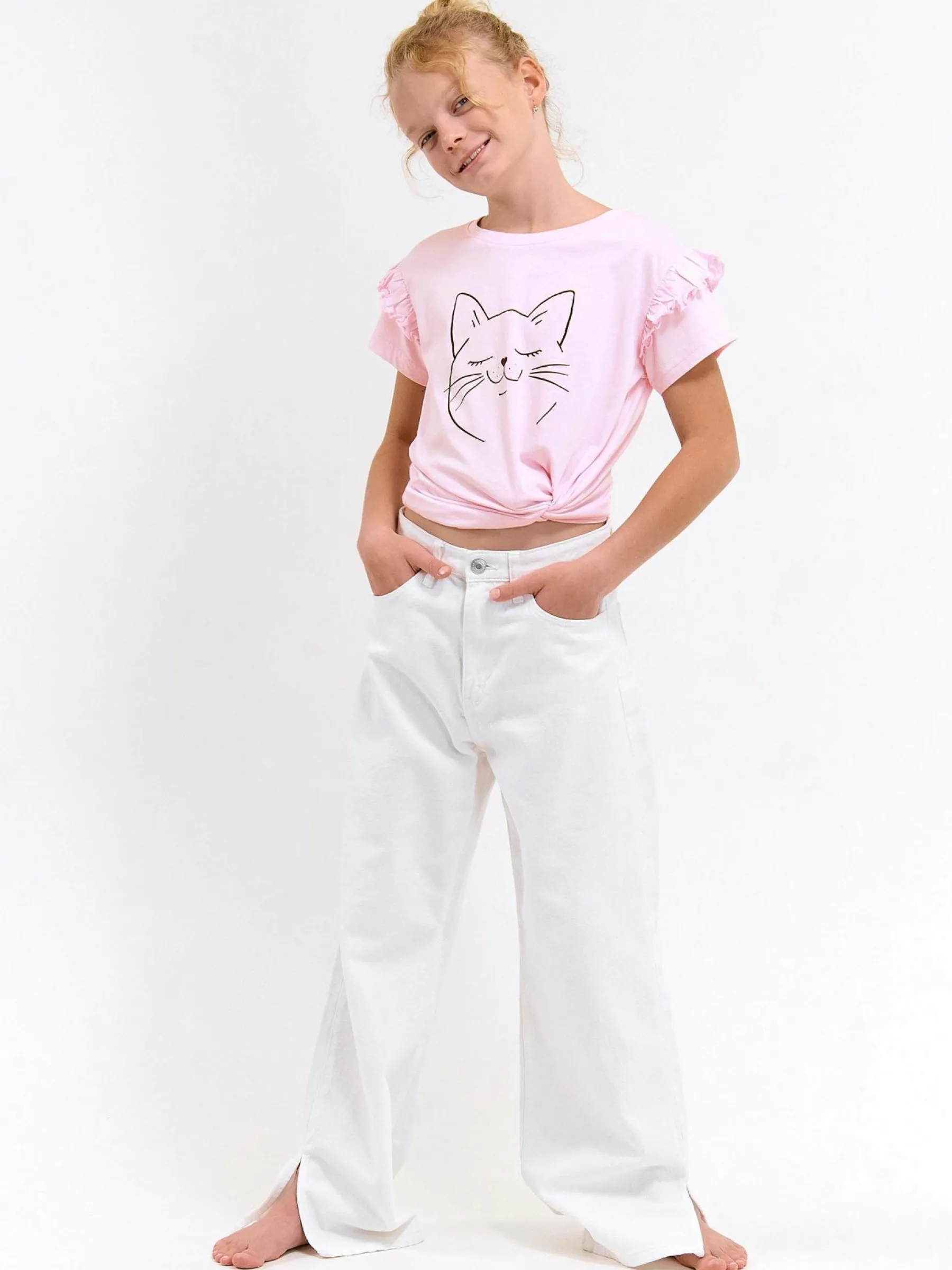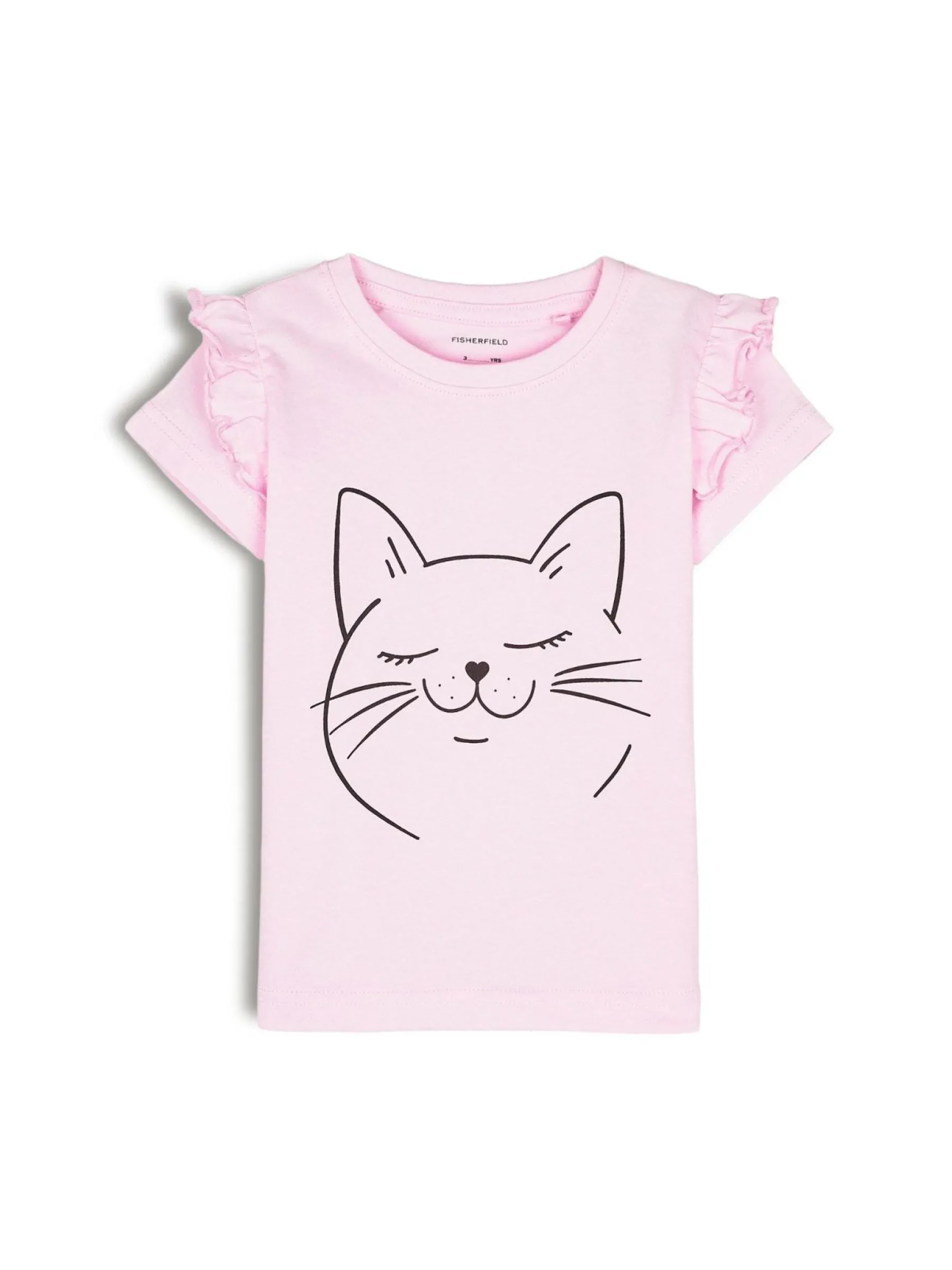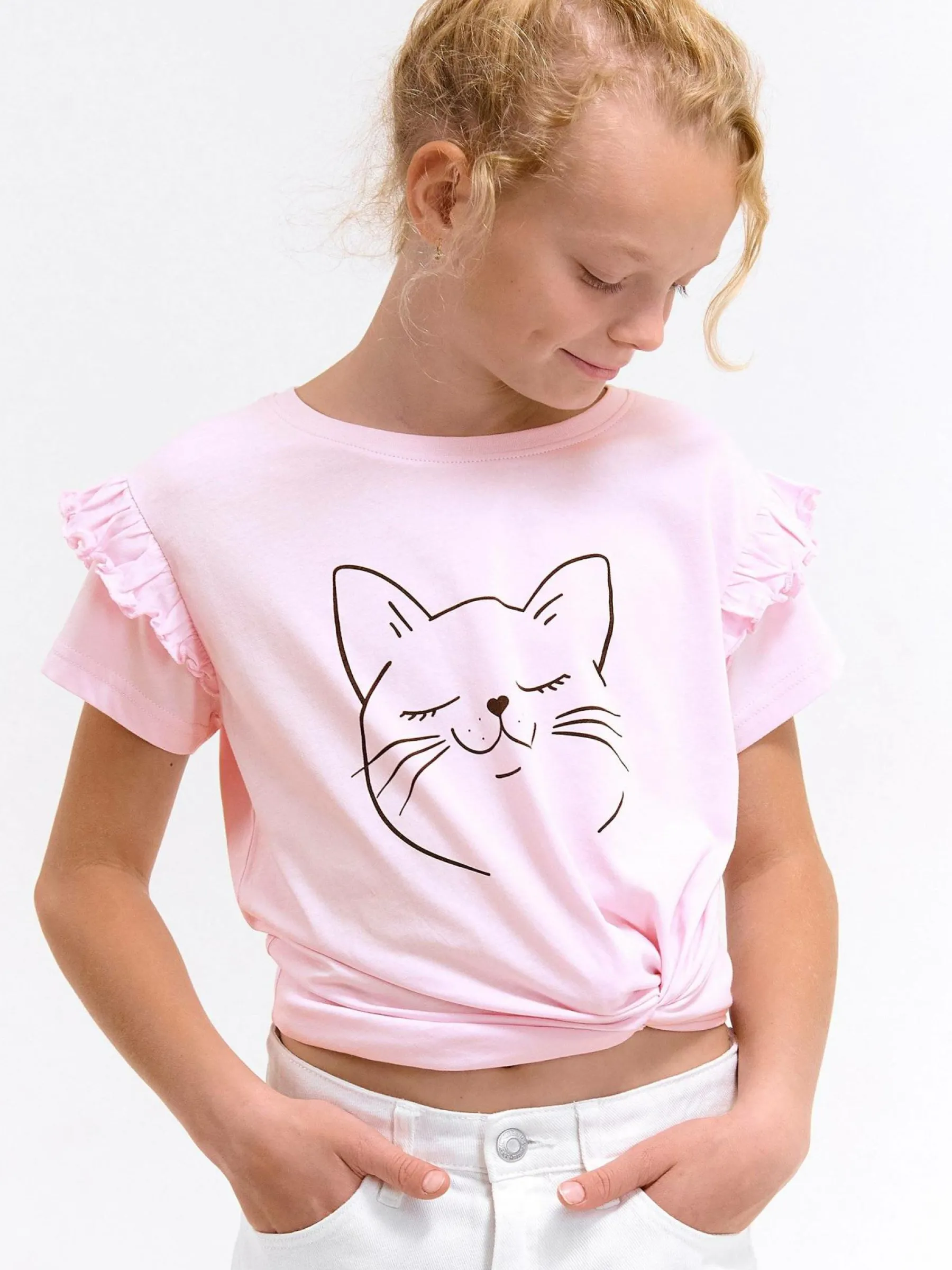 Kolor: różowyKrój: z falbanąTyp: koszulkaRekaw: krótki rękawDługość: krótkiPattern style: z nadrukiemDetal: na…