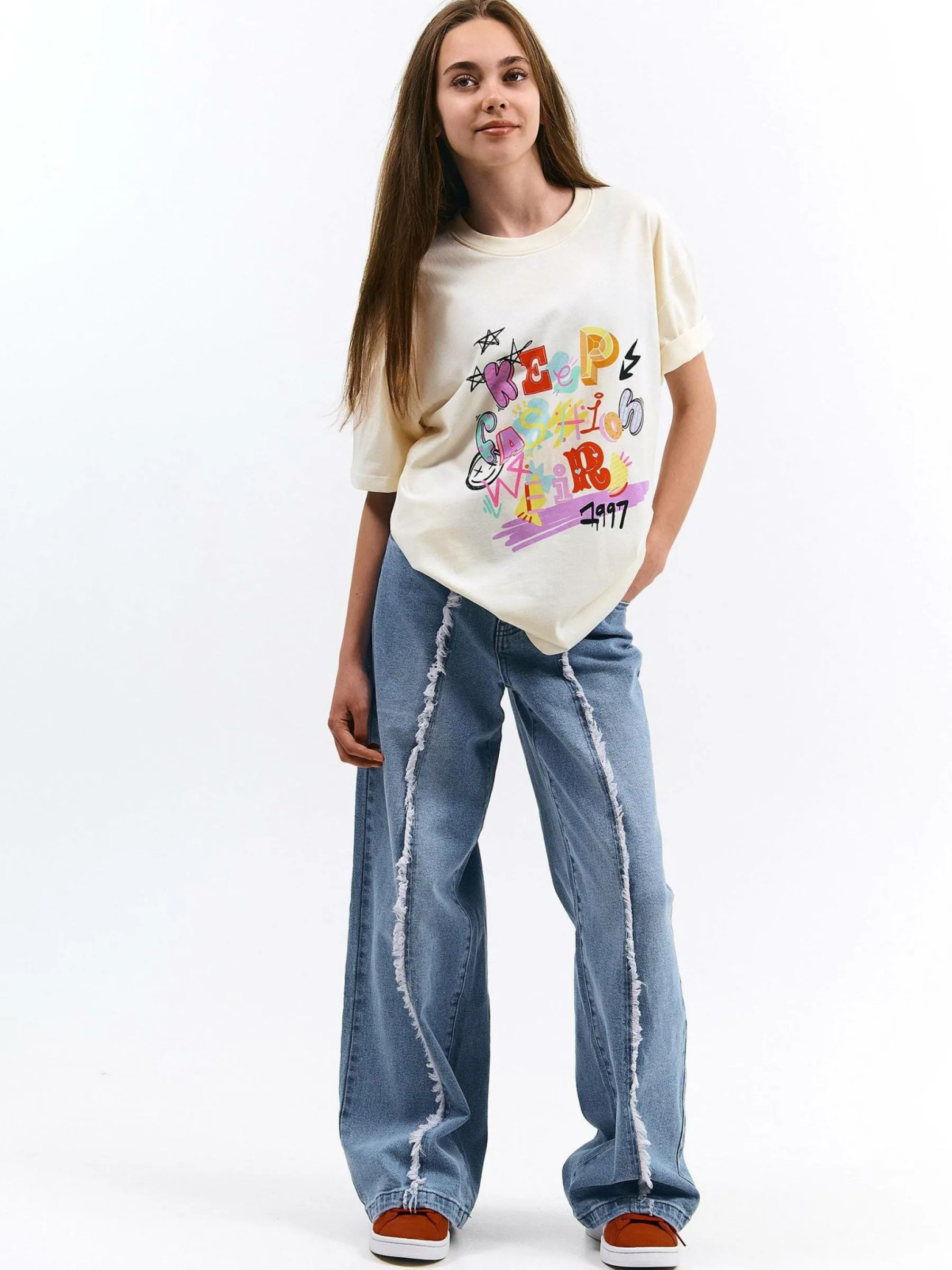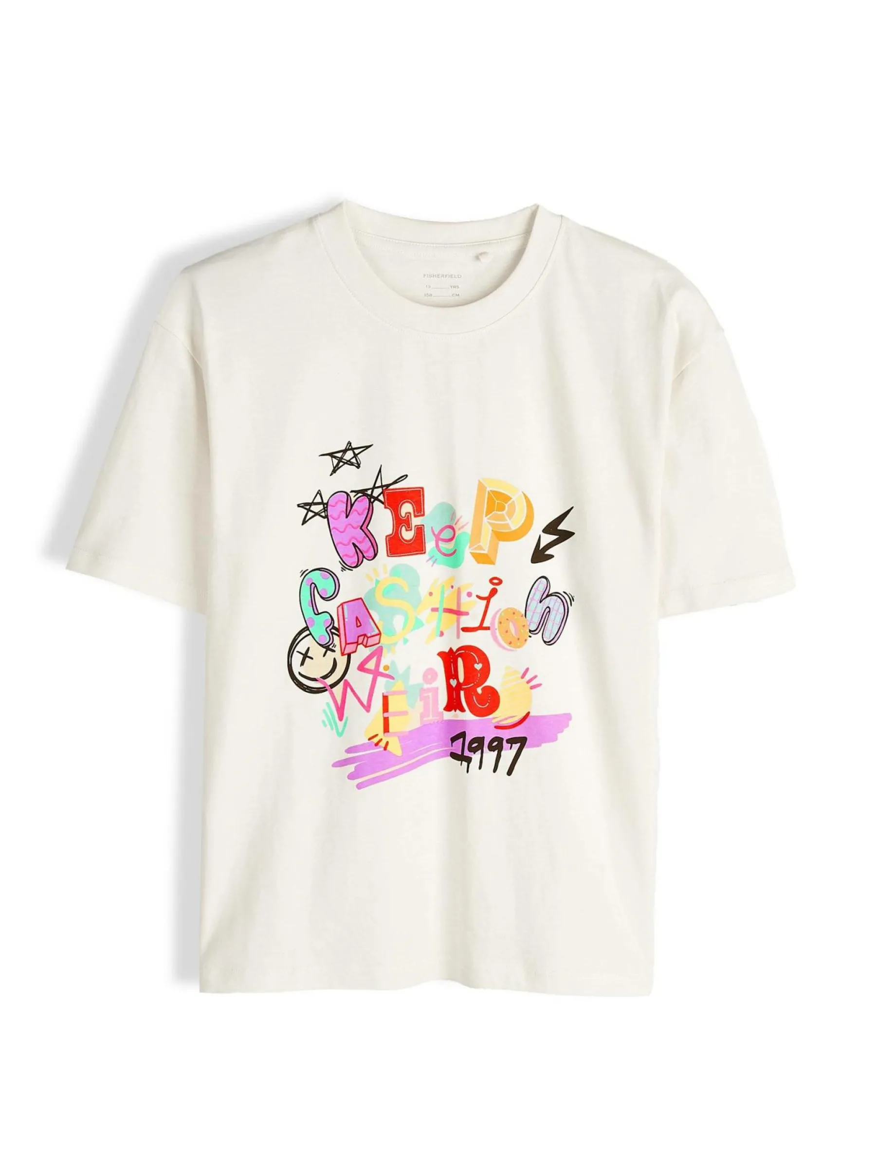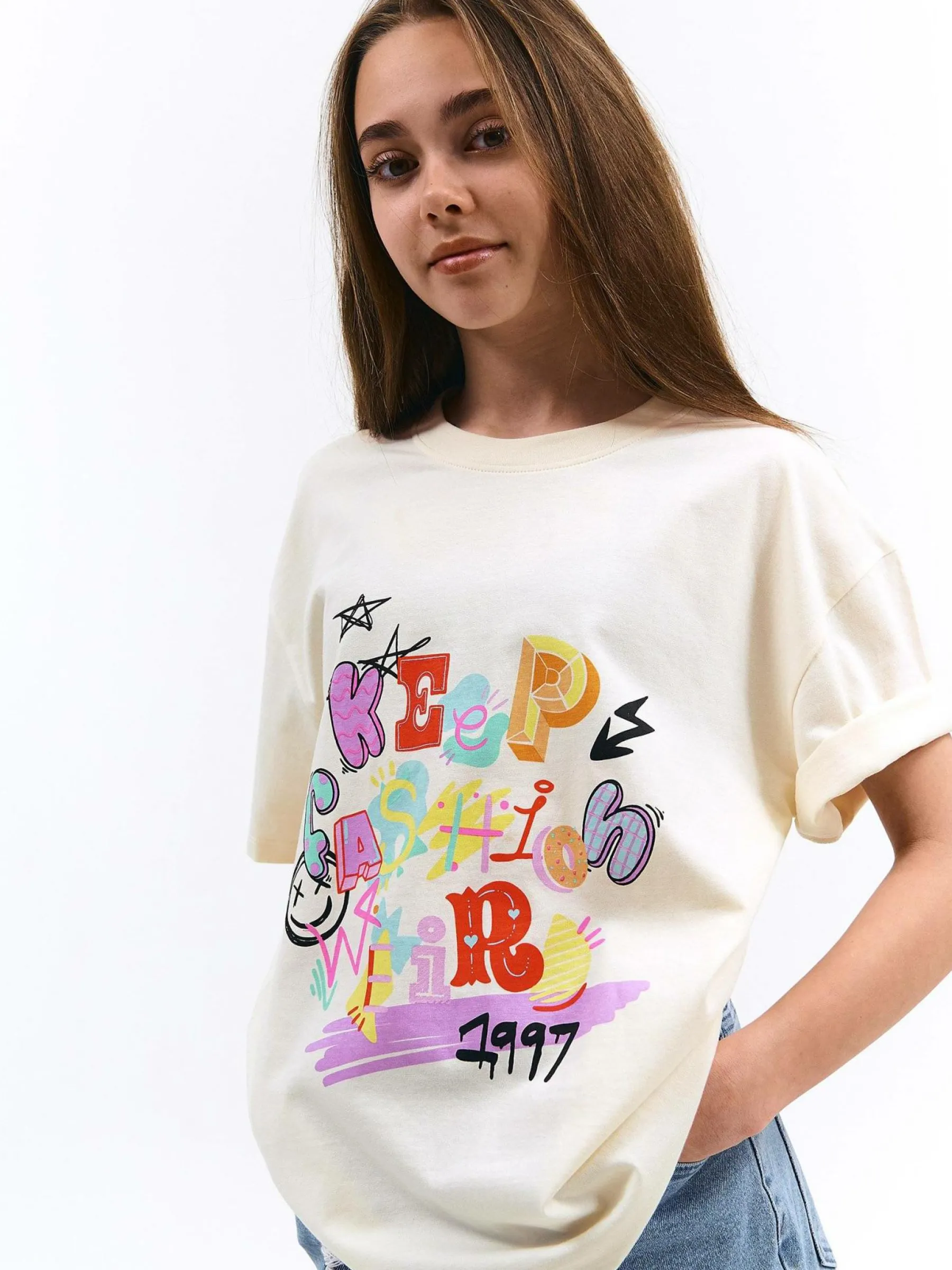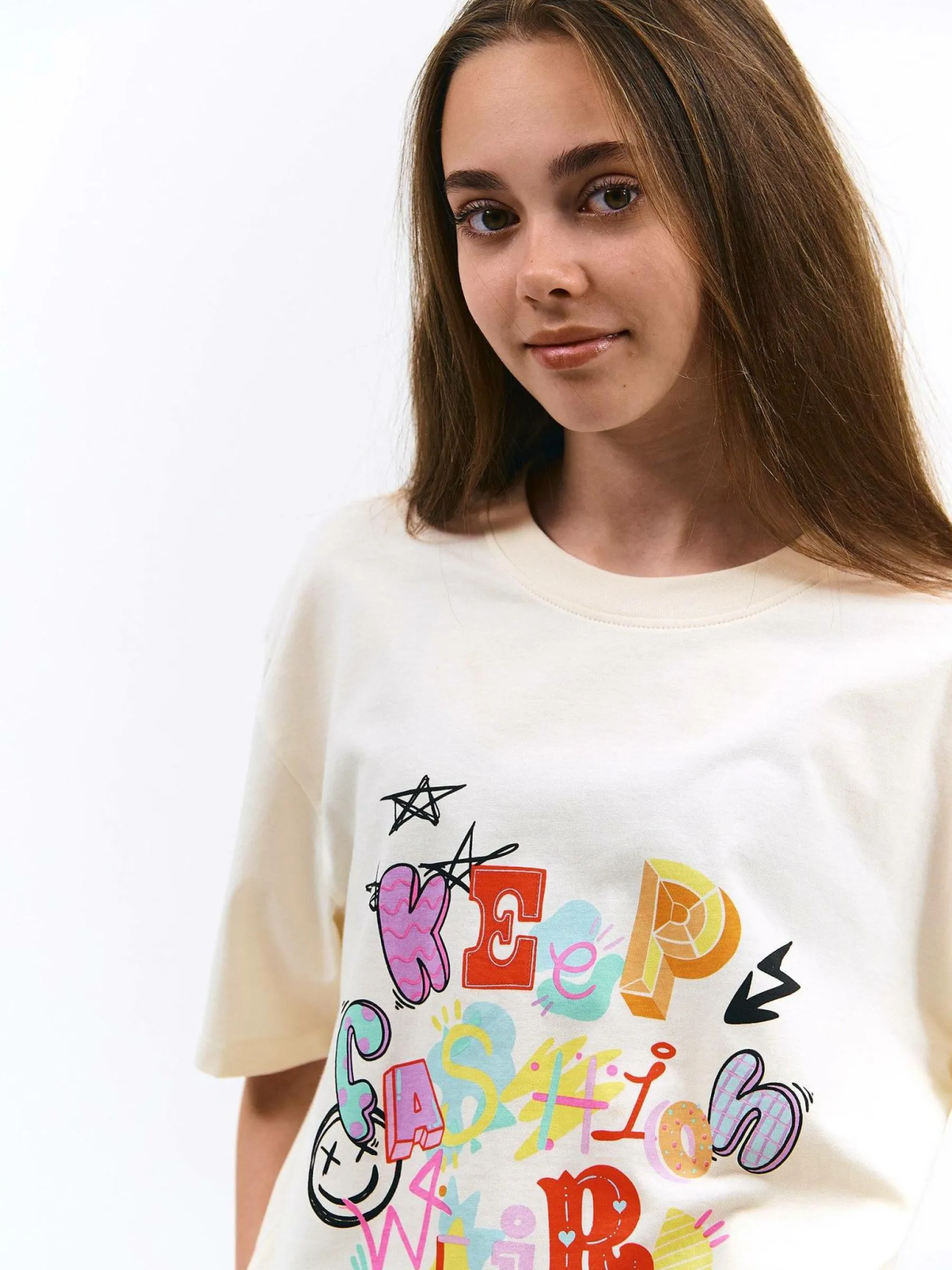 Kolor: beżowyKrój: oversizedTyp: koszulkaRekaw: krótki rękawDługość: krótkiPattern style: z nadrukiemDetal: nad …