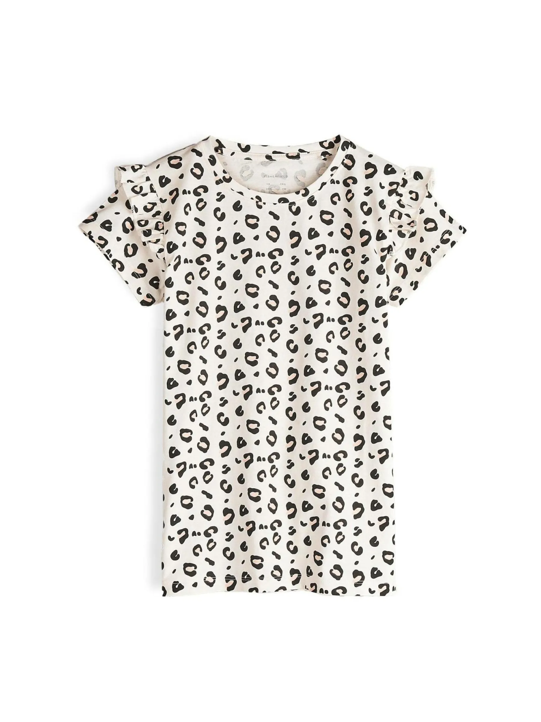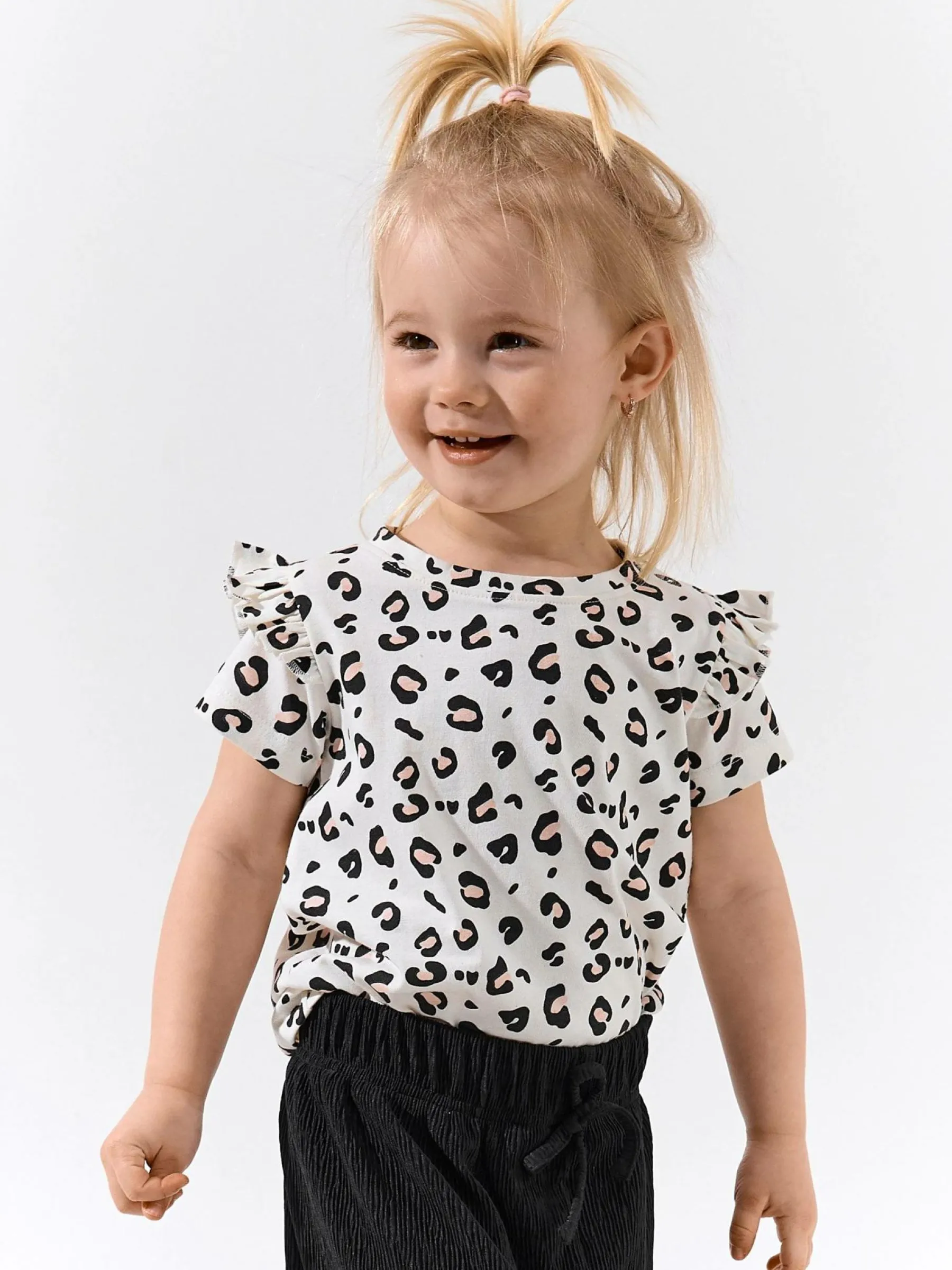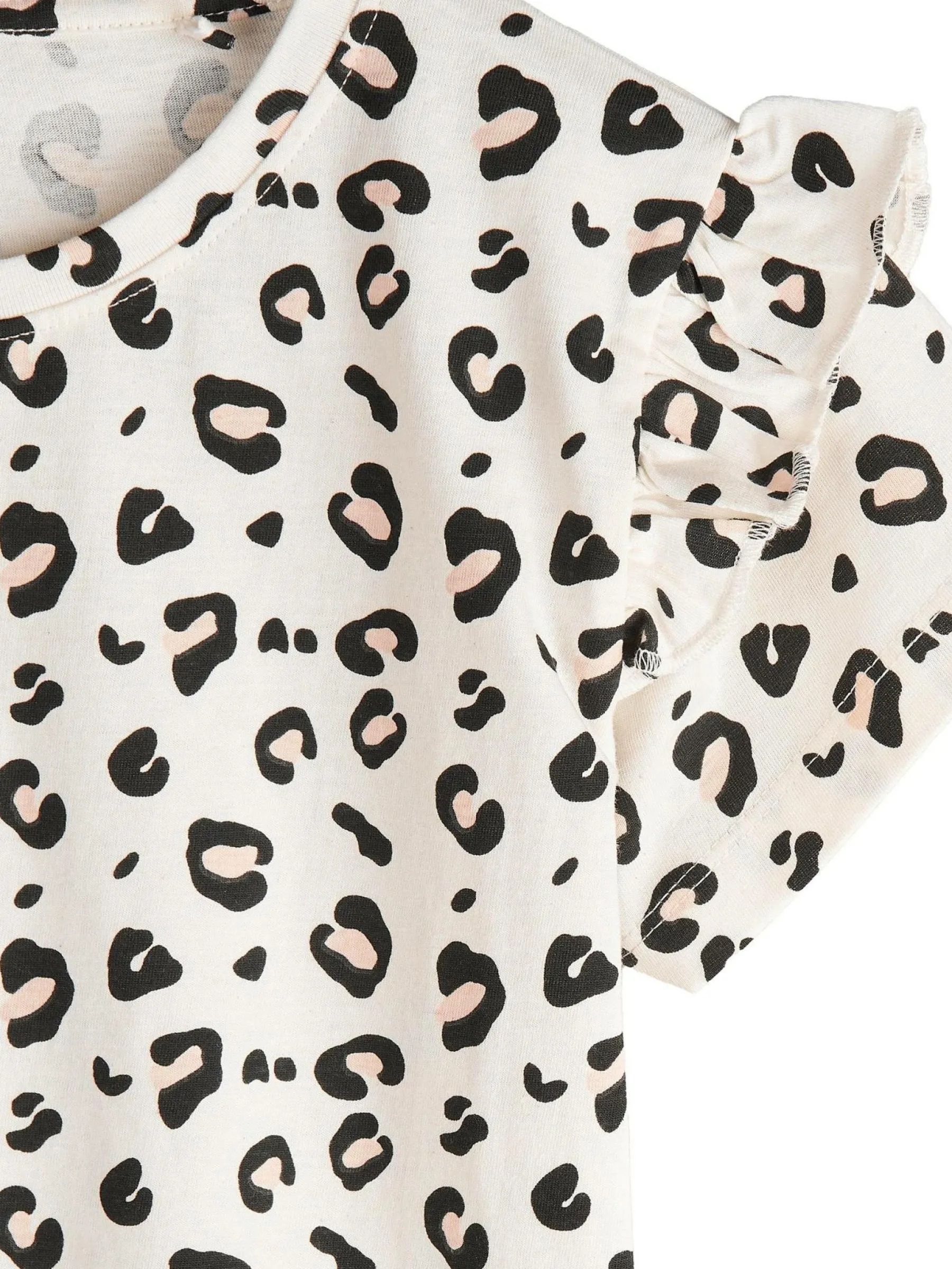 Kolor: beżowyKrój: z falbanąTyp: koszulkaRekaw: krótki rękawDługość: krótkiPattern style: zwierzecyDetal: nad g…