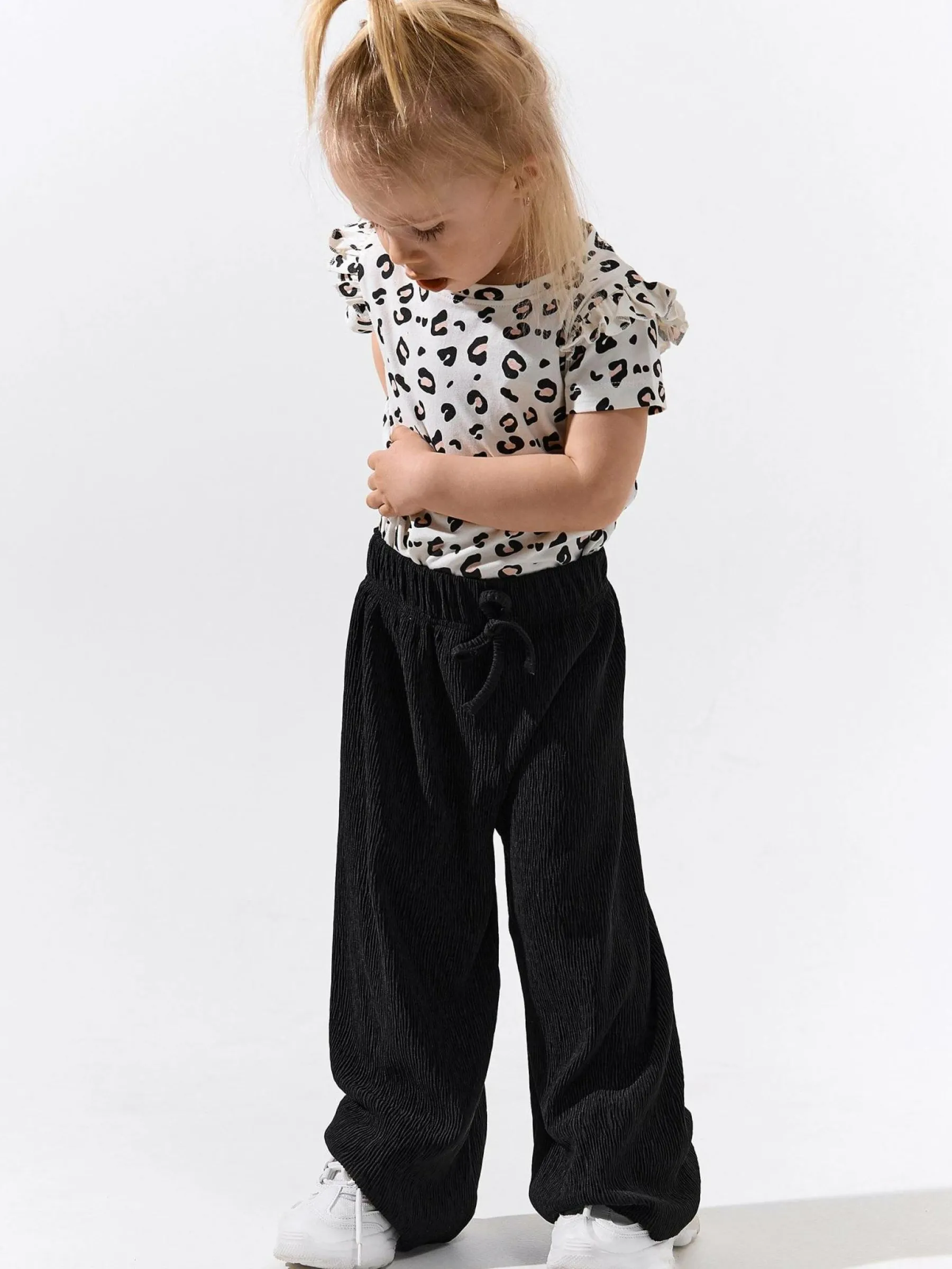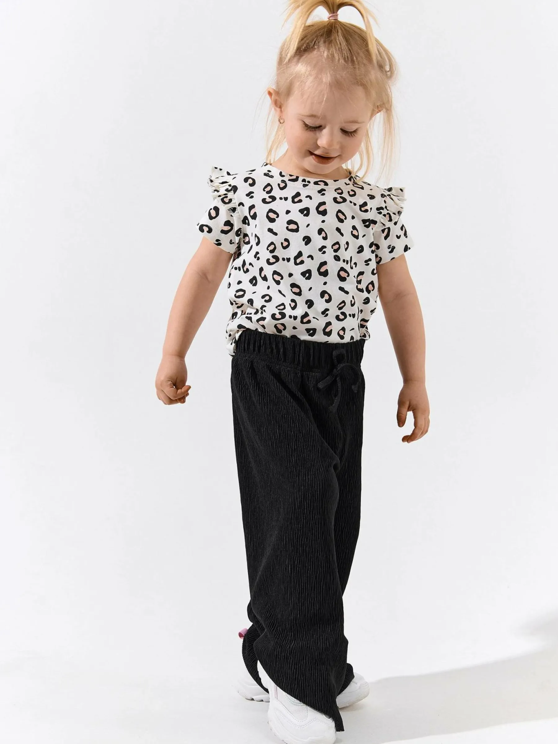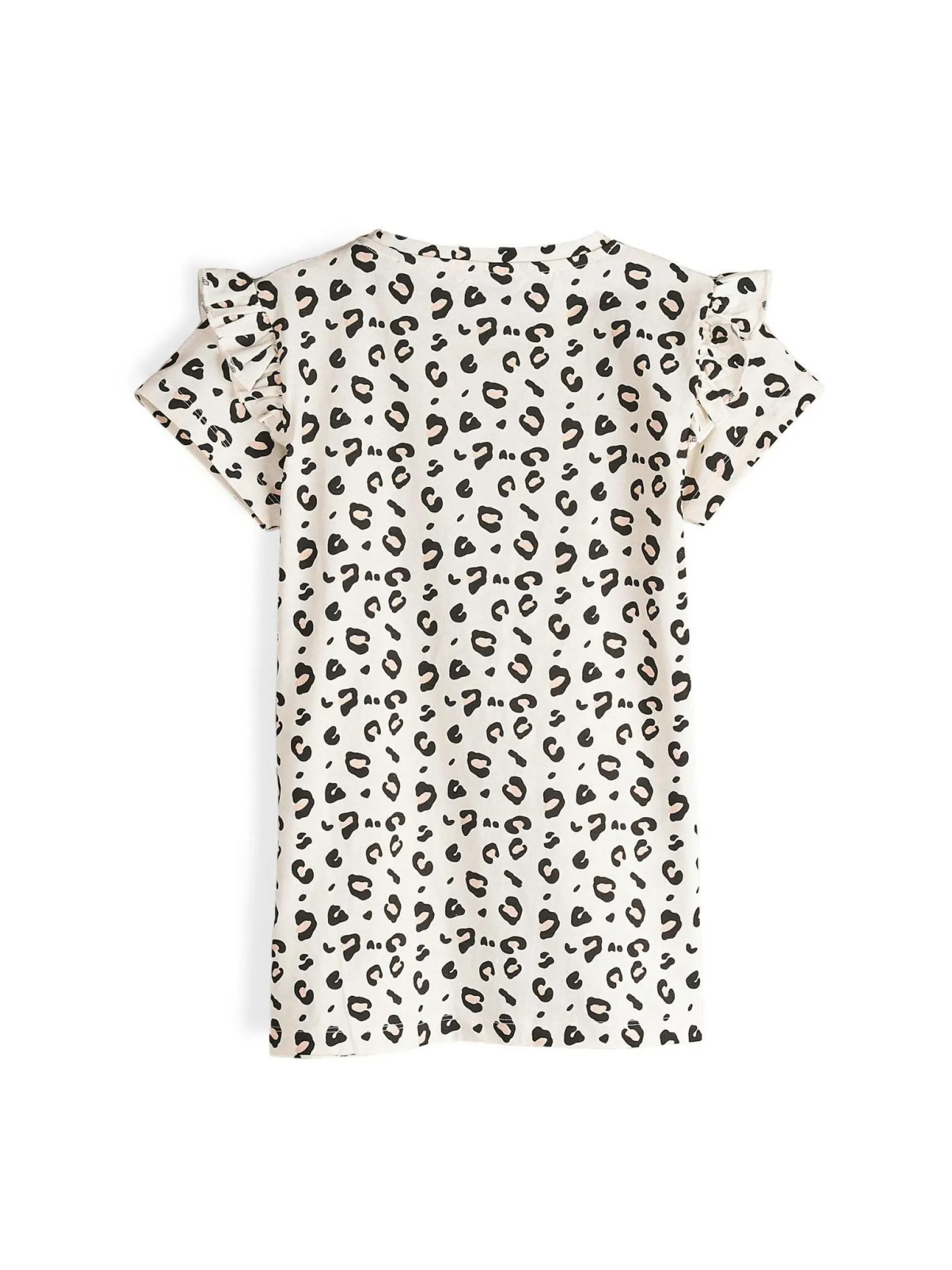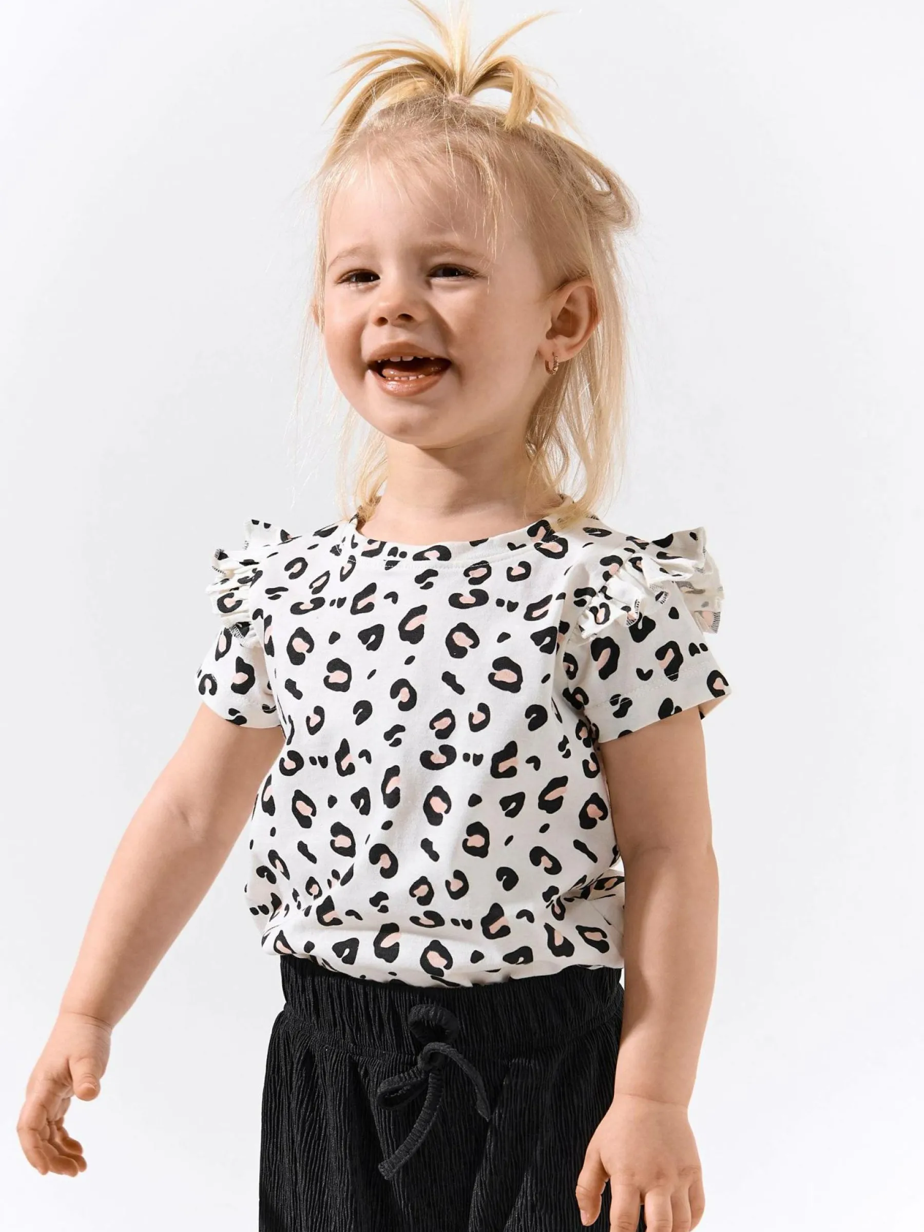Kolor: beżowyKrój: z falbanąTyp: koszulkaRekaw: krótki rękawDługość: krótkiPattern style: zwierzecyDetal: nad g…