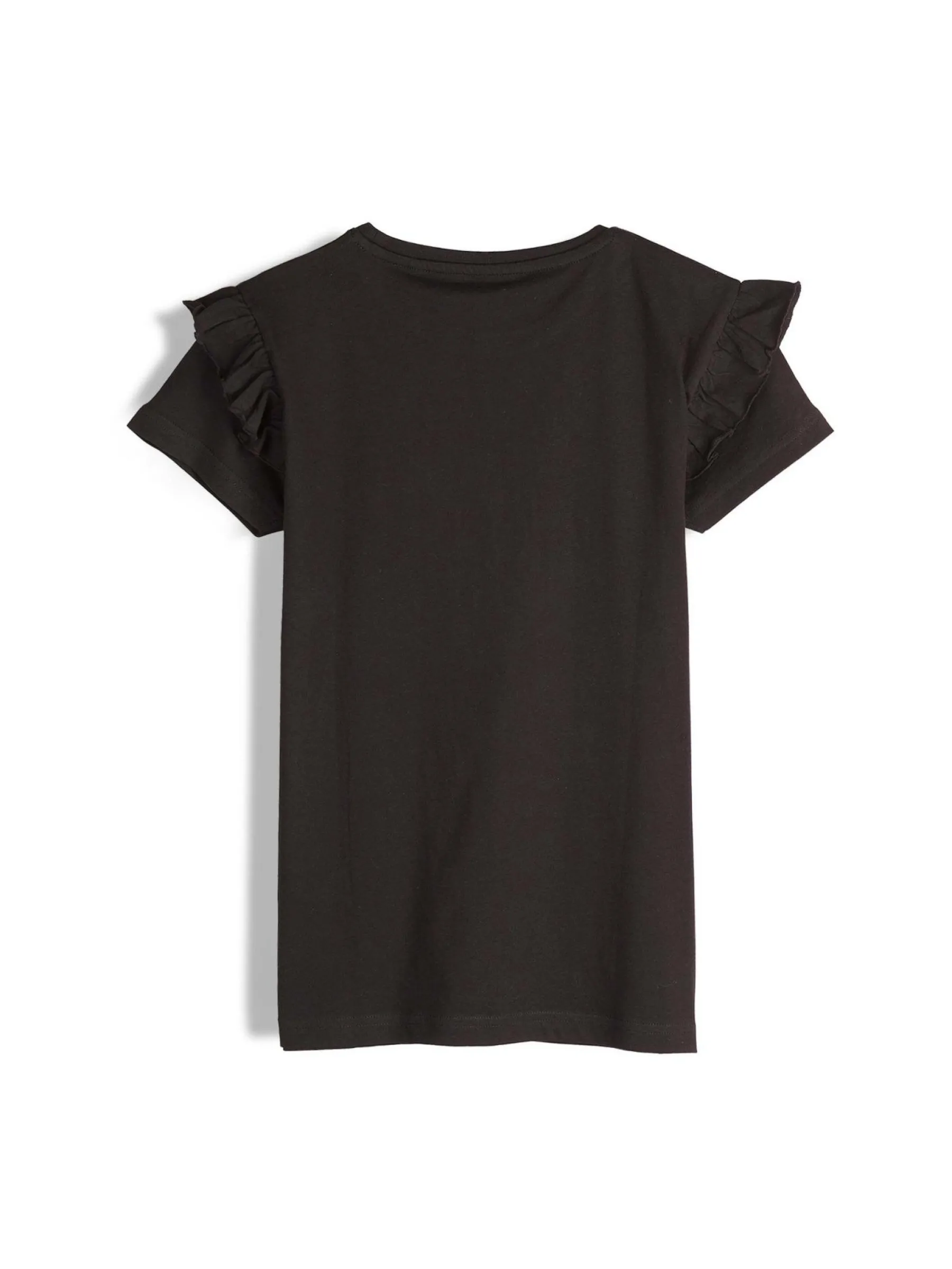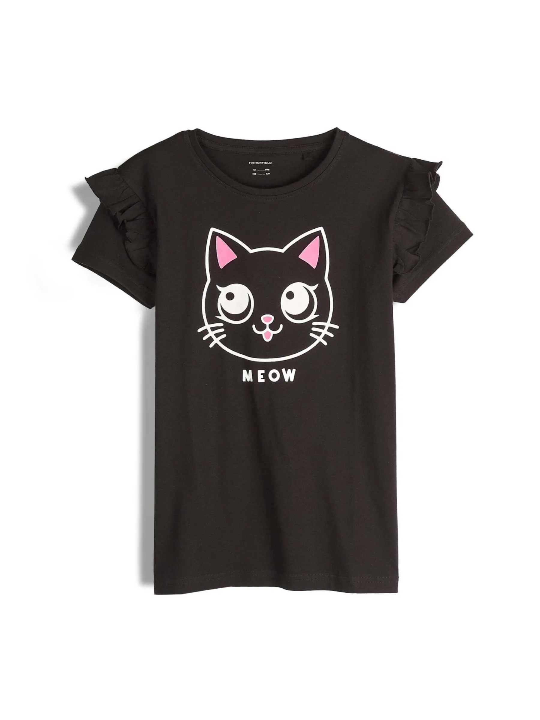 Kolor: czarnyKrój: z falbanąTyp: koszulkaRekaw: krótki rękawDługość: krótkiPattern style: z nadrukiemDetal: nad …