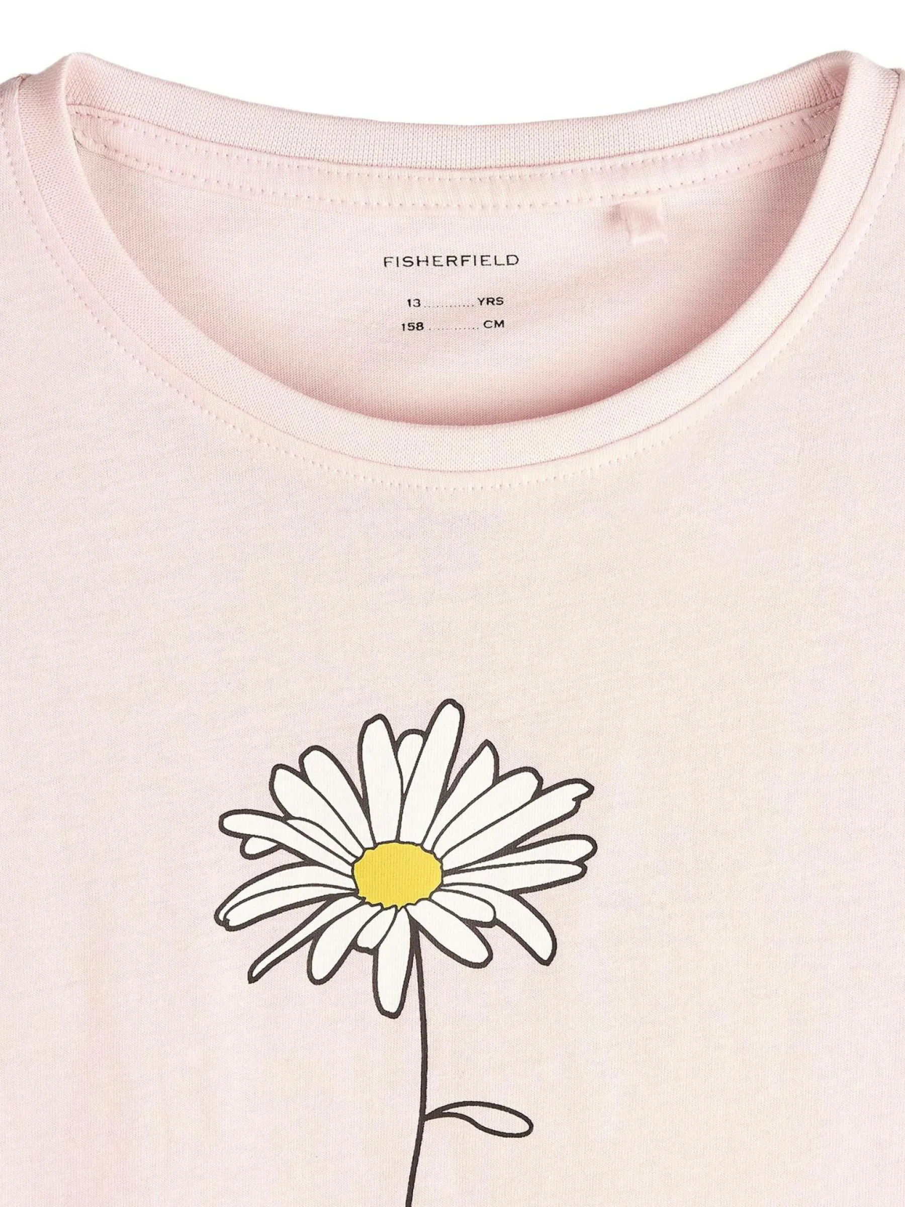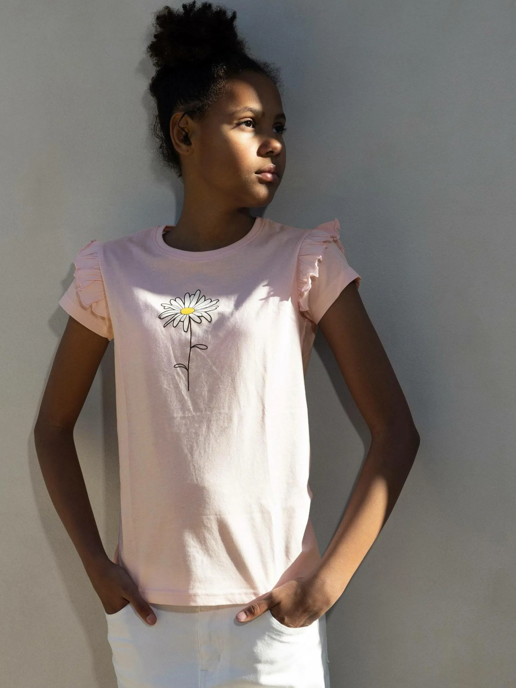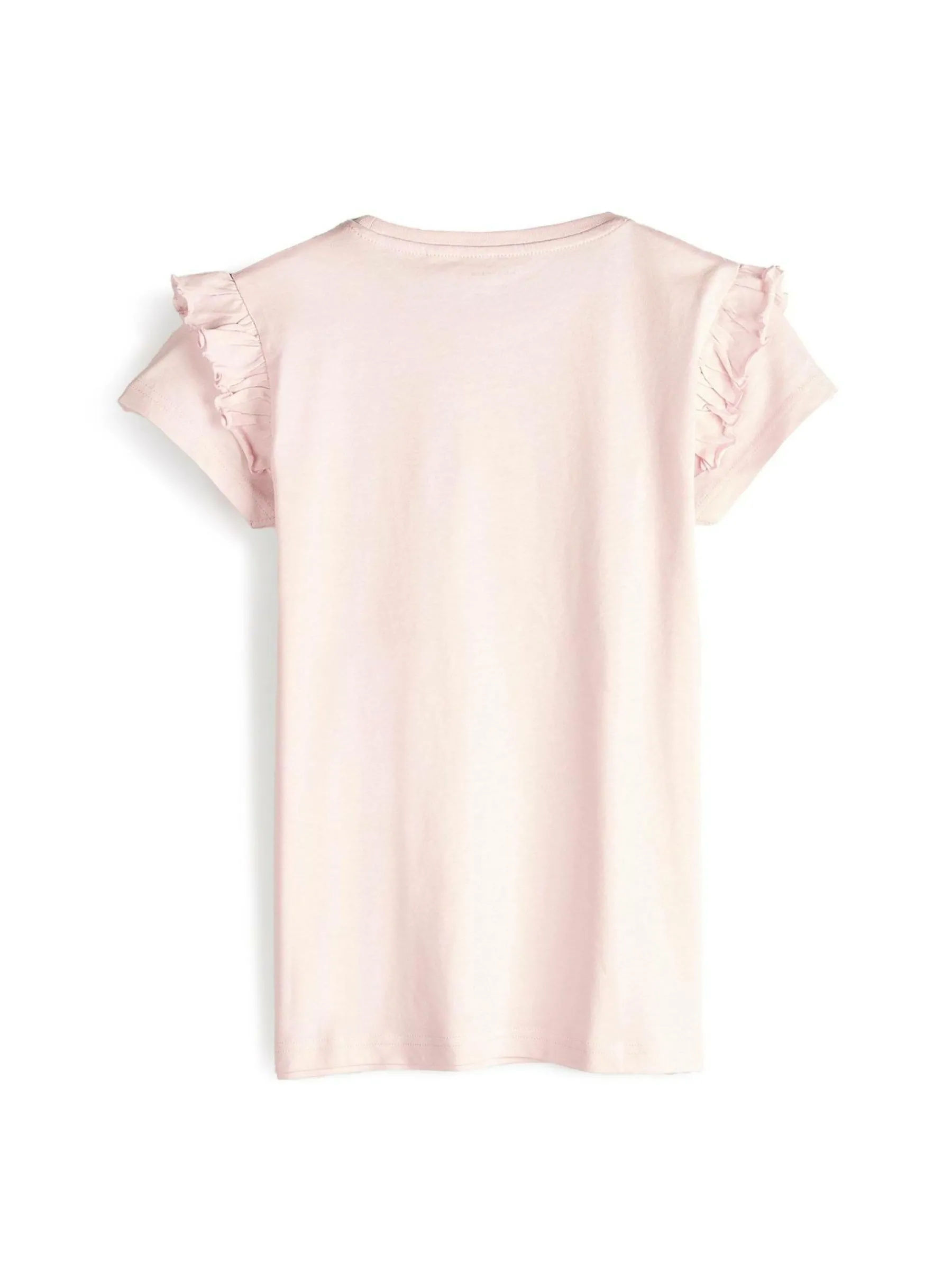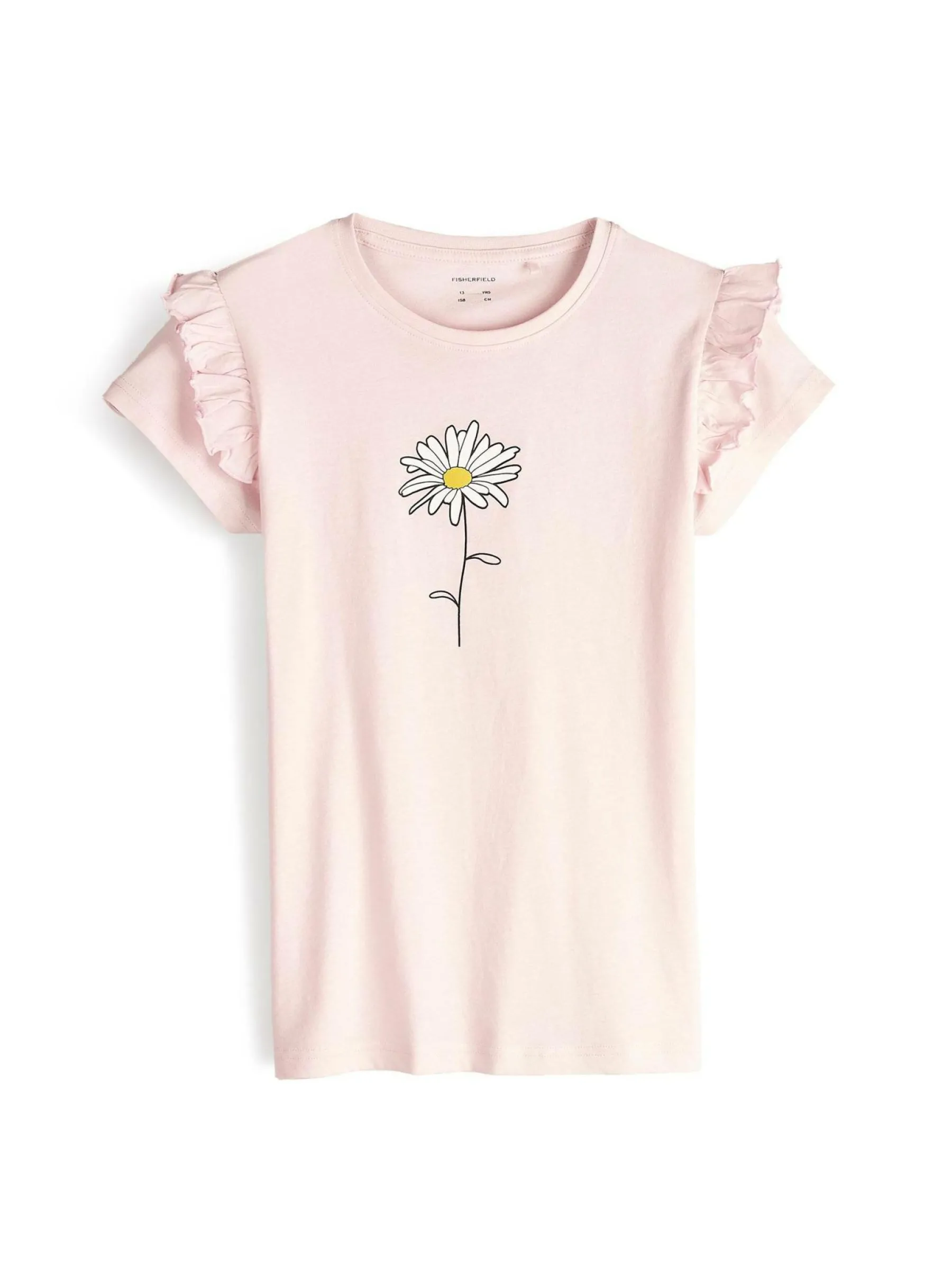 Kolor: różowyKrój: z falbanąTyp: koszulkaRekaw: krótki rękawDługość: krótkiPattern style: z nadrukiemDetal: na…