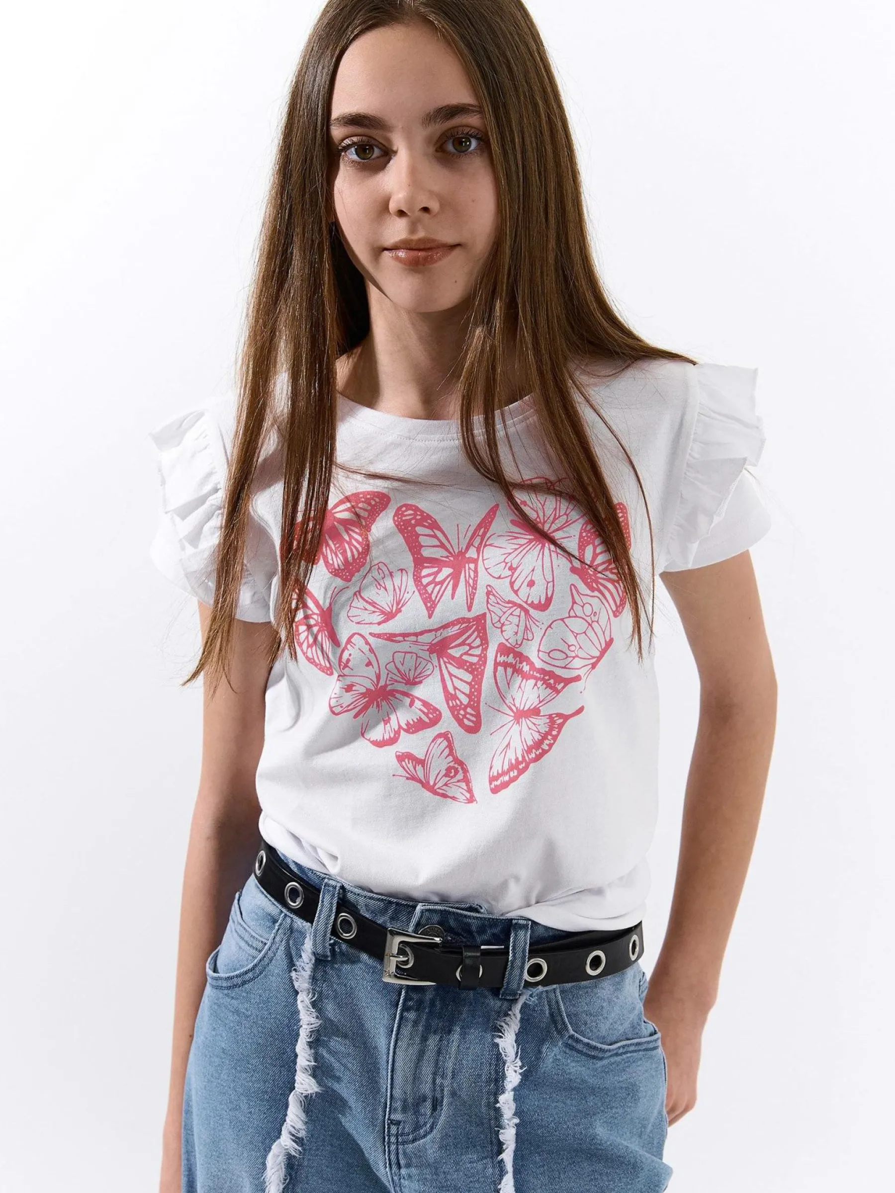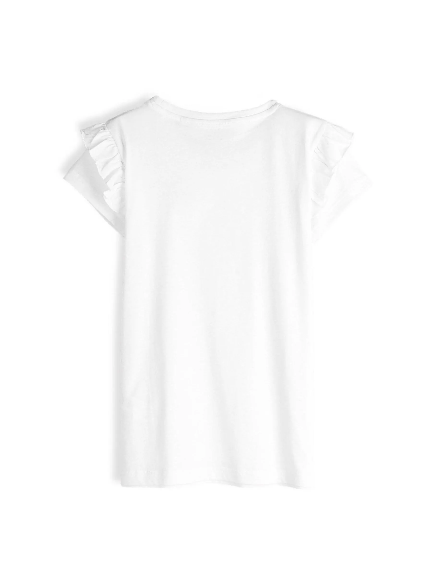 Kolor: białyKrój: z falbanąTyp: koszulkaRekaw: krótki rękawDługość: krótkiPattern style: z nadrukiemDetal: nad …