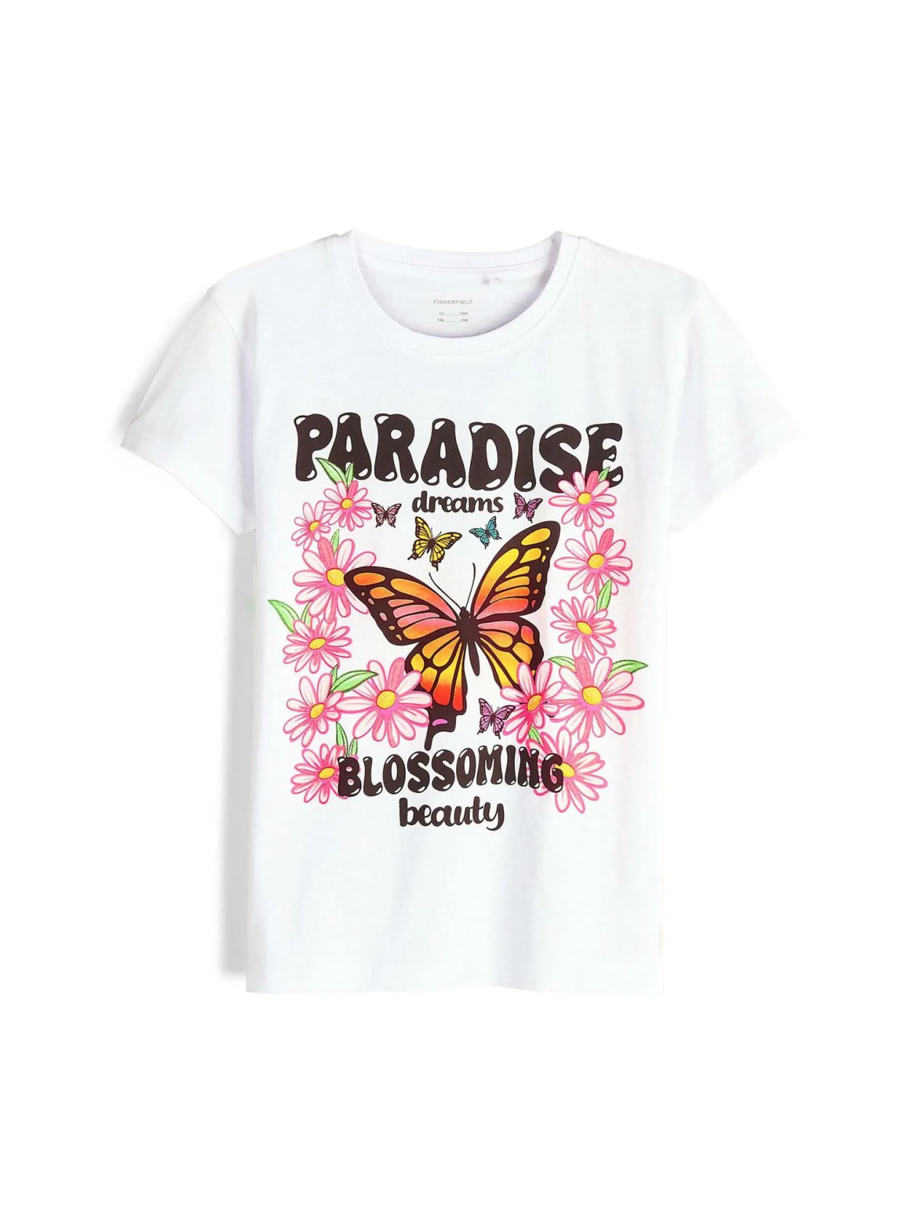 Kolor: białyKrój: regularTyp: koszulkaRekaw: krótki rękawDługość: krótkiPattern style: z nadrukiemDetal: nad gł…