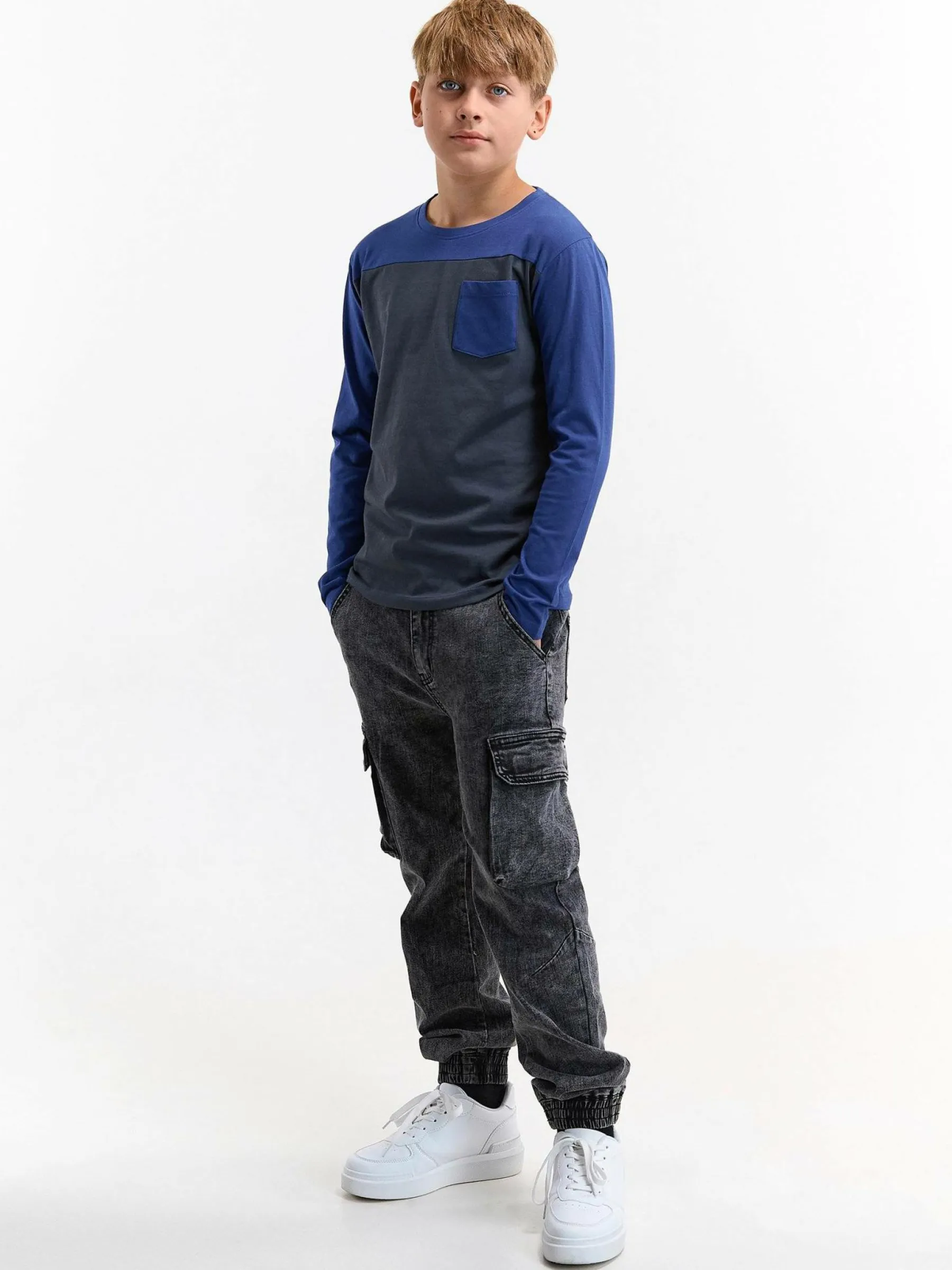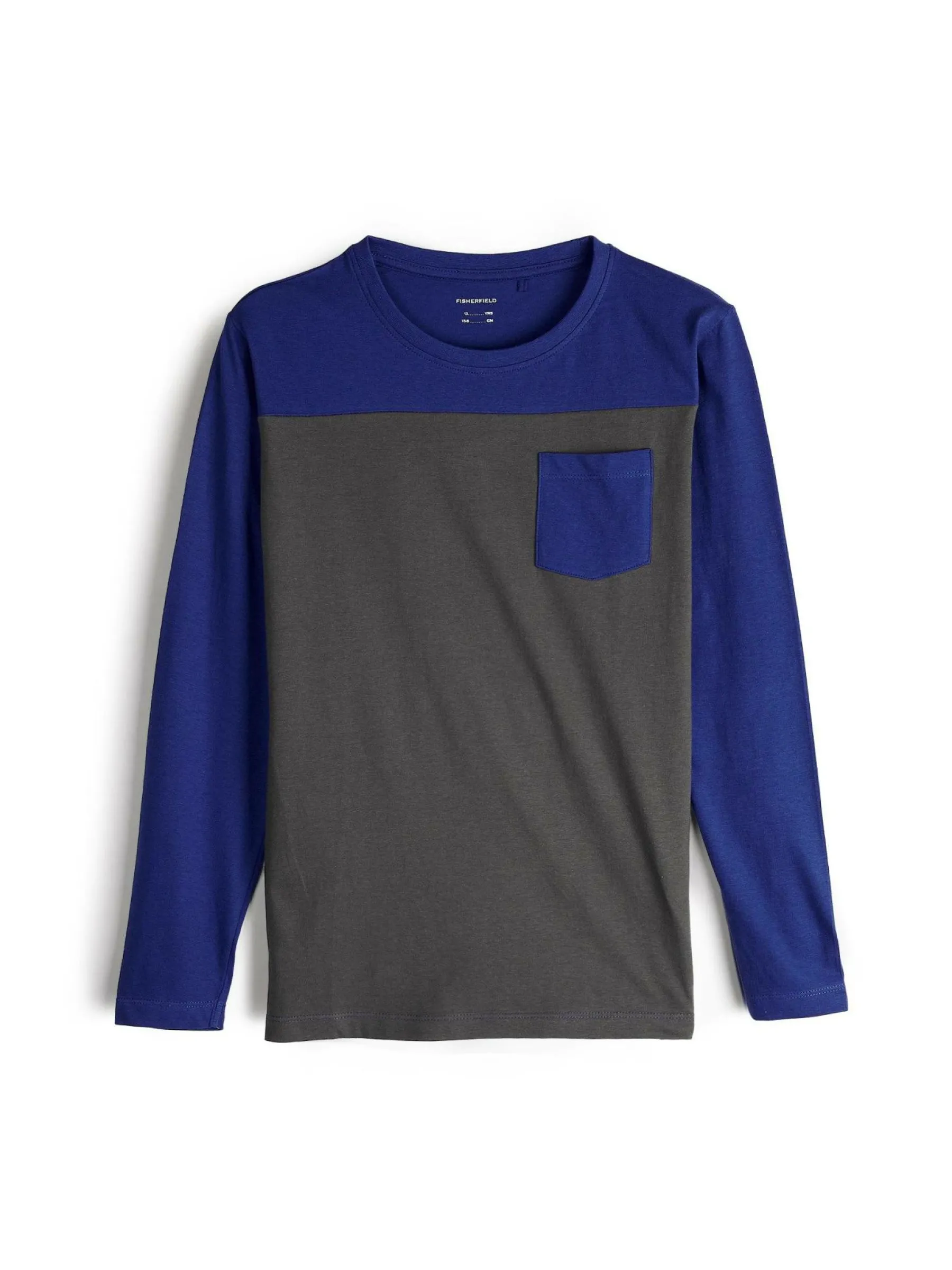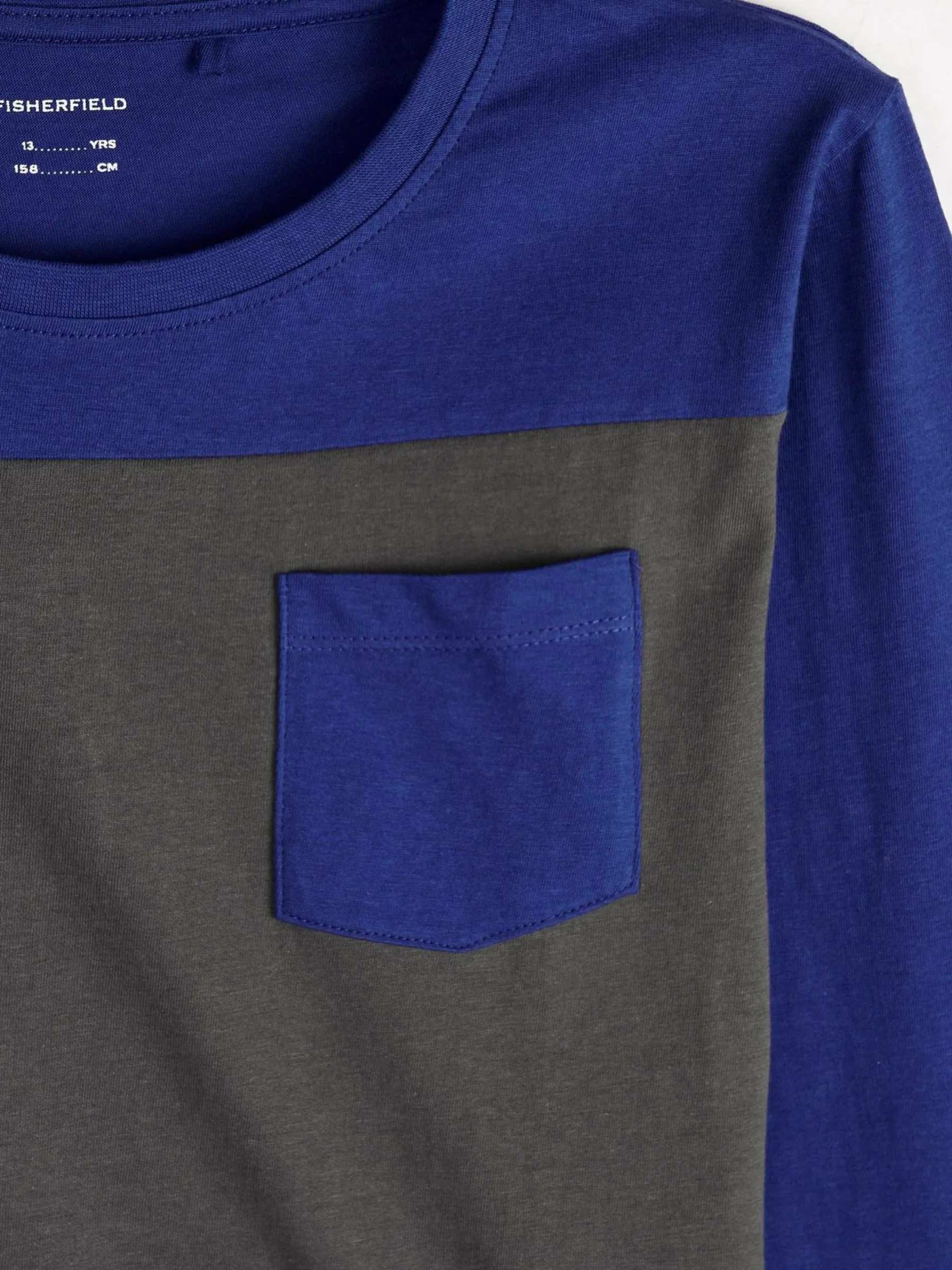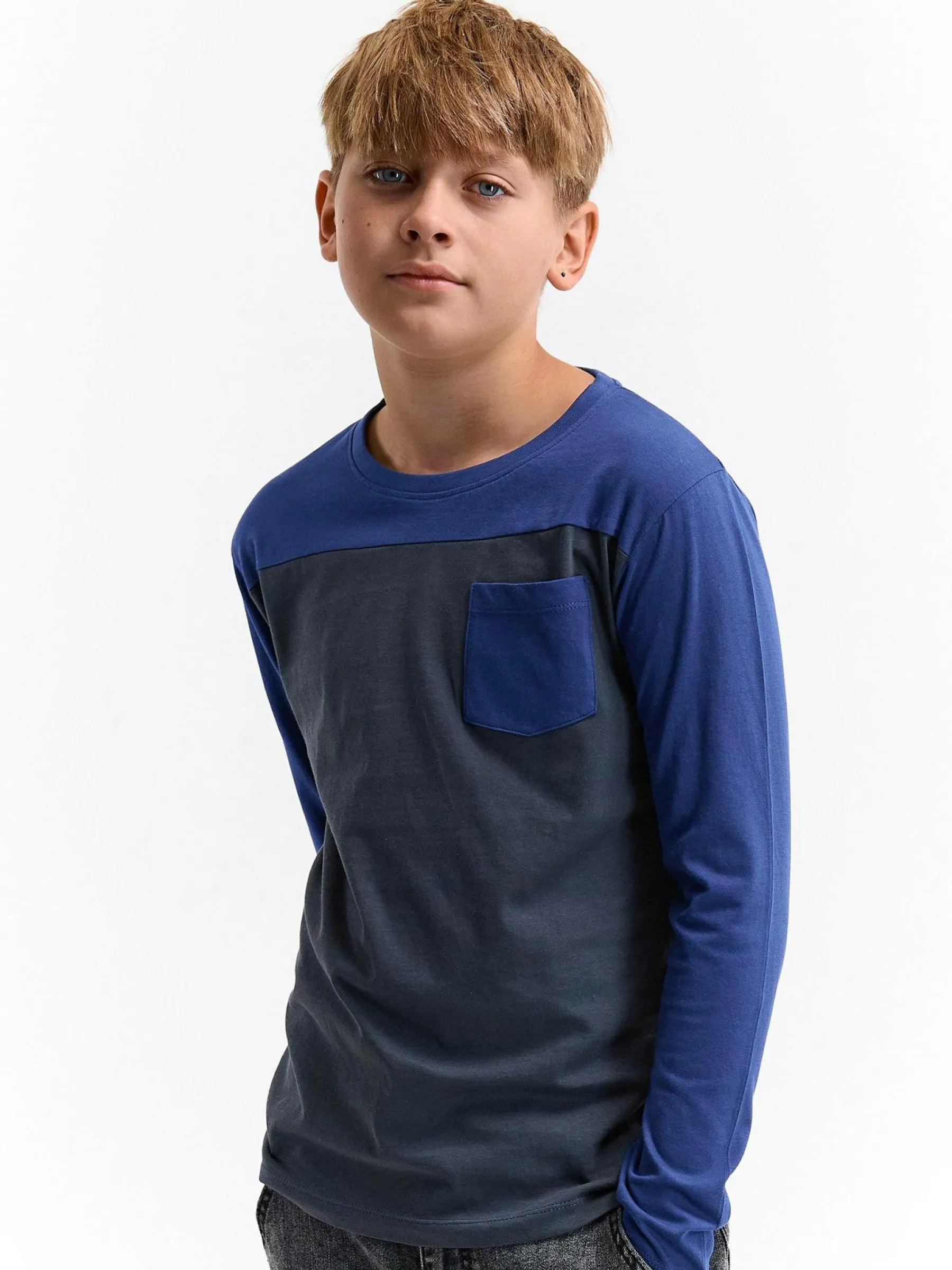 Kolor: granatowyKrój: podstawowyTyp: koszulkaRekaw: długi rękawDługość: krótkiPattern style: colour blockDetal: n…