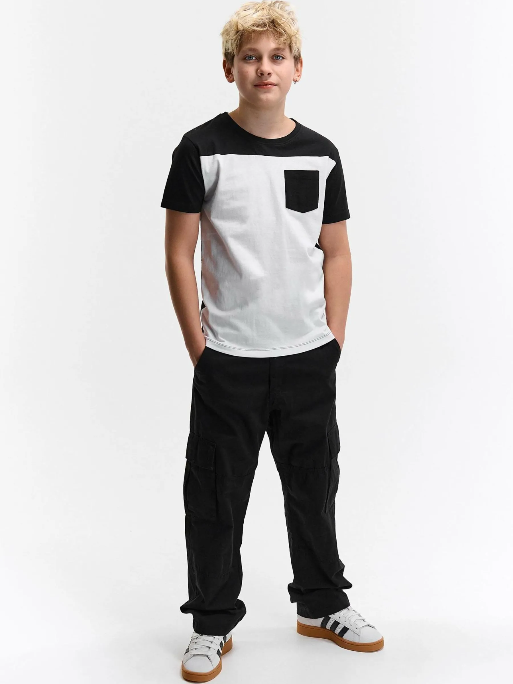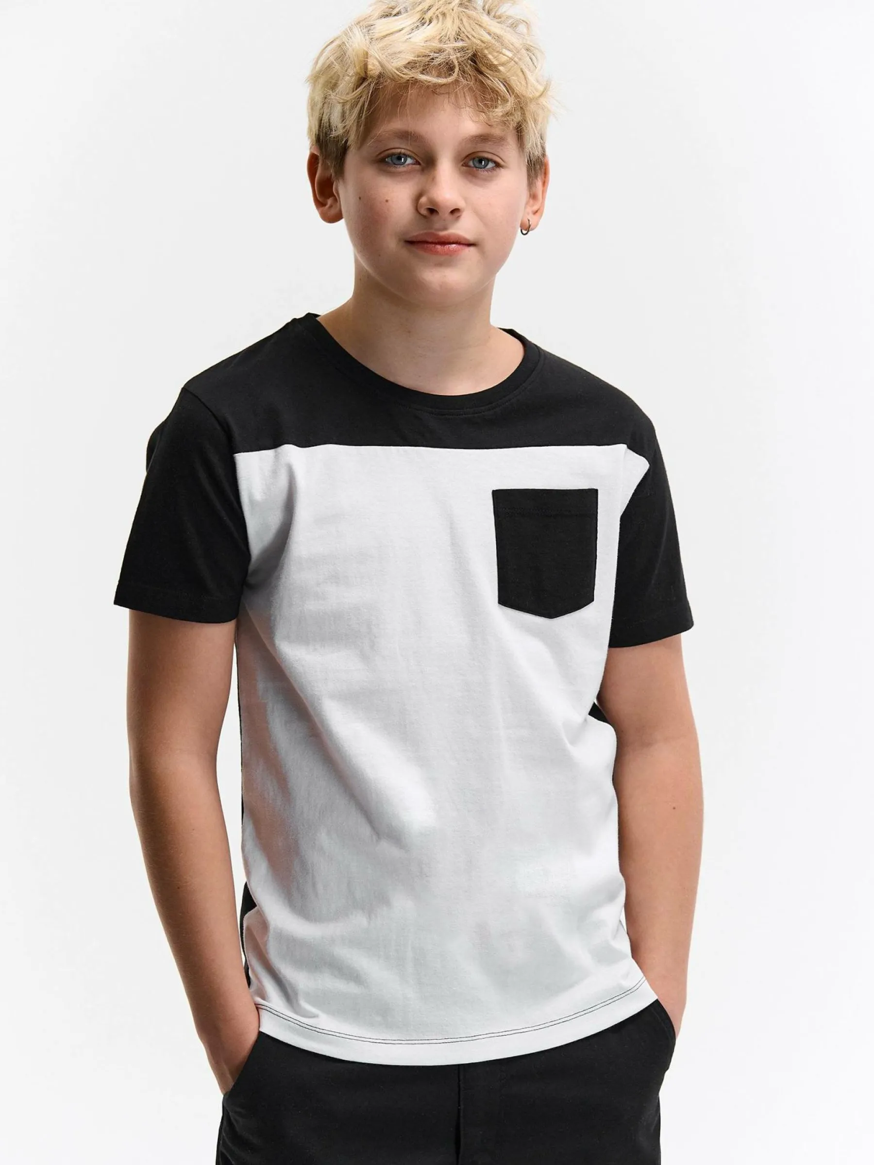 Kolor: czarnyKrój: podstawowyTyp: koszulkaRekaw: krótki rękawDługość: krótkiPattern style: colour blockDetal: nad…