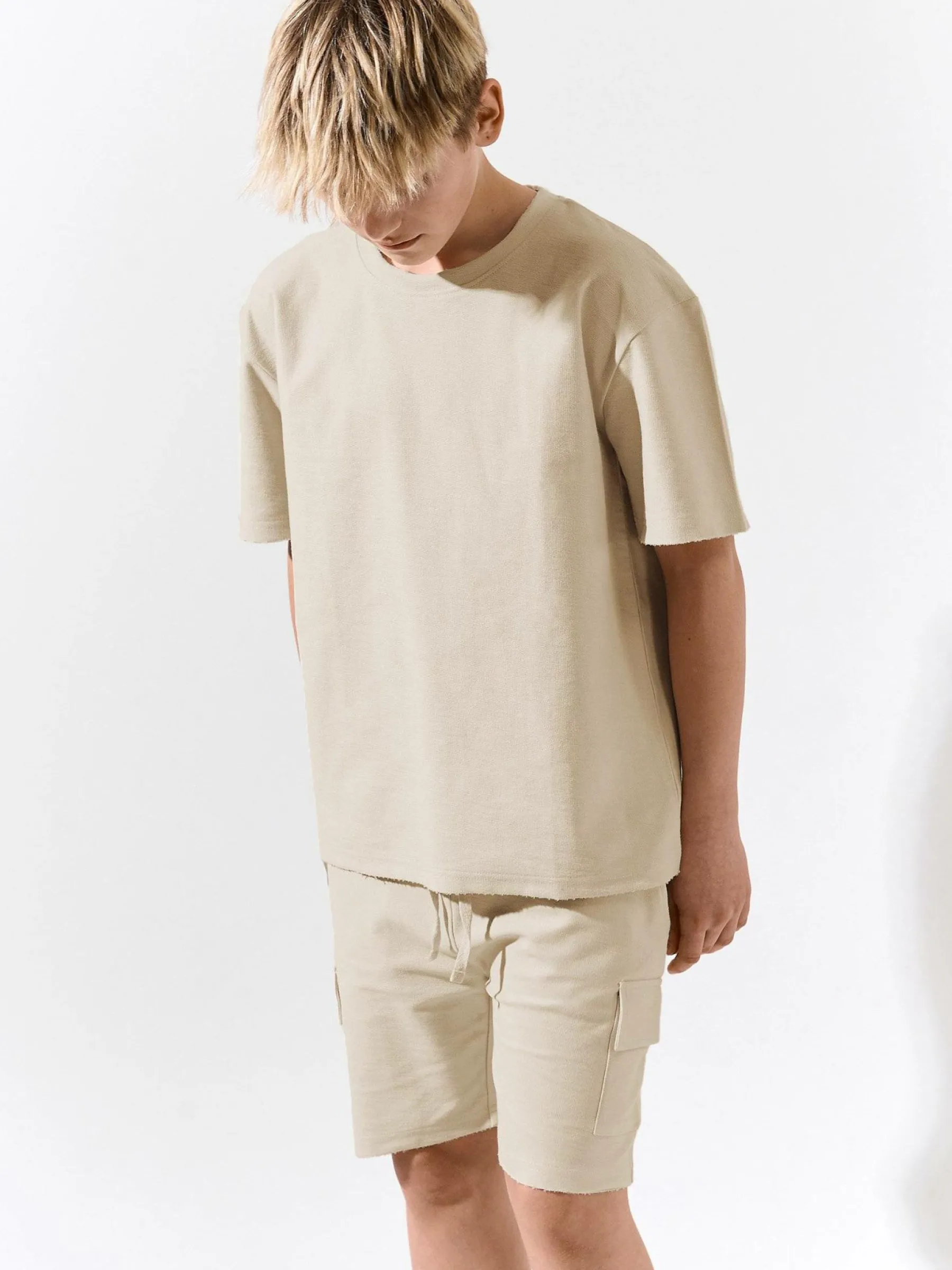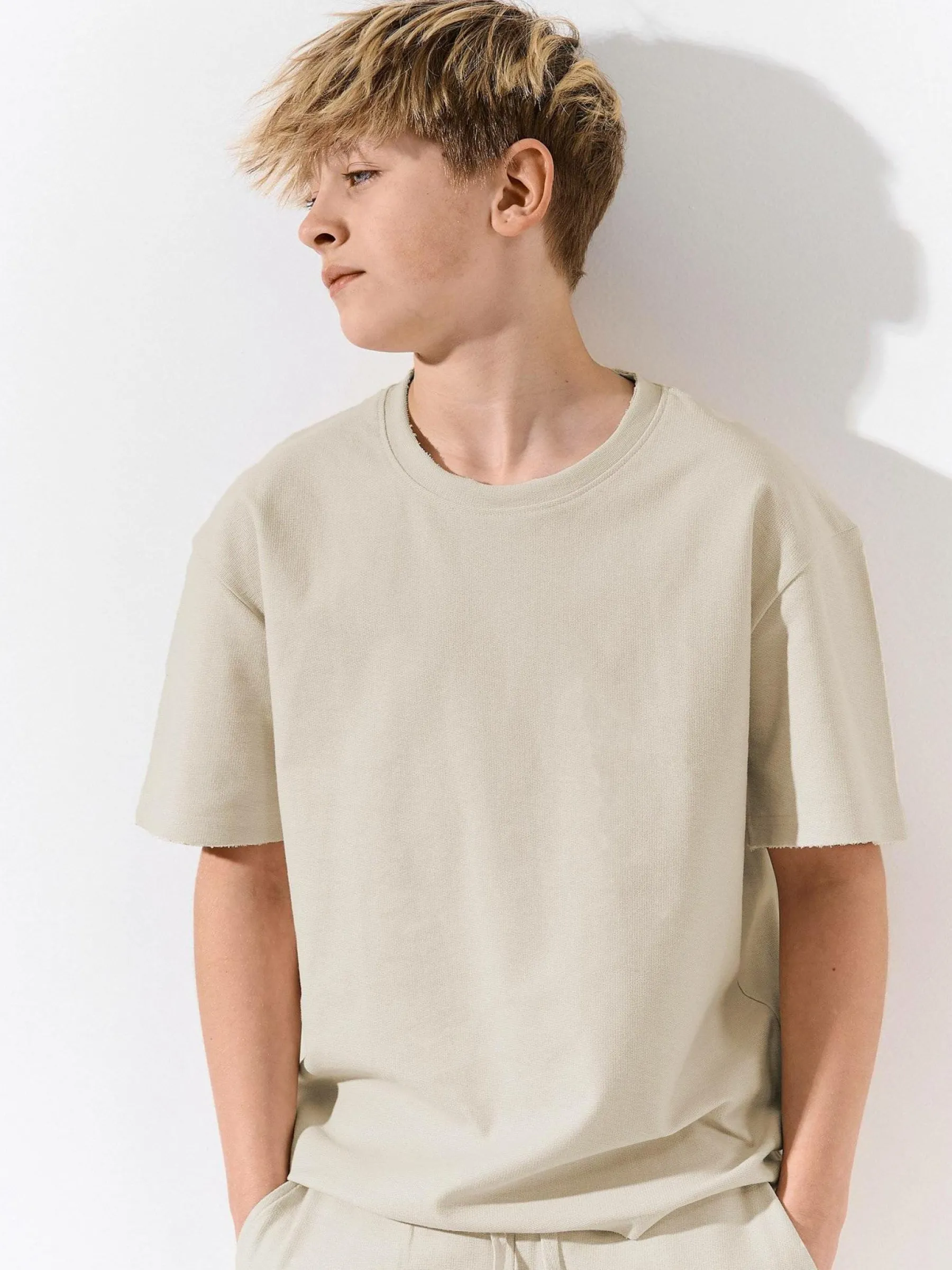 Kolor: beżowyKrój: regularTyp: koszulkaRekaw: krótki rękawDługość: krótkiPattern style: pojedynczy kolorDetal: n…