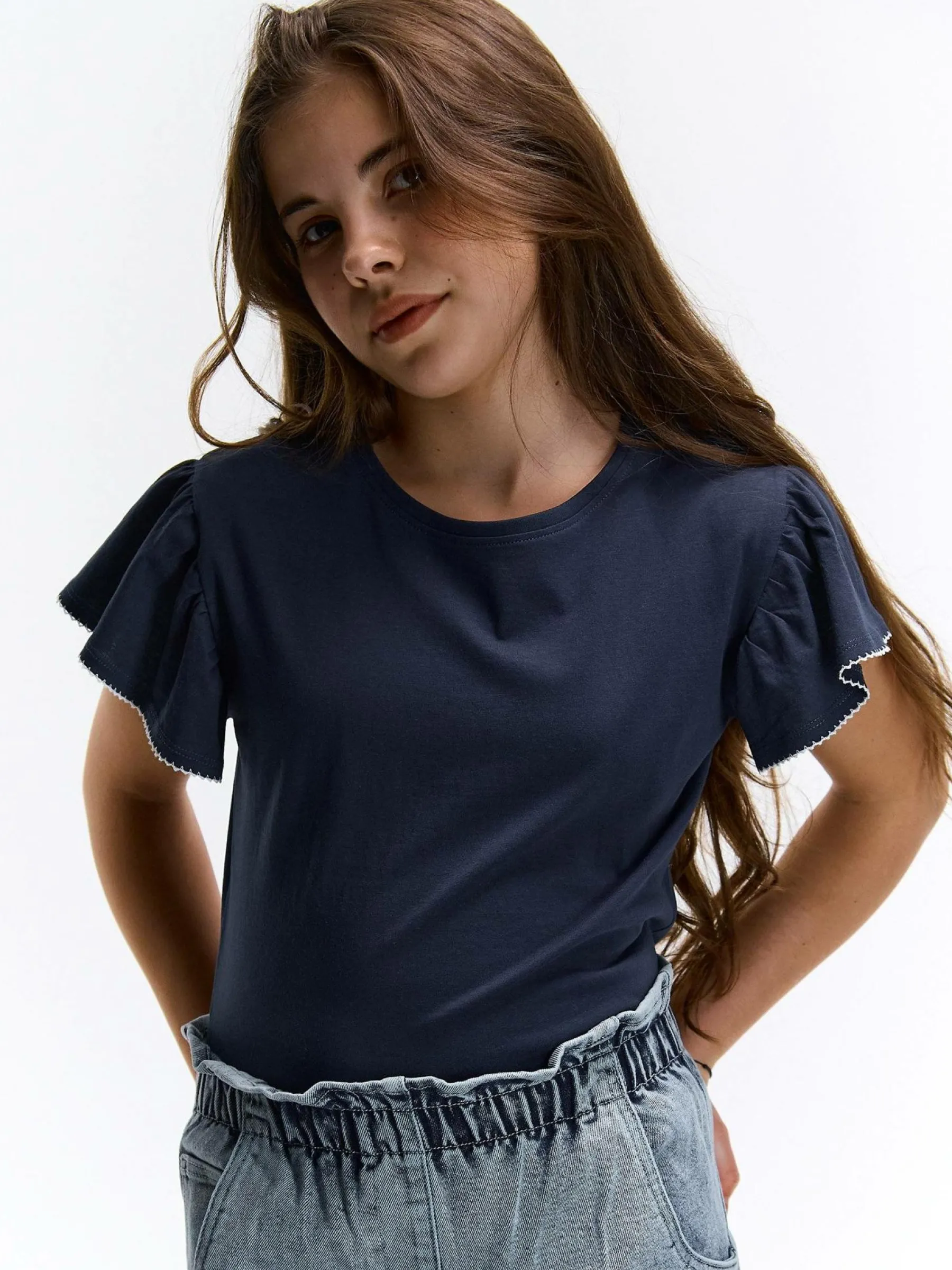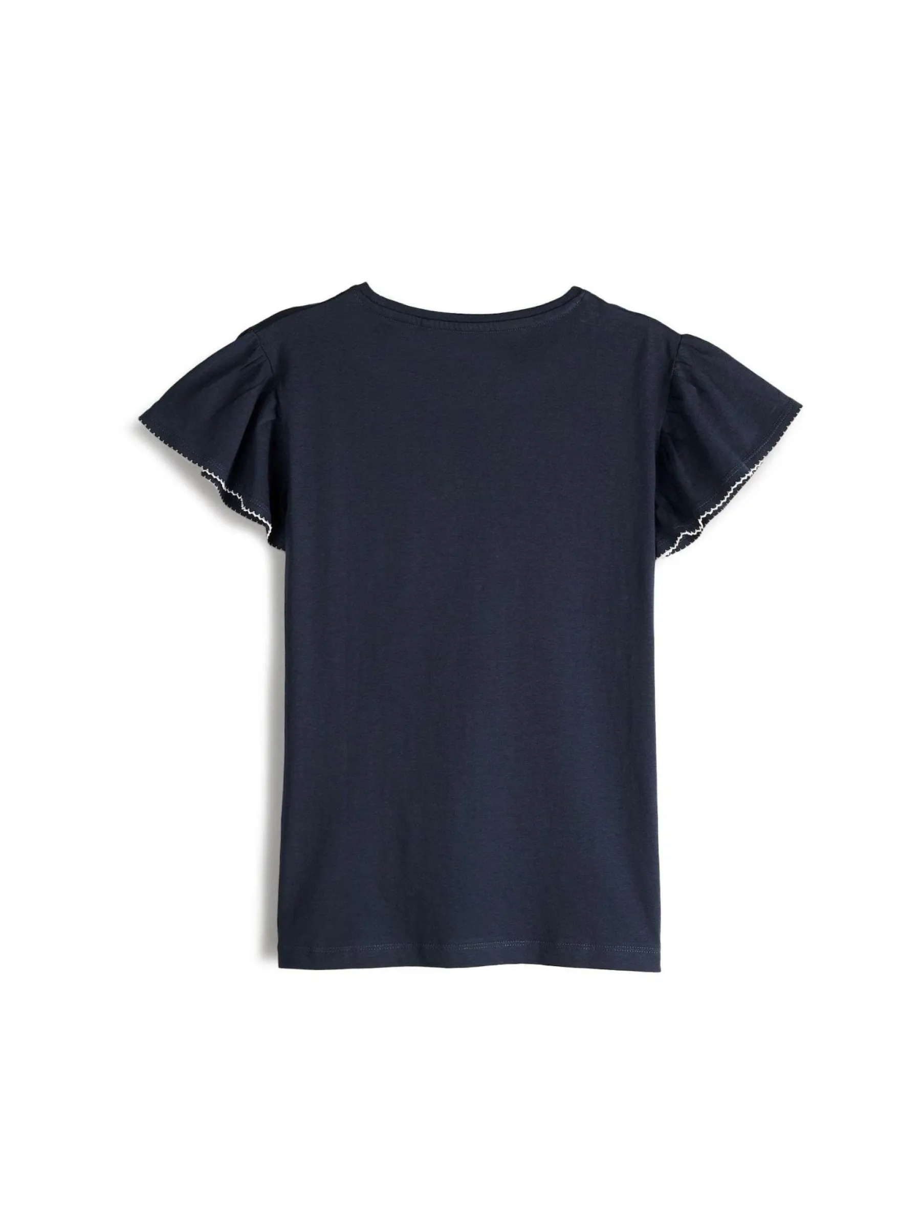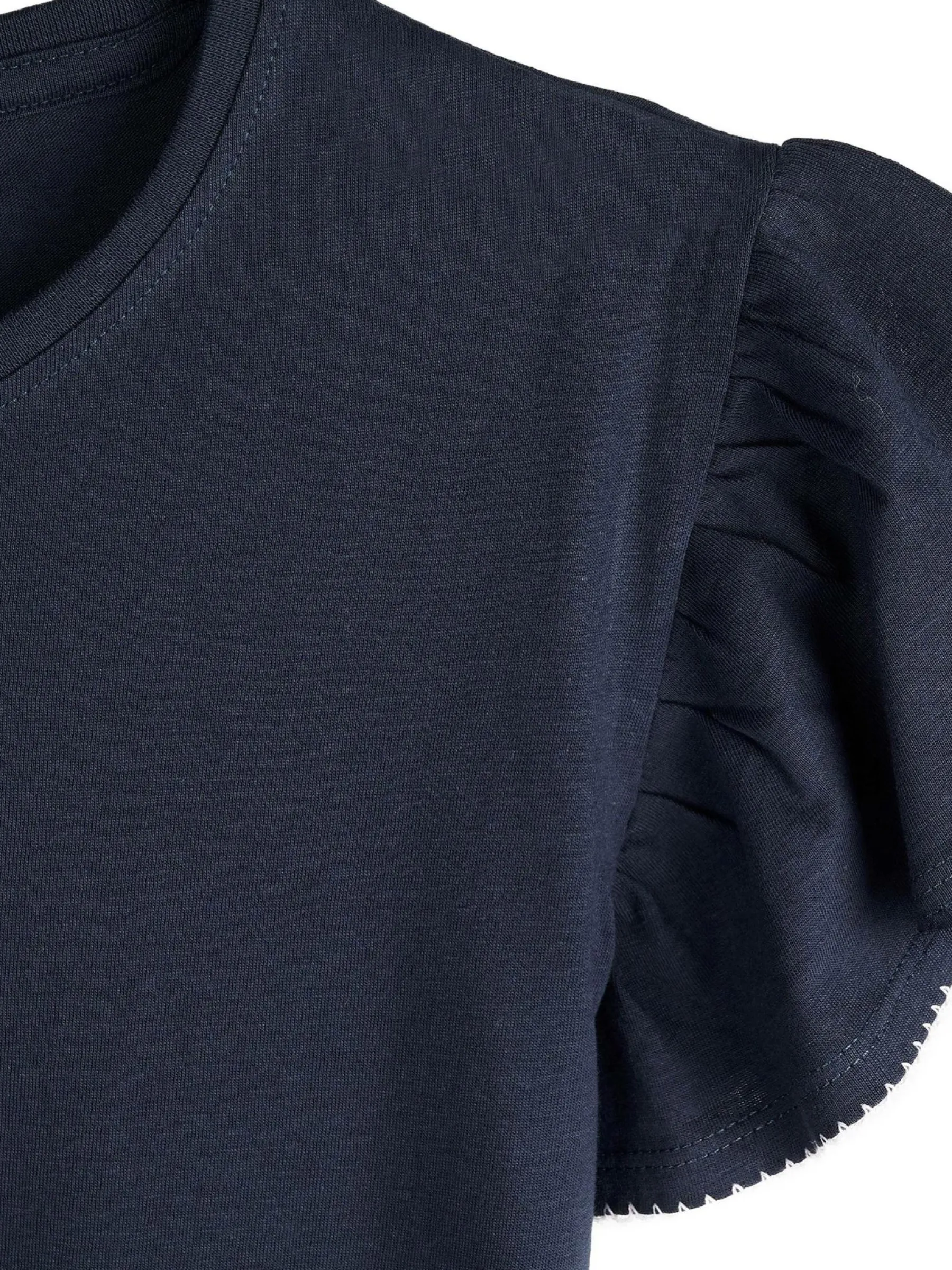 Kolor: granatowyKrój: z falbanąTyp: koszulkaRekaw: krótki rękawDługość: krótkiPattern style: pojedynczy kolorDet…
