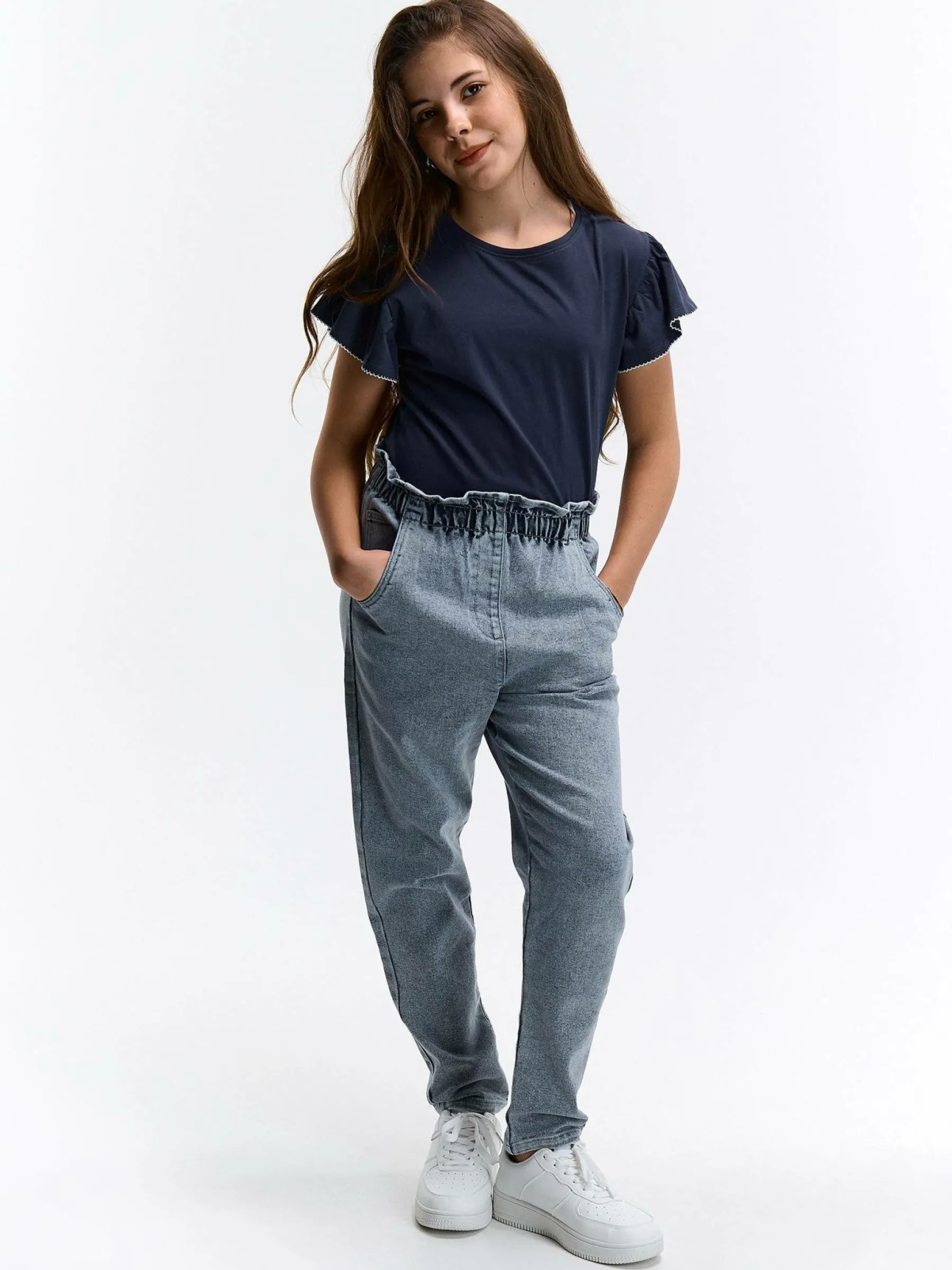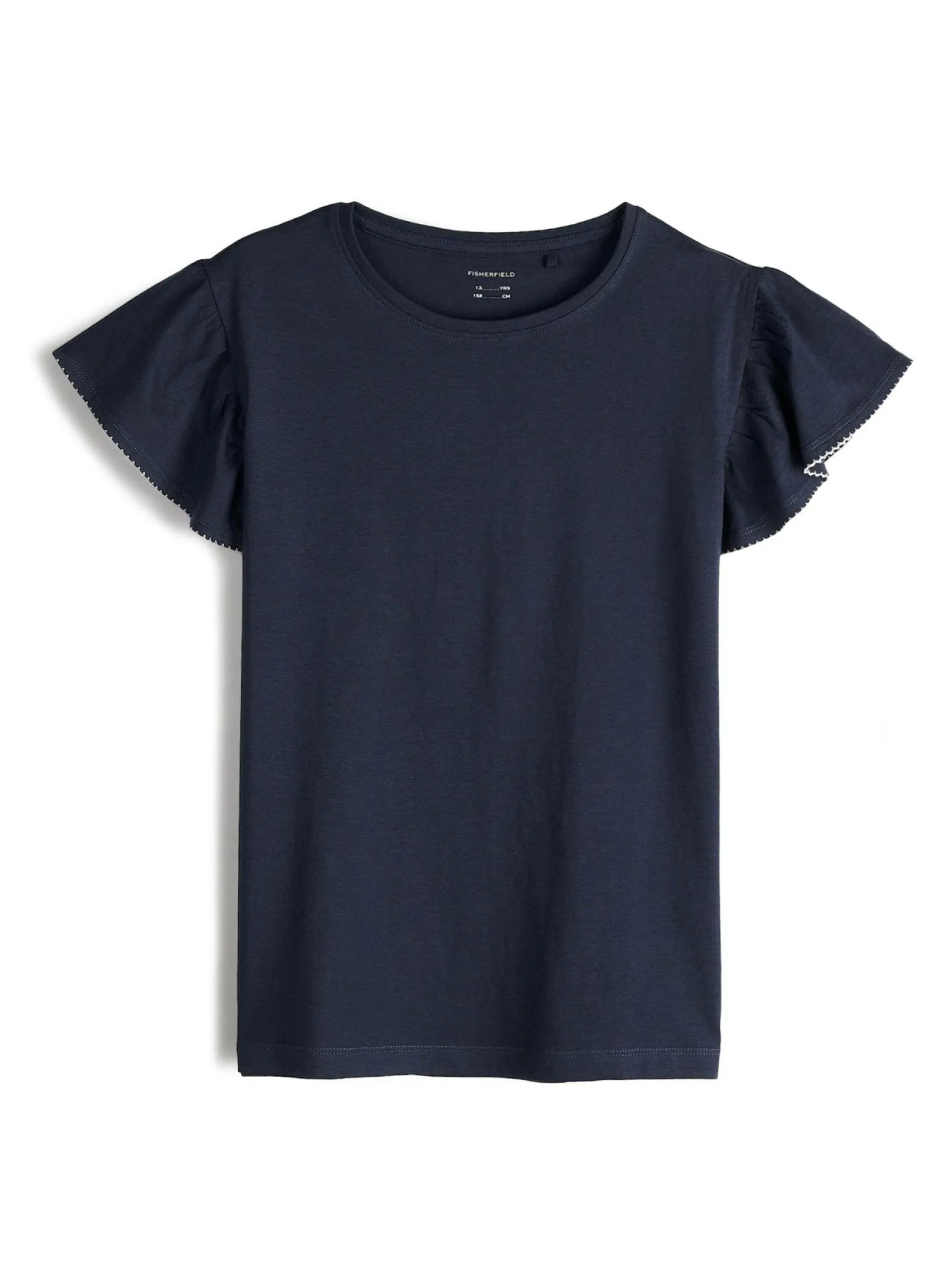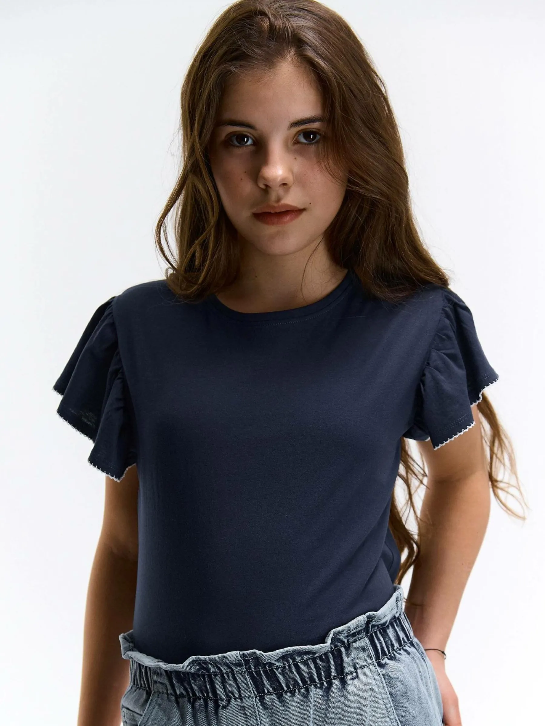 Kolor: granatowyKrój: z falbanąTyp: koszulkaRekaw: krótki rękawDługość: krótkiPattern style: pojedynczy kolorDet…