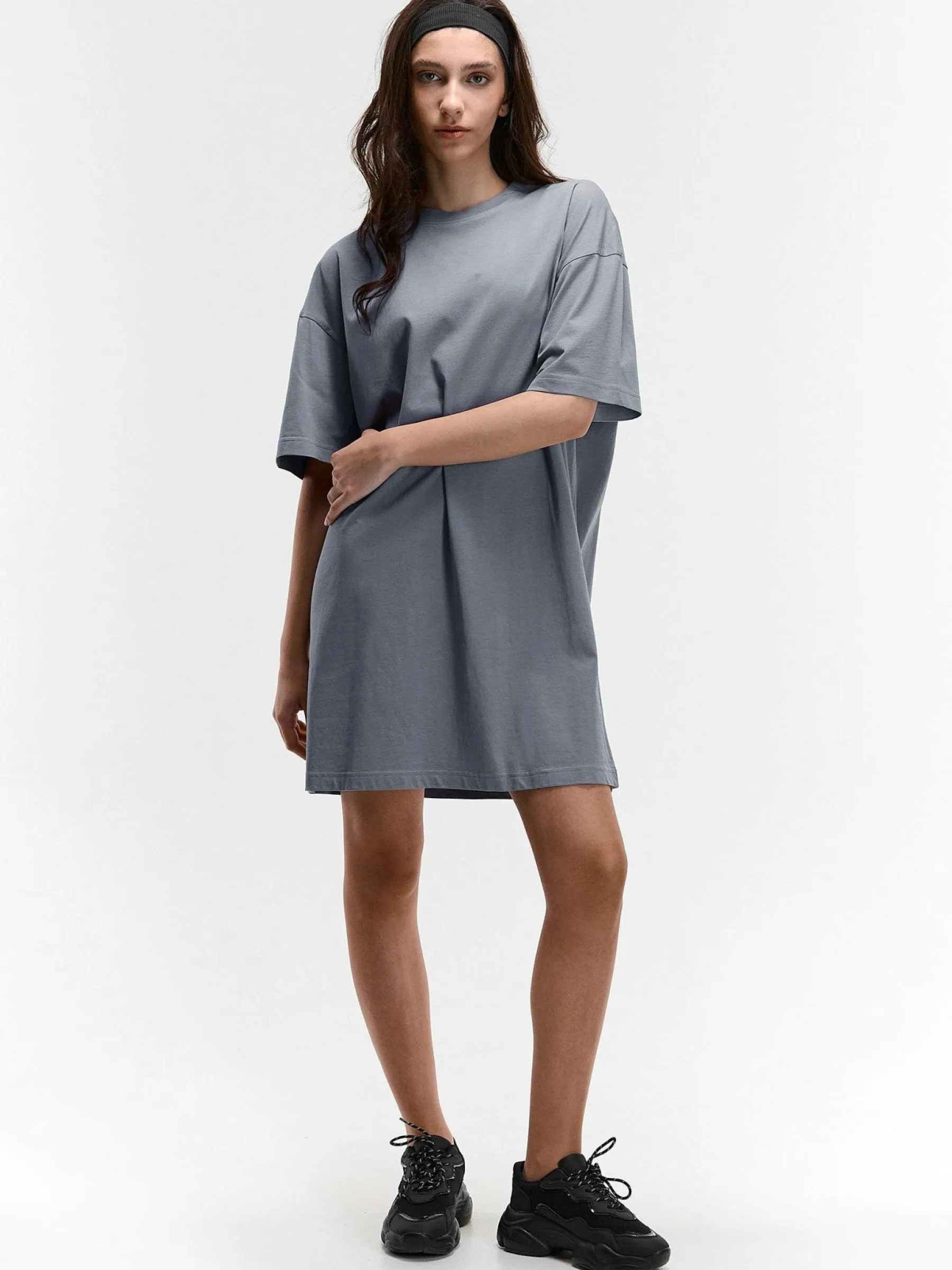 Kolor: szaryKrój: koszulkoweTyp: sukienkaRekaw: krótki rękawDługość: miniPattern style: pojedynczy kolorDetal: nad…
