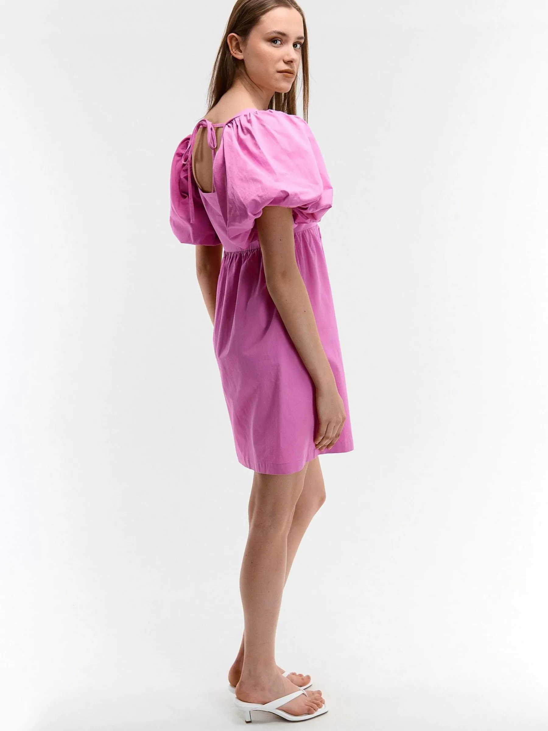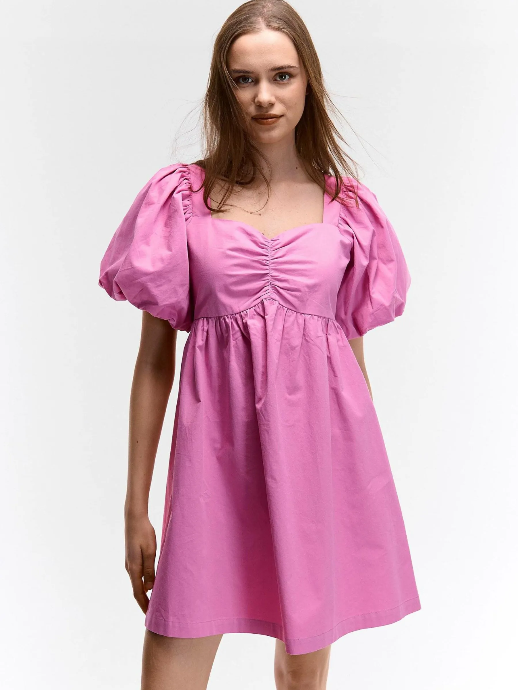 Kolor: różowyKrój: z marszczeniemTyp: sukienkaRekaw: krótki rękawDługość: miniPattern style: pojedynczy kolorDet…