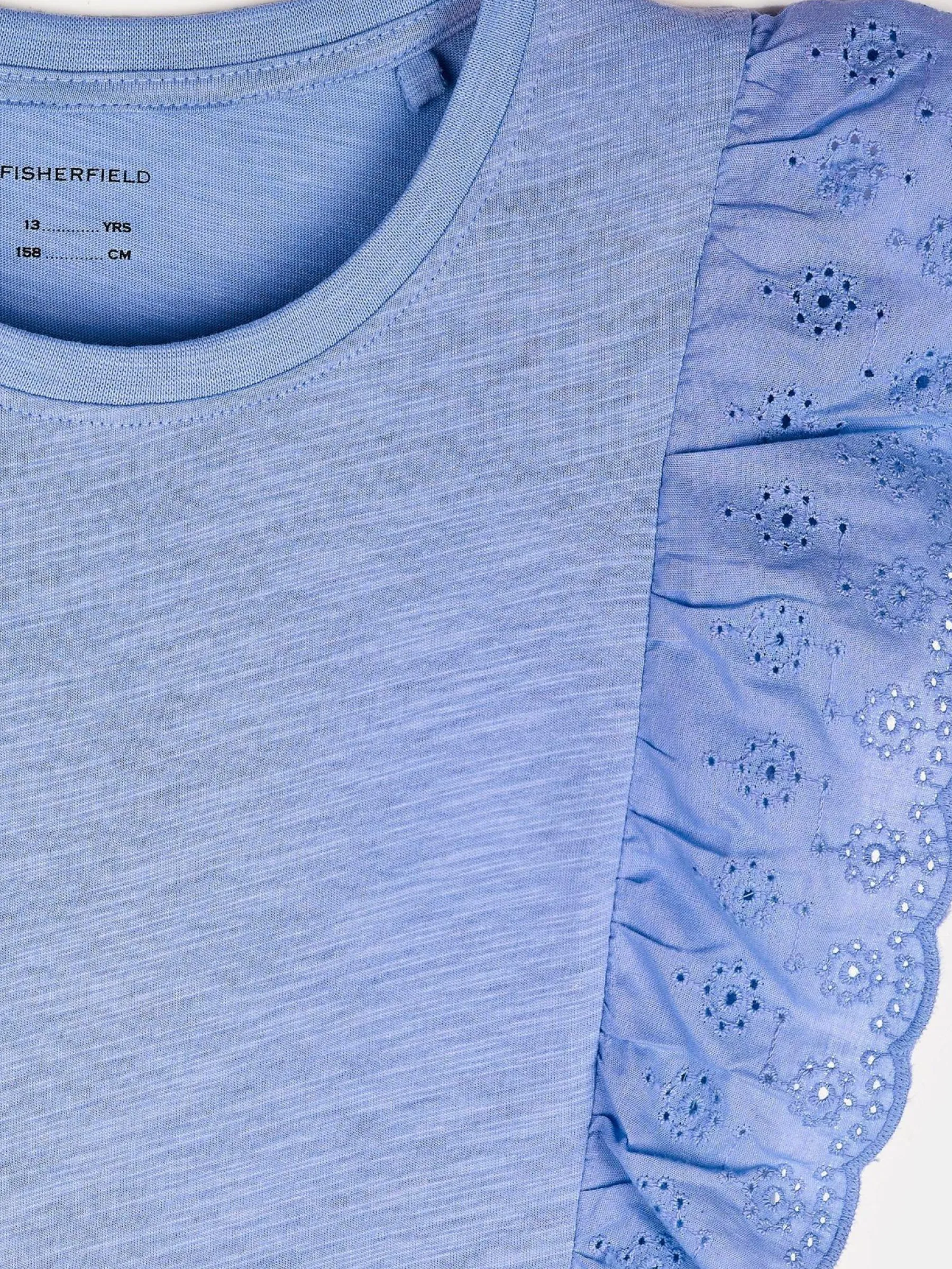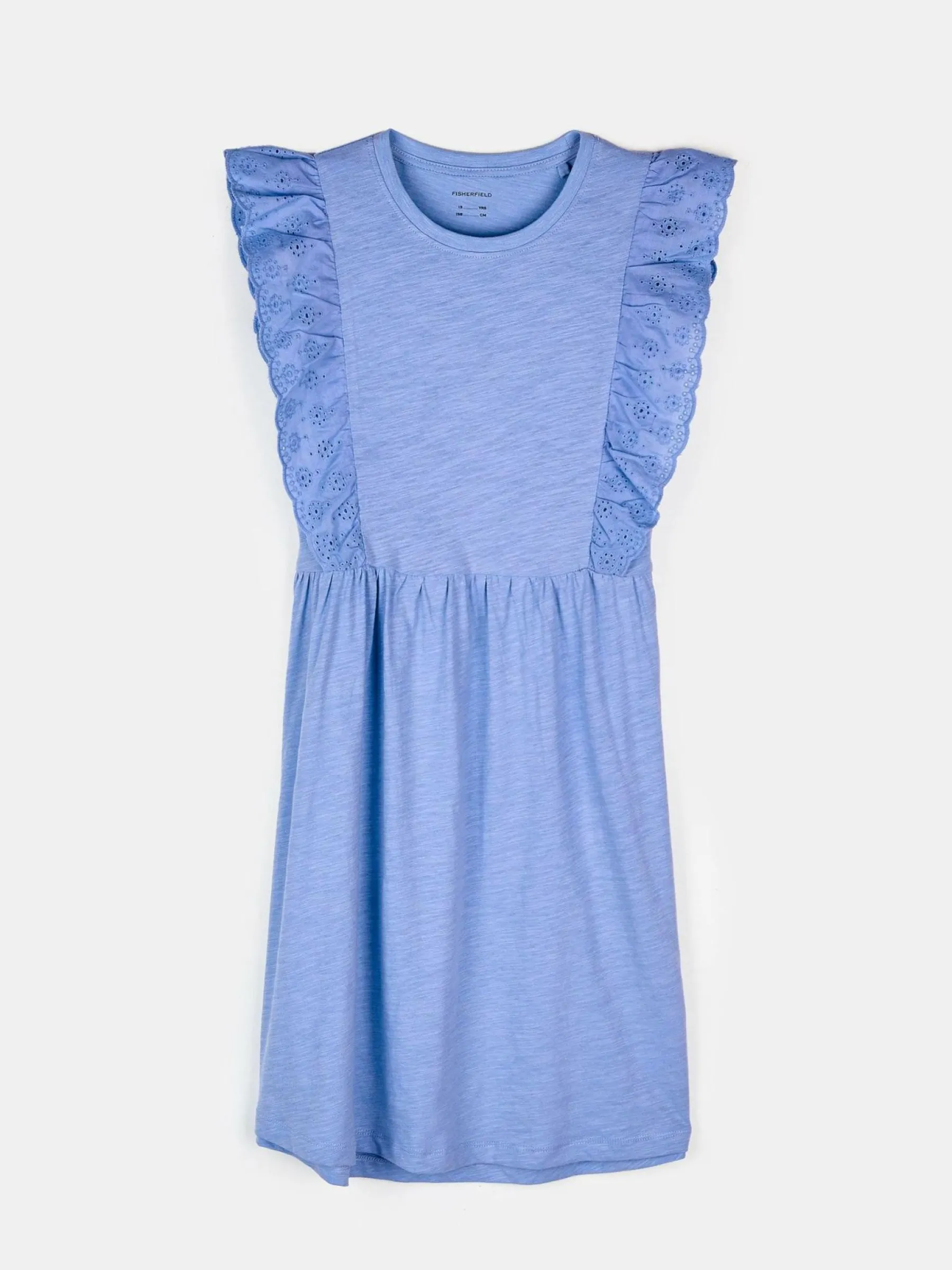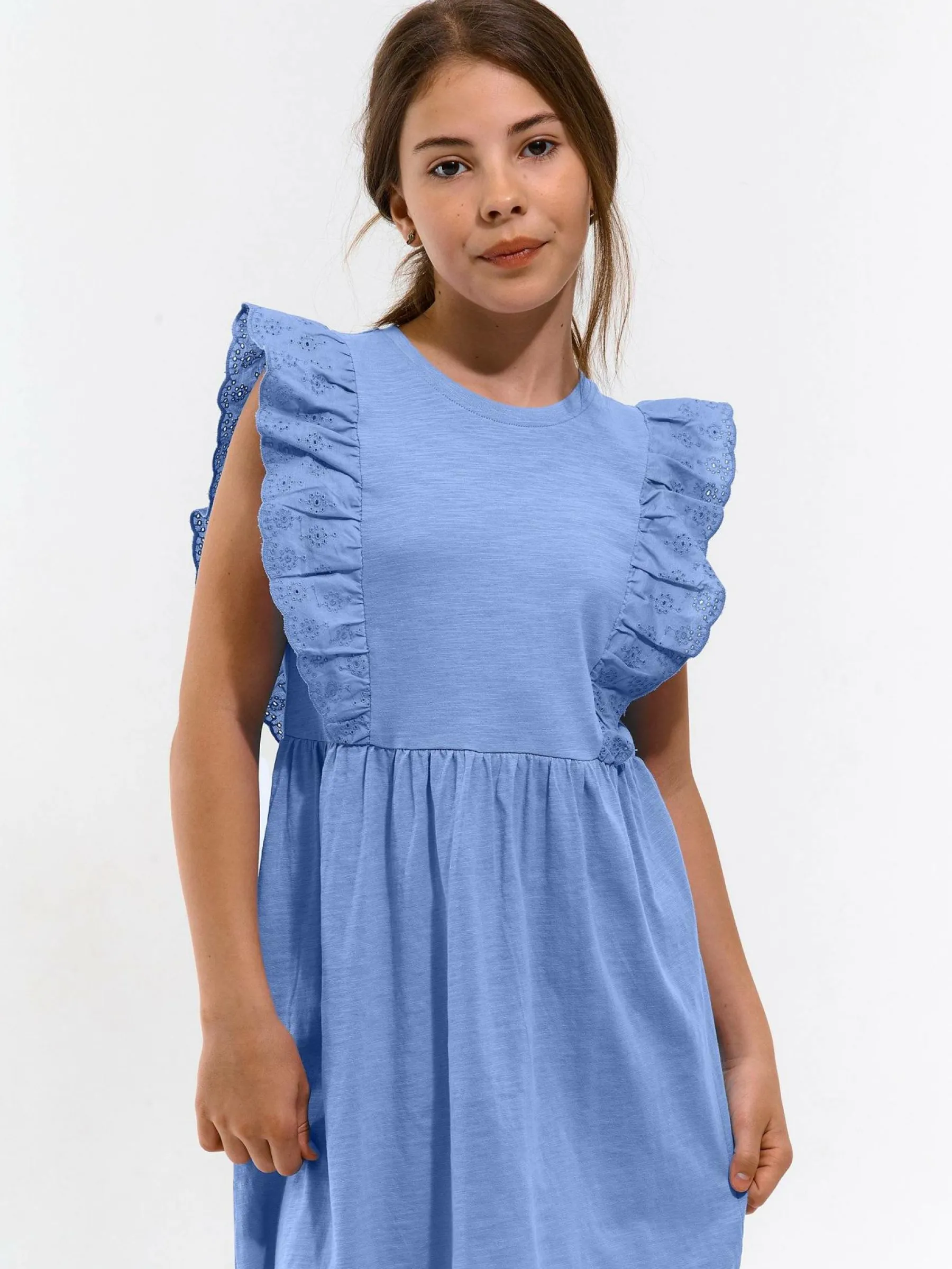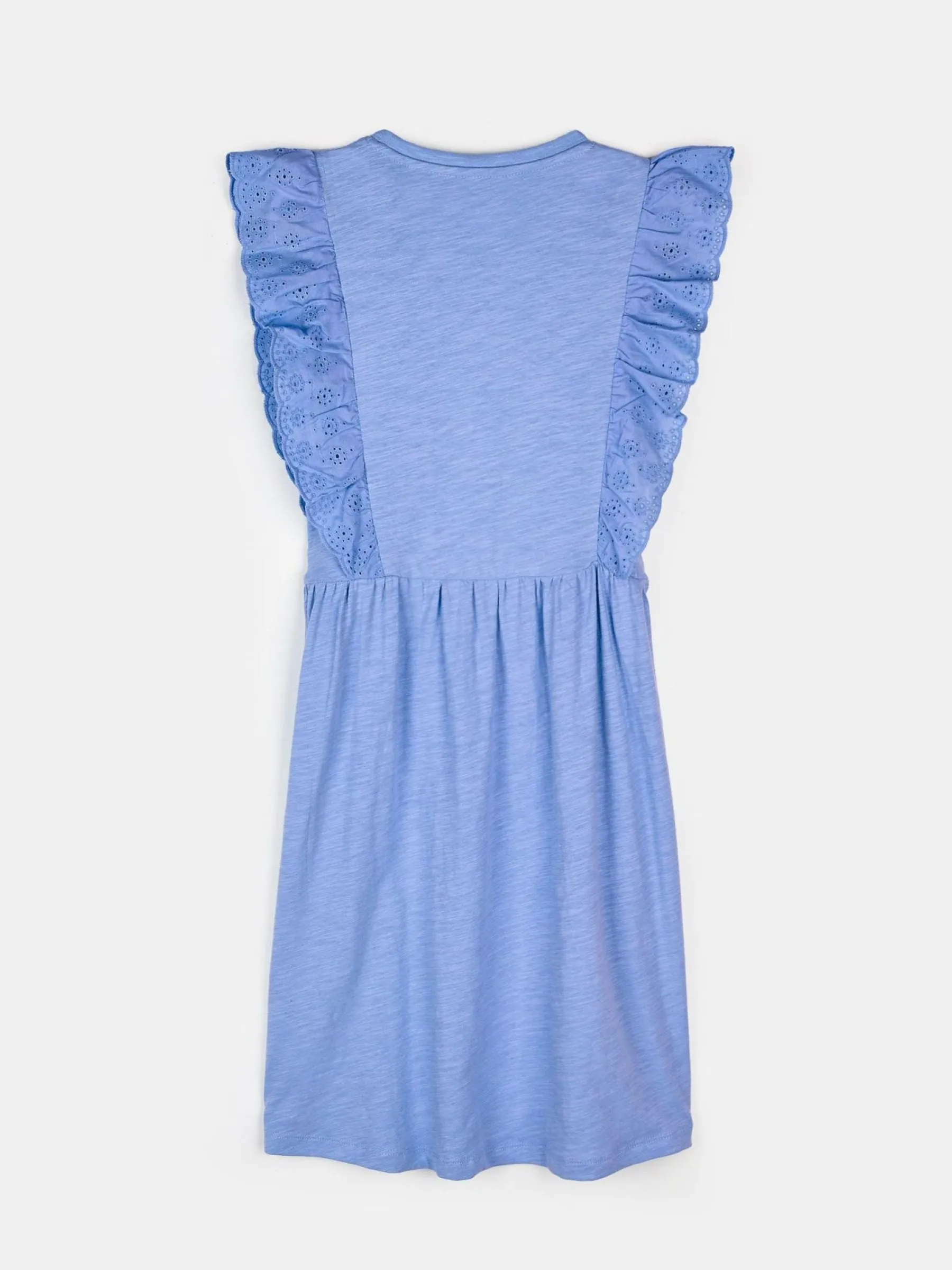 Kolor: niebieskiKrój: z falbanąTyp: sukienkaRekaw: krótki rękawDługość: miniPattern style: pojedynczy kolorDetal:…