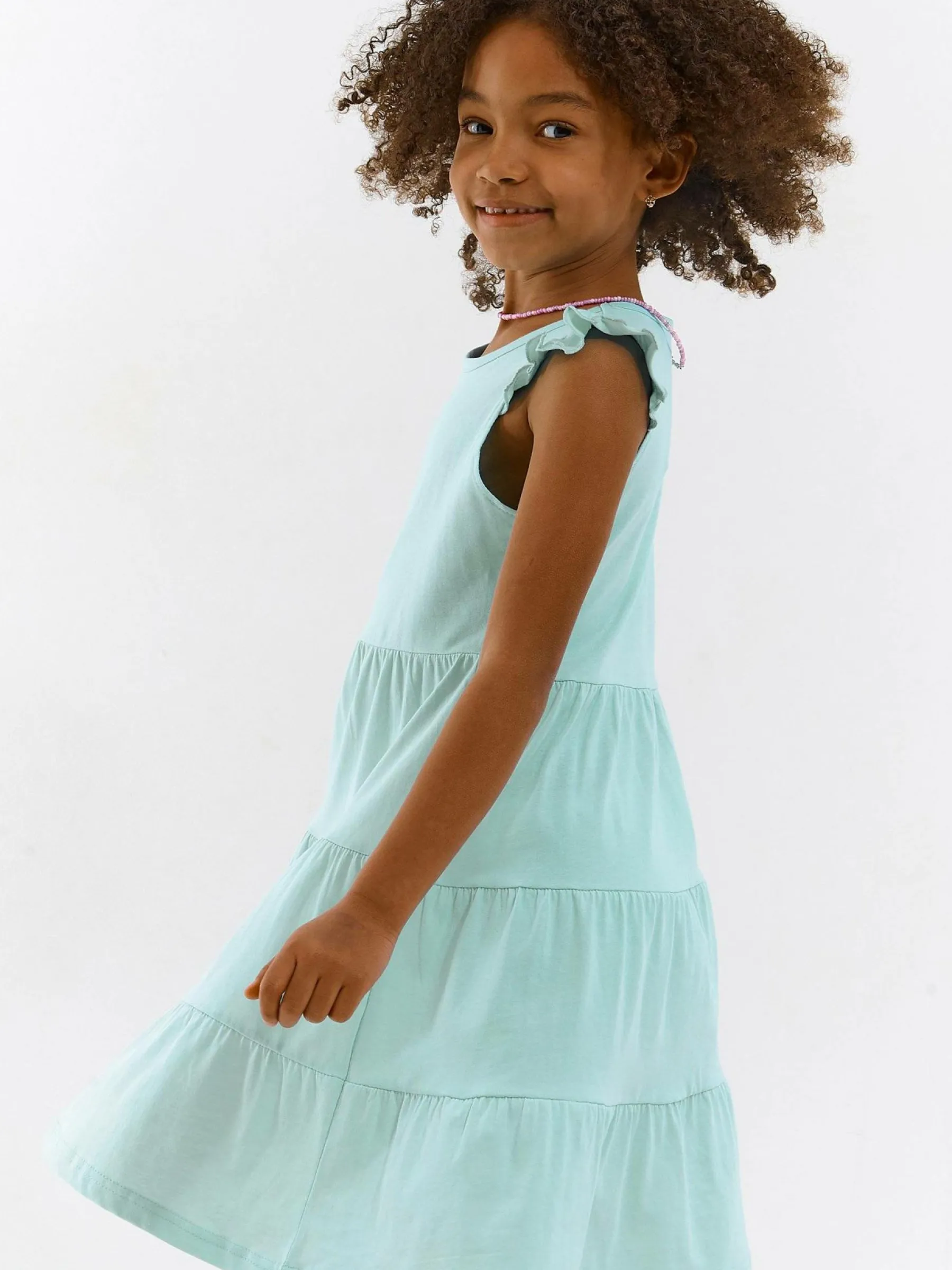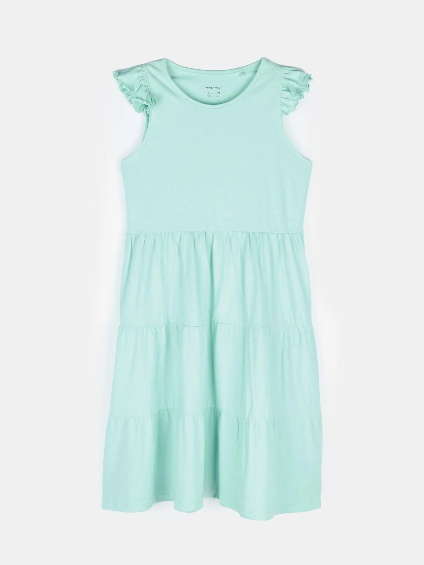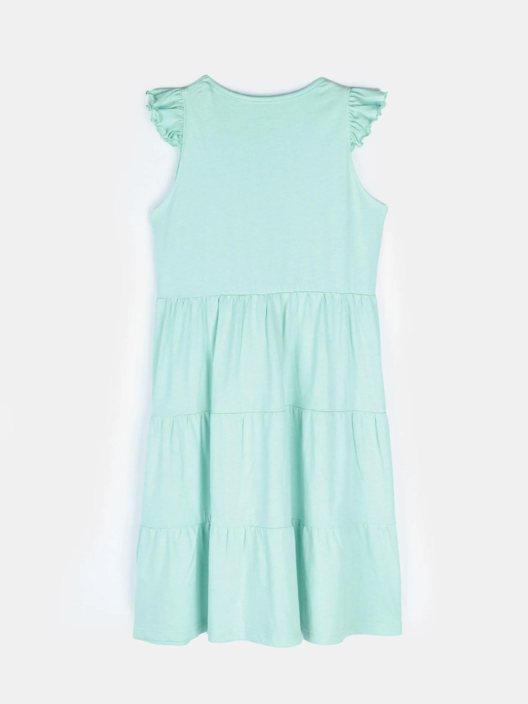 Kolor: niebieskiKrój: z falbanąTyp: sukienkaRekaw: bez rękawówDługość: miniPattern style: pojedynczy kolorMateria…