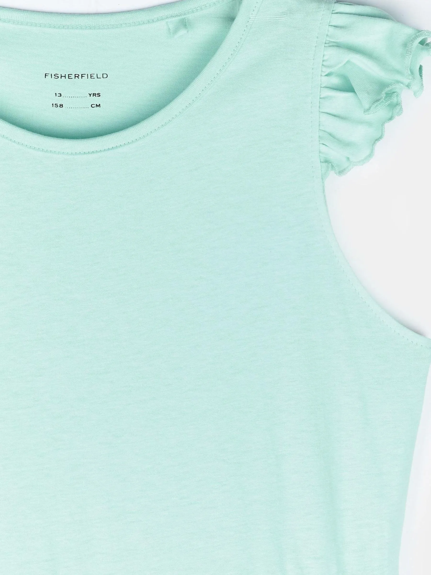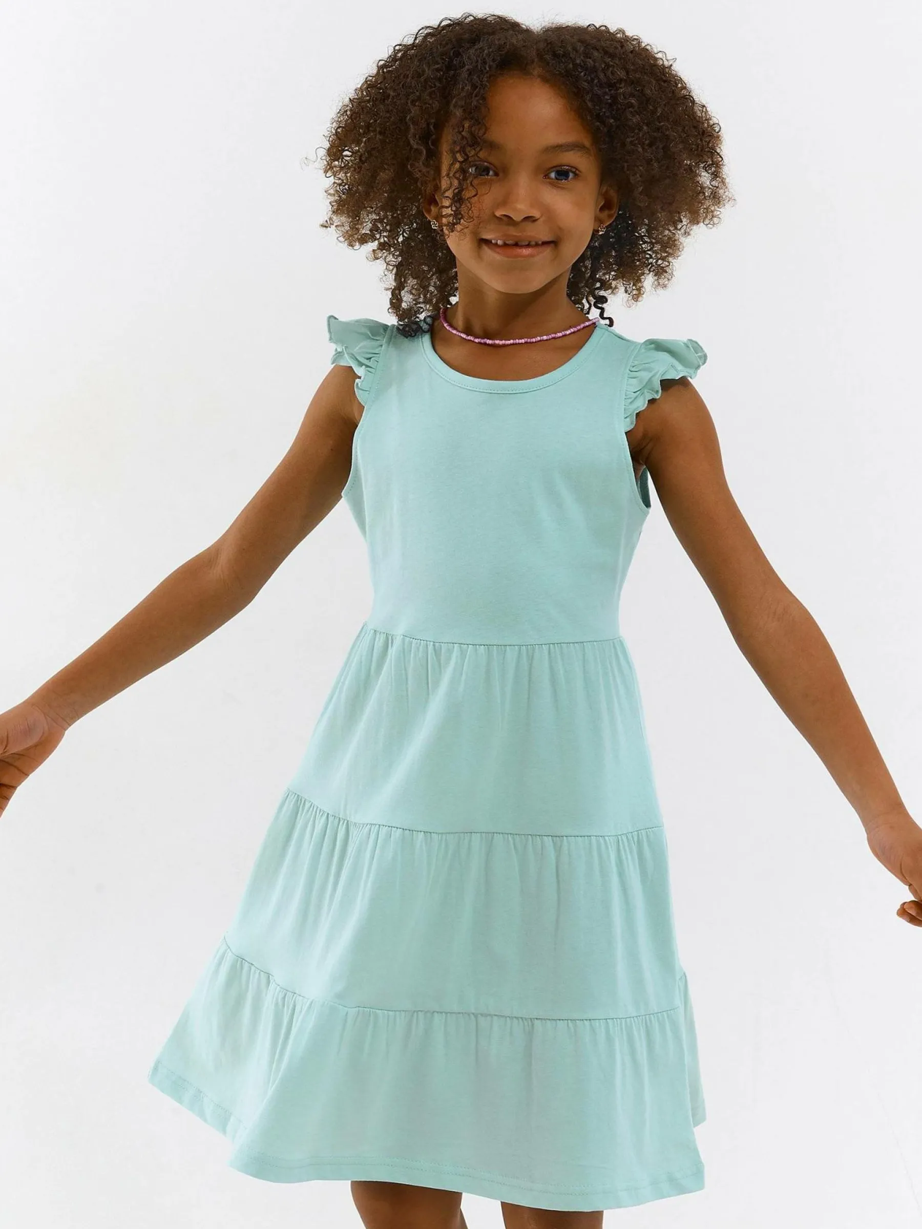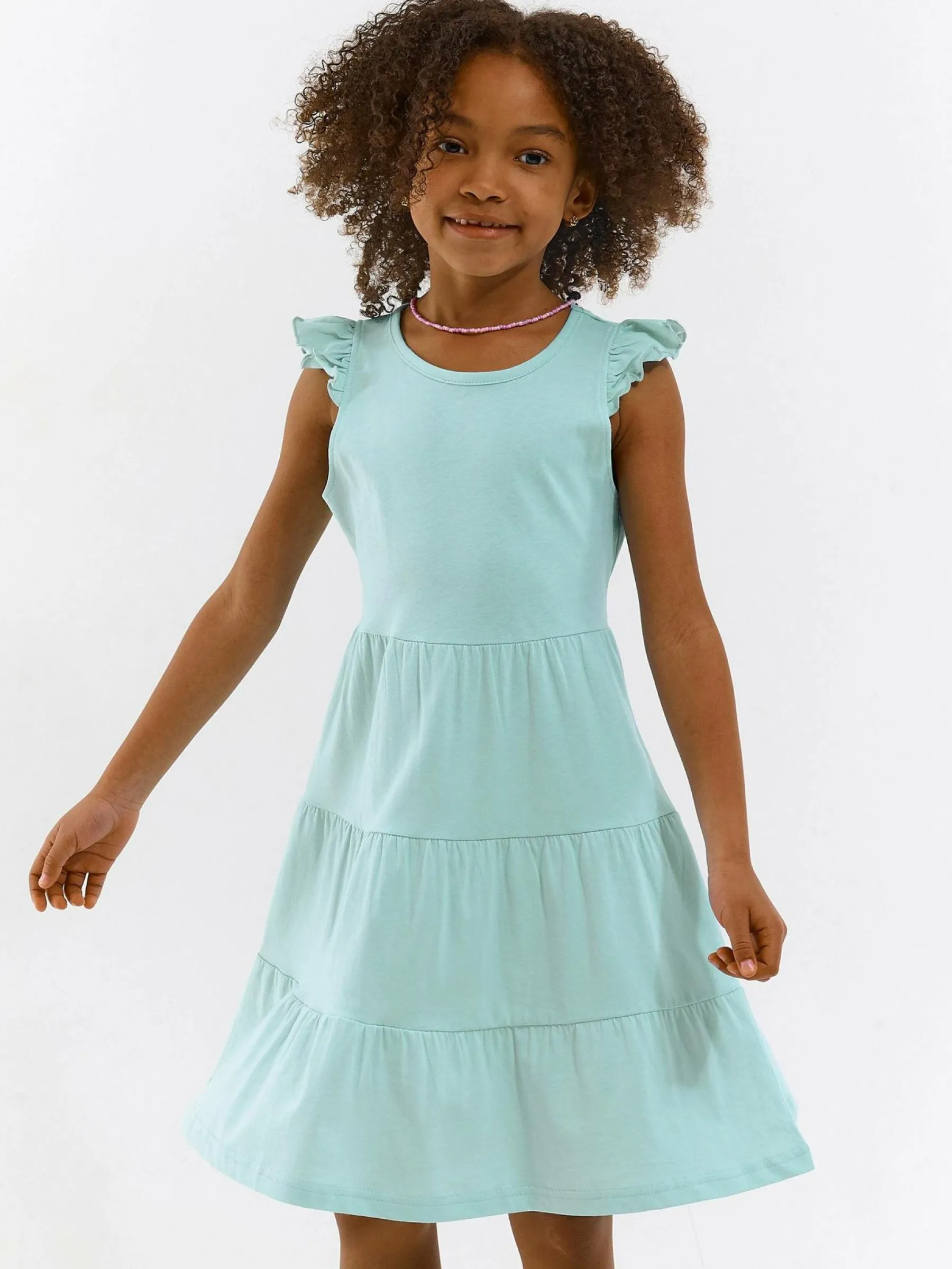Kolor: niebieskiKrój: z falbanąTyp: sukienkaRekaw: bez rękawówDługość: miniPattern style: pojedynczy kolorMateria…
