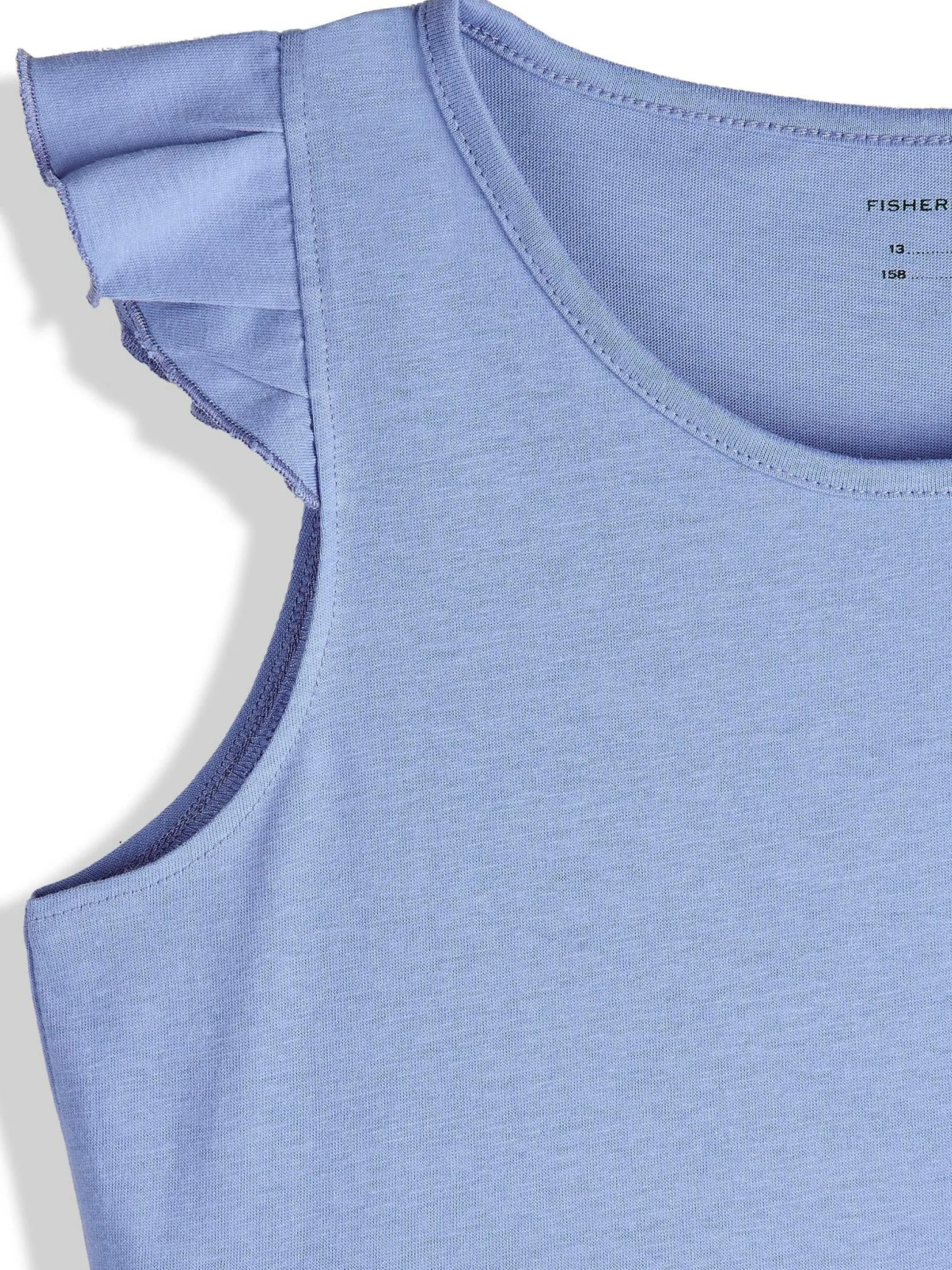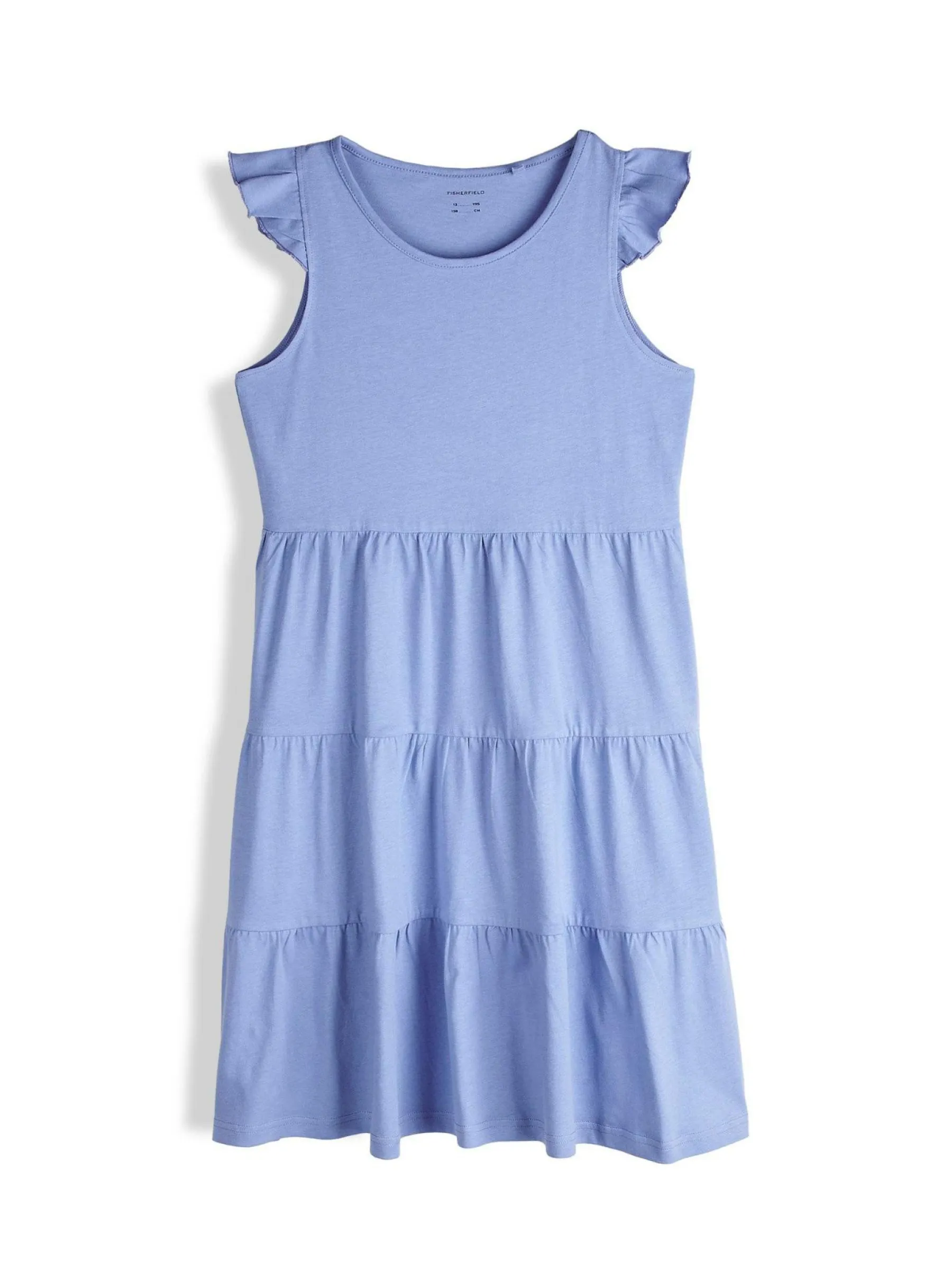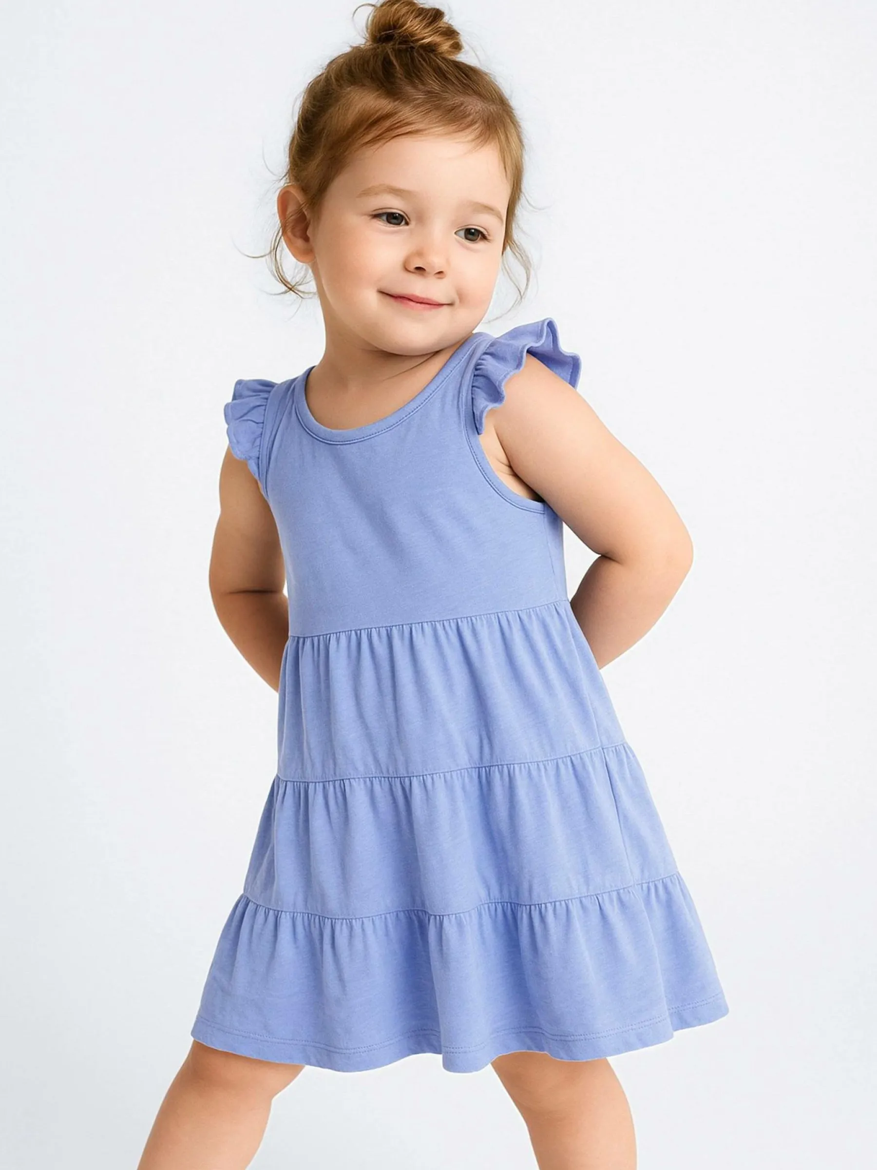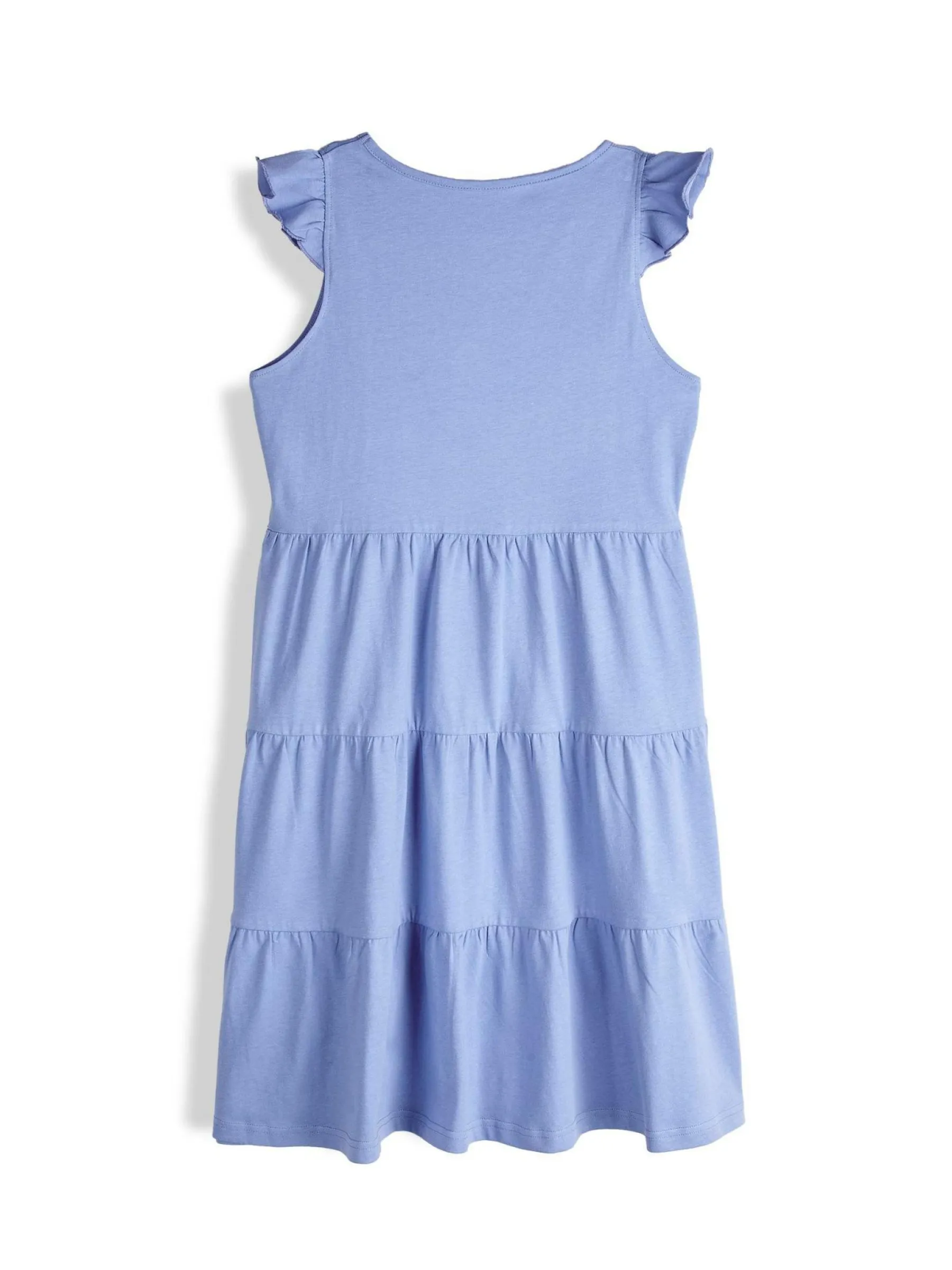 Kolor: niebieskiKrój: z falbanąTyp: sukienkaRekaw: bez rękawówDługość: miniPattern style: pojedynczy kolorDetal: …